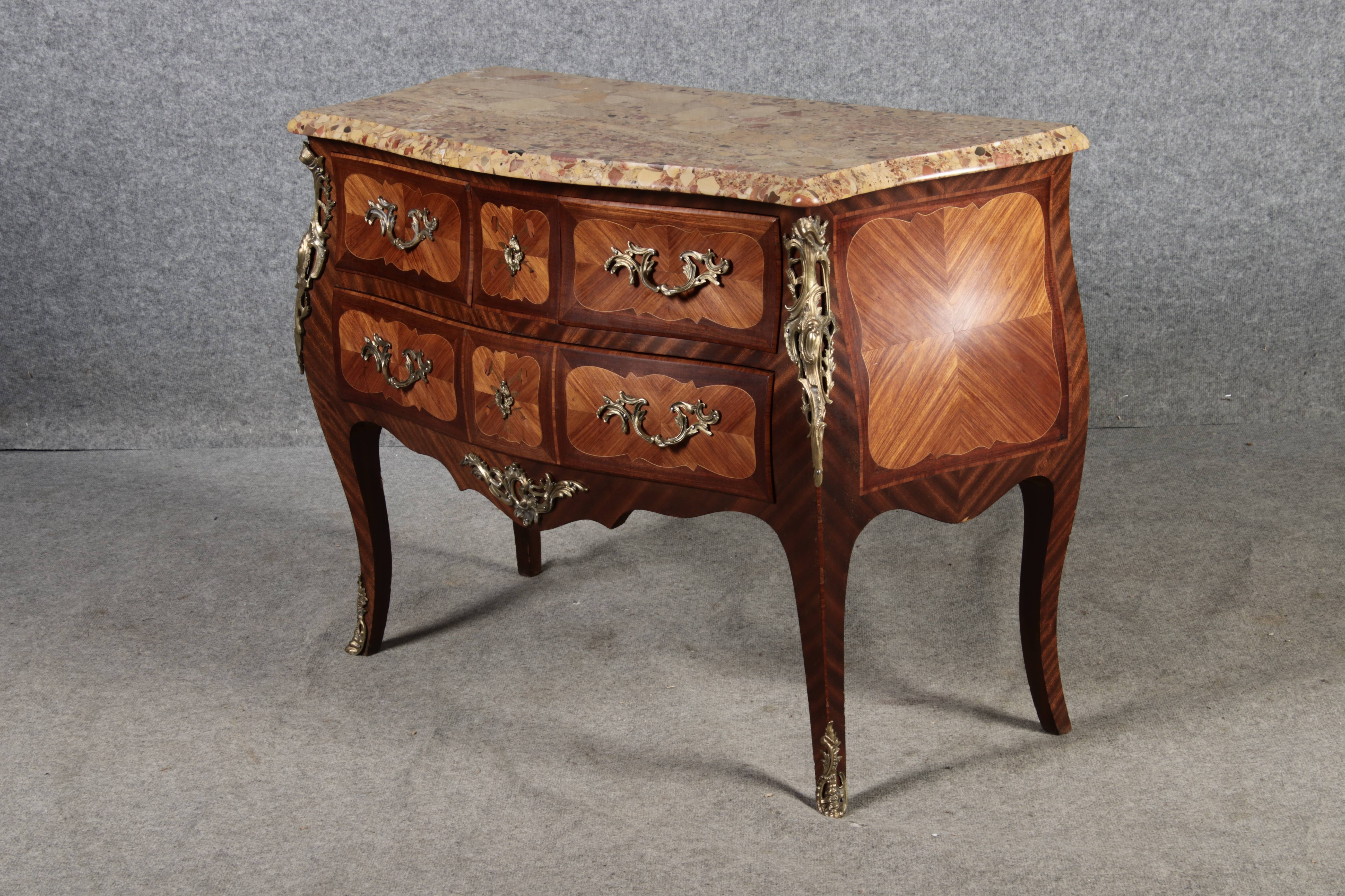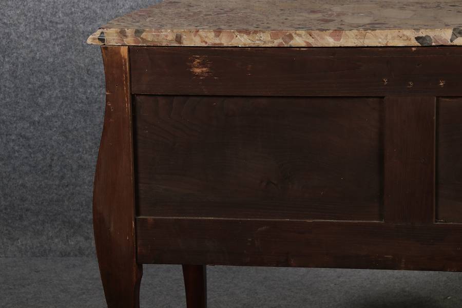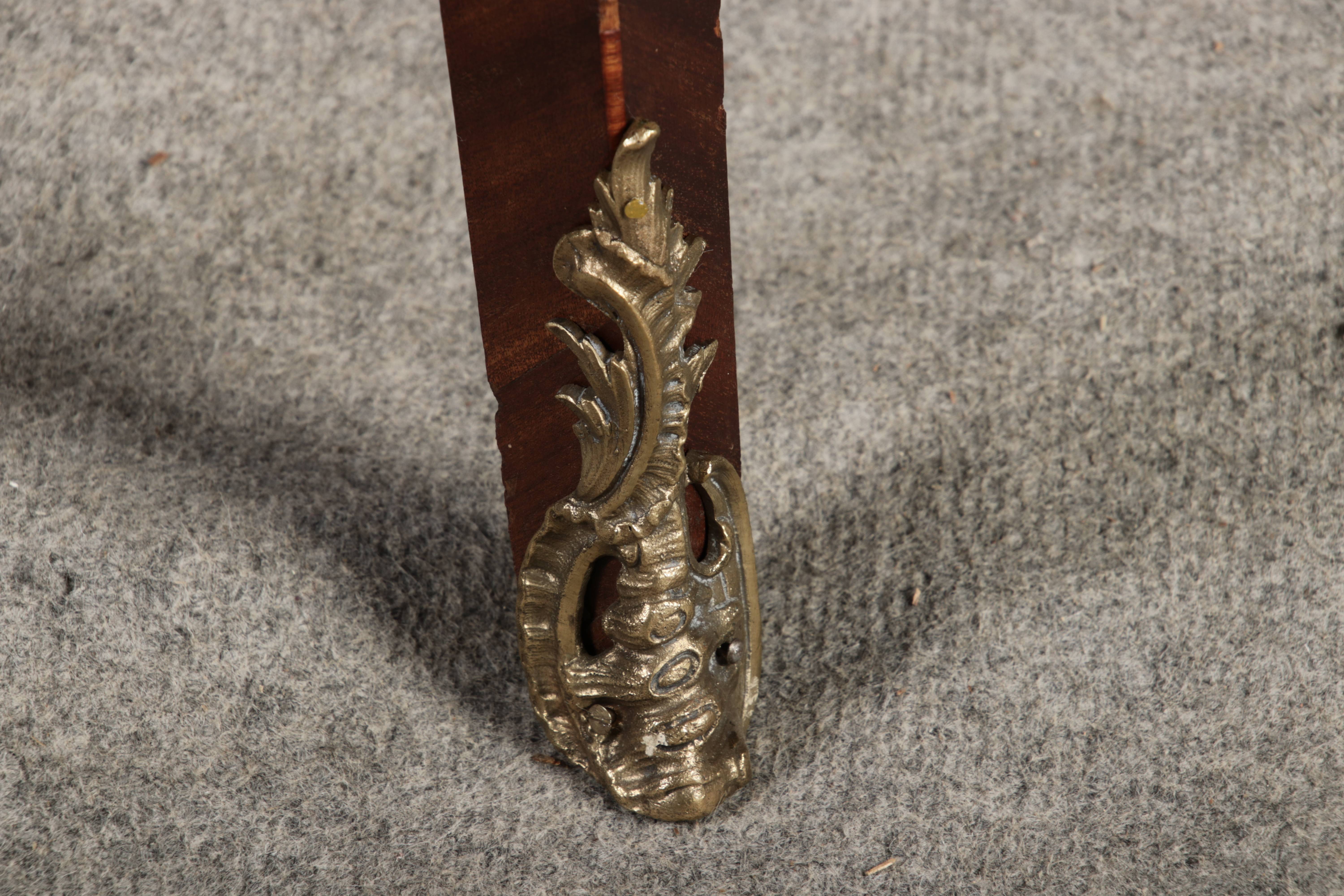 Das Holz ist Nussbaum und andere Hölzer auf Eichenholz mit Bronze Verzierungen und einer Marmorplatte
