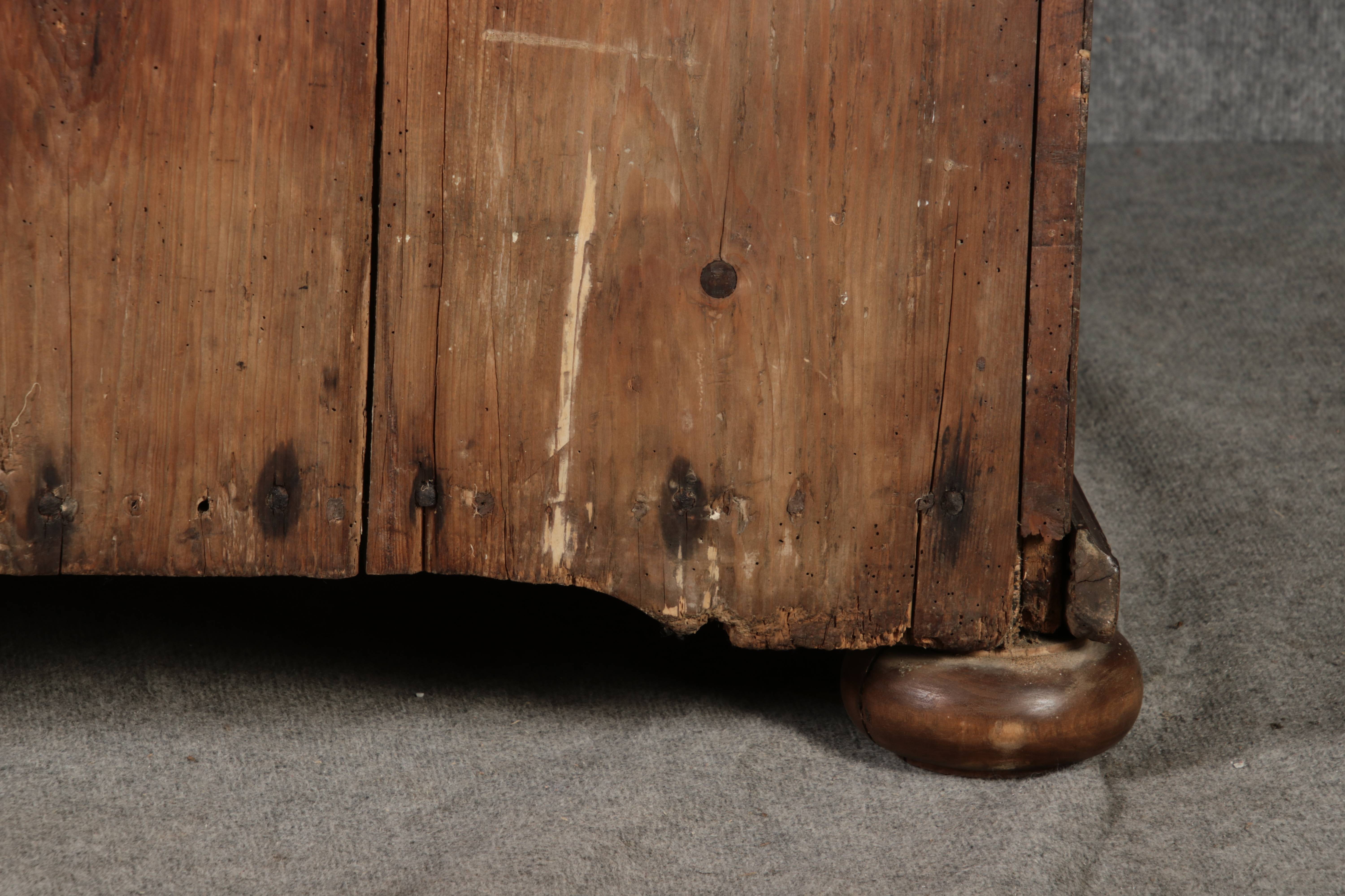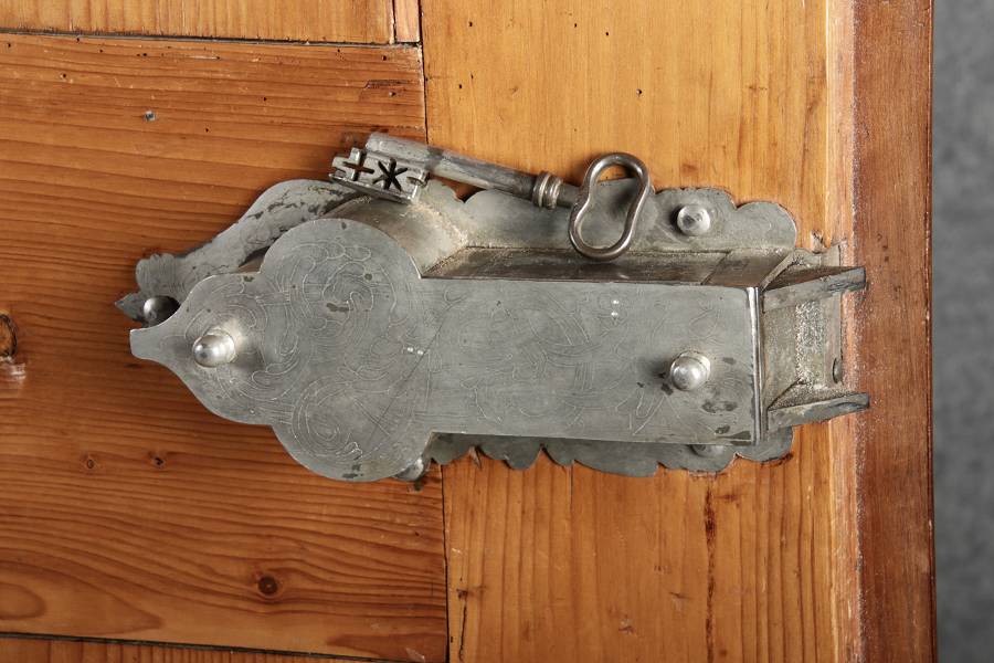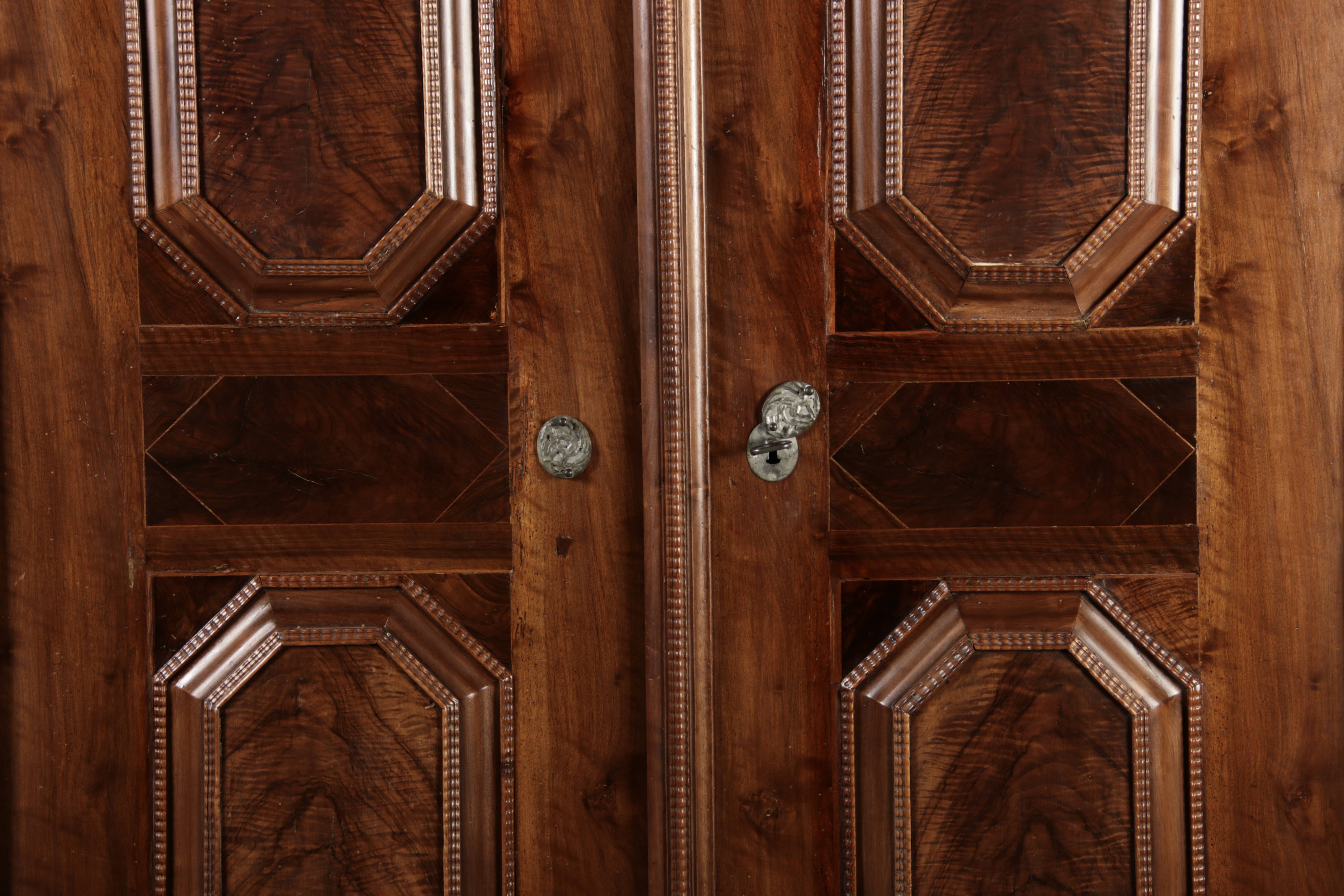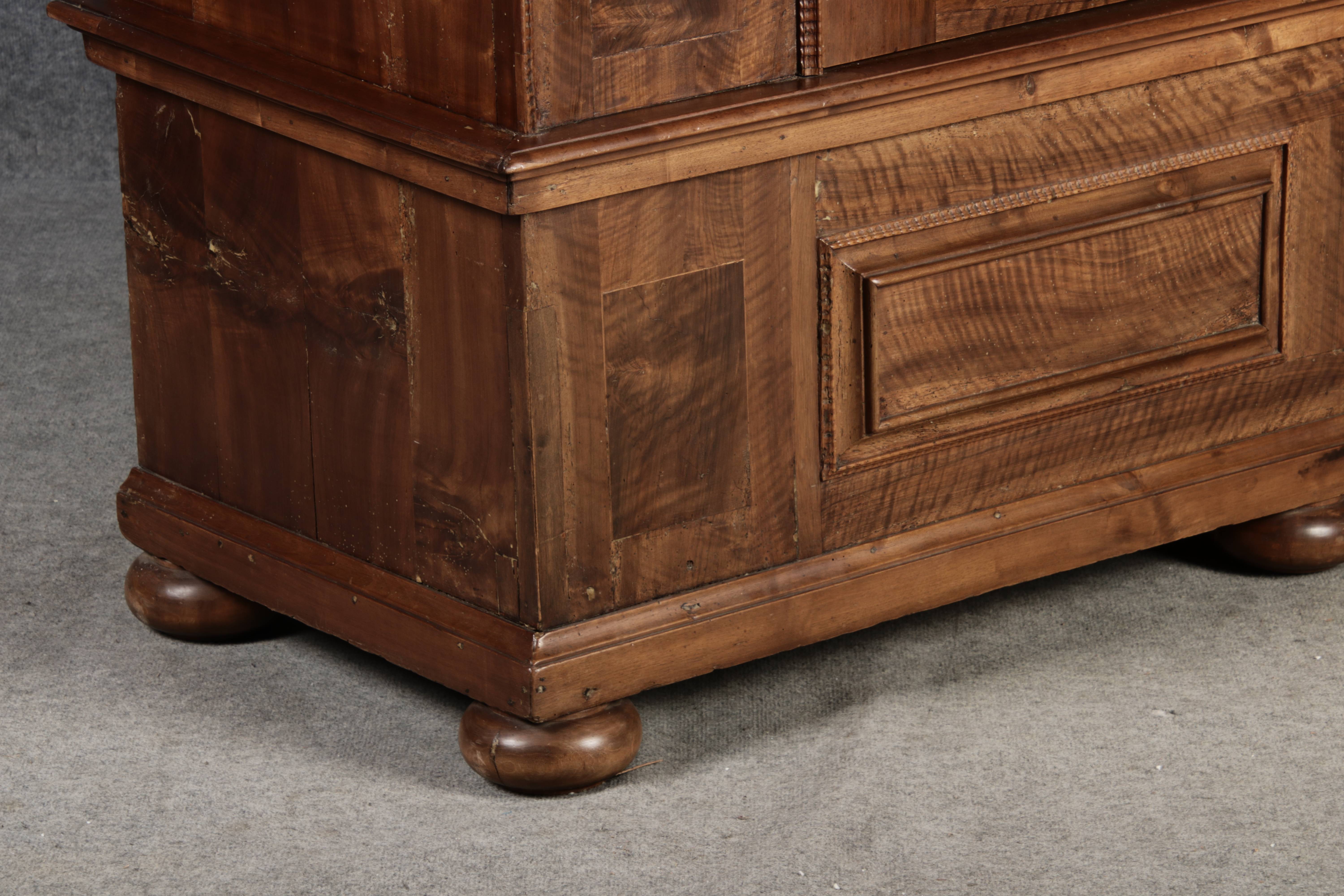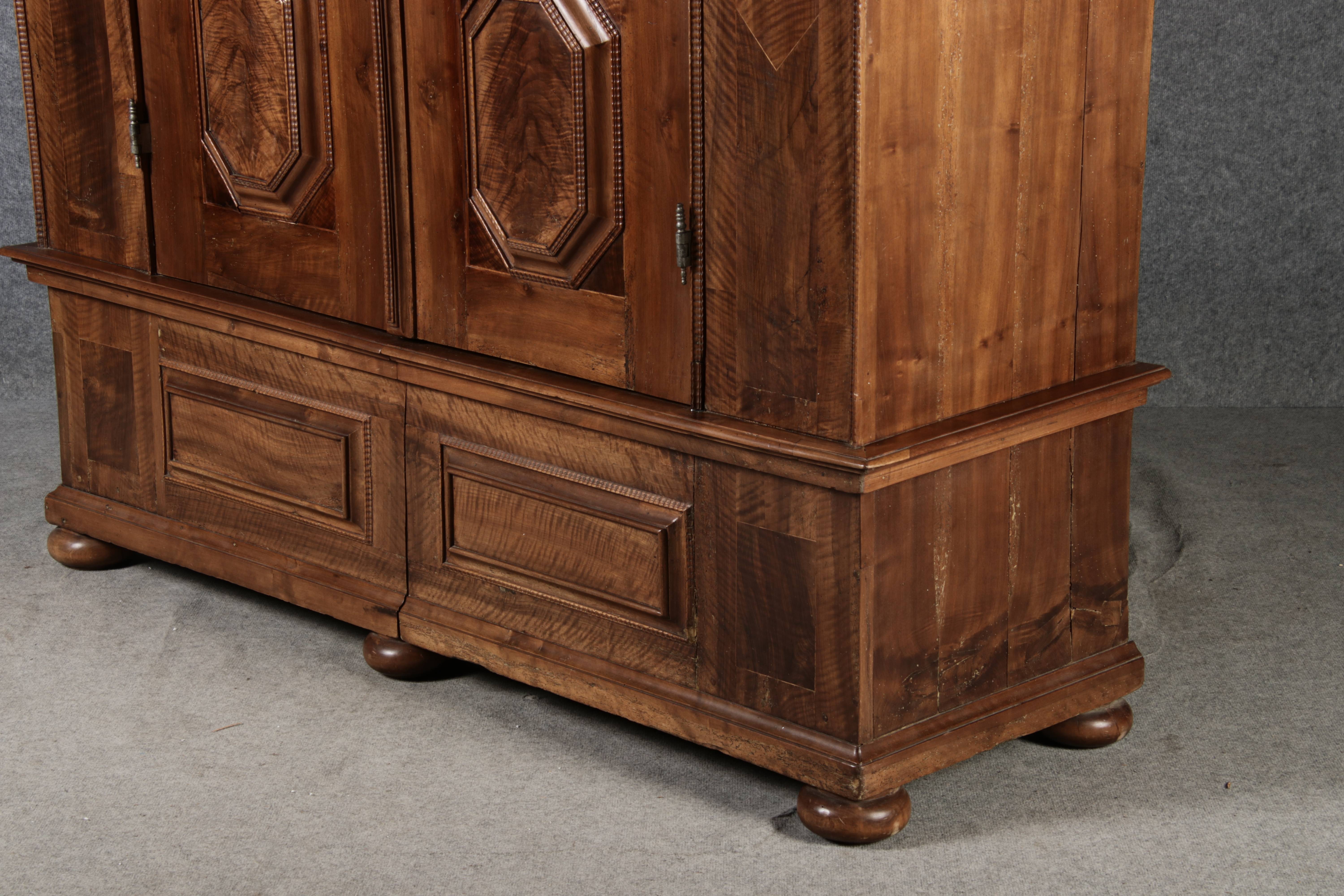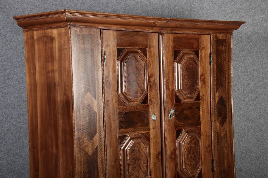 Antiker Renaissance Früh Barock Schrank um 1680 Nussbaum auf Weichholz mit Eisenschloss und Schlüssel In dem Buch Züricher und Nordschweizer Möbel findet sich auf Seite 113 ein ähnlicher Schrank. Laut Text, Herstellungsort Nordwestschweiz Zürich oder Winterthur und Datierung wurde um 1680-1690 angegeben. Die dendrochronologische Datierung ergab nach 1674.