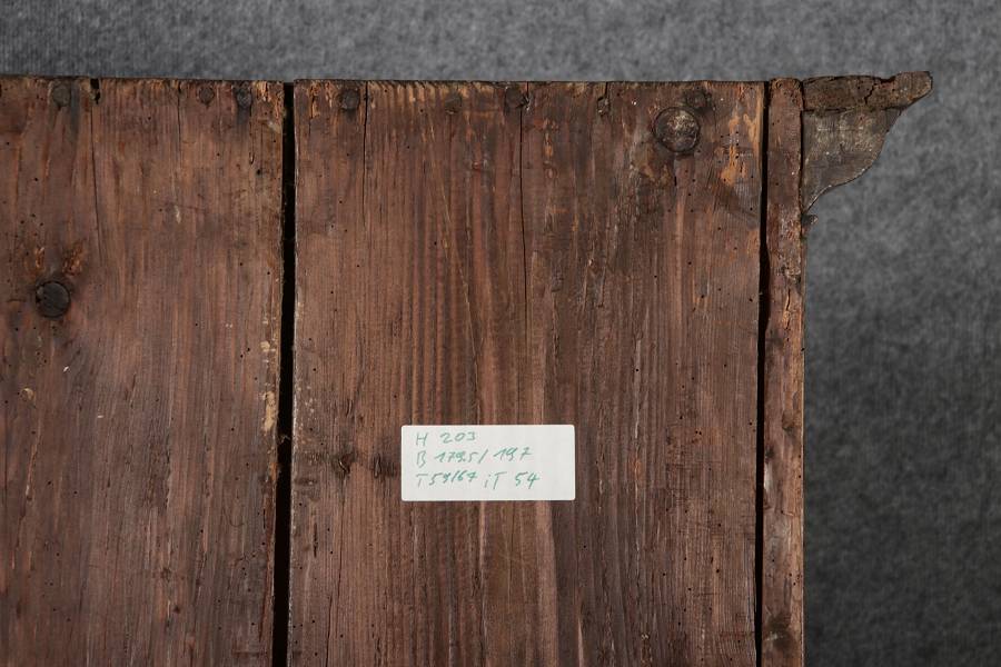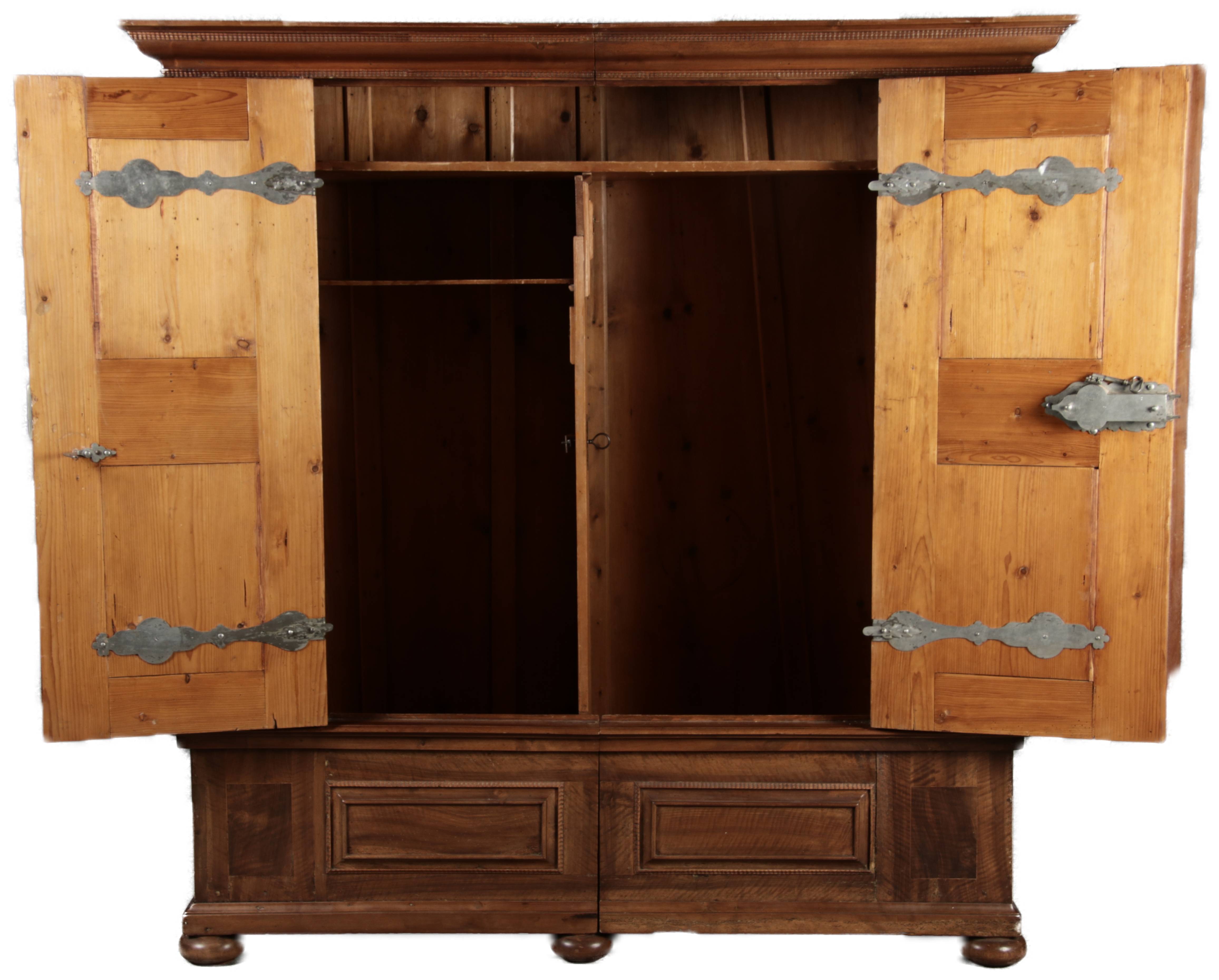 Masse/dimensions: Höhe/Height ca. 203 cm, Breite Korpus/Broad Boda ca. 179 cm, Breite Gesims/Broad cornice ca. 197 cm, Tiefe Korpus/Deep body ca. 59 cm, Tiefe Gesims/Deep cornice ca. 67 cm,