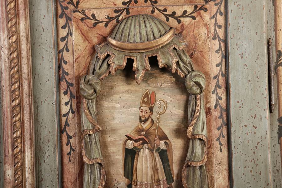 Beschreibung/description: Barockschrank aus dem 19 Jh. mit aufwendig geschnitzten Türfeldern.Die vier Felder mit Schnitzwerk und Darstellungen von S. Gregorius, S. Ambrosius, S. Augustinus und S. Hieronymus ArtikelNummer /number: sch122