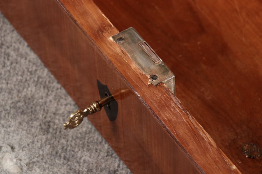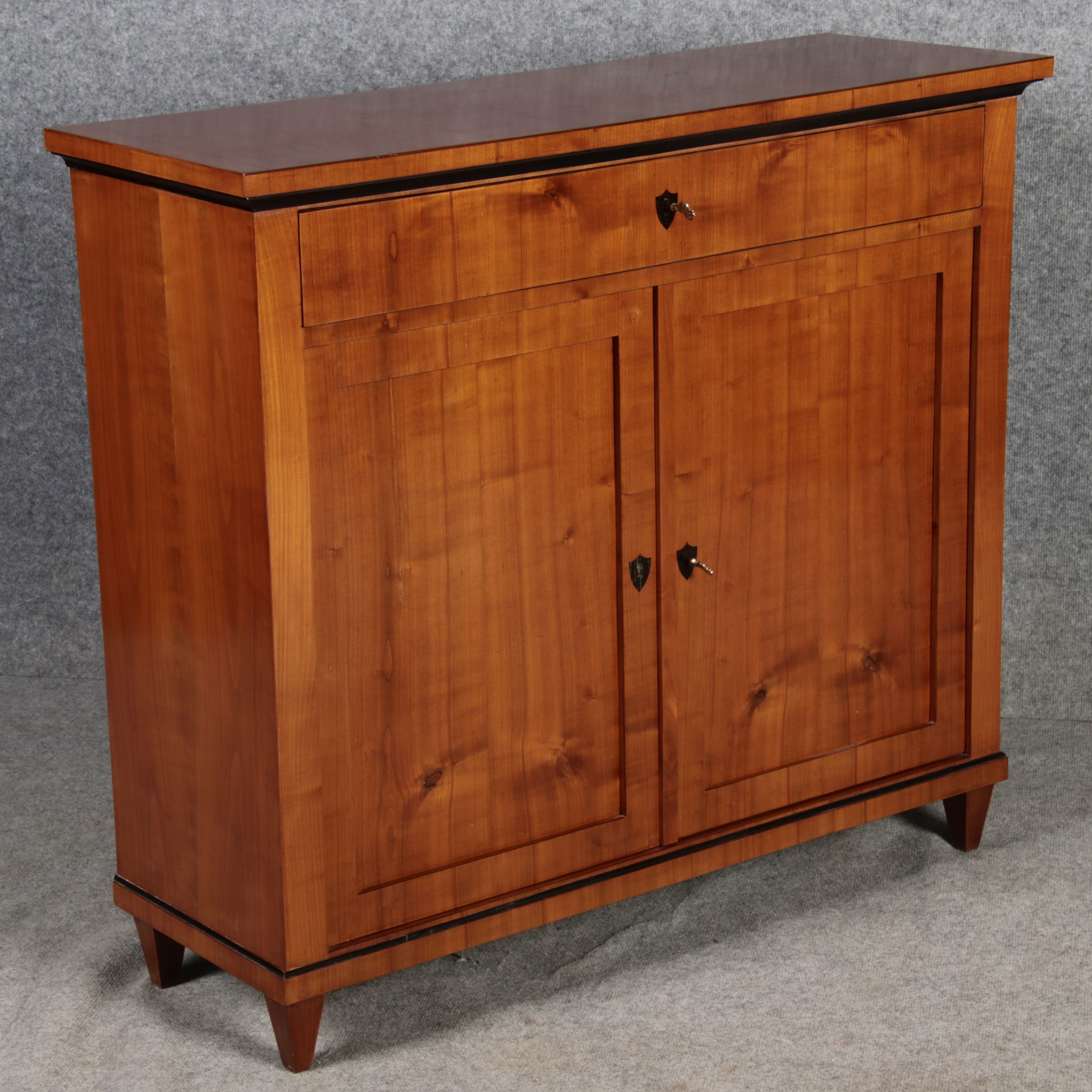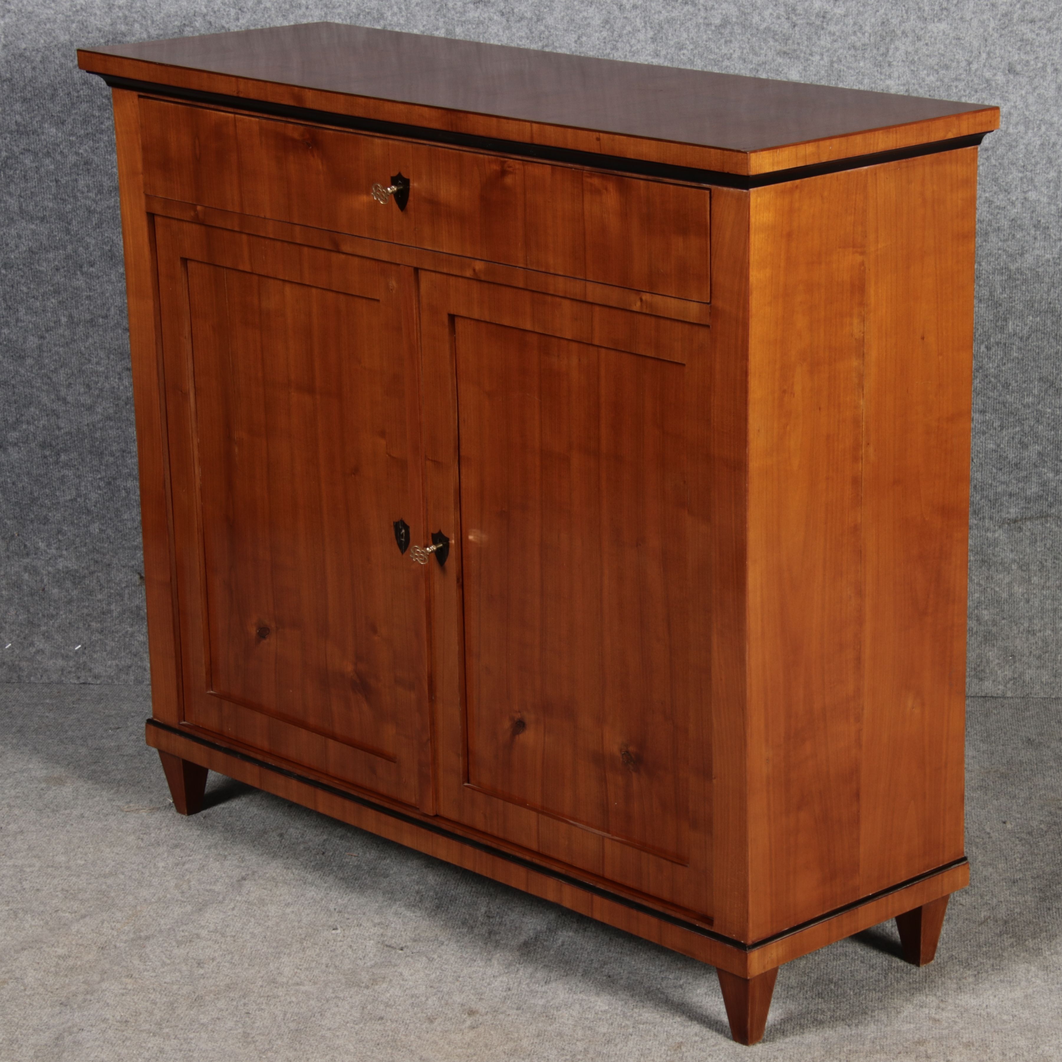 Masse/dimensions: Höhe/Height ca. 100,5 cm, Breite Korpus/Broad Boda ca. 107,5 cm, Breite Gesims/Broad cornice ca. 113 cm, Tiefe Korpus/Deep body ca. 36,5 cm, Tiefe Gesims/Deep cornice ca. 39 cm, Holz