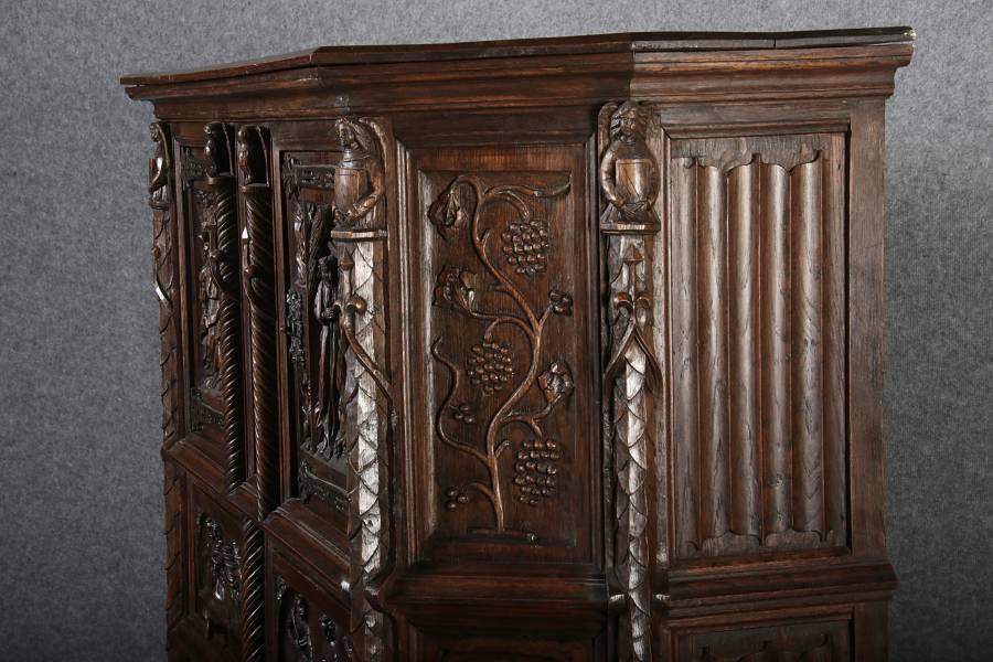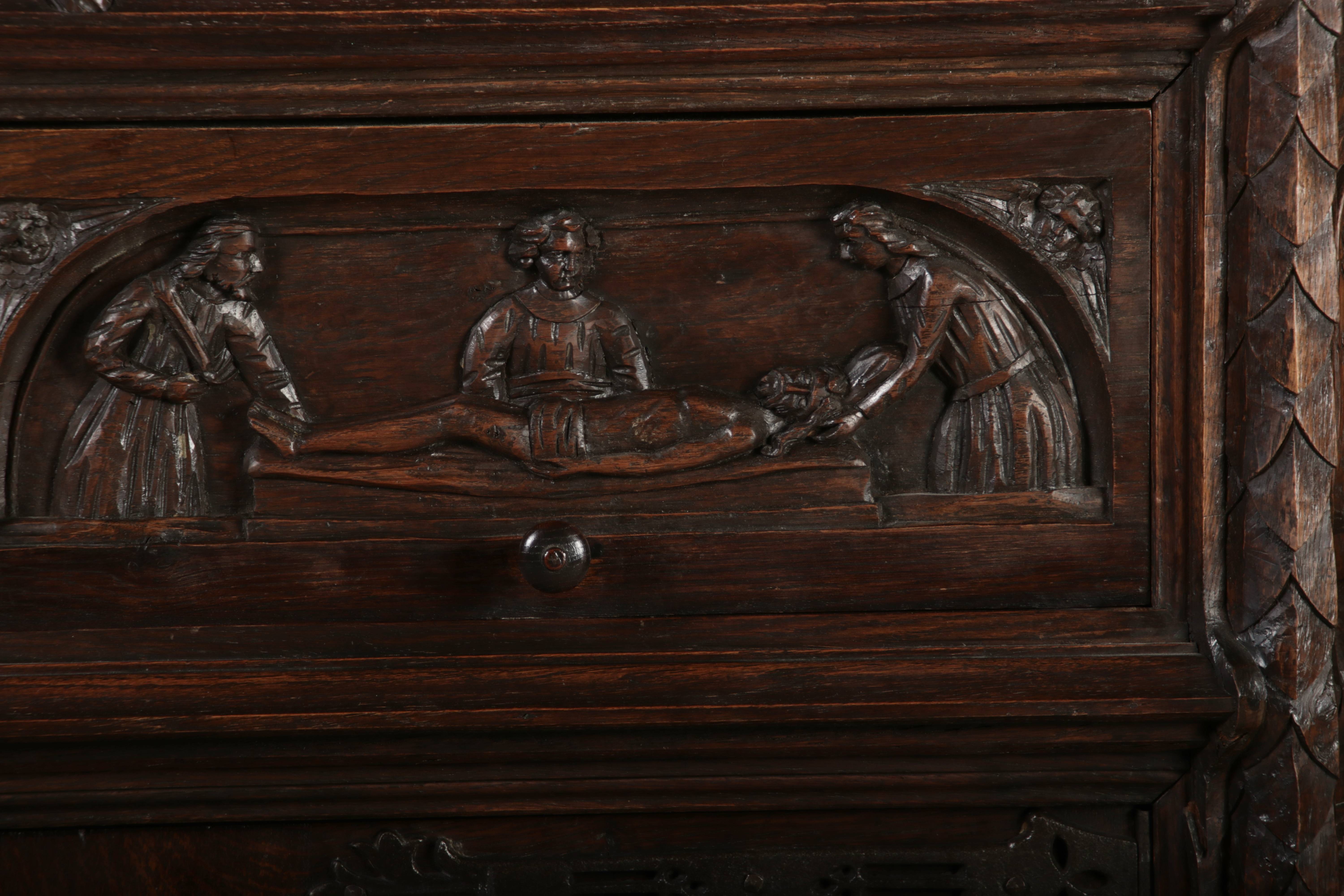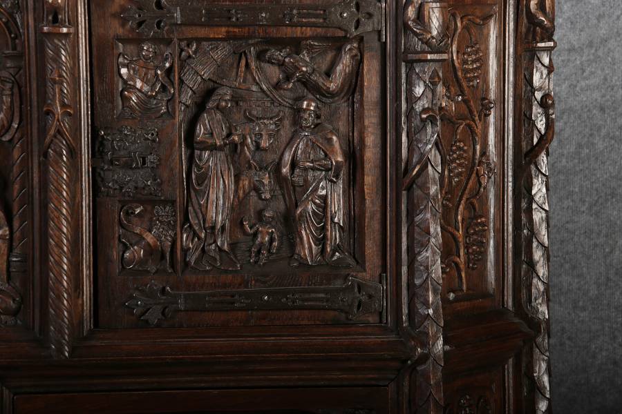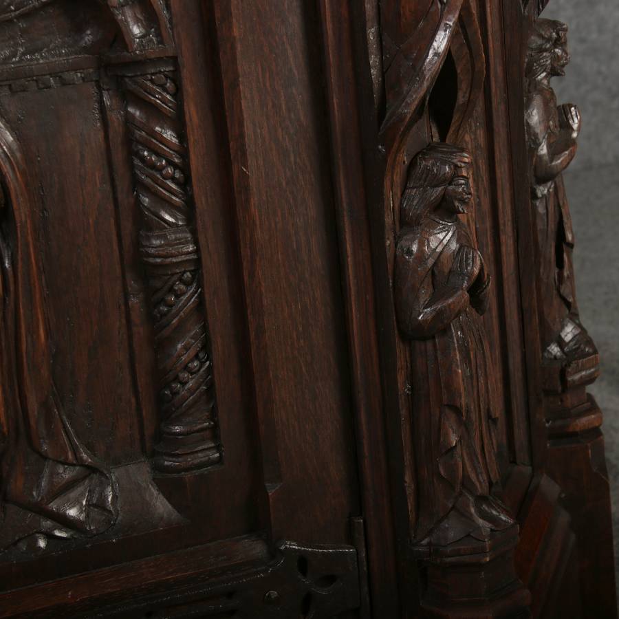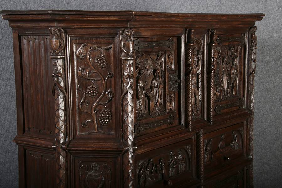 Prächtiger Schrank aus der Epoche des Historismus, gefertigt im späten 19. Jahrhundert. Das Möbel besticht durch sein außergewöhnlich reiches, tief gearbeitetes Schnitzwerk mit figürlichen und ornamentalen Darstellungen. Die Front ist in mehrere Felder gegliedert und zeigt reliefierte Szenen mit menschlichen Figuren, biblischen bzw. allegorischen Motiven sowie floralen und architektonischen Elementen. Der Korpus ist aus massivem Eichen Holz gearbeitet und zeigt eine warme, dunkel patinierte Oberfläche. Mit geschnitzten Säulen, profilierte Rahmen und aufwendig gestaltete Füllungen unterstreichen den repräsentativen Charakter des Schranks. Die handwerkliche Qualität und Detailtiefe der Schnitzereien zeugen von hoher Kunstfertigkeit. Innen bietet der Schrank großzügigen Stauraum und eignet sich sowohl als Aufbewahrungsmöbel als auch als eindrucksvolles Sammlerstück. Alters- und Gebrauchsspuren sind vorhanden und unterstreichen die Authentizität und den historischen Charakter des Möbels. Ein imposantes Originalstück des Historismus – ideal für Liebhaber historischer Möbel, repräsentative Interieurs oder Sammlungen.