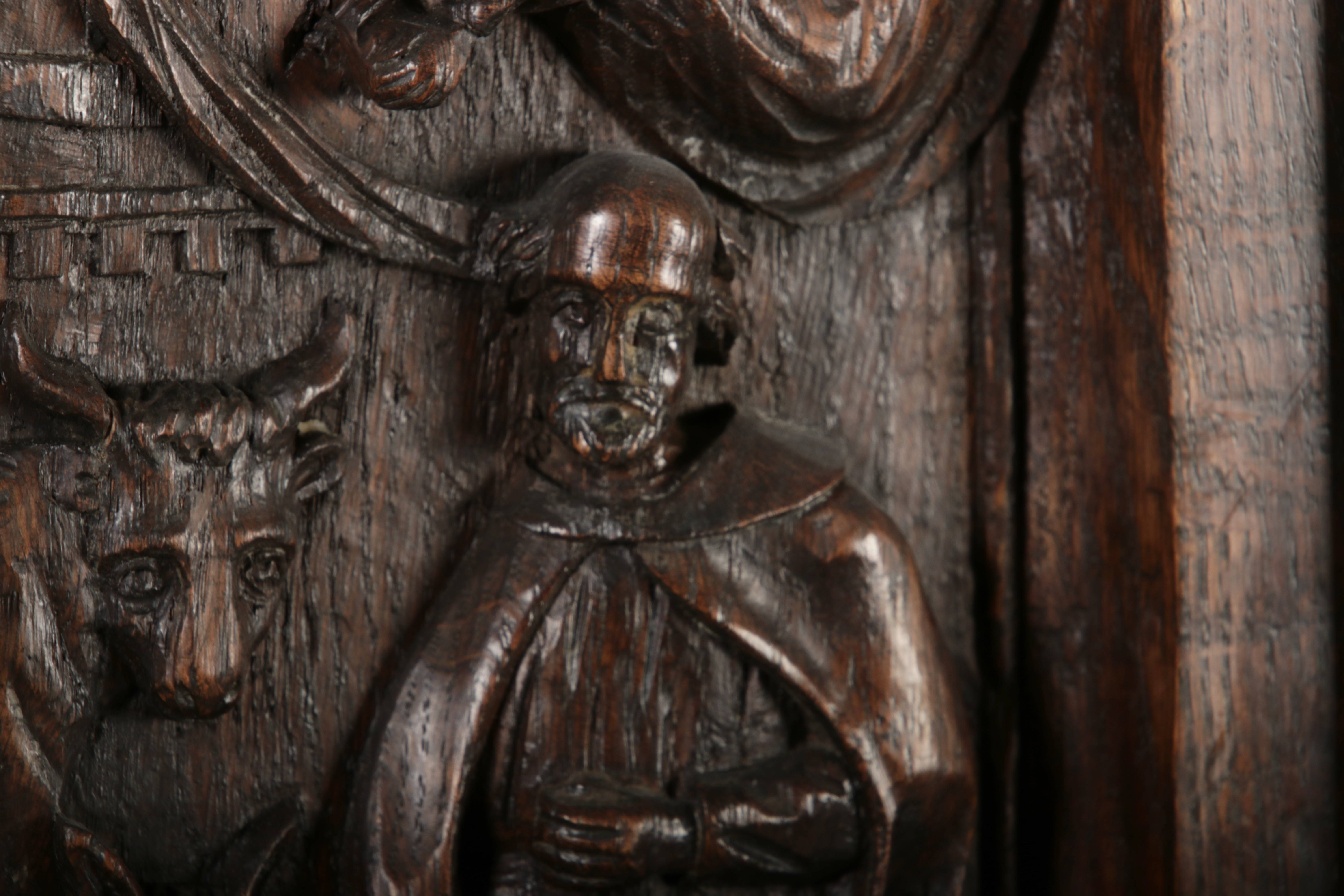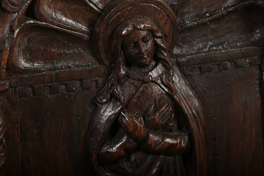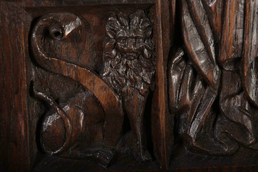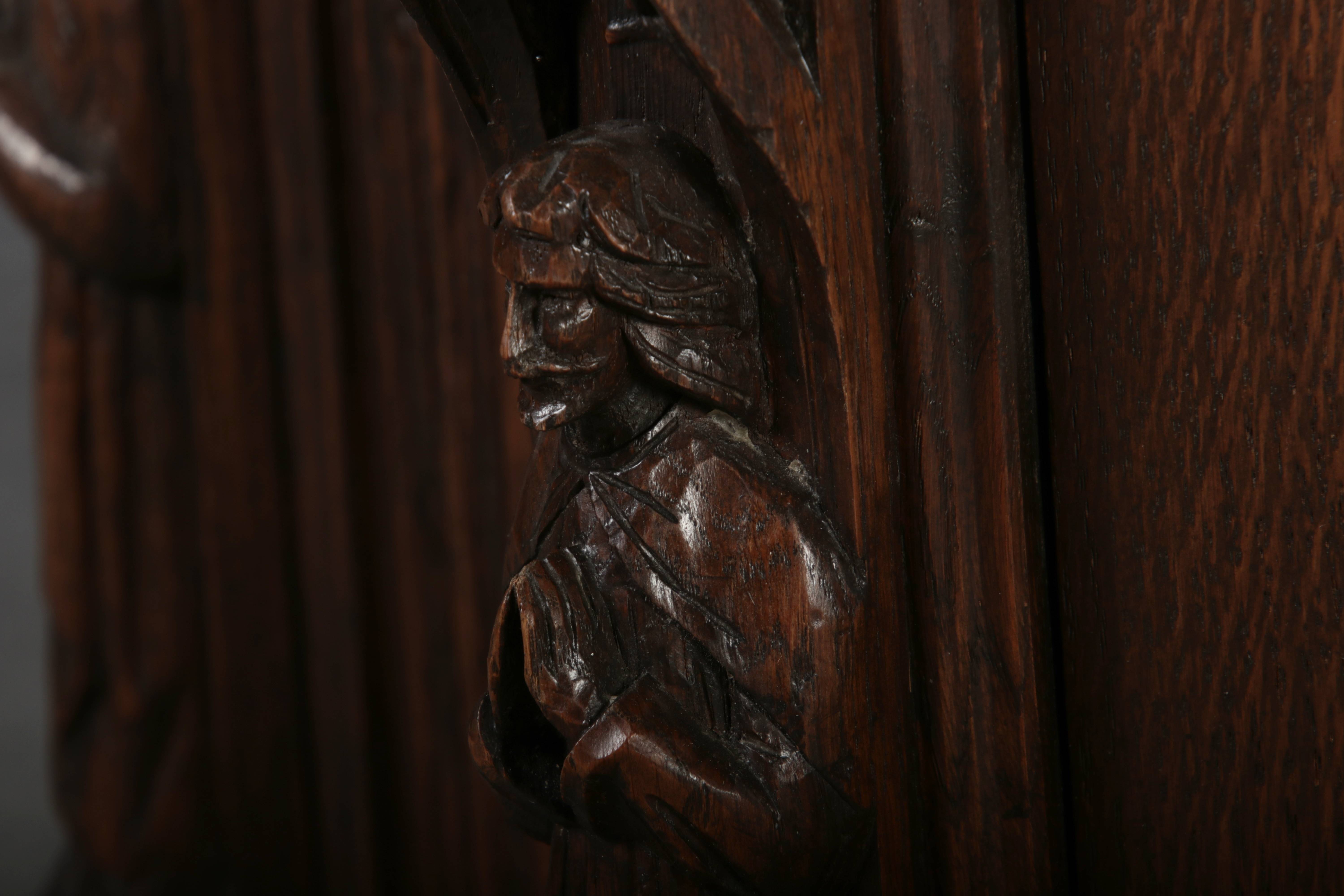 Prächtiger Schrank aus der Epoche des Historismus, gefertigt im späten 19. Jahrhundert. Das Möbel besticht durch sein außergewöhnlich reiches, tief gearbeitetes Schnitzwerk mit figürlichen und ornamentalen Darstellungen. Die Front ist in mehrere Felder gegliedert und zeigt reliefierte Szenen mit menschlichen Figuren, biblischen bzw. allegorischen Motiven sowie floralen und architektonischen Elementen. Der Korpus ist aus massivem Eichen Holz gearbeitet und zeigt eine warme, dunkel patinierte Oberfläche. Mit geschnitzten Säulen, profilierte Rahmen und aufwendig gestaltete Füllungen unterstreichen den repräsentativen Charakter des Schranks. Die handwerkliche Qualität und Detailtiefe der Schnitzereien zeugen von hoher Kunstfertigkeit. Innen bietet der Schrank großzügigen Stauraum und eignet sich sowohl als Aufbewahrungsmöbel als auch als eindrucksvolles Sammlerstück. Alters- und Gebrauchsspuren sind vorhanden und unterstreichen die Authentizität und den historischen Charakter des Möbels. Ein imposantes Originalstück des Historismus – ideal für Liebhaber historischer Möbel, repräsentative Interieurs oder Sammlungen.