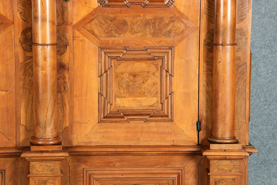 mit drei massiven großen Säulen Kassetenfüllungen und Einlegearbeiten.