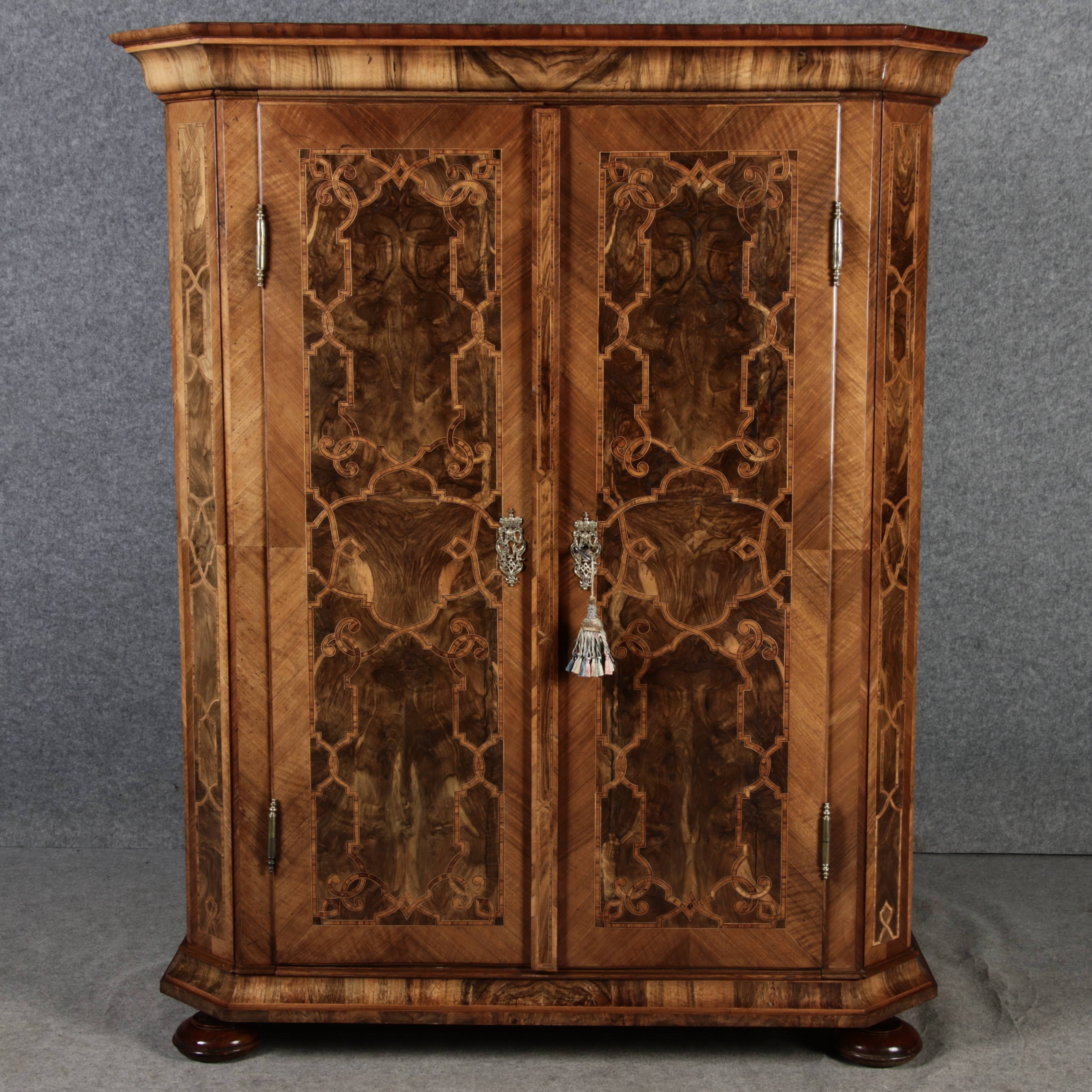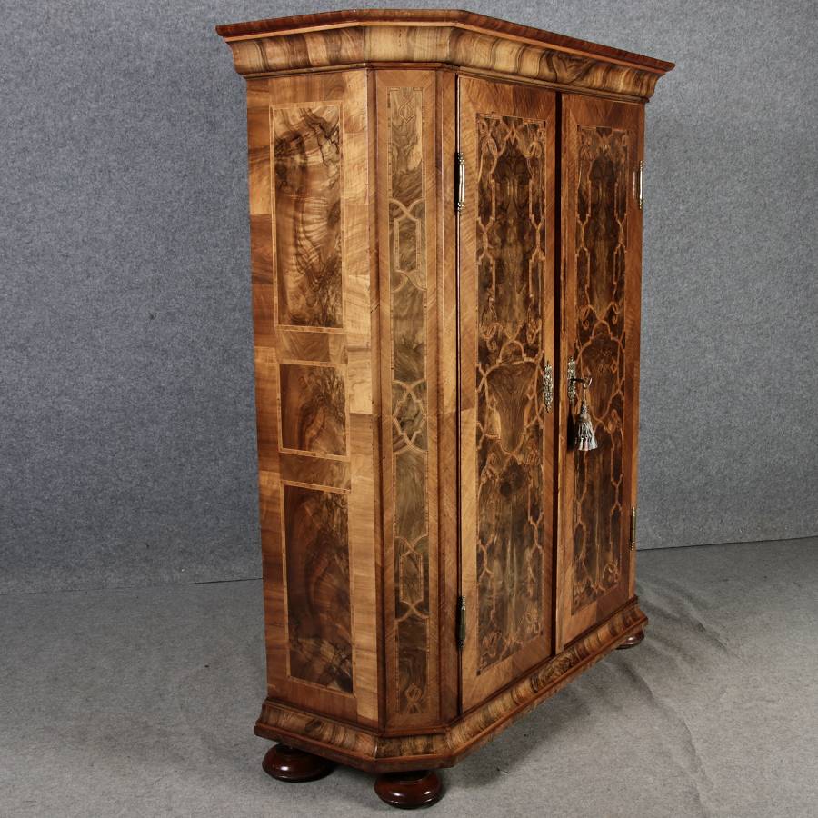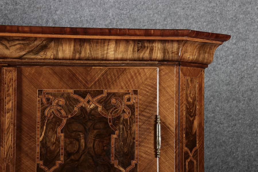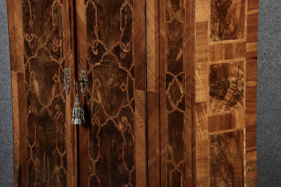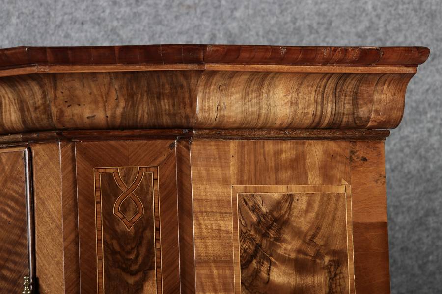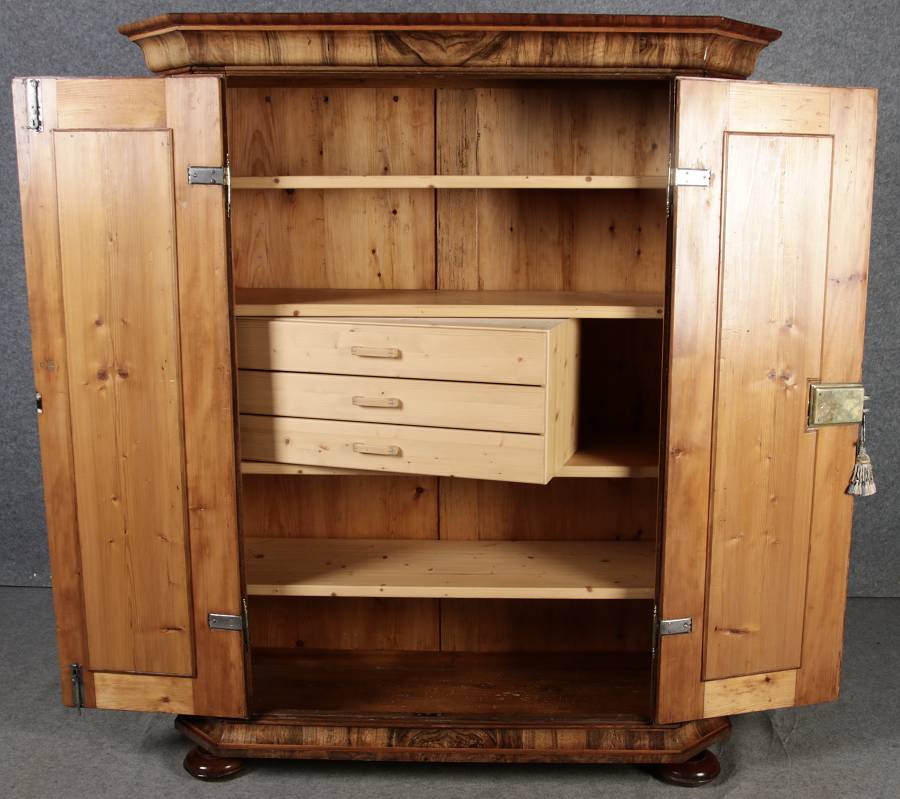 Masse/dimensions: Höhe/Height ca. 190 cm, Breite Korpus/Broad Boda ca. 140 cm, Breite Gesims/Broad cornice ca. 157 cm, Tiefe Korpus/Deep body ca. 48 cm, Tiefe Gesims/Deep cornice ca. 58 cm,