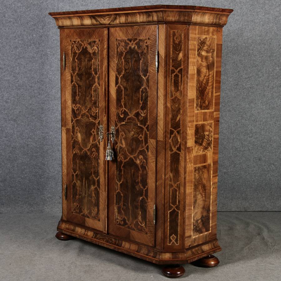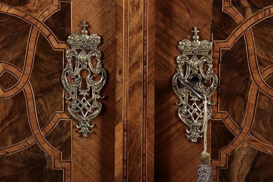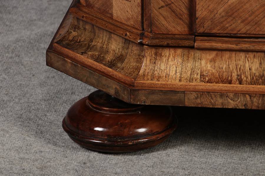 key: Die Holzart ist Nussbaum, Nussbaumwurzel und andere Hölzer ,er hat 1 Schlüssel