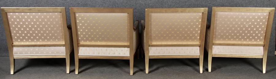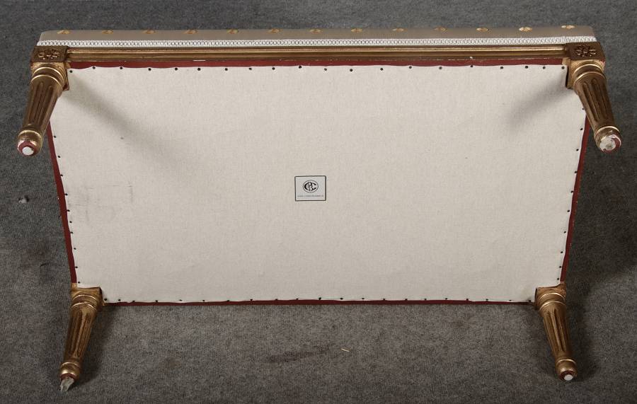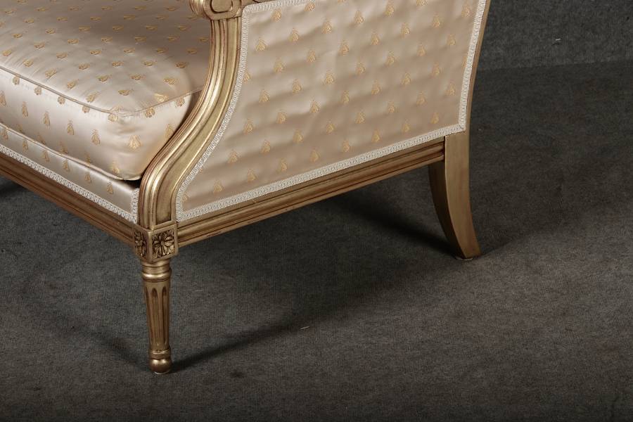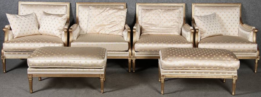 Beschreibung/description: Exklusive Sitzgruppe im Louis-XVI-Stil – Pierre Counot Blandin, Frankreich Diese außergewöhnliche, gepolsterte Sitzgruppe besteht aus vier vergoldeten Bergères sowie zwei passenden Bänken und wurde von der renommierten französischen Manufaktur Pierre Counot Blandin gefertigt. Die Möbel sind im eleganten Louis-XVI-Stil gehalten und überzeugen durch ihre klassische Linienführung, hochwertige Materialien und exzellente handwerkliche Verarbeitung. Die Sitzgruppe befindet sich insgesamt in sehr gutem Zustand. Lediglich minimale, Flecken sind vorhanden, siehe Bilder. Die Bezüge sind abziehbar und waschbar, was sowohl Pflegeleichtigkeit als auch Alltagstauglichkeit gewährleistet. Die Polsterung der Kissen von den Sitzbänken sowie die Kissen – vermutlich mit Daunenfedern gefüllt – sorgt für außergewöhnlichen Sitzkomfort. Aufgrund der Ausführung ist davon auszugehen, dass es sich um eine Sonderanfertigung handelt, da diese Sitzgruppe in dieser Form nicht im aktuellen Katalog von Counot Blandin gelistet ist. Vergleichbare Modelle sind jedoch im Herstellerkatalog zu finden. Bereits auf den ersten Blick wird deutlich, dass es sich um handgefertigte Möbel von höchster Qualität handelt. Die Sitzgruppe stammt von