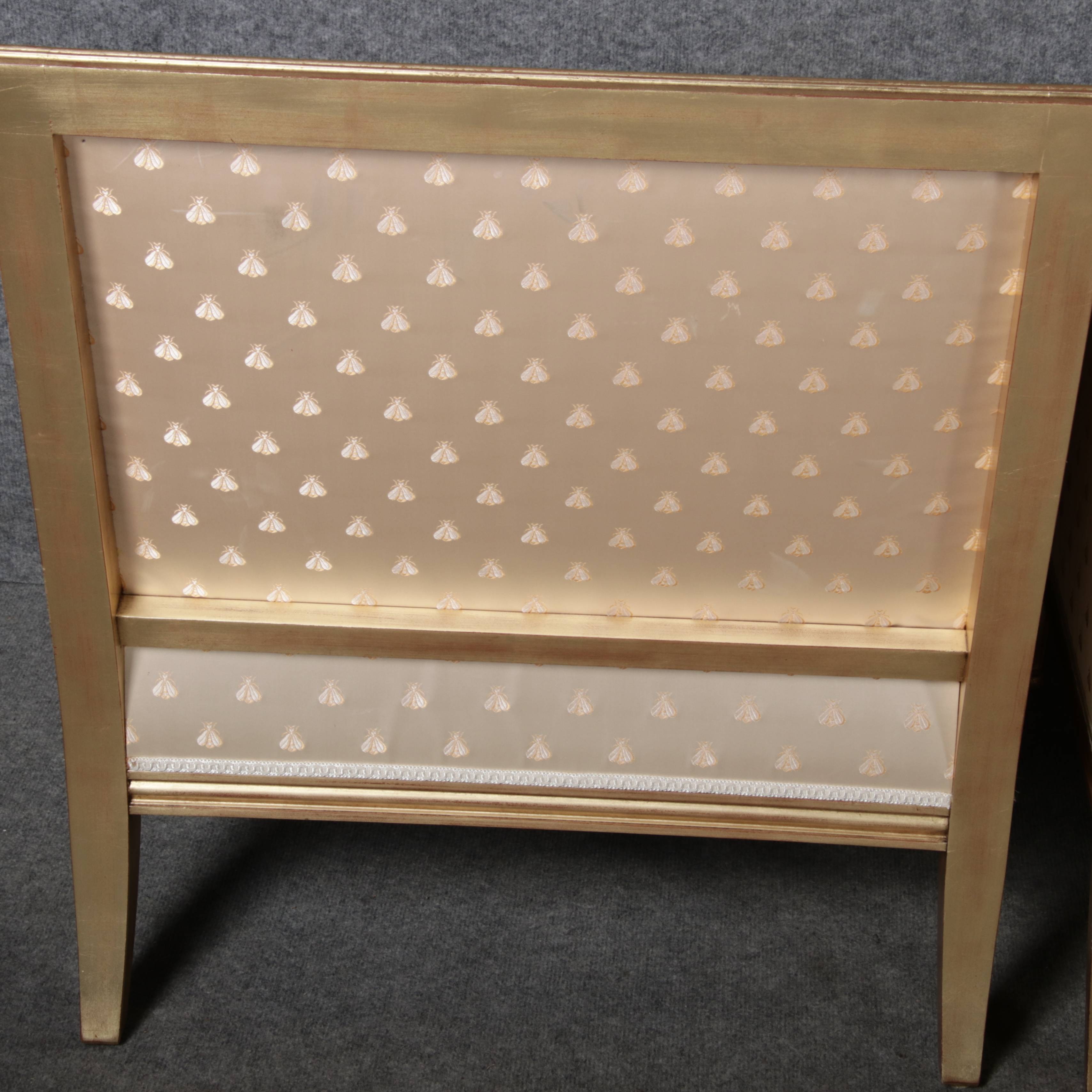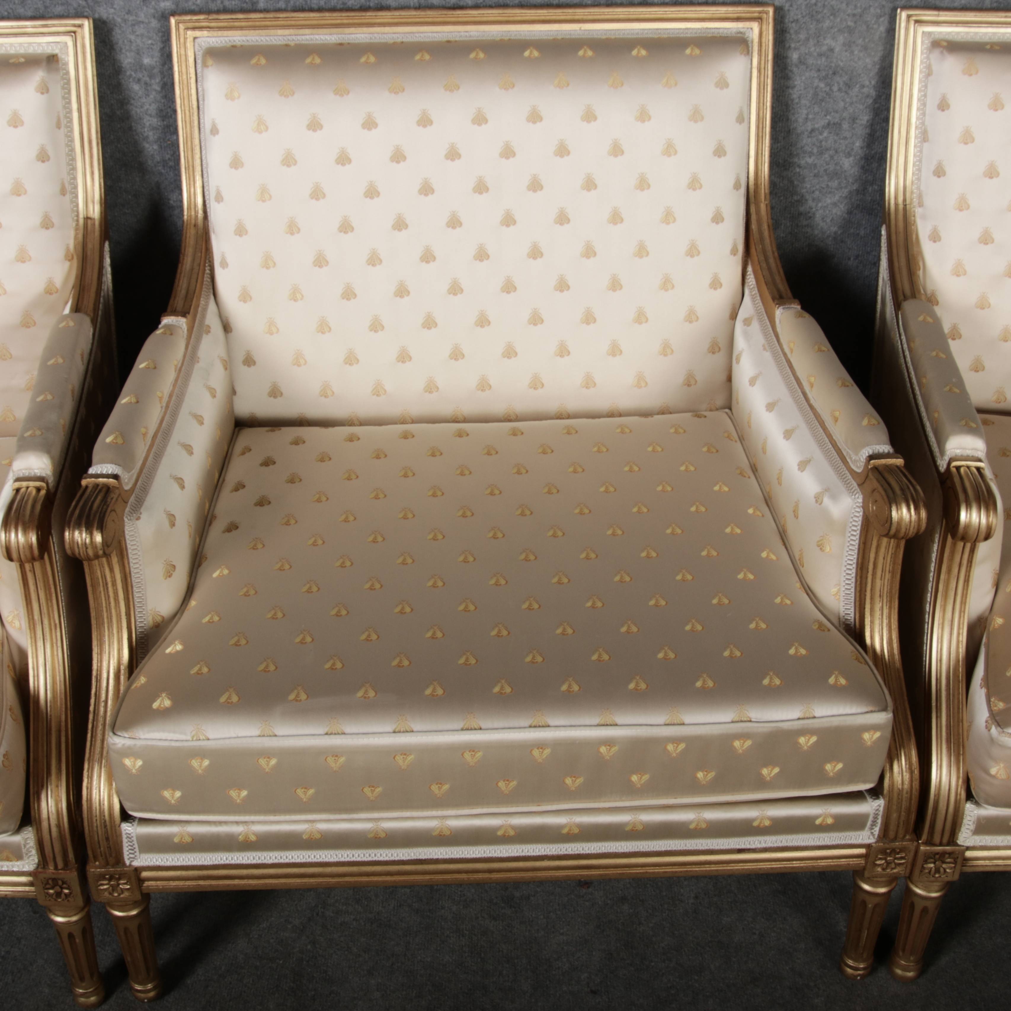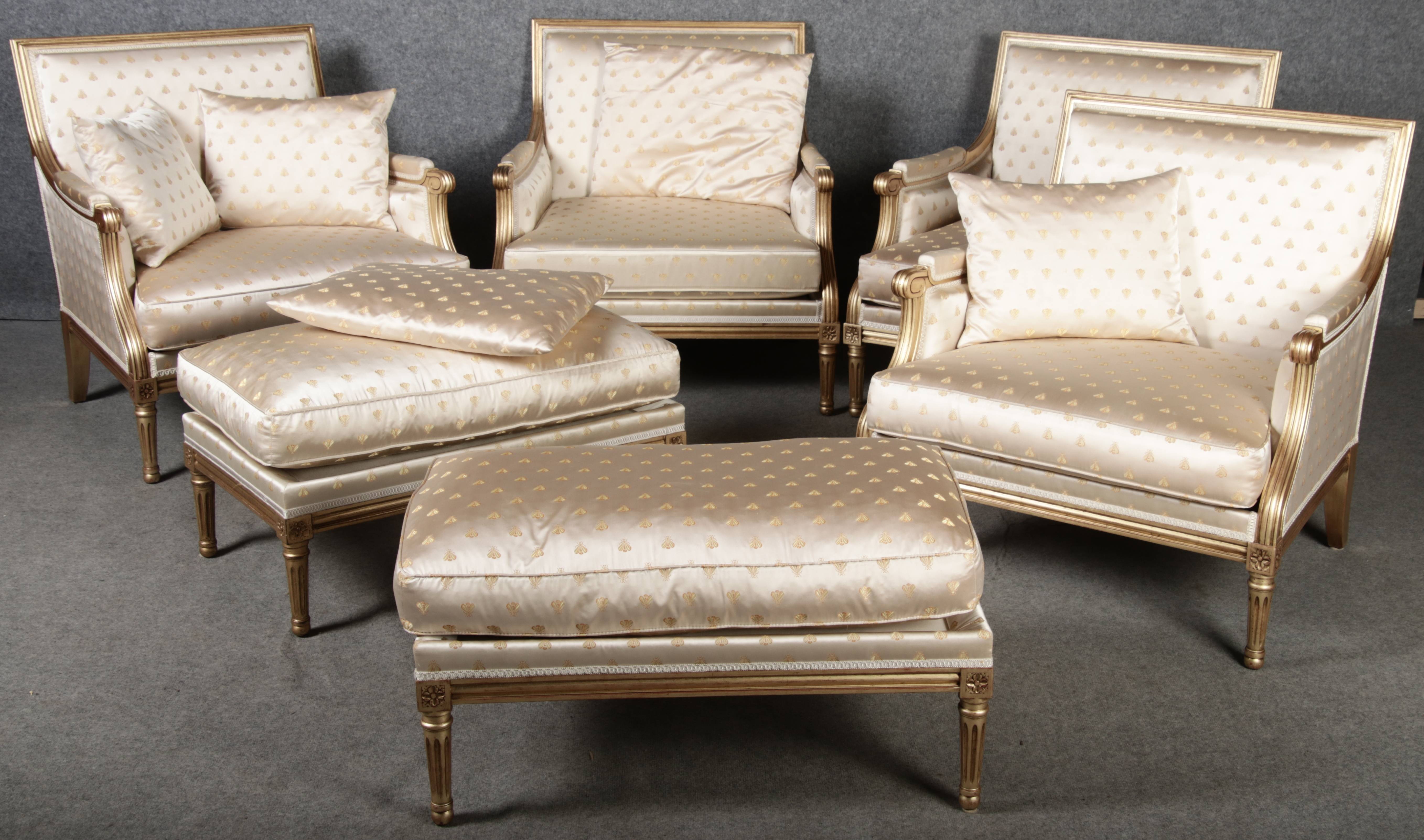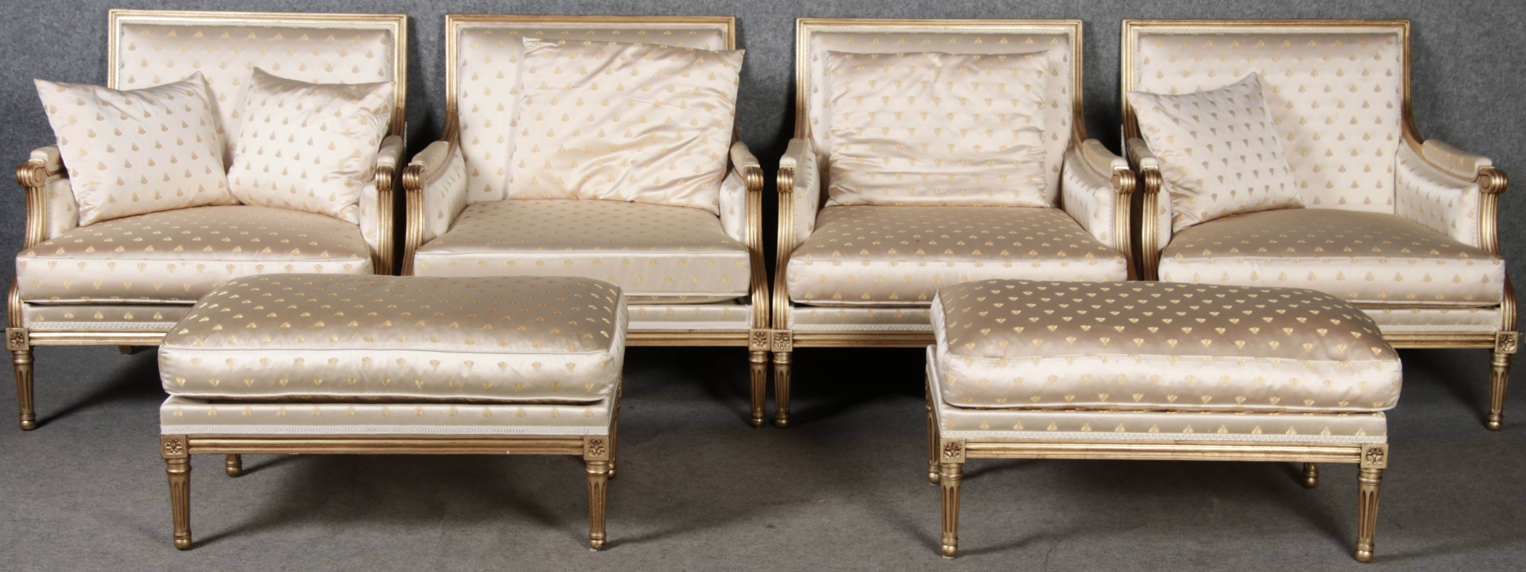 Exklusive Sitzgruppe im Louis-XVI-Stil – Pierre Counot Blandin, Frankreich Diese außergewöhnliche, gepolsterte Sitzgruppe besteht aus vier vergoldeten Bergères sowie zwei passenden Bänken und wurde von der renommierten französischen Manufaktur Pierre Counot Blandin gefertigt. Die Möbel sind im eleganten Louis-XVI-Stil gehalten und überzeugen durch ihre klassische Linienführung, hochwertige Materialien und exzellente handwerkliche Verarbeitung. Die Sitzgruppe befindet sich insgesamt in sehr gutem Zustand. Lediglich minimale, Flecken sind vorhanden, siehe Bilder. Die Bezüge sind abziehbar und waschbar, was sowohl Pflegeleichtigkeit als auch Alltagstauglichkeit gewährleistet. Die Polsterung der Kissen von den Sitzbänken sowie die Kissen – vermutlich mit Daunenfedern gefüllt – sorgt für außergewöhnlichen Sitzkomfort. Aufgrund der Ausführung ist davon auszugehen, dass es sich um eine Sonderanfertigung handelt, da diese Sitzgruppe in dieser Form nicht im aktuellen Katalog von Counot Blandin gelistet ist. Vergleichbare Modelle sind jedoch im Herstellerkatalog zu finden. Bereits auf den ersten Blick wird deutlich, dass es sich um handgefertigte Möbel von höchster Qualität handelt. Die Sitzgruppe stammt von