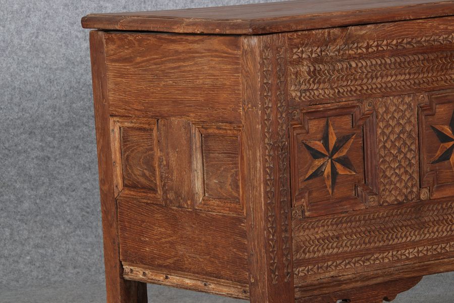 Barocktruhe mit Kerbschnitzereien und Einlegearbeiten um 1700 | ||||||||||||||||||||||||||||||||||||||||||||||||||||||||||||||||||