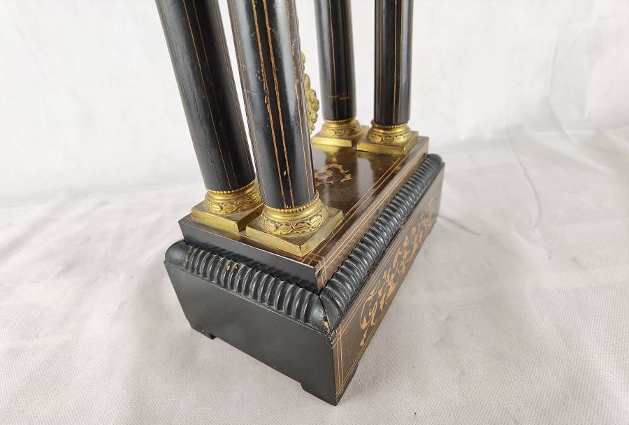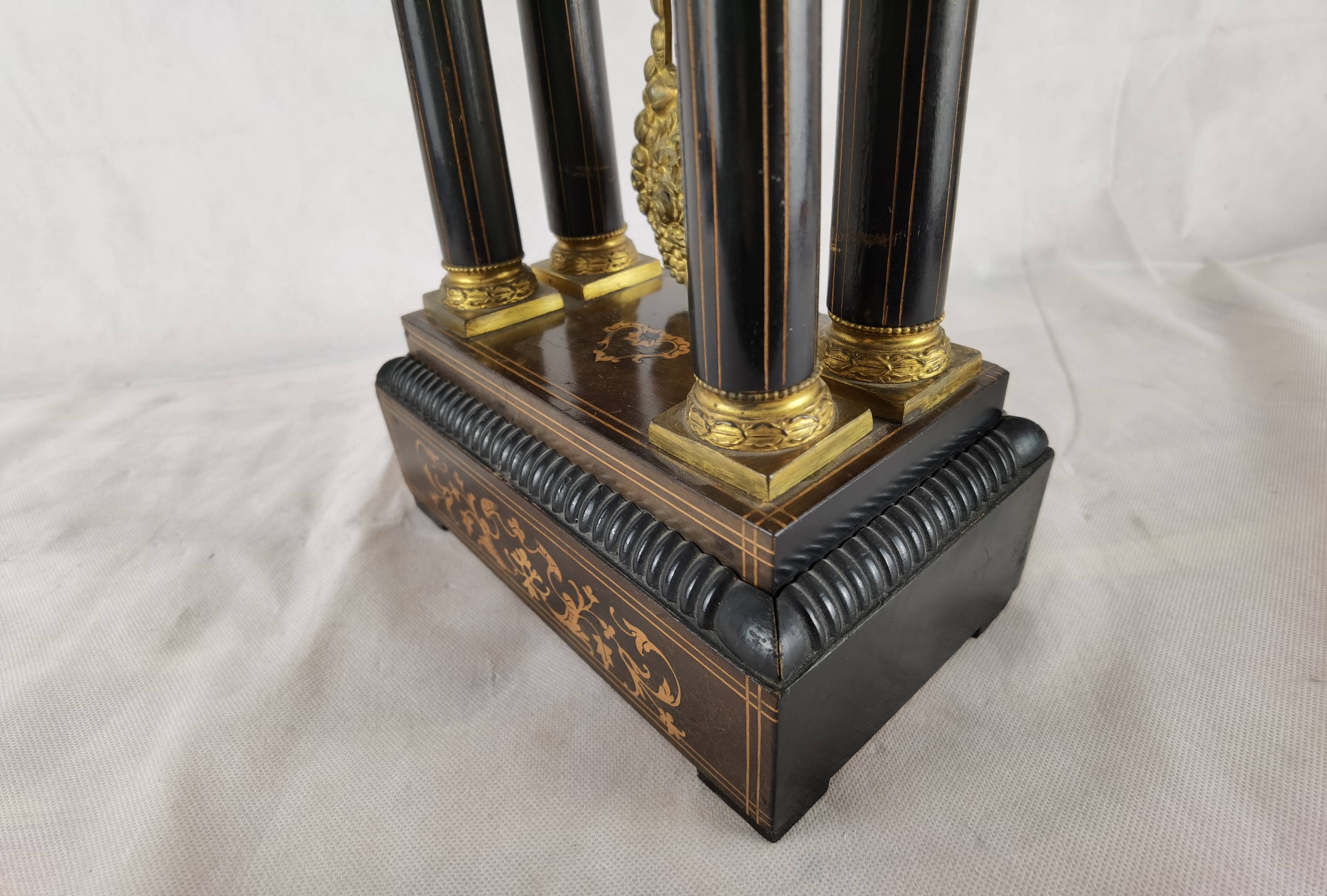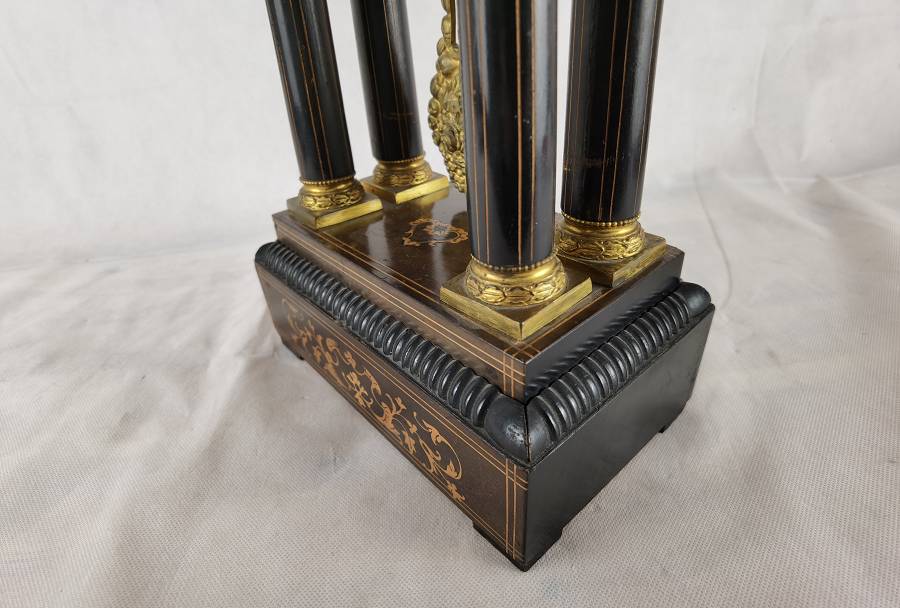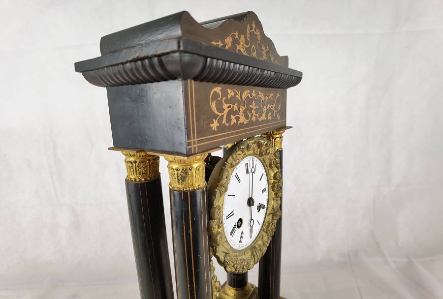 Beschreibung/description: Antike französische Säulenuhr, signiert „Japy Frères, Paris“, um 1840/50 Elegante Pendeluhr mit achttägigem Federzugwerk und klassischem Aufbau in viersäuliger Architektur. Das Uhrwerk verfügt über Stunden- und Halbstundenschlag auf Glocke sowie eine Pendelfederaufhängung. Das Emailzifferblatt mit römischen Ziffern ist von vergoldeter Bronzelunette eingefasst und mit feinen gebläuten Stahlzeigern ausgestattet. Auch die reich verzierte Pendellinse besteht aus feuervergoldeter Bronze. Das sorgfältig gearbeitete Holzgehäuse zeigt kunstvolle Marketerie-Intarsien im Biedermeier-Stil und ist mit dekorativen Bronzeapplikationen veredelt. Die vier schwarzen Säulen mit vergoldeten Basen und Kapitellen verleihen der Uhr einen repräsentativen, klassizistisch inspirierten Charakter.