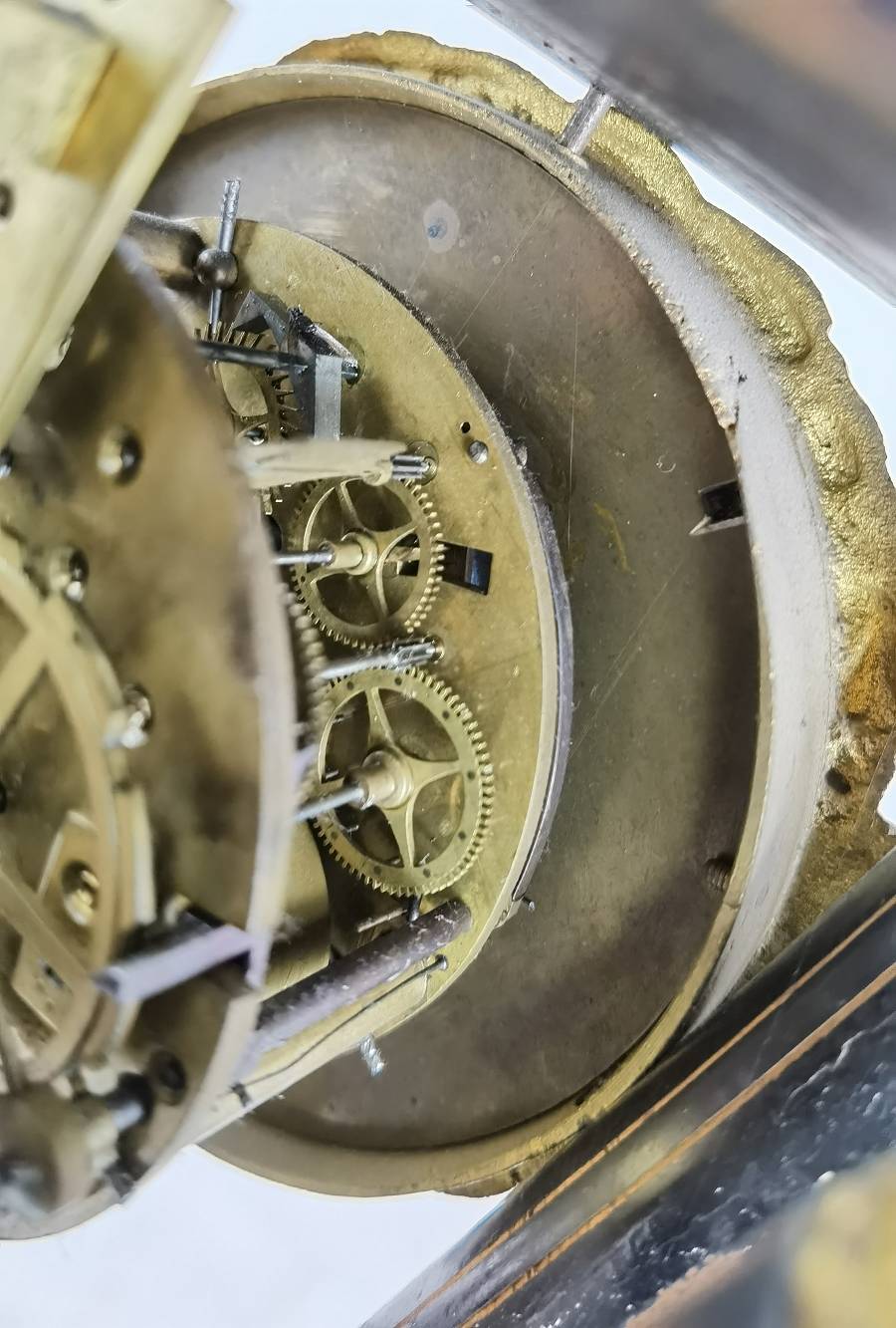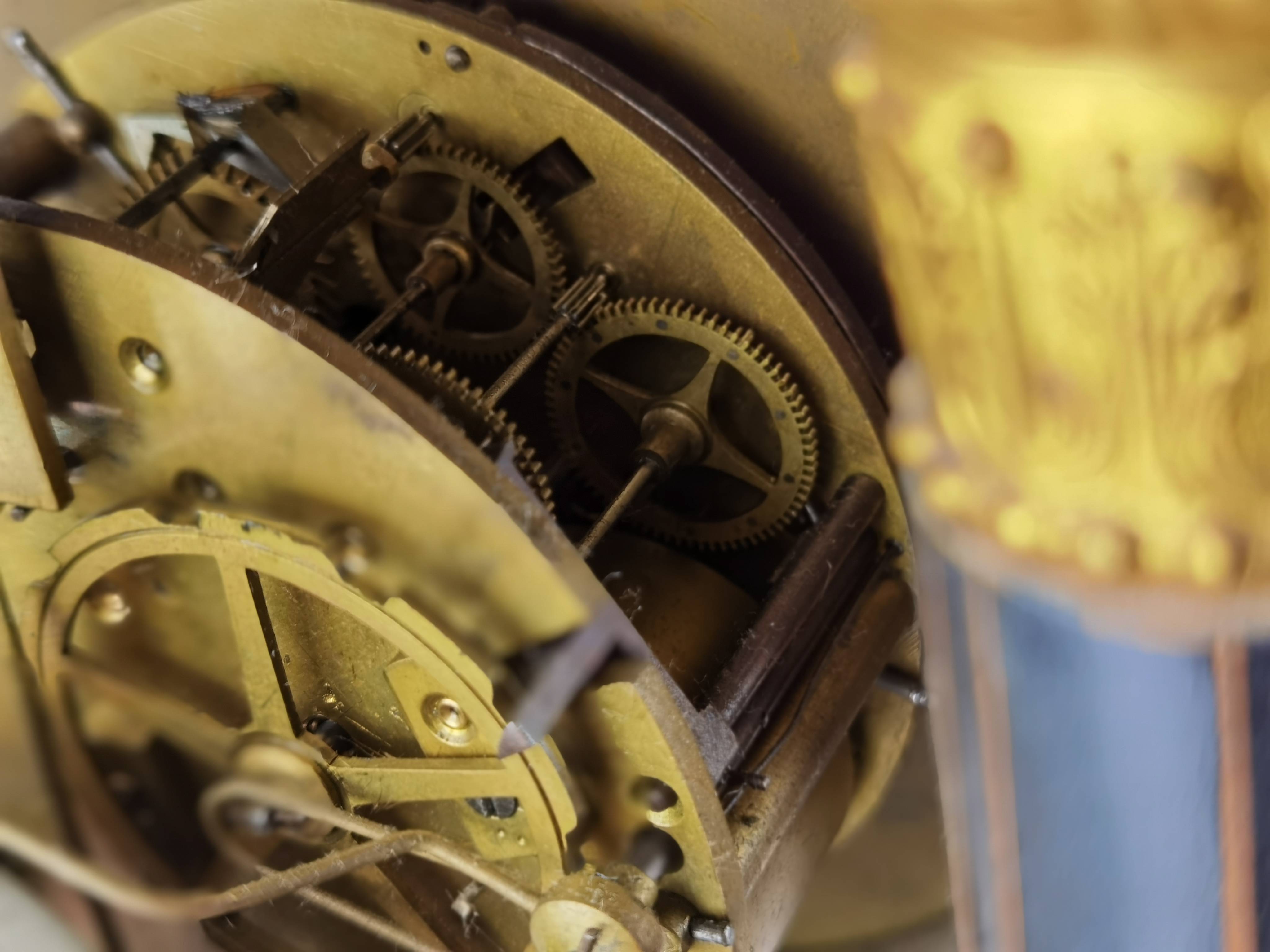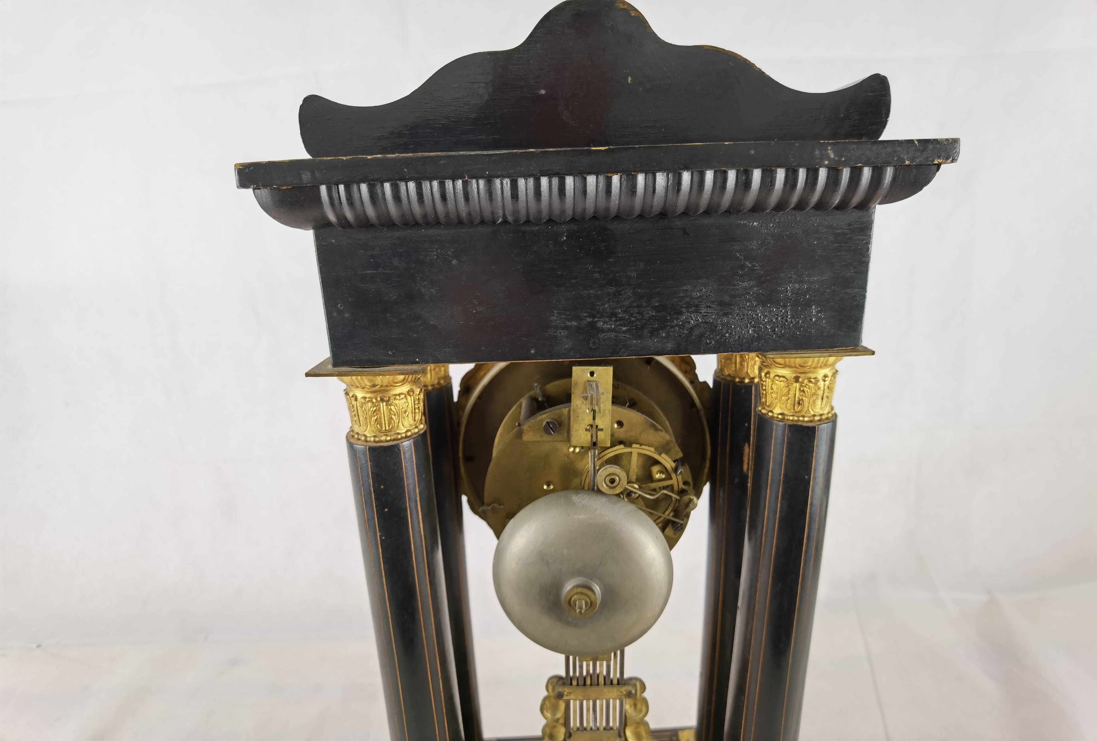 Beschreibung/description: Antike französische Säulenuhr, signiert „Japy Frères, Paris“, um 1840/50 Elegante Pendeluhr mit achttägigem Federzugwerk und klassischem Aufbau in viersäuliger Architektur. Das Uhrwerk verfügt über Stunden- und Halbstundenschlag auf Glocke sowie eine Pendelfederaufhängung. Das Emailzifferblatt mit römischen Ziffern ist von vergoldeter Bronzelunette eingefasst und mit feinen gebläuten Stahlzeigern ausgestattet. Auch die reich verzierte Pendellinse besteht aus feuervergoldeter Bronze. Das sorgfältig gearbeitete Holzgehäuse zeigt kunstvolle Marketerie-Intarsien im Biedermeier-Stil und ist mit dekorativen Bronzeapplikationen veredelt. Die vier schwarzen Säulen mit vergoldeten Basen und Kapitellen verleihen der Uhr einen repräsentativen, klassizistisch inspirierten Charakter.
