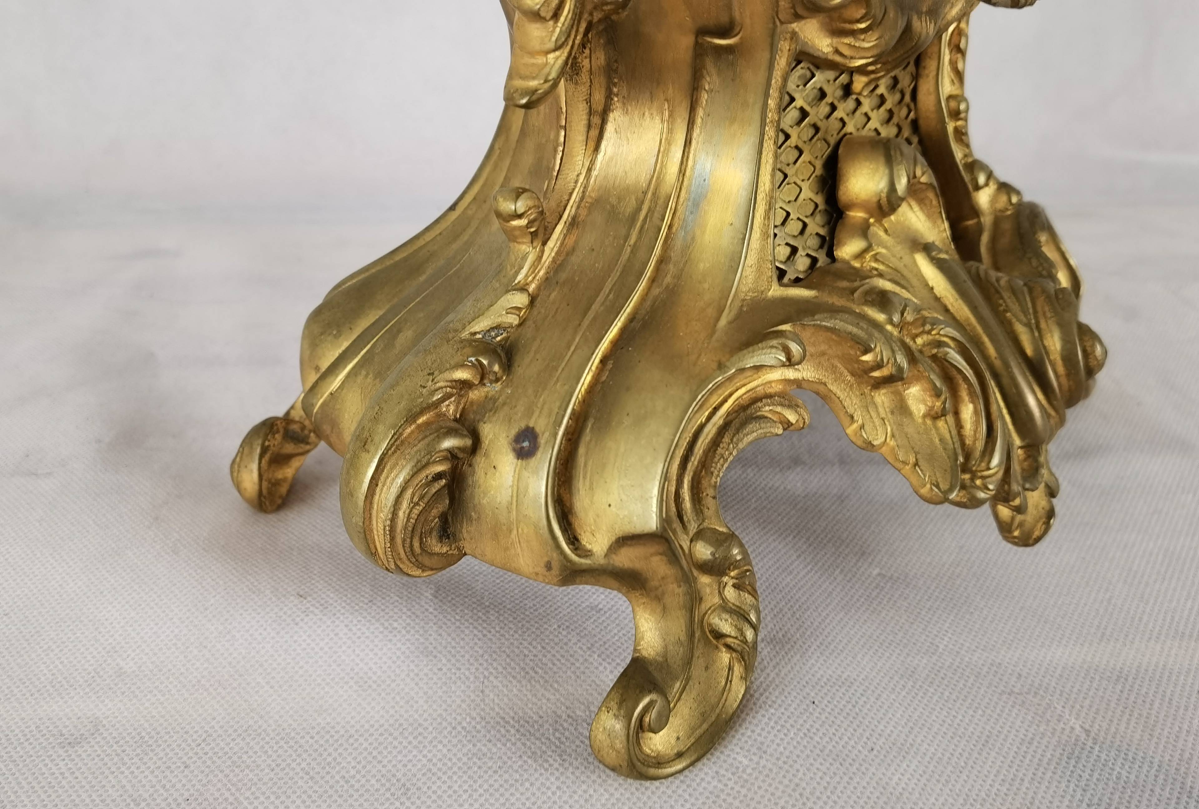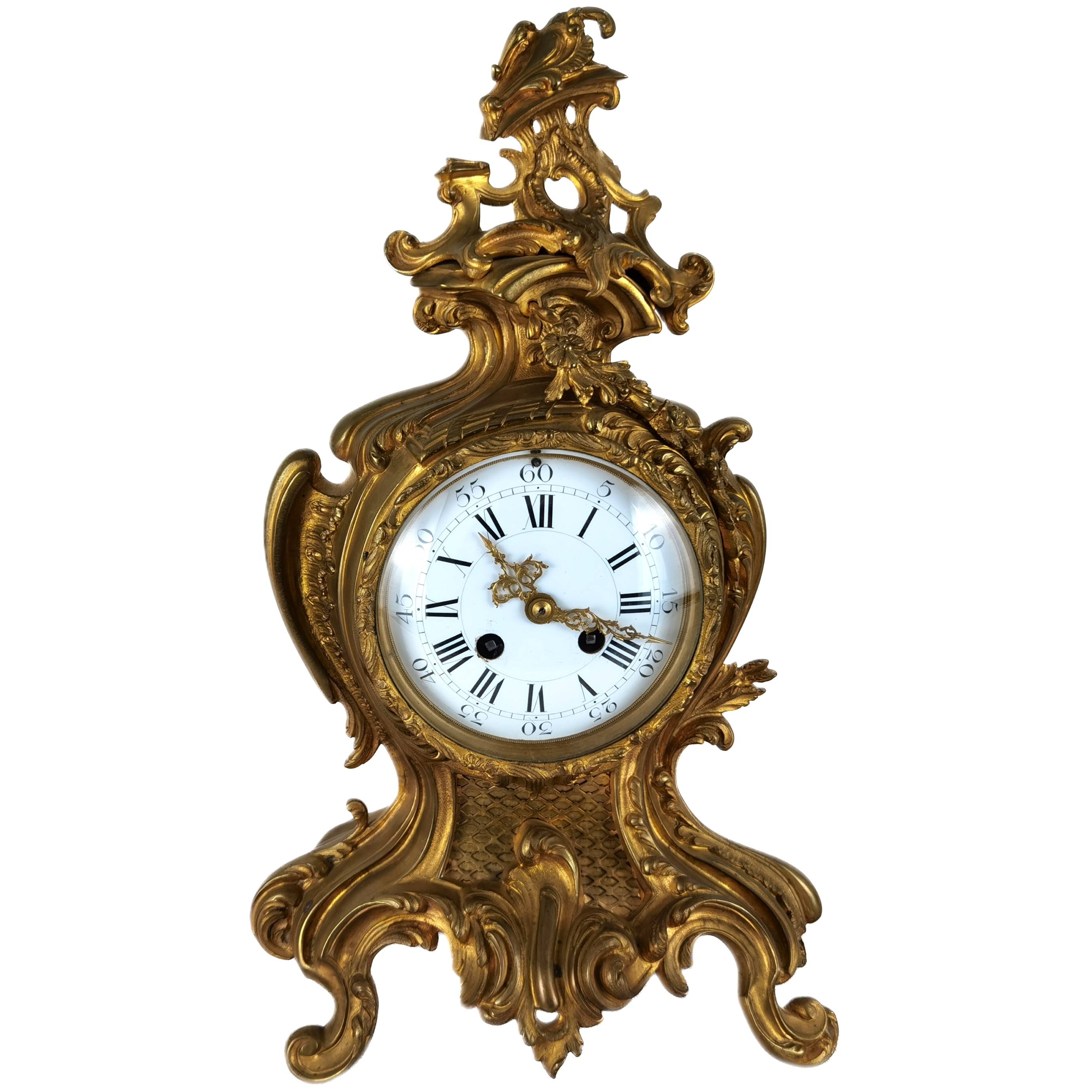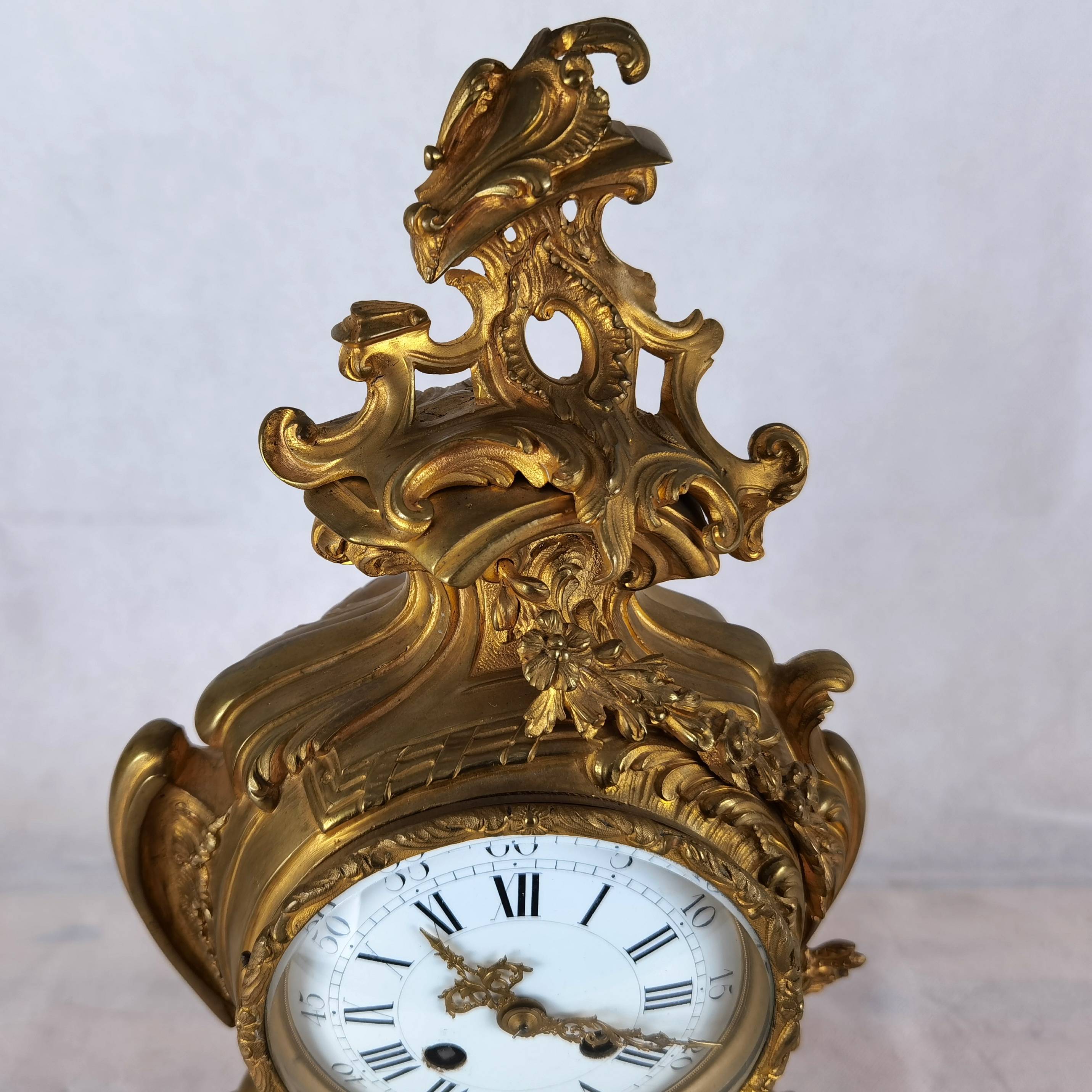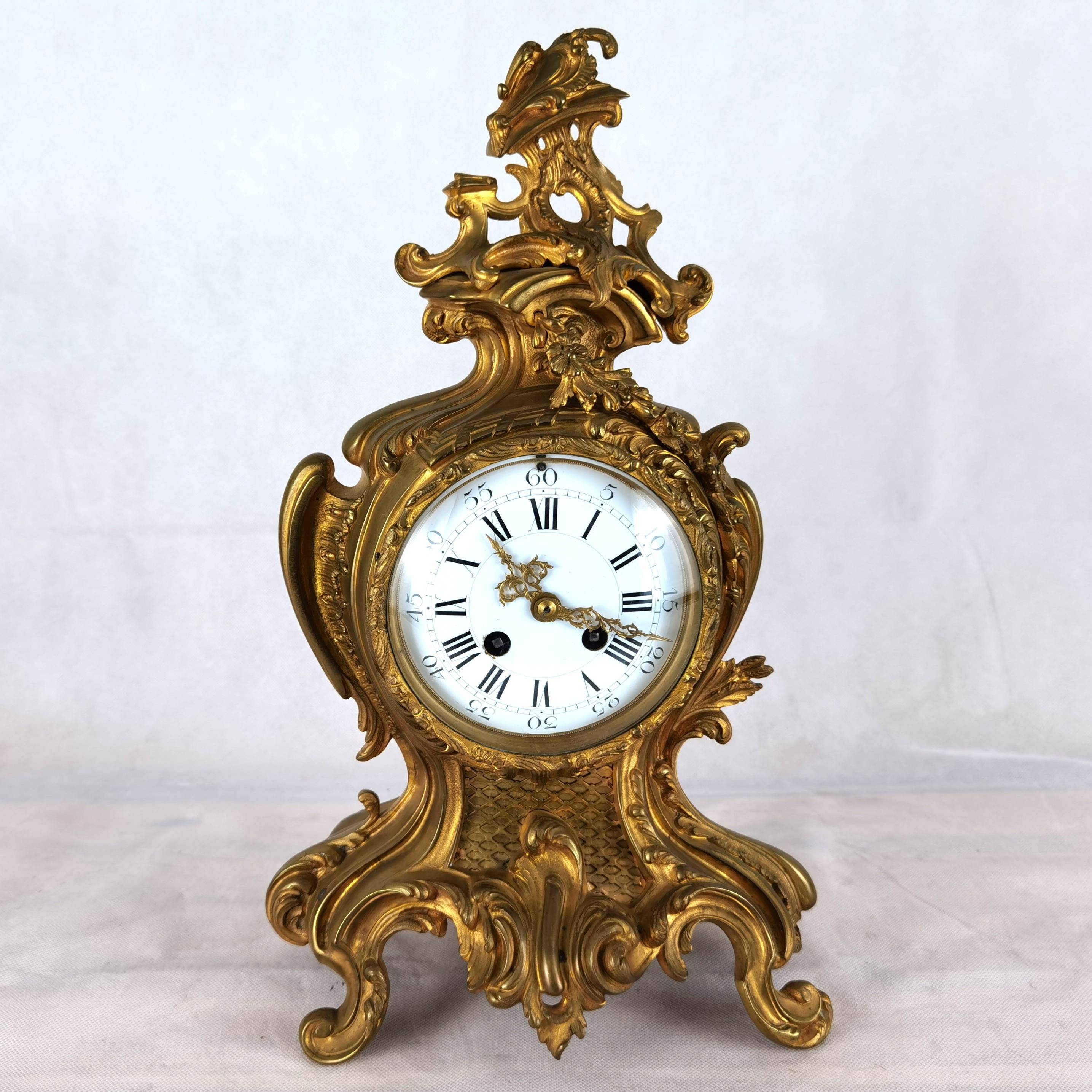 Antike Neorokoko Pendule Bronze, vergoldet 19 Jh. Diese elegante französische Pendule aus dem 19. Jahrhundert präsentiert sich in einem prachtvollen Rokoko-Design mit reichem, geschwungenem Dekor und fein ausgearbeiteten Ornamenten. Das Gehäuse besteht aus feuervergoldetem Bronze (Ormolu) und zeigt die typischen asymmetrischen Formen und floralen Elemente dieser Epoche. Das Emailzifferblatt mit römischen Stunden- und arabischen Minutenangaben ist sehr gut erhalten und verfügt über fein gearbeitete, vergoldete Zeiger. Die Uhr vermittelt einen eindrucksvollen dekorativen Charakter und ist ein klassisches Beispiel französischer Handwerkskunst. Es handelt sich um ein klassisches 8-Tage-Federwerk, typischerweise mit Halbstunden- und Stundenschlag auf Glocke (Gong oder Schale), wie es in französischen Pendulen dieser Zeit üblich ist. |
