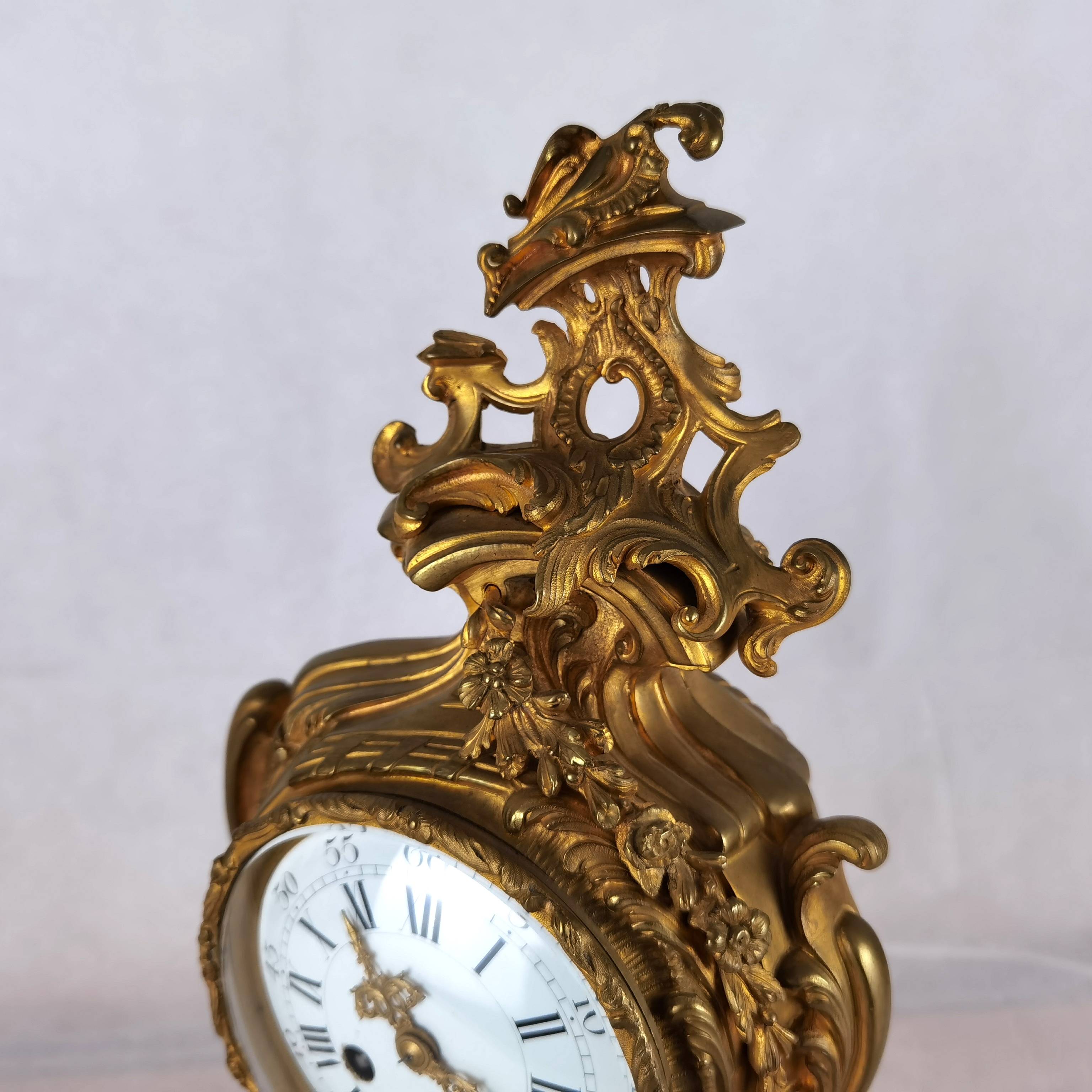 Beschreibung/description: Diese elegante französische Pendule aus dem 19. Jahrhundert präsentiert sich in einem prachtvollen Rokoko-Design mit reichem, geschwungenem Dekor und fein ausgearbeiteten Ornamenten. Das Gehäuse besteht aus feuervergoldetem Bronze (Ormolu) und zeigt die typischen asymmetrischen Formen und floralen Elemente dieser Epoche. Das Emailzifferblatt mit römischen Stunden- und arabischen Minutenangaben ist sehr gut erhalten und verfügt über fein gearbeitete, vergoldete Zeiger. Die Uhr vermittelt einen eindrucksvollen dekorativen Charakter und ist ein klassisches Beispiel französischer Handwerkskunst. Es handelt sich um ein klassisches 8-Tage-Federwerk, typischerweise mit Halbstunden- und Stundenschlag auf Glocke (Gong oder Schale), wie es in französischen Pendulen dieser Zeit üblich ist. ArtikelNummer /number: uhr117