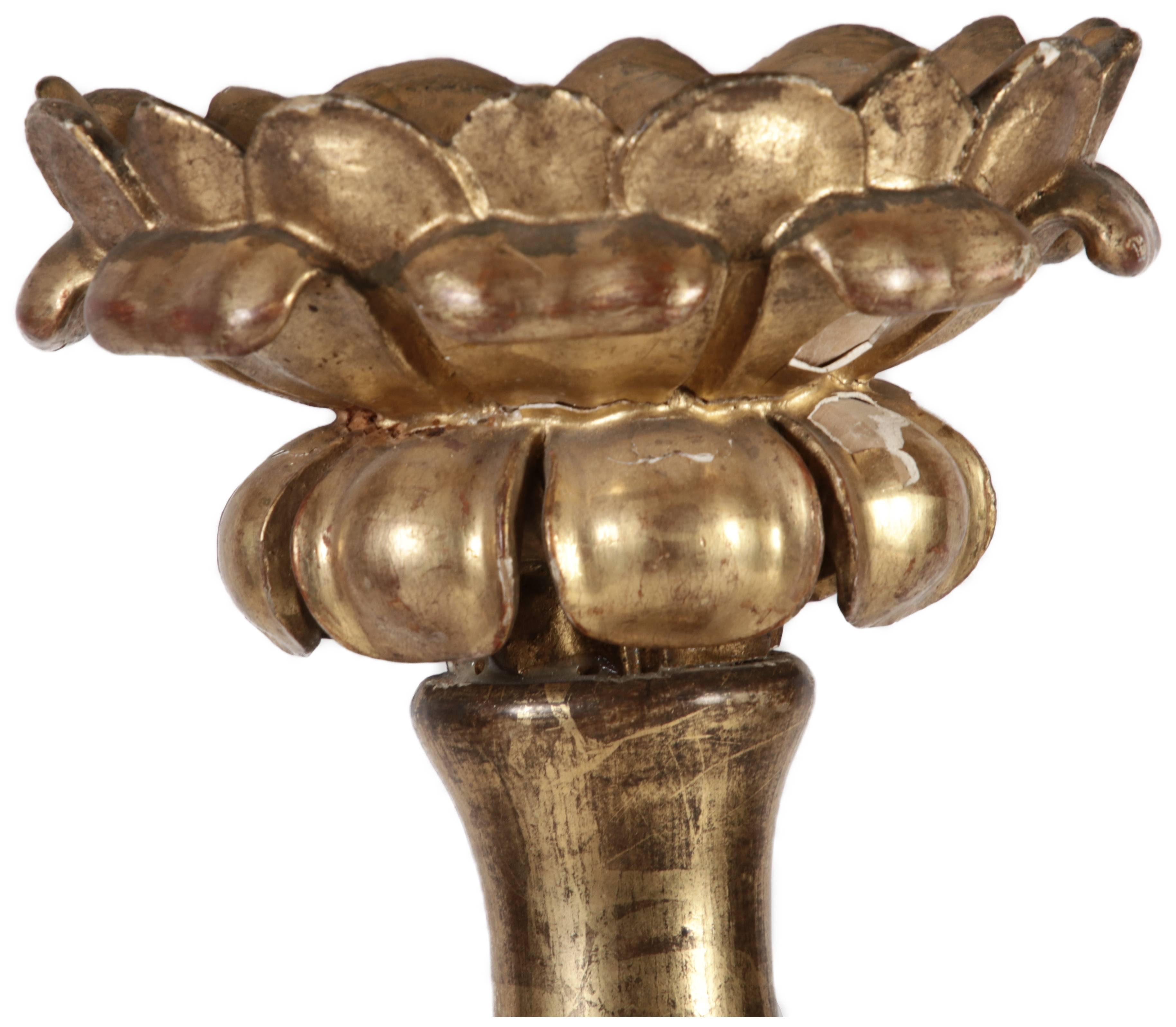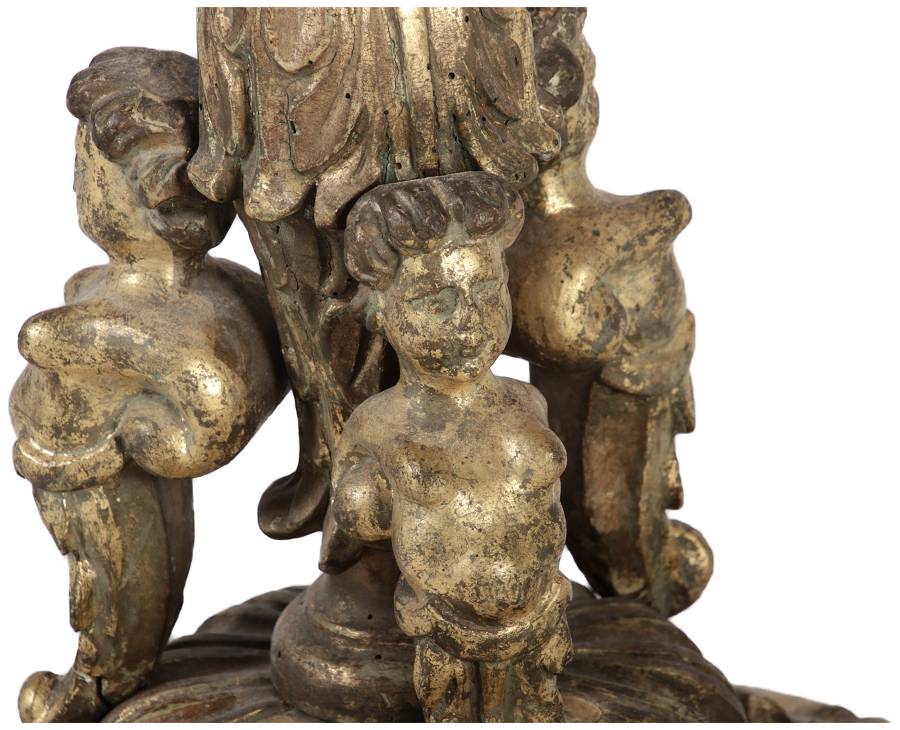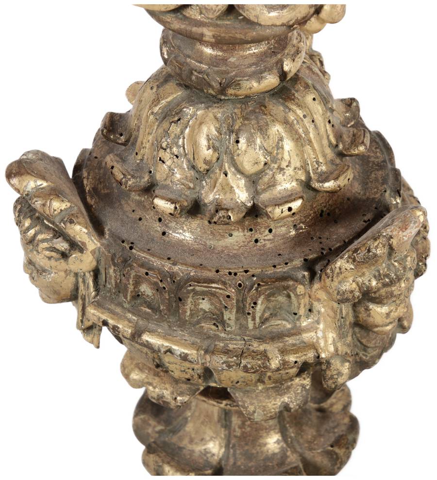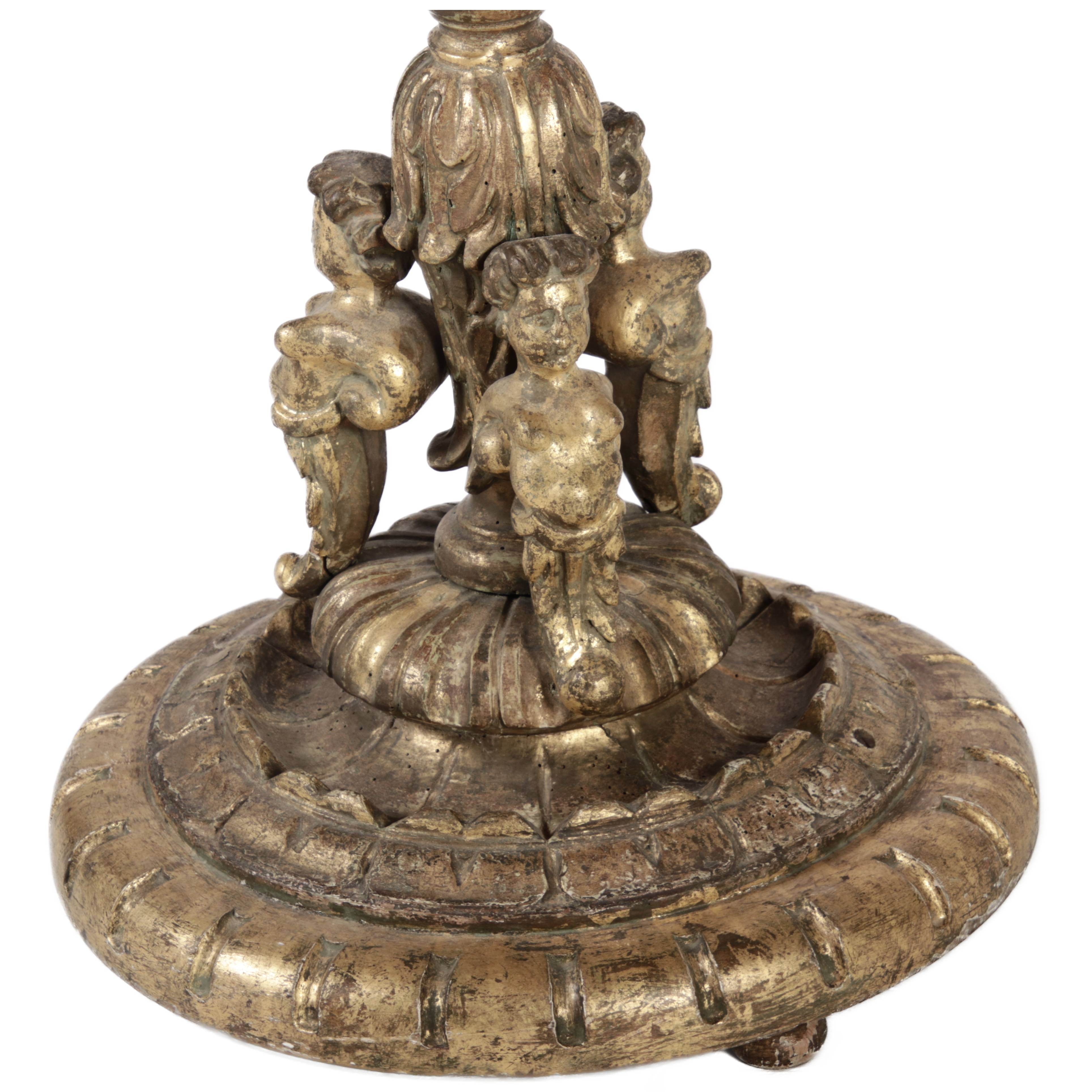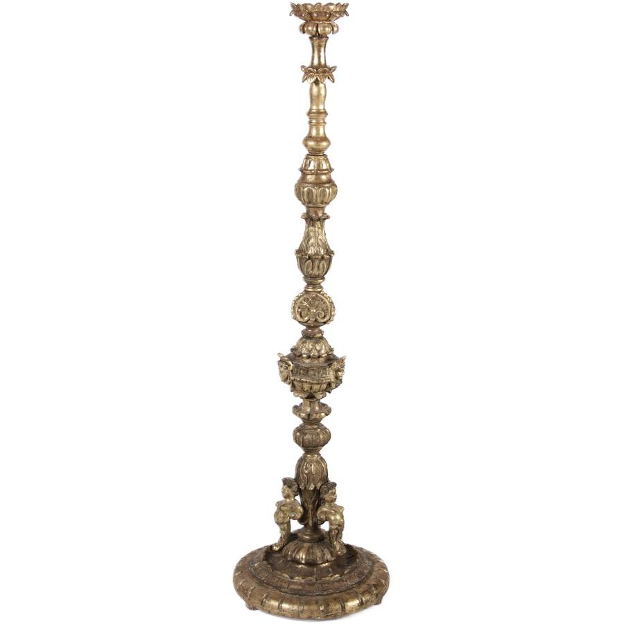 | Antiker 150 cm hoher Bodenleuchter Holz goldgefasst 18 Jh |