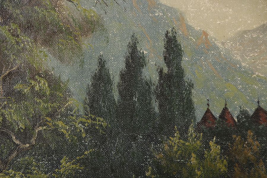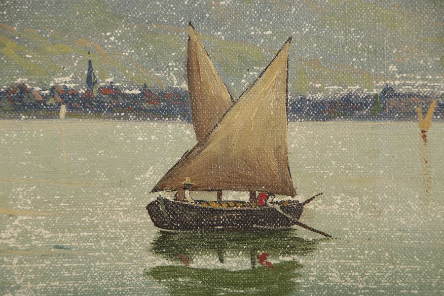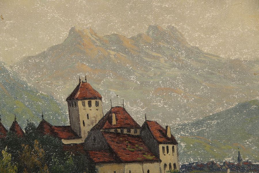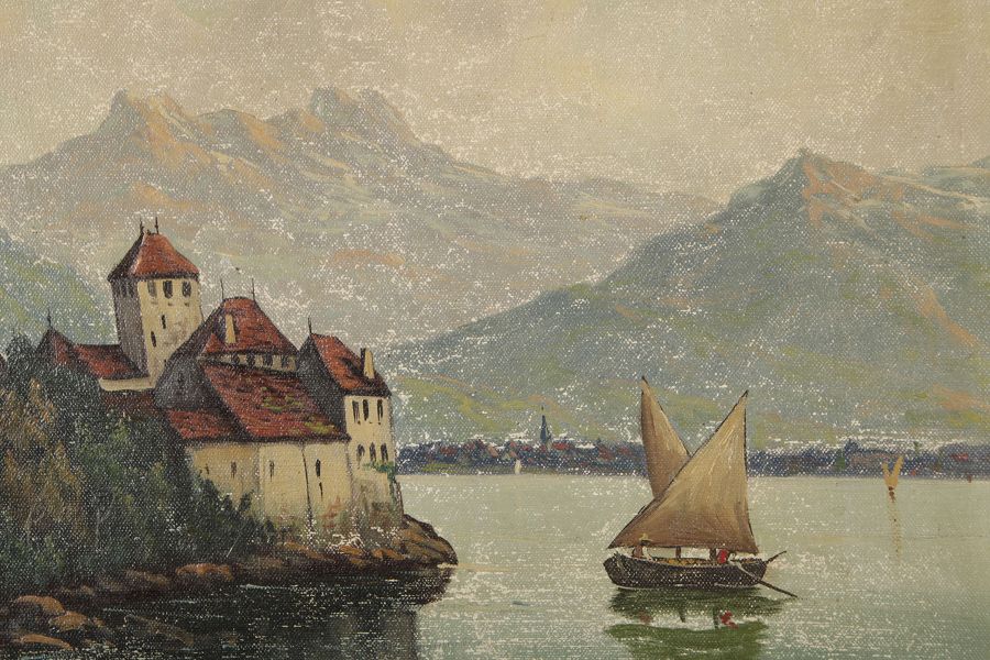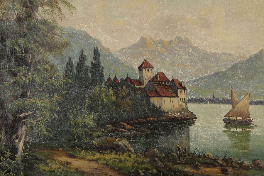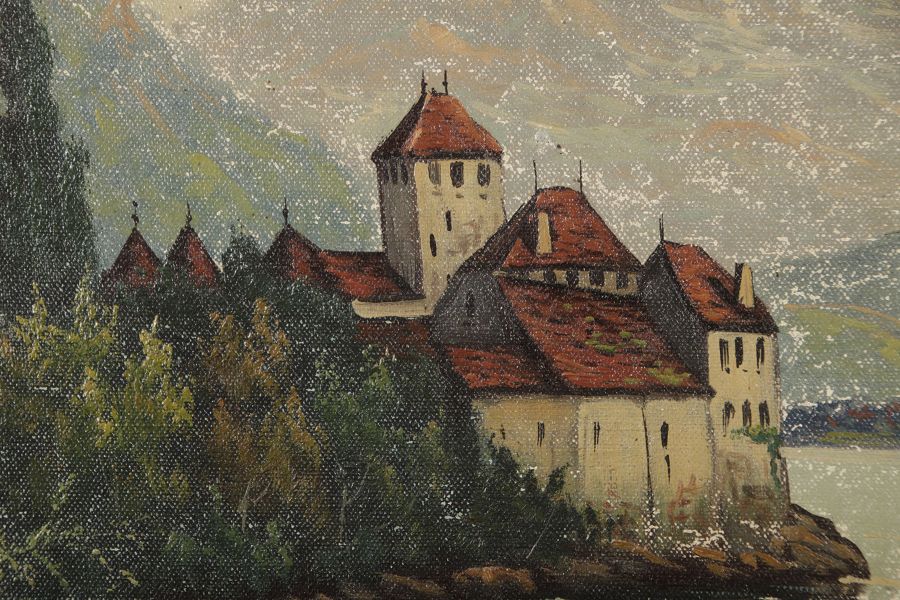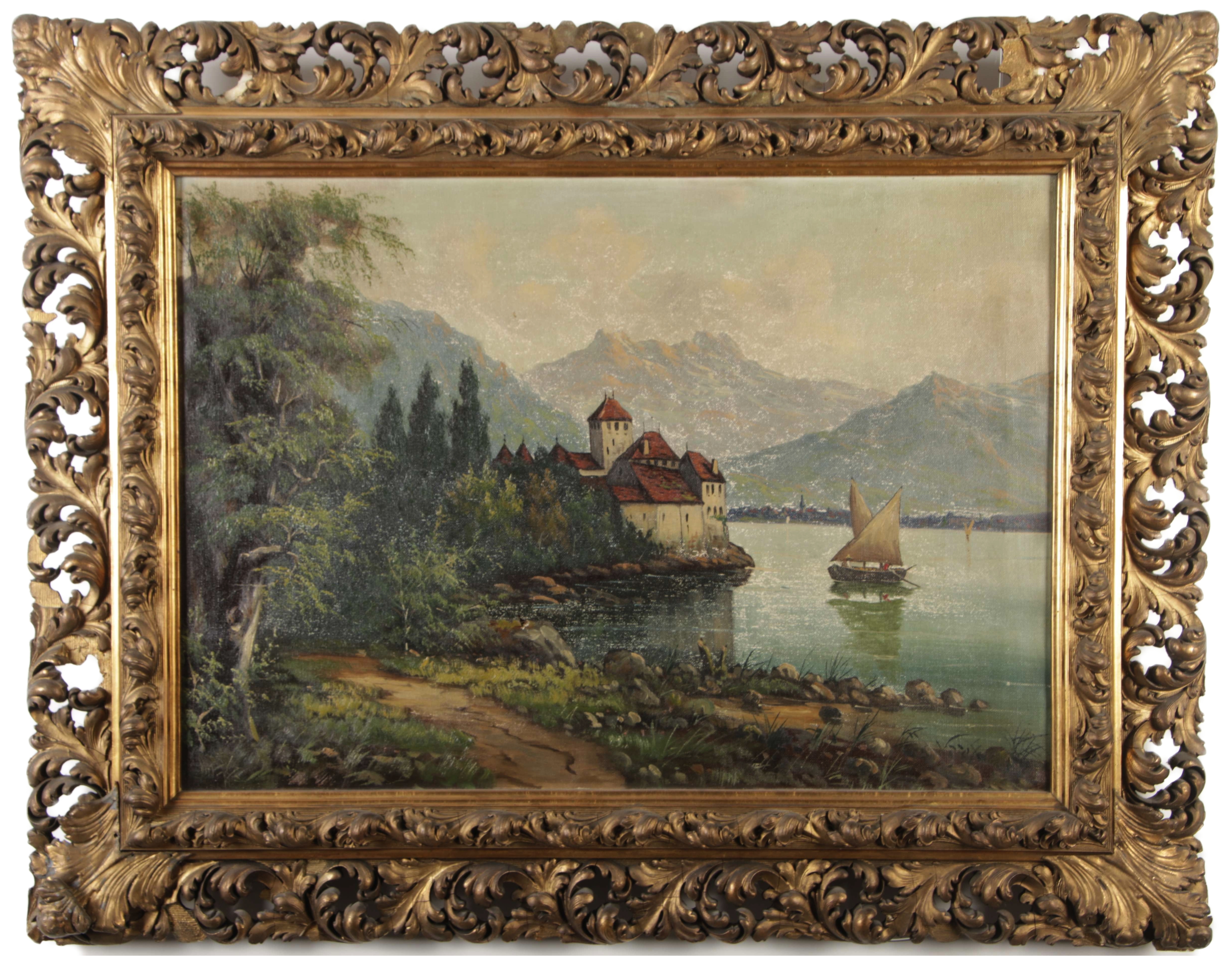 Landschaft Chateau Chillon Leman See, Schweiz Ölbild auf Leinwand 19 Jh. im durchbrochenen Holzrahmen |