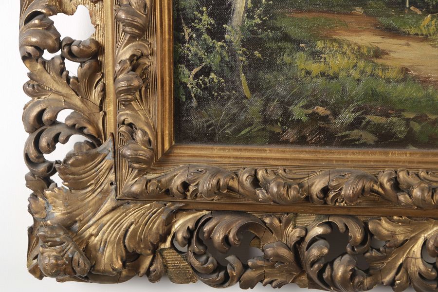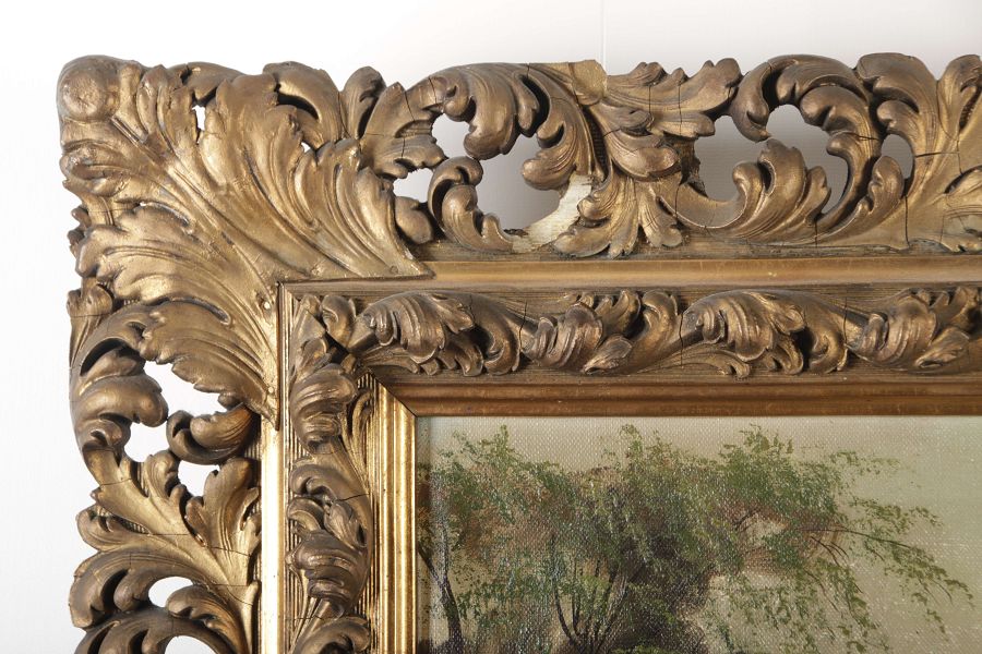 | Landschaft Chateau Chillon Leman See, Schweiz Ölbild auf Leinwand 19 Jh. im durchbrochenen Holzrahmen |