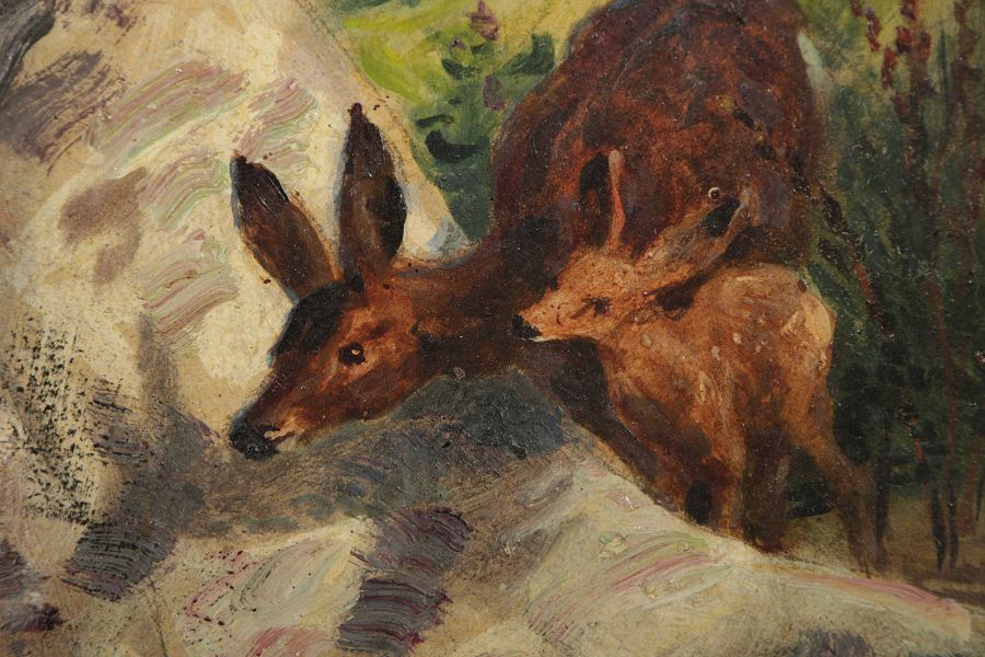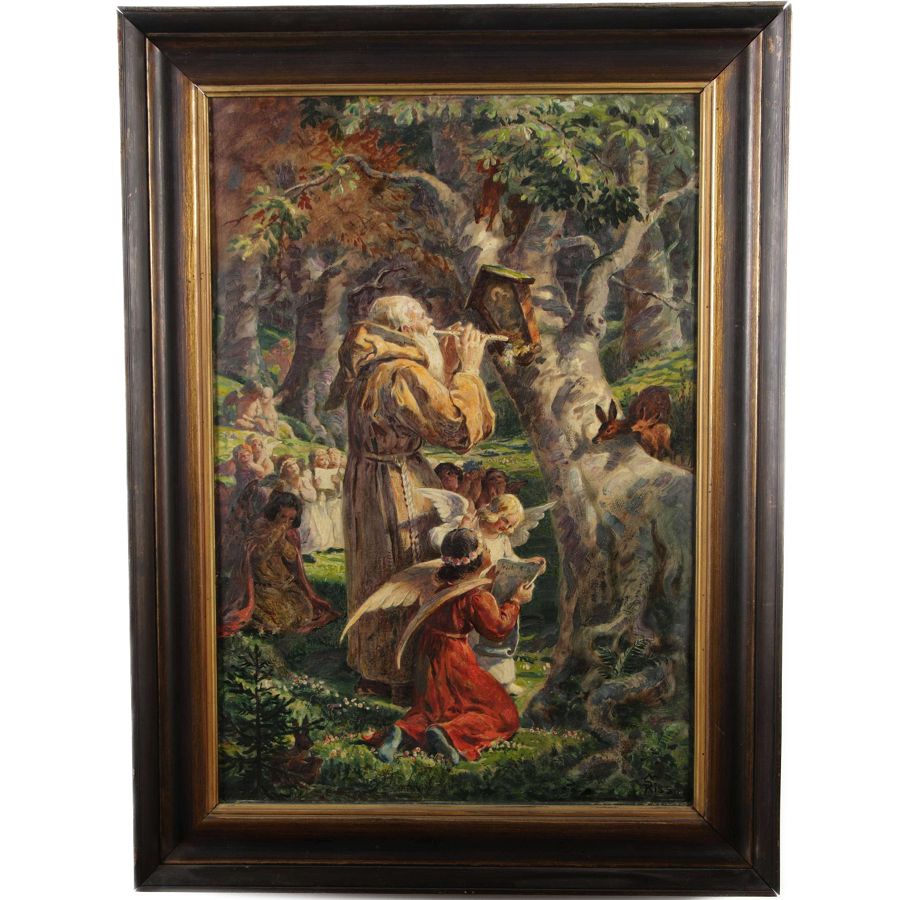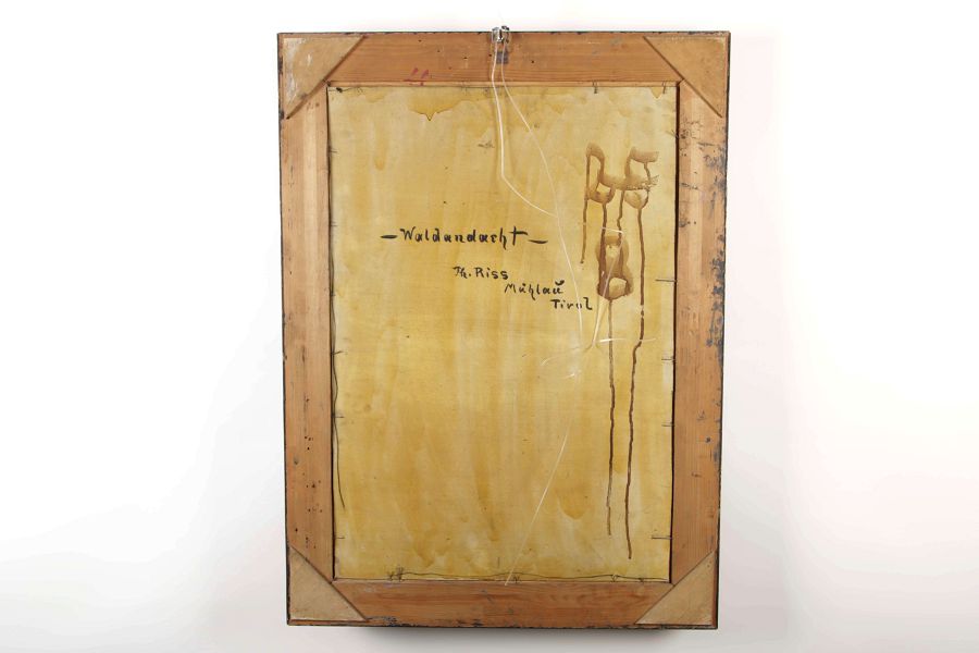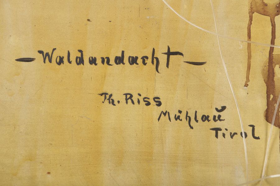 Mahler / Painter: THOMAS RISS Stams 1871 - Innsbruck 1959 Der Lebensweg des Stamser Bauernbubs war geprägt von Erfolg wie auch von Krisen wirtschaftlicher wie persönlich-menschlicher Art. Unter größten materiellen Entbehrungen absolvierte der wenig bemittelte Oberinntaler zunächst in Innsbruck an der Staatsgewerbeschule eine Ausbildung zum kunsthandwerklichen Maler , um sich im Anschluss daran für den Besuch der Kunstakademie in München zu entscheiden, wo er u.a. auch bei Franz von Defregger studierte. 1898 kam der junge Künster zur Kurierung einer Lungenerkrankung nach Meran/Burggrafenamt, wo er dann für 29 Jahre blieb. 1904 Reise in die USA zur Weltausstellung in St. Louis, wo er die Goldmedaille gewinnt. 1907 Heirat mit Friederike Kuhn in der Karlskirche in Wien, 1908 Tochter Walfrieda (Friedele) wird geboren. 1914 Einberufung im 1. Weltkrieg- rückt als Standschütze mit den Meranern ein, wird ein geschätzter Kriegsmaler. 1927 dann, angesichts der durch den Ersten Weltkrieg veränderten Territorialen Veränderung, zog es ihn zurück nach Nordtirol wo er in Innsbruck-Mühlau ein Haus erwarb. 1959 starb Riss im Alter von 87 Jharen an einer Lungenentzündung. Für seine künstlerische Arbeit wurden ihm zahlreiche Anerkennungen verliehen: der Titel "Professor", das Ehrenzeichen des Landes Tirol, das österreichische Verdienstkreuz für Kunst und Wissenschaft, die Ehrenbürgerschaft von Stams. Als Bildschöpfer stellte Riss angesichts der revolutionären Entwicklungen in der Kunst des 20. Jahrhunderts eine entschieden unzeitgemäße Erscheinung dar. Stilistisch blieb er trotz vereinzelter Exkurse in den Impressionismus zeitlebens einer naturalistischen Darstellungsweise treu. Thematisch ist das Werk des Künstlers breit gefächert, besonders hervorzuheben sind allerdings die souveränen Porträts die der Meister schuf. Neben diesen finden sich Landschaftsbilder, Themen bäuerlicher Menschen im Alltag, religiöse und mythologische Motive. Waldnacht, Flöte spielender Eremit umringt von tanzenden Putti im Märchenwald, signiert unten rechts: Riss, rückseitig bezeichnet: "Maler Th. Riss Mühlau Tirol", Öl auf Karton Zeit / Time : vor 1959 Masse