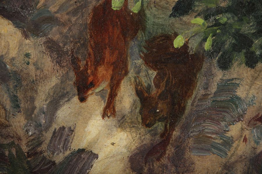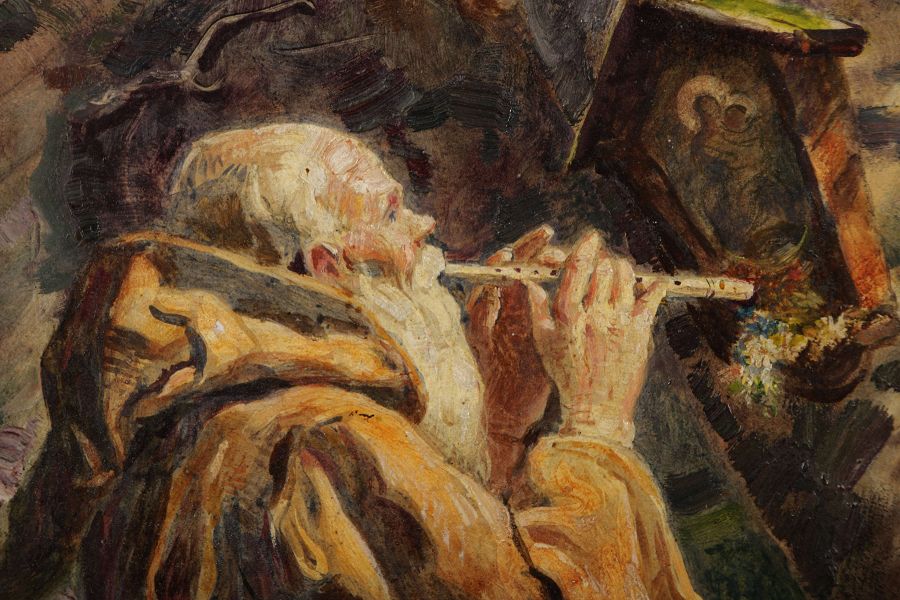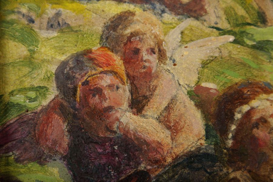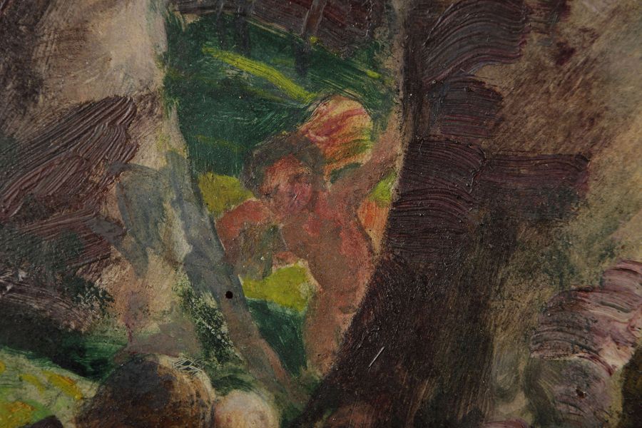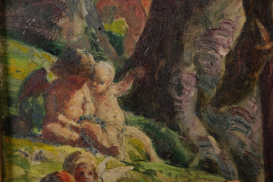 | Waldnacht, Flöte spielender Eremit umringt von tanzenden Putti im Märchenwald, signiert unten rechts: Riss, rückseitig bezeichnet: "Maler Th. Riss Mühlau Tirol", Öl auf Karton |