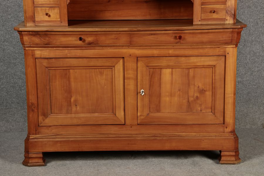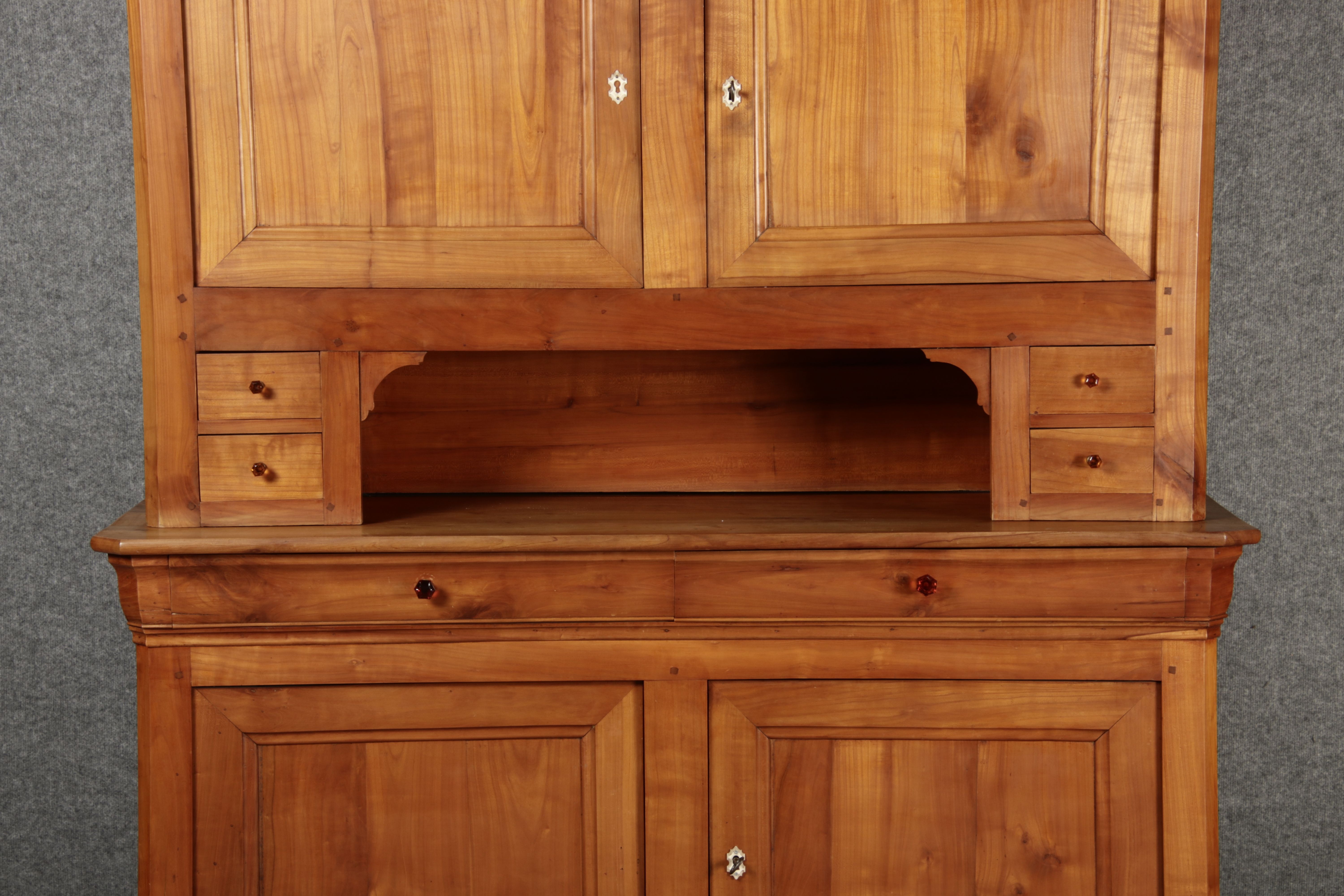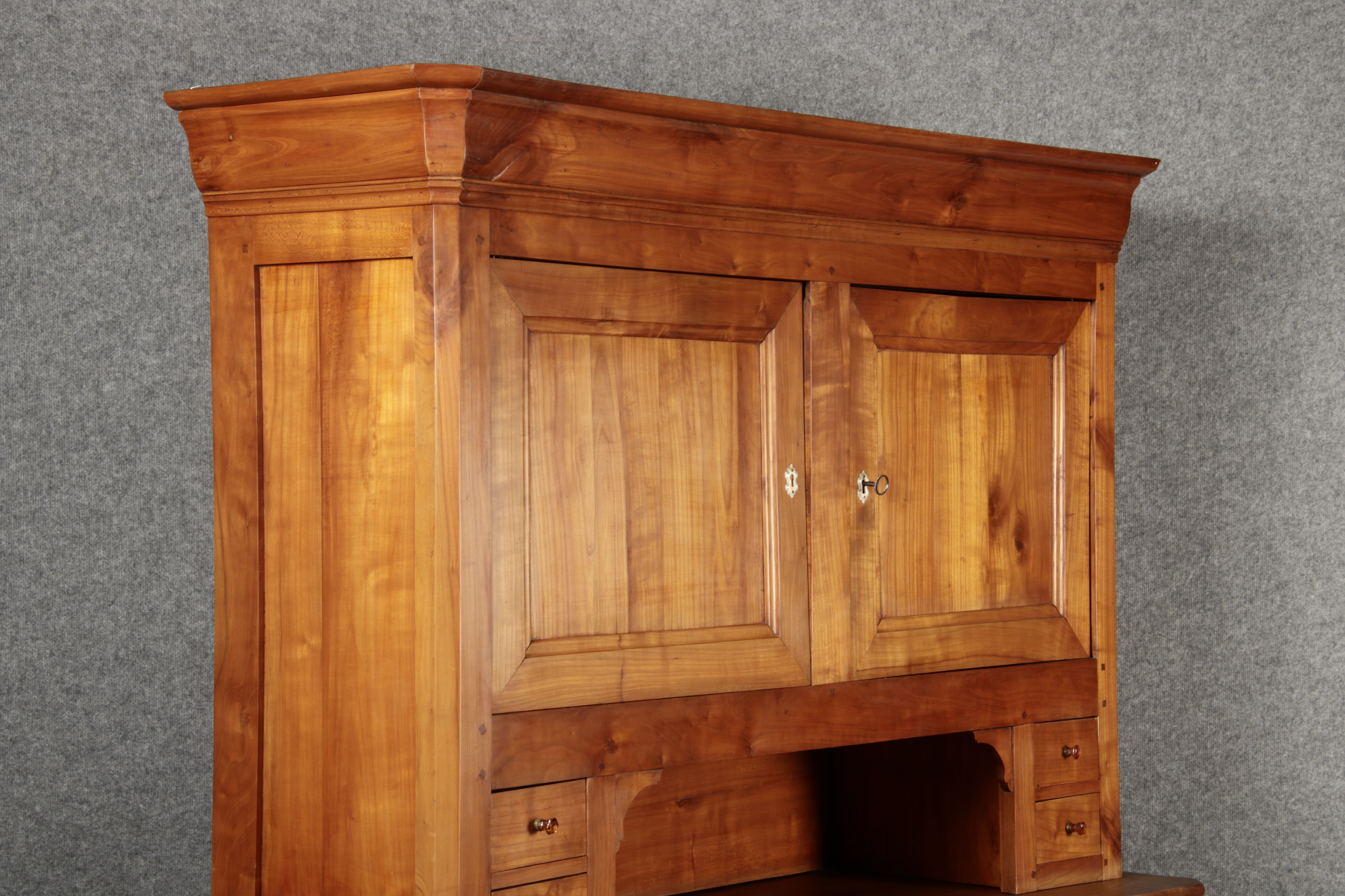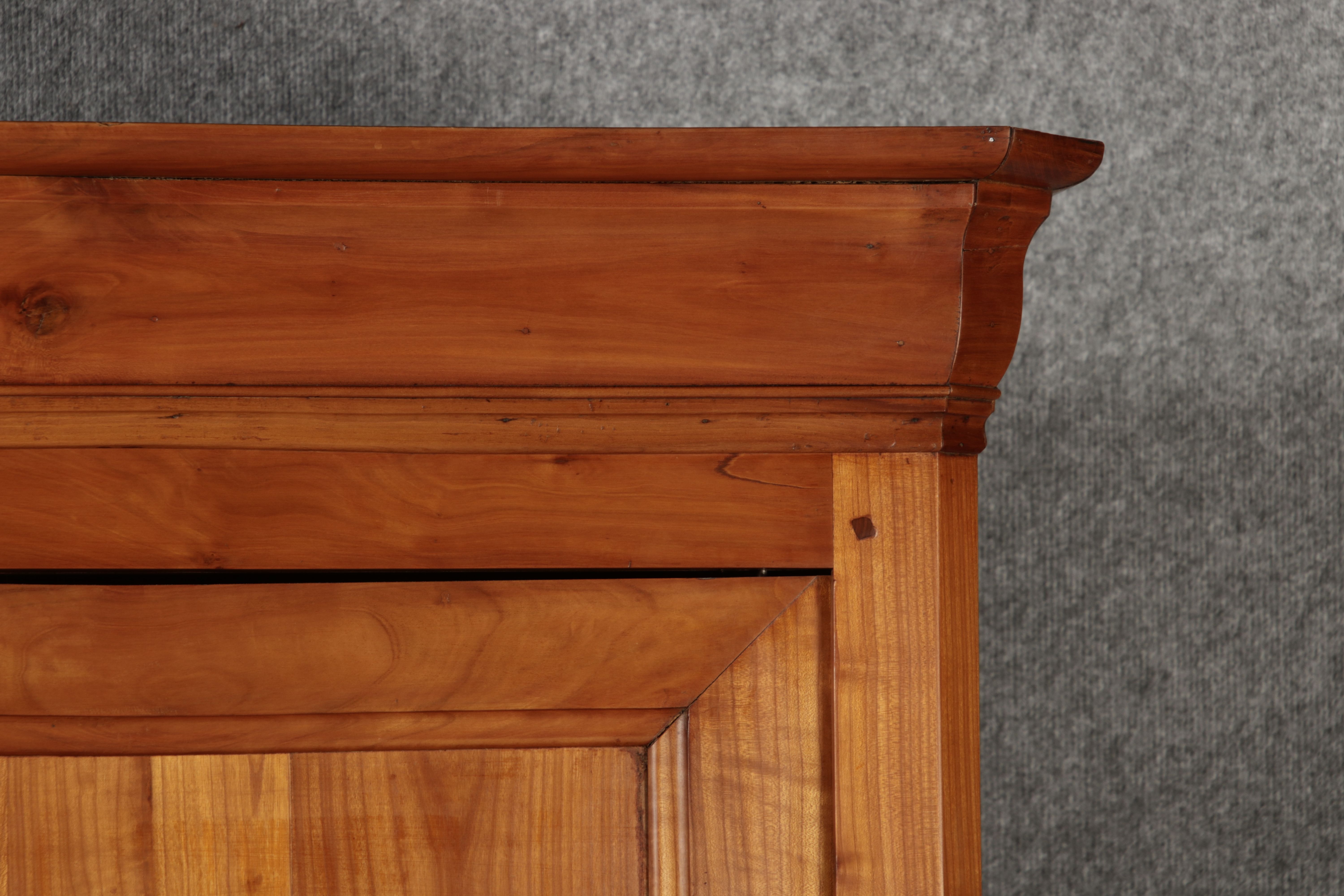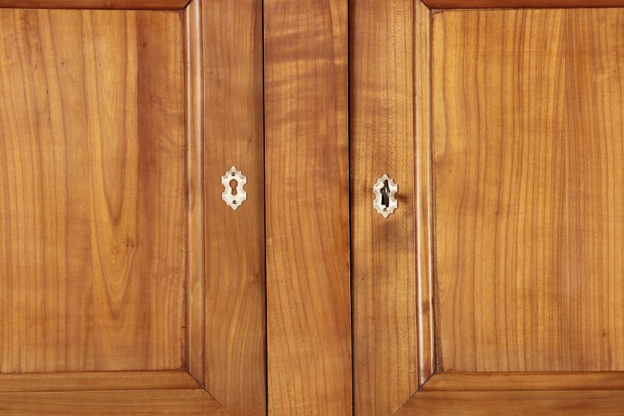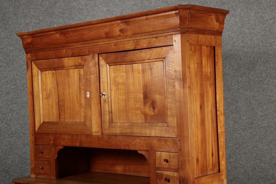 Beschreibung/description: Antiker Biedermeier-Schrank / Büffet aus Kirschholz (um 1820-1840) Dieses klassische Biedermeier-Büffet aus massivem Kirschholz zeichnet sich durch seine schlichte Eleganz und hervorragende Handwerkskunst aus. Das Möbelstück stammt aus der ersten Hälfte des 19. Jahrhunderts und verkörpert die typische Biedermeier-Ästhetik, die auf klare Linien und eine zurückhaltende Gestaltung setzt. Merkmale: