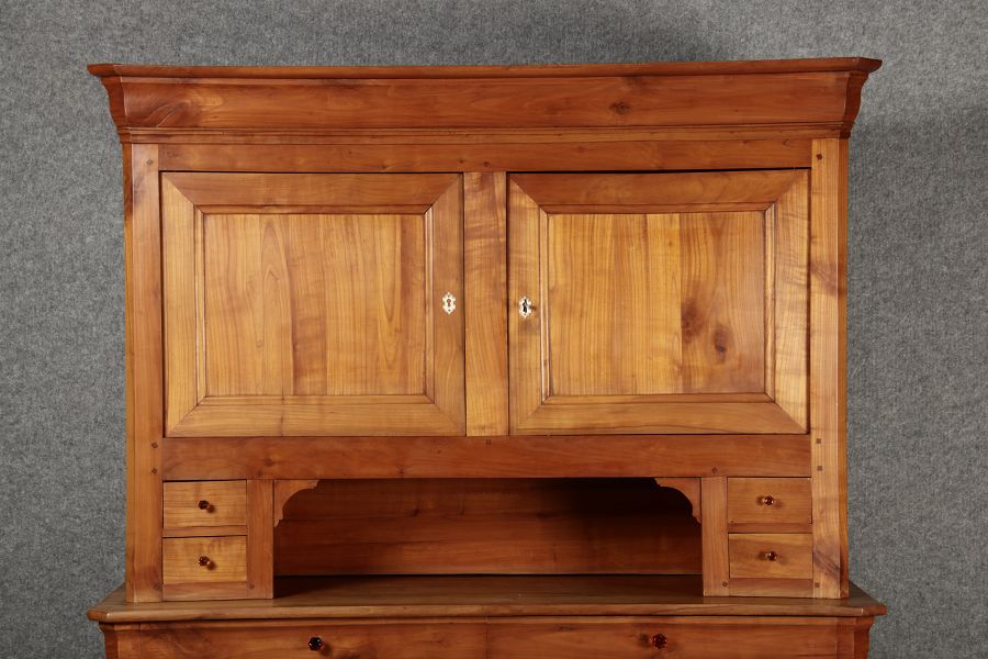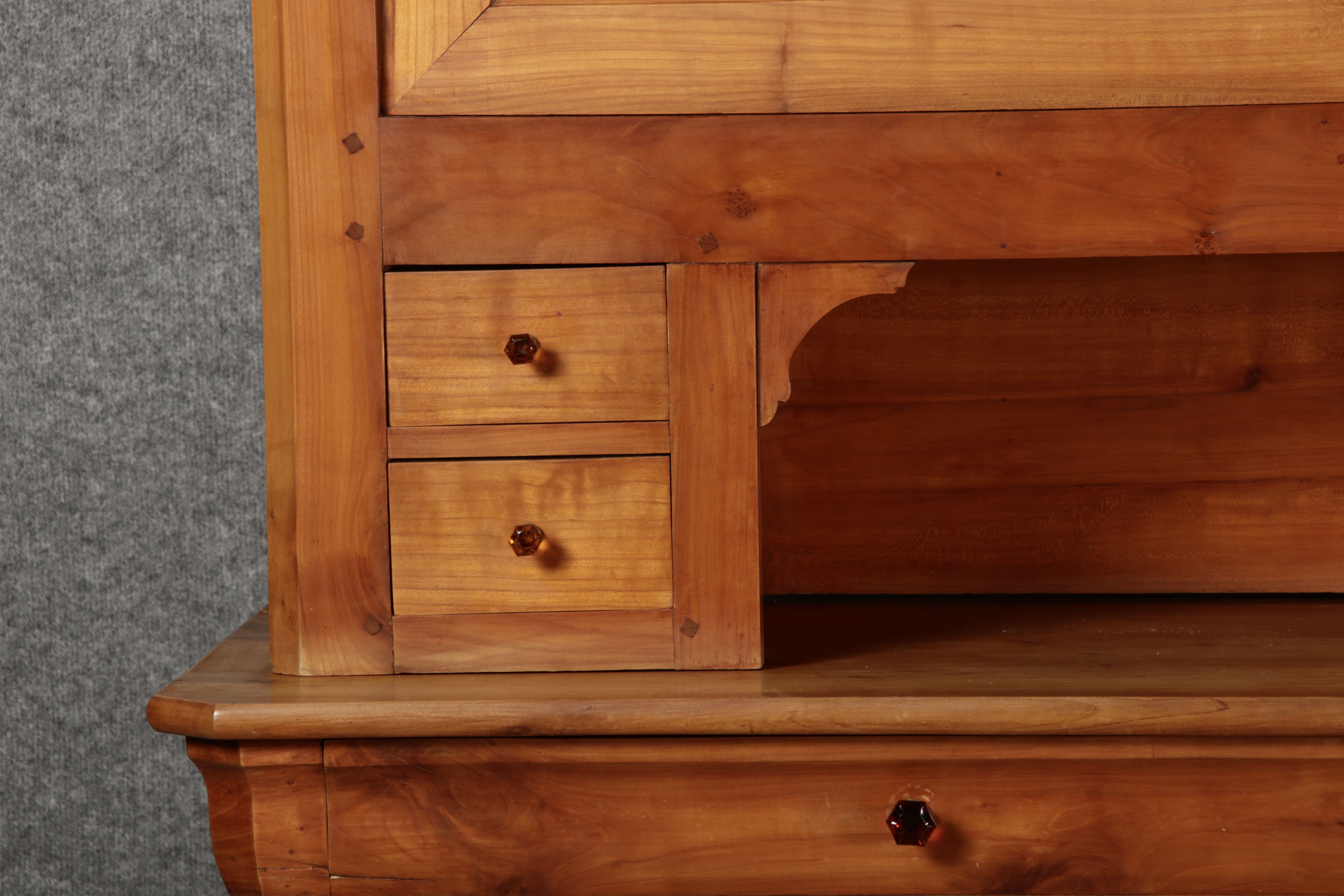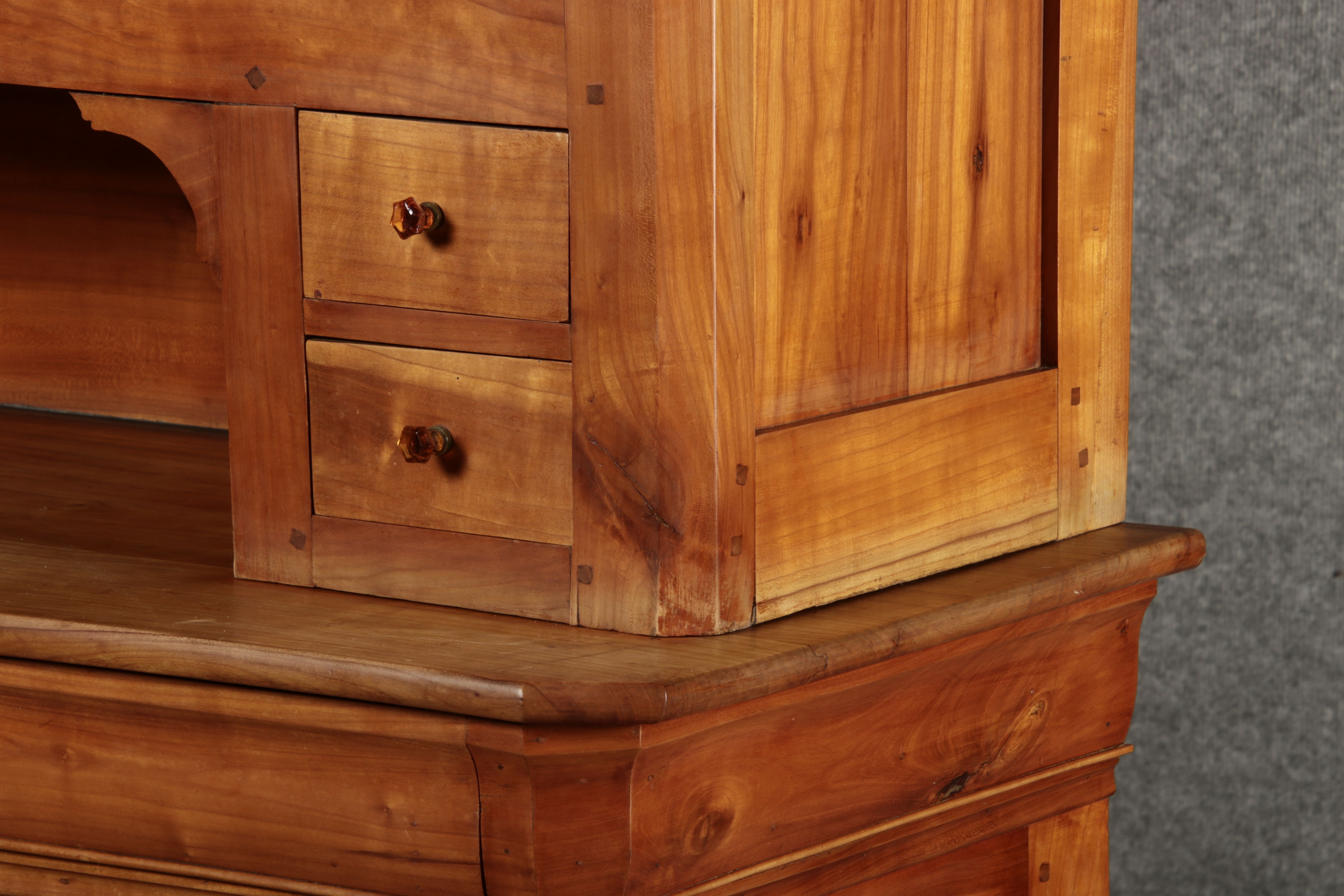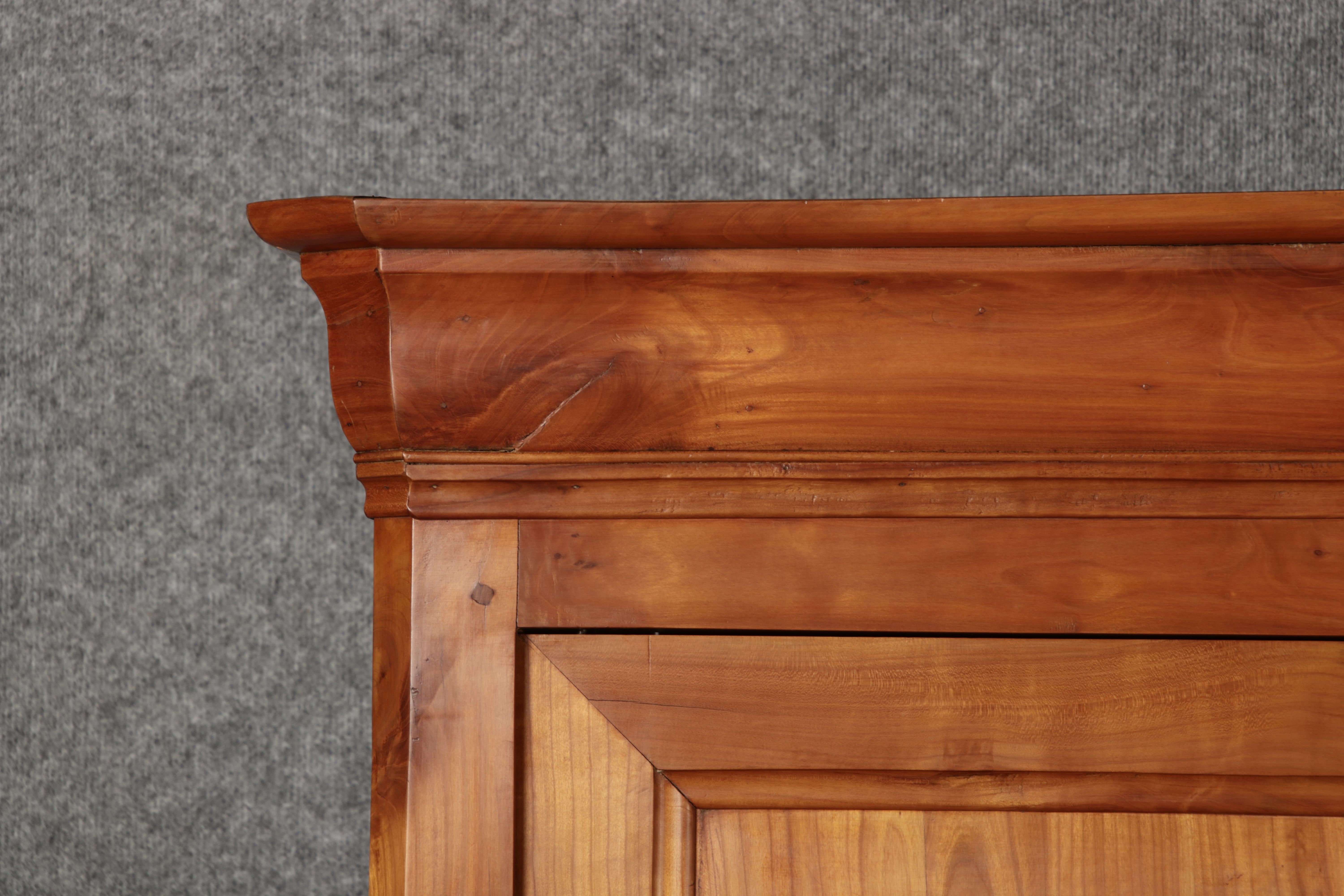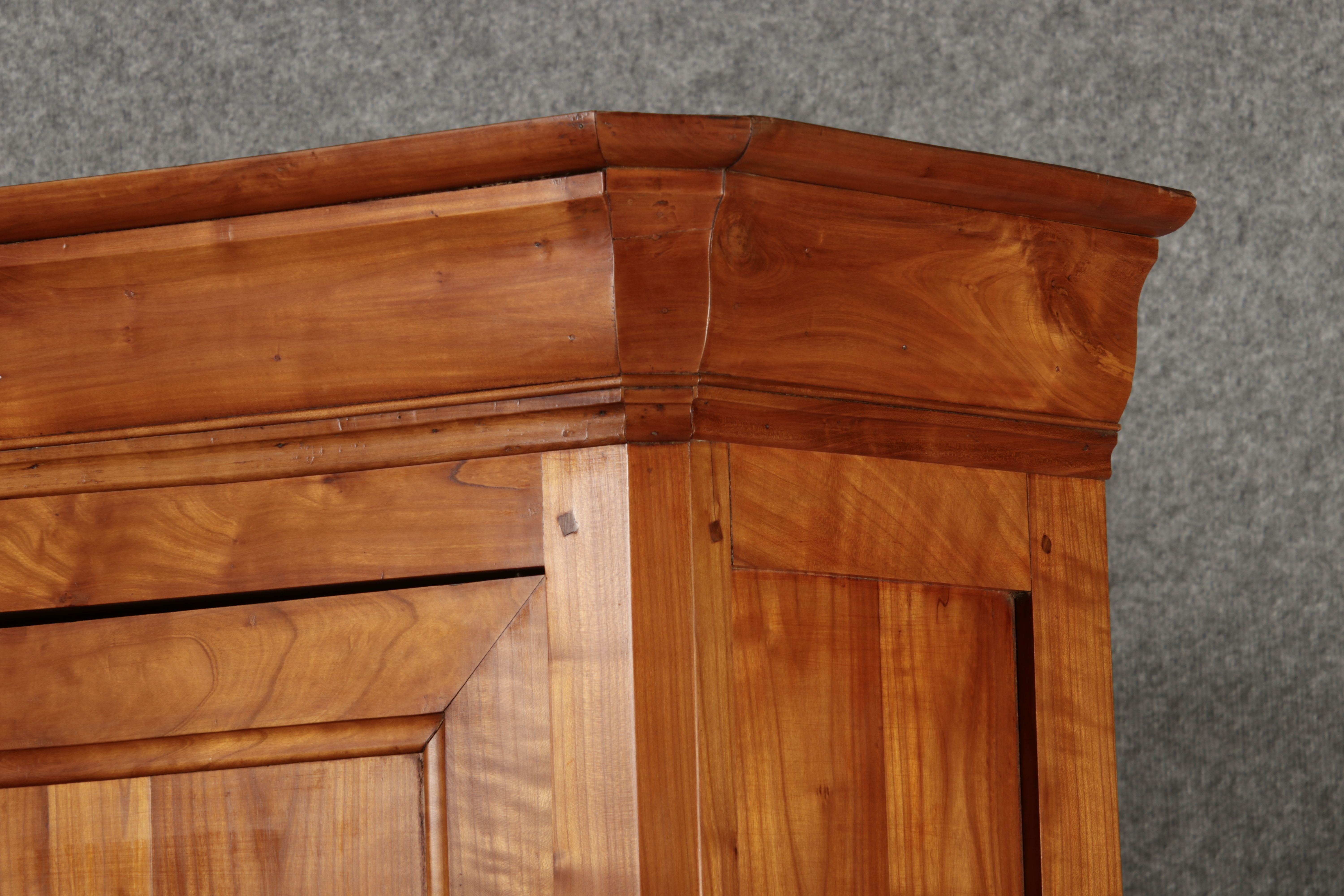 Beschreibung/description: Antiker Biedermeier-Schrank / Büffet aus Kirschholz (um 1820-1840) Dieses klassische Biedermeier-Büffet aus massivem Kirschholz zeichnet sich durch seine schlichte Eleganz und hervorragende Handwerkskunst aus. Das Möbelstück stammt aus der ersten Hälfte des 19. Jahrhunderts und verkörpert die typische Biedermeier-Ästhetik, die auf klare Linien und eine zurückhaltende Gestaltung setzt. Merkmale:
