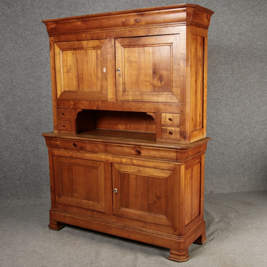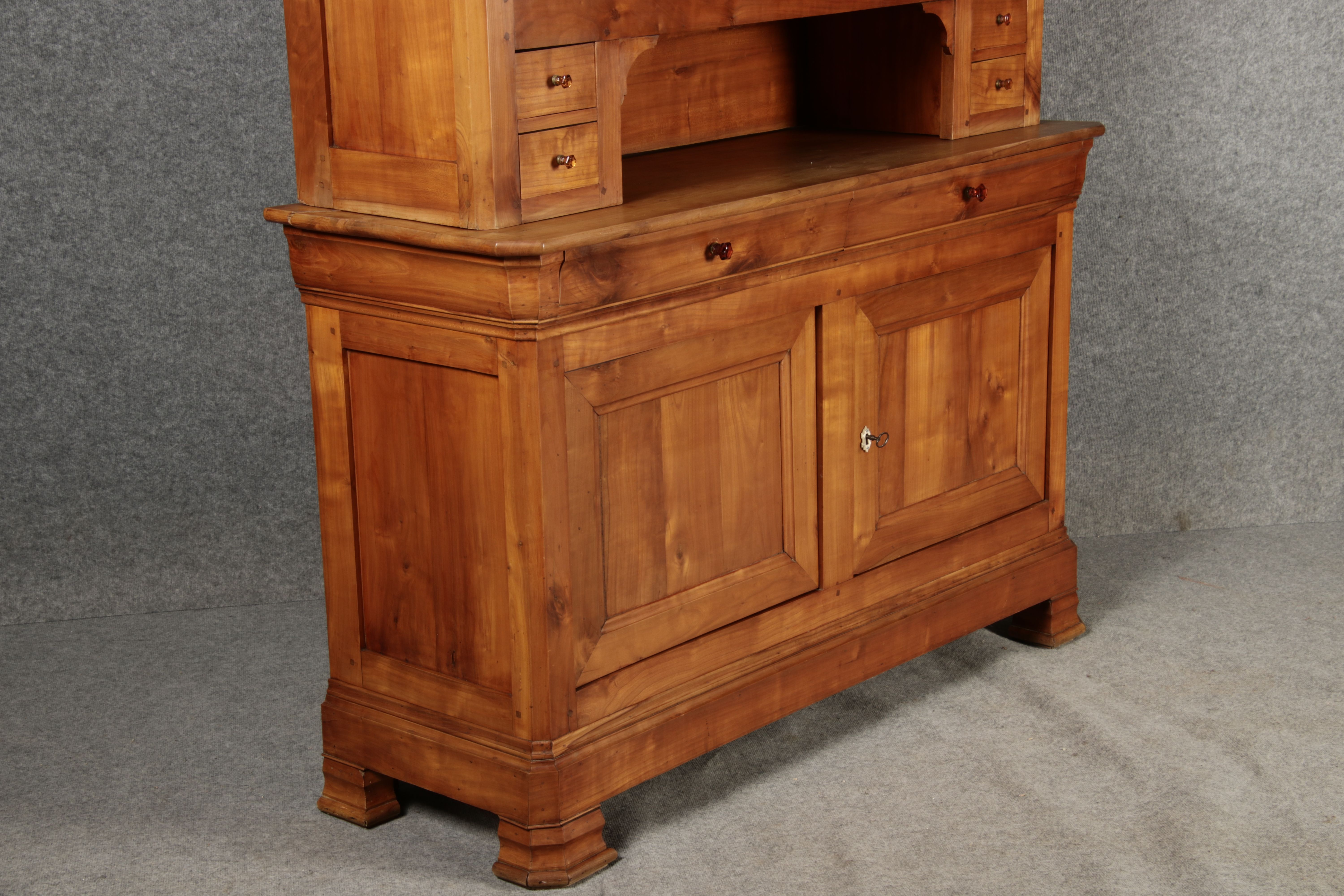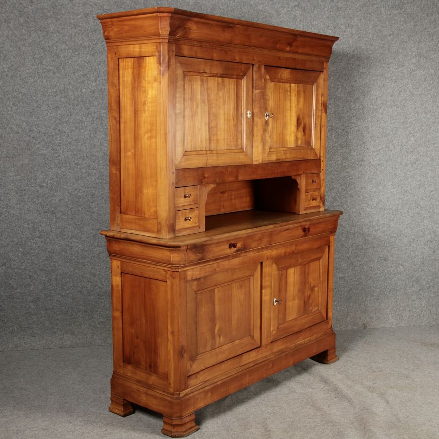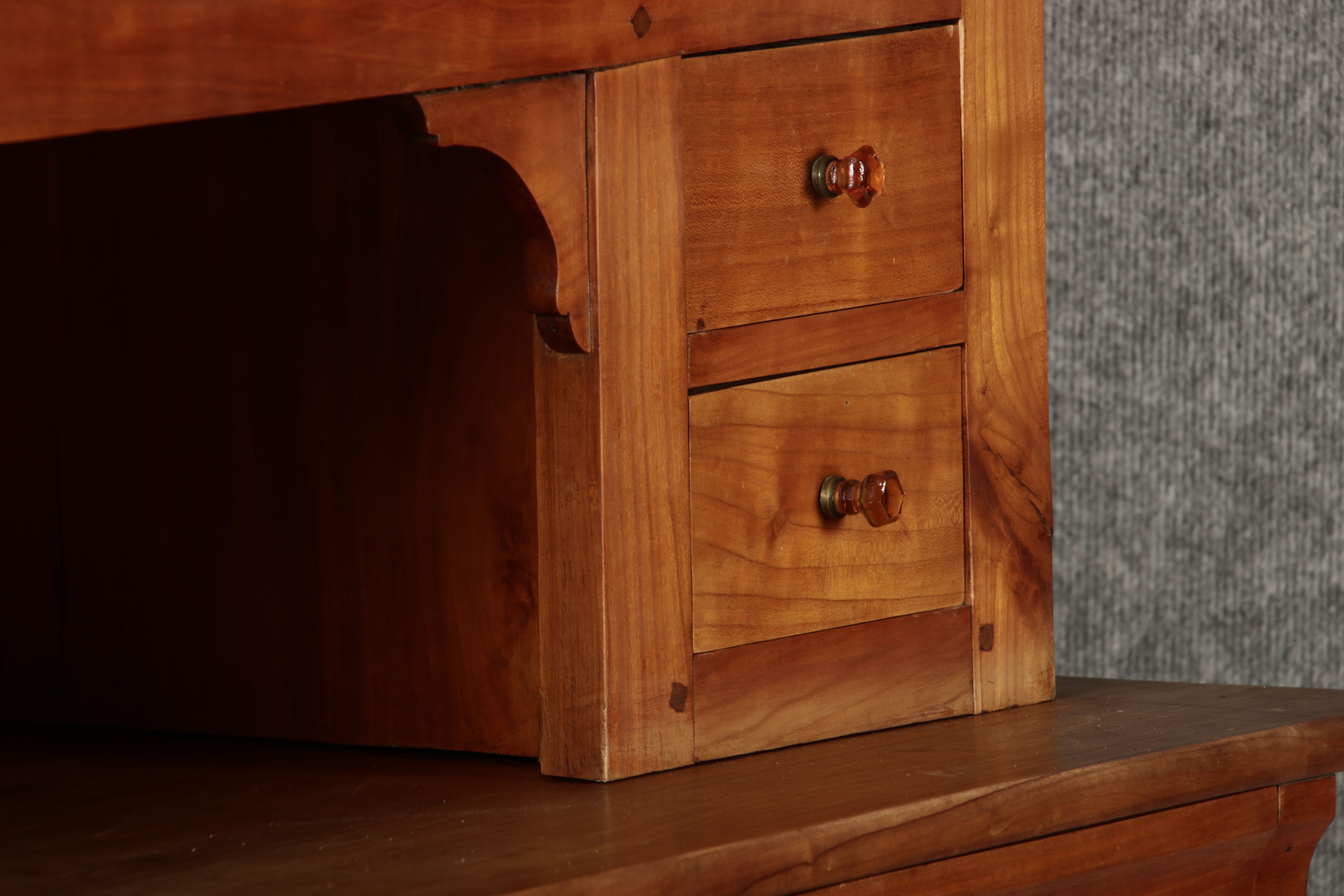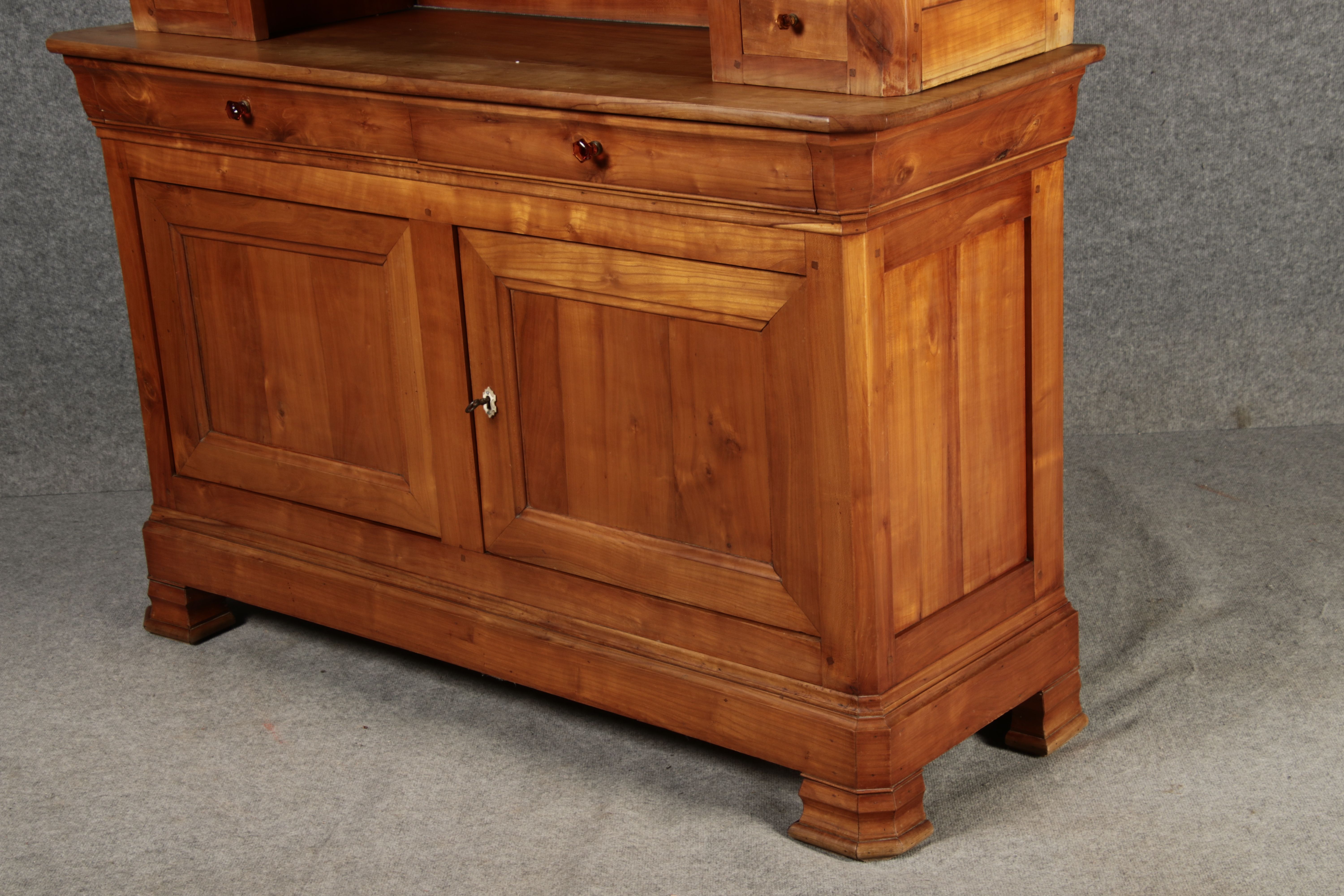 Beschreibung/description: Antiker Biedermeier-Schrank / Büffet aus Kirschholz (um 1820-1840) Dieses klassische Biedermeier-Büffet aus massivem Kirschholz zeichnet sich durch seine schlichte Eleganz und hervorragende Handwerkskunst aus. Das Möbelstück stammt aus der ersten Hälfte des 19. Jahrhunderts und verkörpert die typische Biedermeier-Ästhetik, die auf klare Linien und eine zurückhaltende Gestaltung setzt. Merkmale: