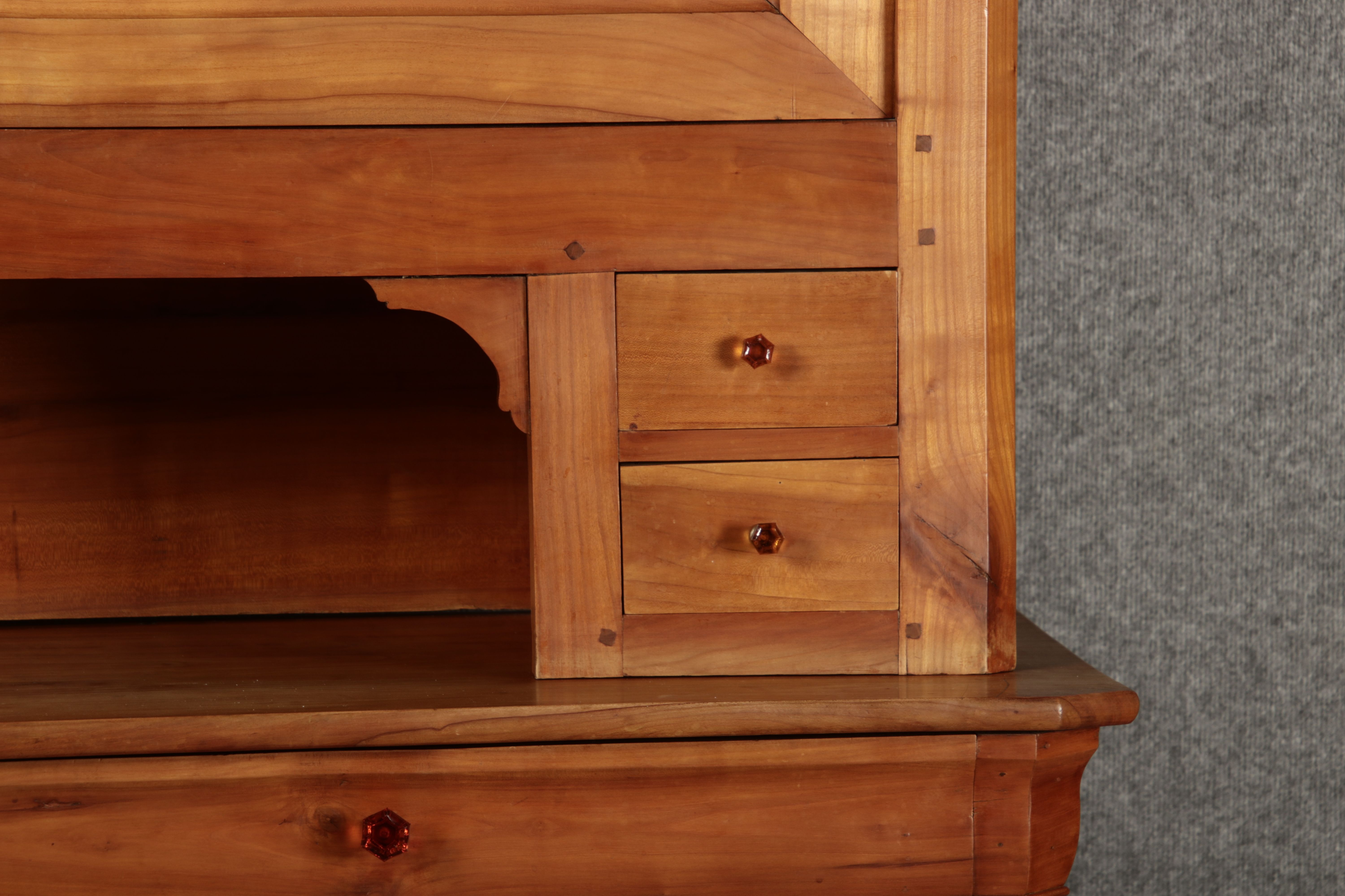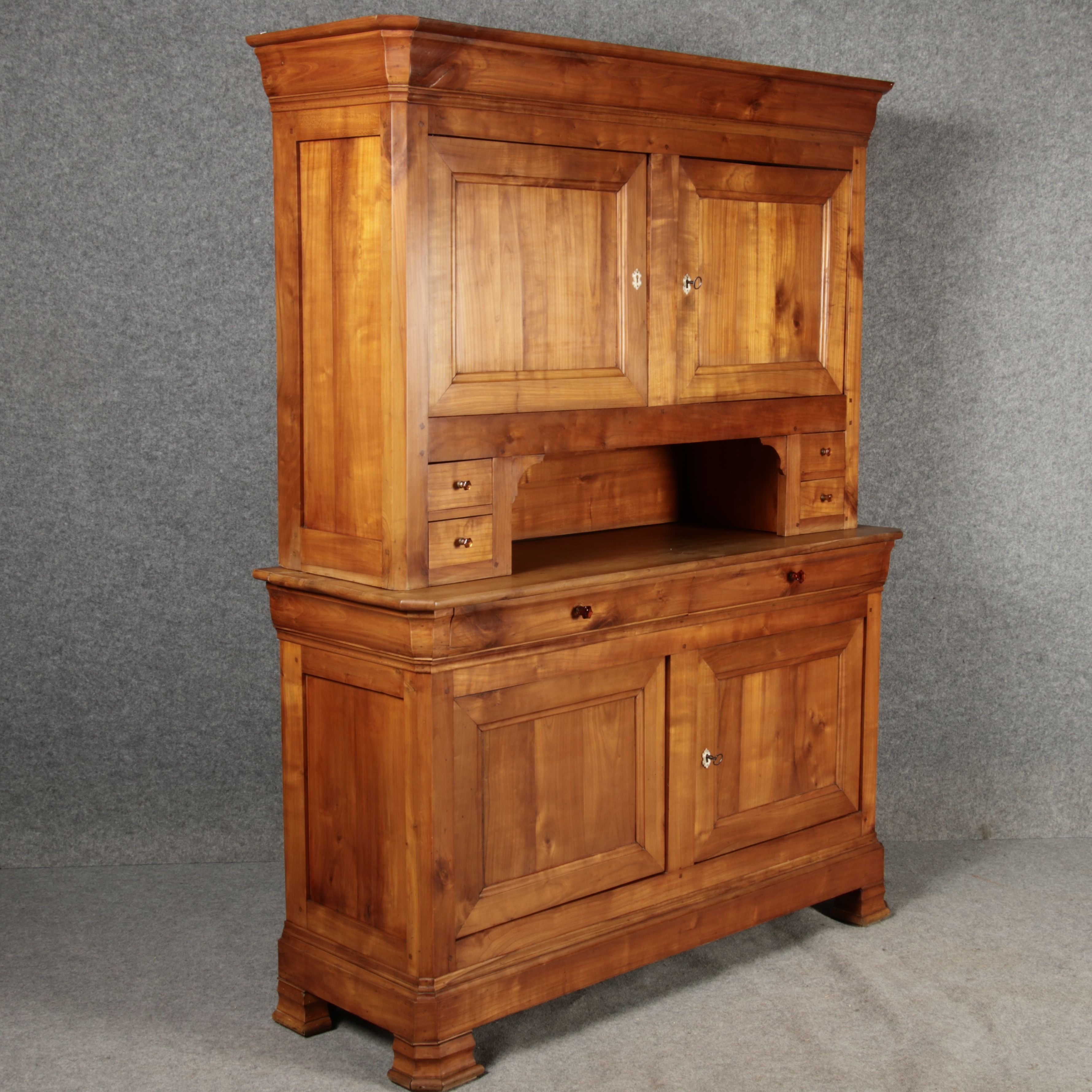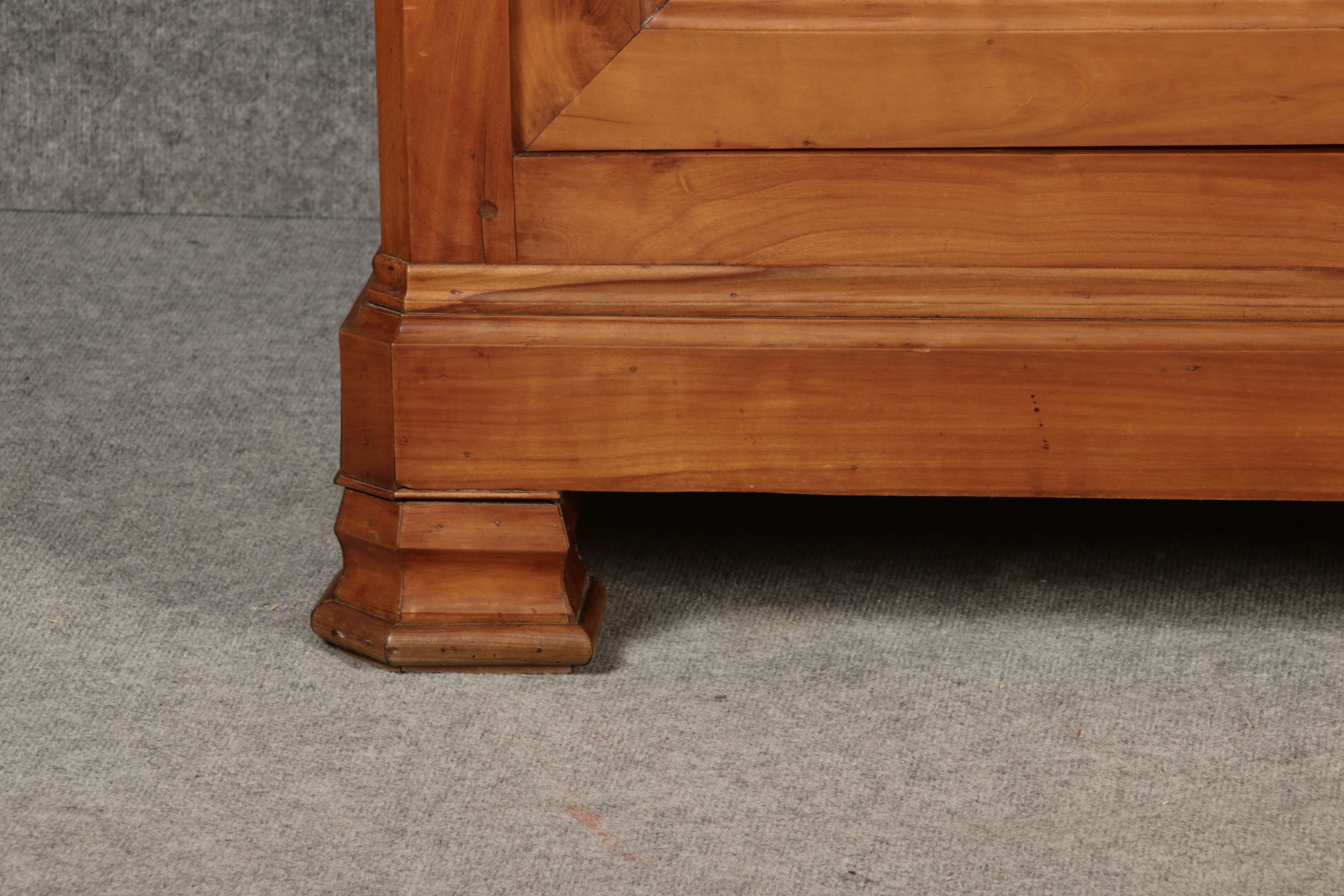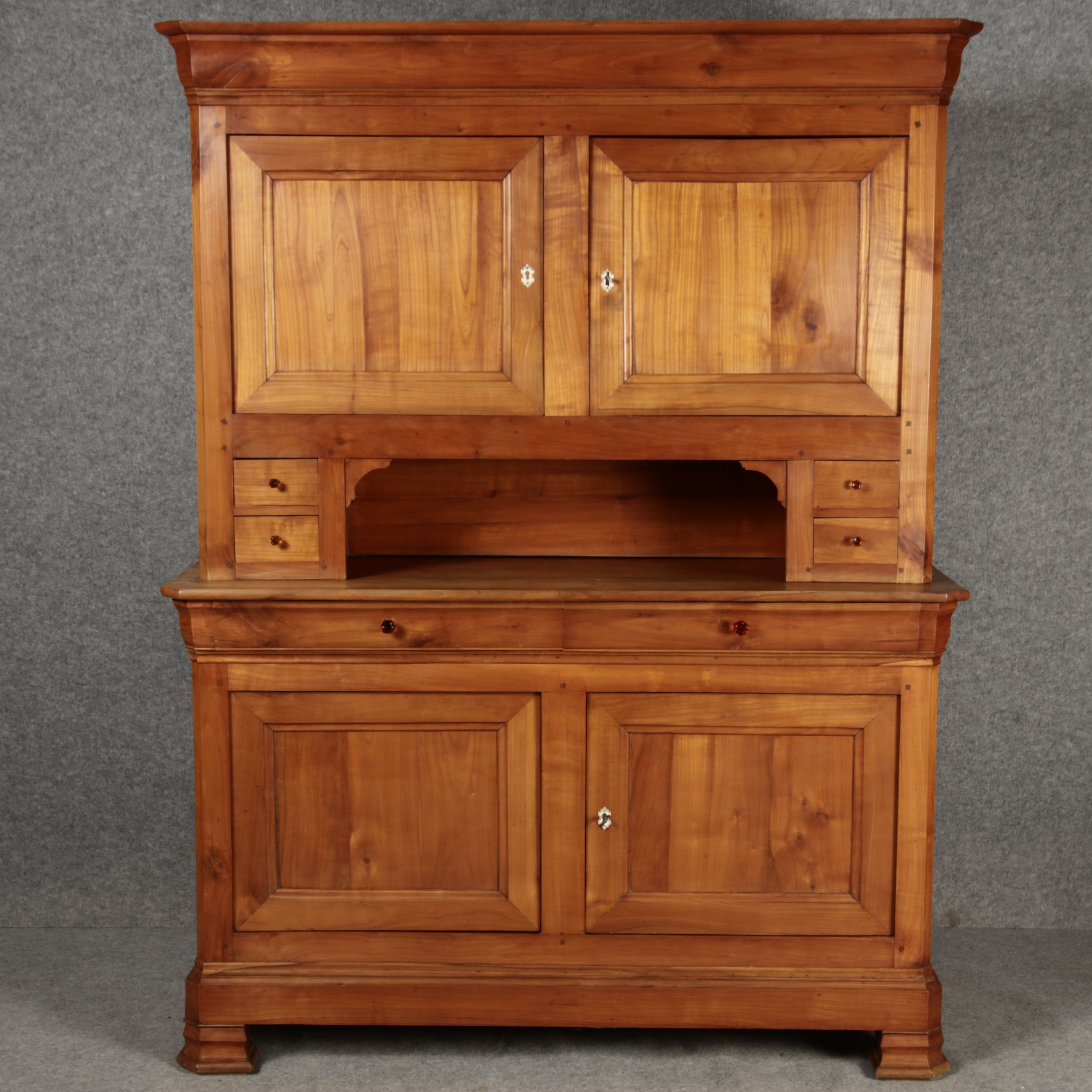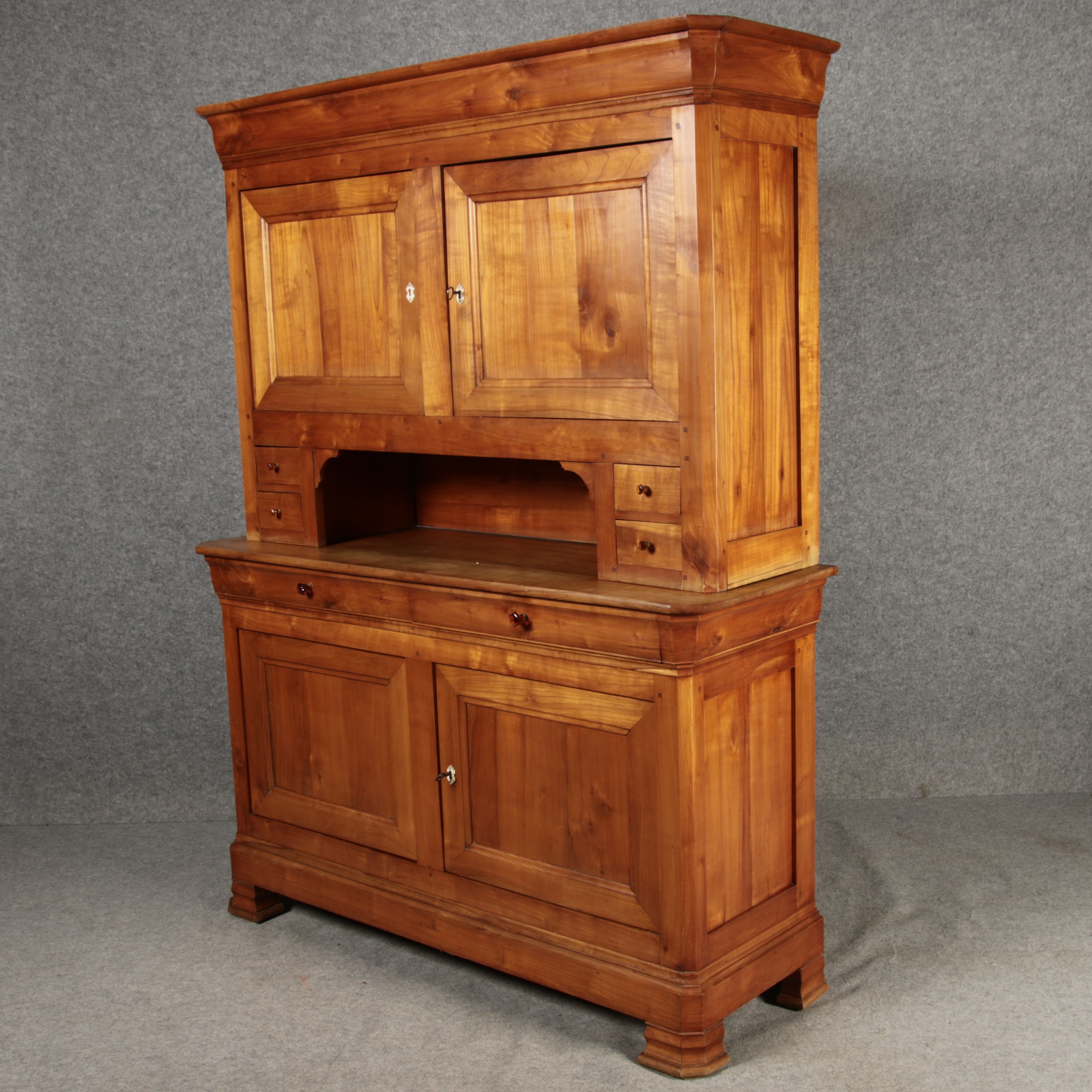 Beschreibung/description: Antiker Biedermeier-Schrank / Büffet aus Kirschholz (um 1820-1840) Dieses klassische Biedermeier-Büffet aus massivem Kirschholz zeichnet sich durch seine schlichte Eleganz und hervorragende Handwerkskunst aus. Das Möbelstück stammt aus der ersten Hälfte des 19. Jahrhunderts und verkörpert die typische Biedermeier-Ästhetik, die auf klare Linien und eine zurückhaltende Gestaltung setzt. Merkmale: