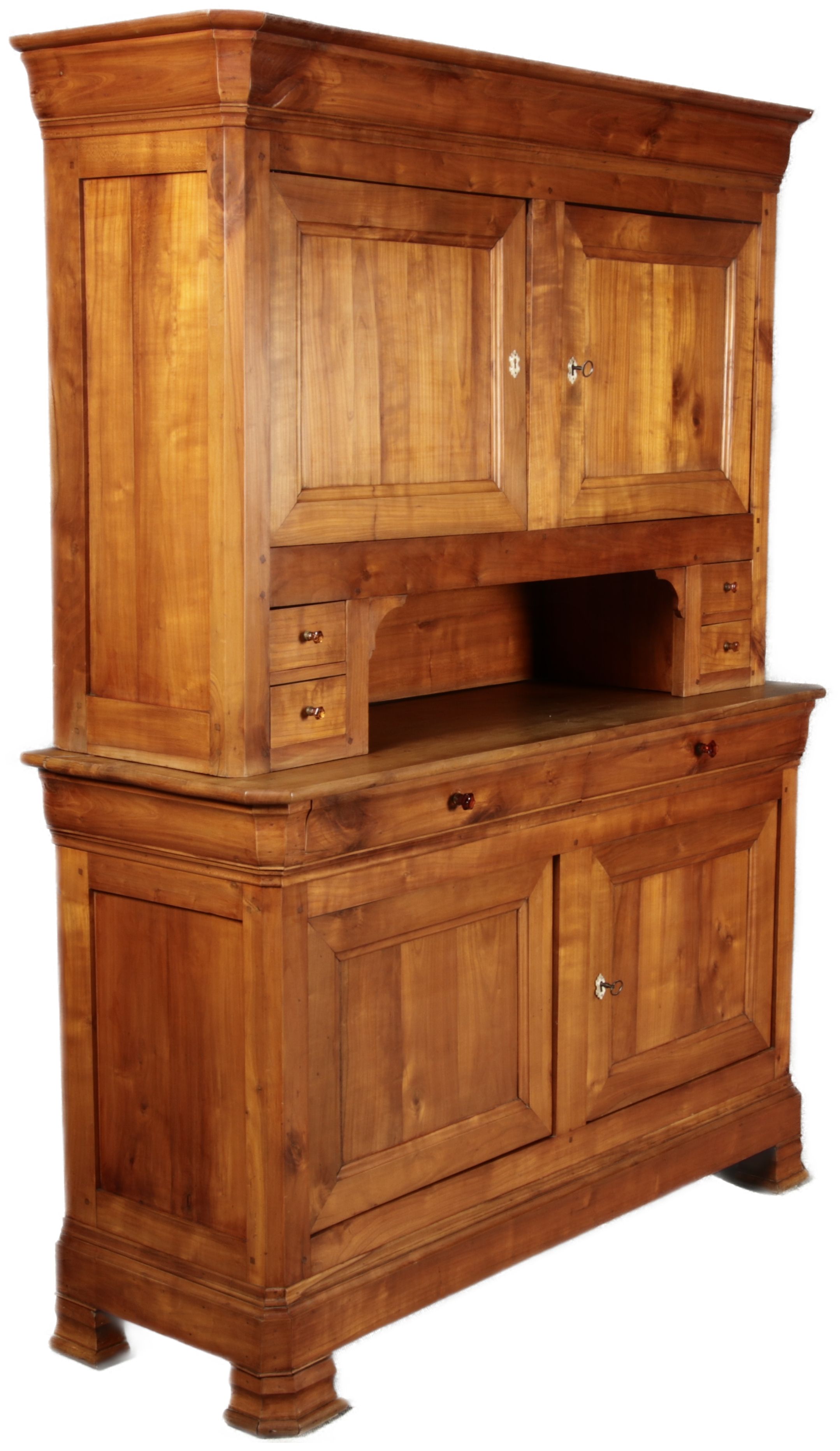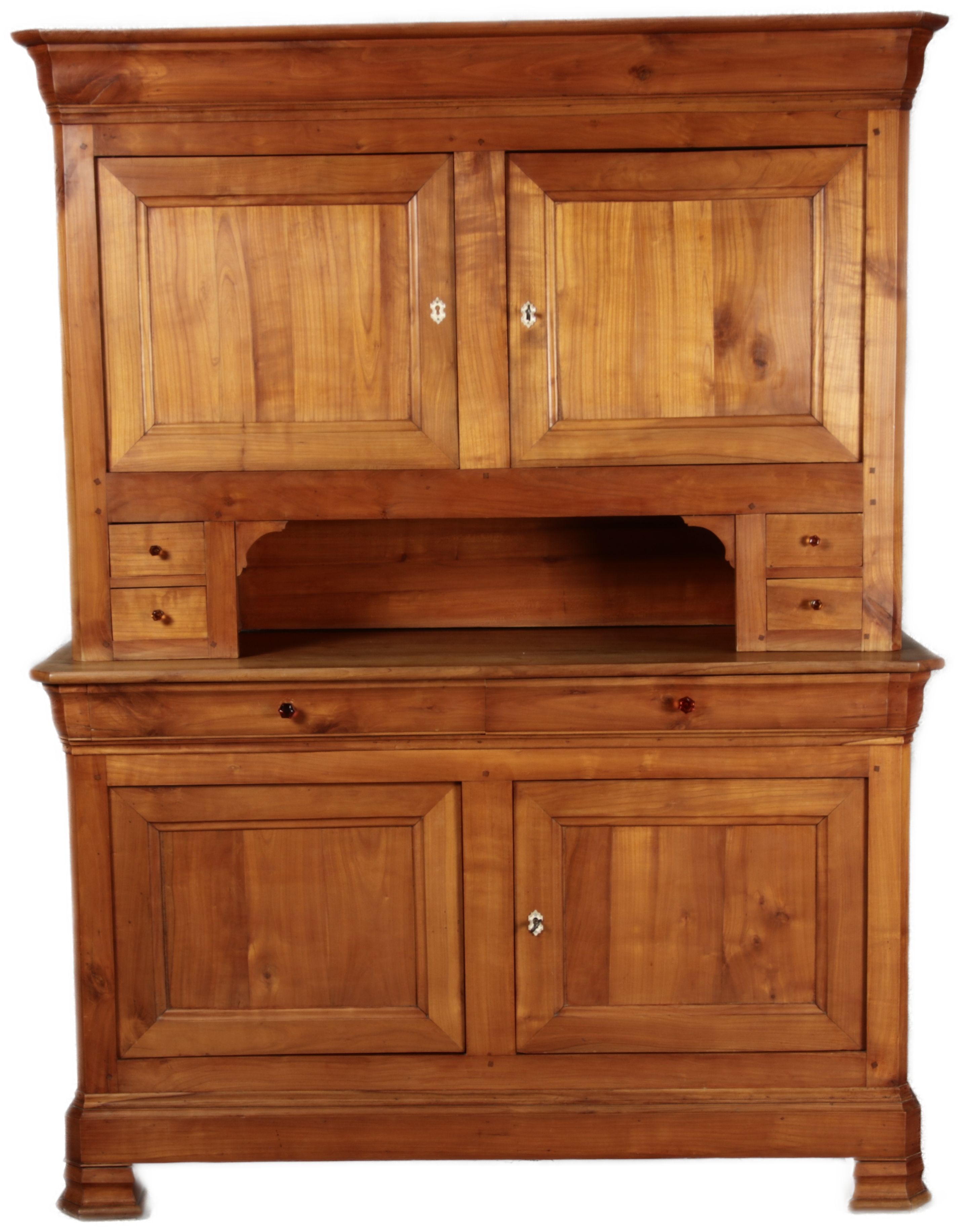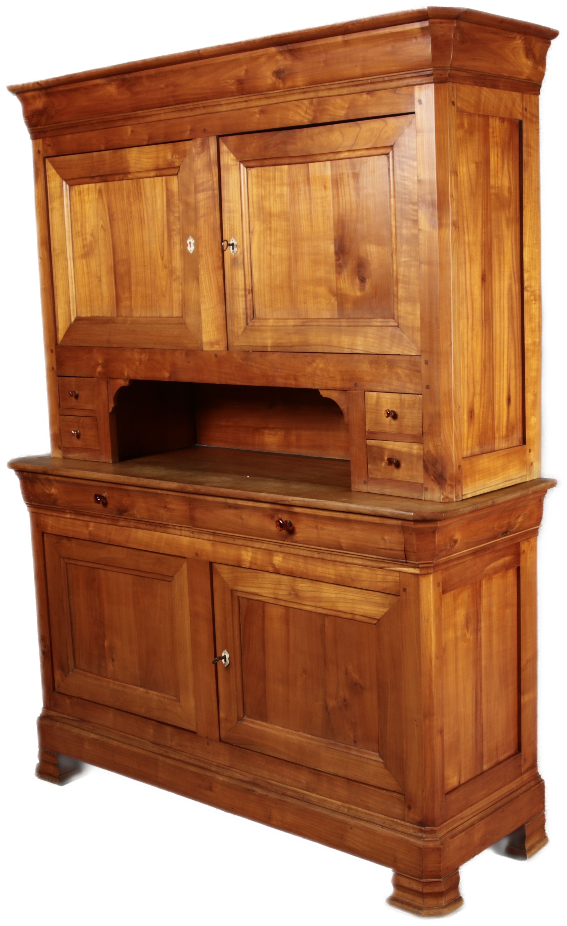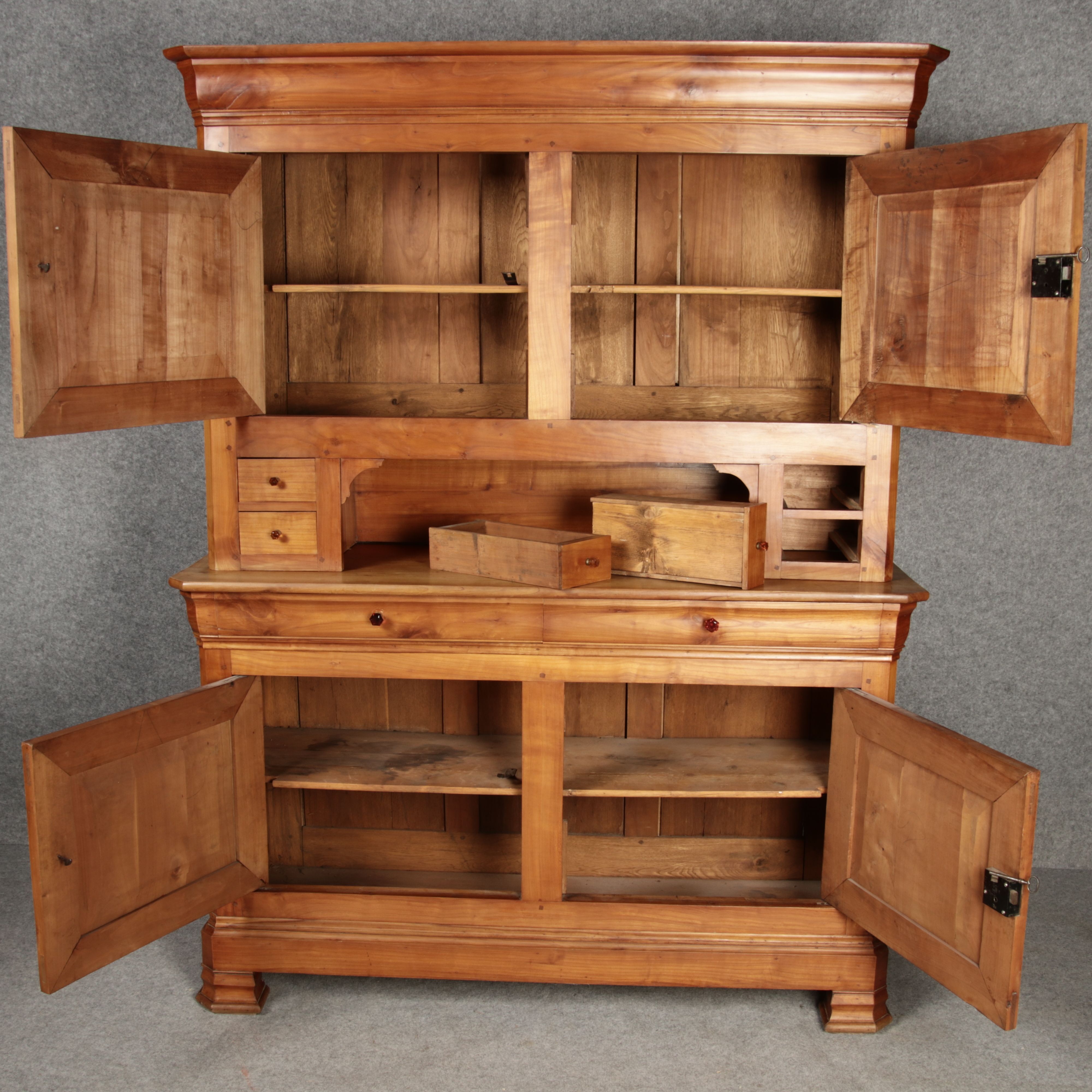 Beschreibung/description: Antiker Biedermeier-Schrank / Büffet aus Kirschholz (um 1820-1840) Dieses klassische Biedermeier-Büffet aus massivem Kirschholz zeichnet sich durch seine schlichte Eleganz und hervorragende Handwerkskunst aus. Das Möbelstück stammt aus der ersten Hälfte des 19. Jahrhunderts und verkörpert die typische Biedermeier-Ästhetik, die auf klare Linien und eine zurückhaltende Gestaltung setzt. Merkmale: