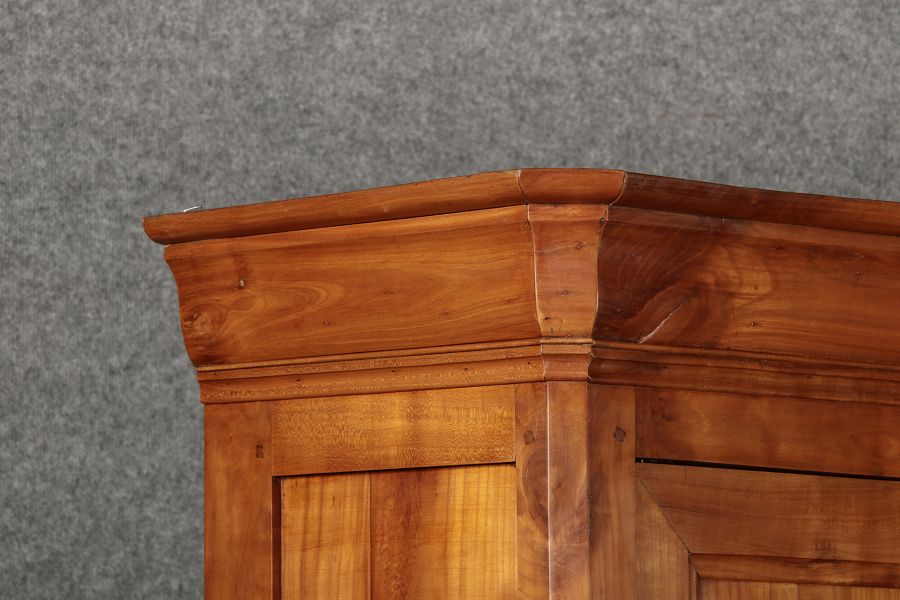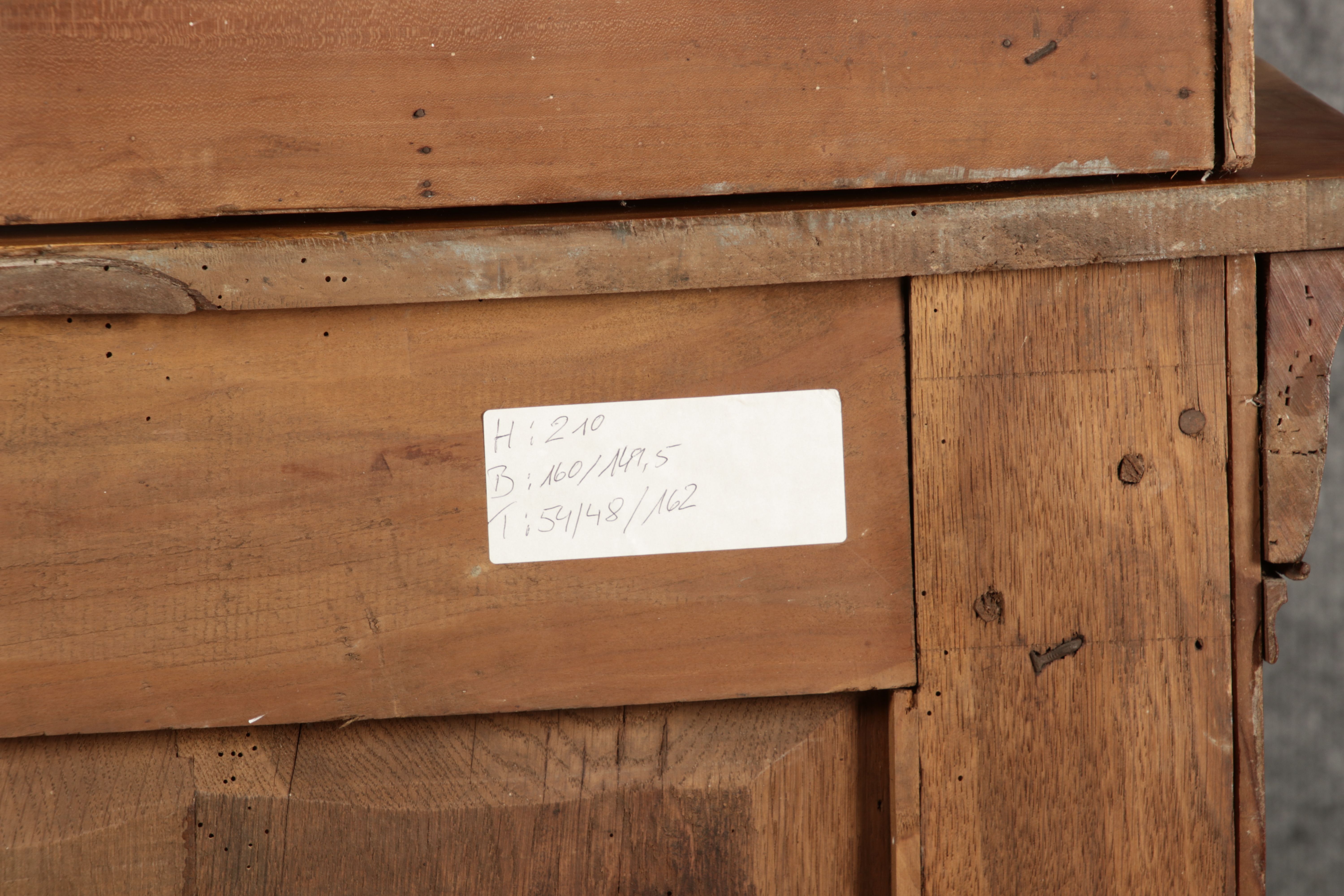 Masse/dimensions: Höhe/Height ca. 210 cm, Breite Korpus/Broad Boda ca. 149,5 cm, Breite Gesims/Broad cornice ca. 160 cm, Tiefe Korpus/Deep body ca. 48 cm, Tiefe Gesims/Deep cornice ca. 54 cm, Holz, Schlüssel/wood,
