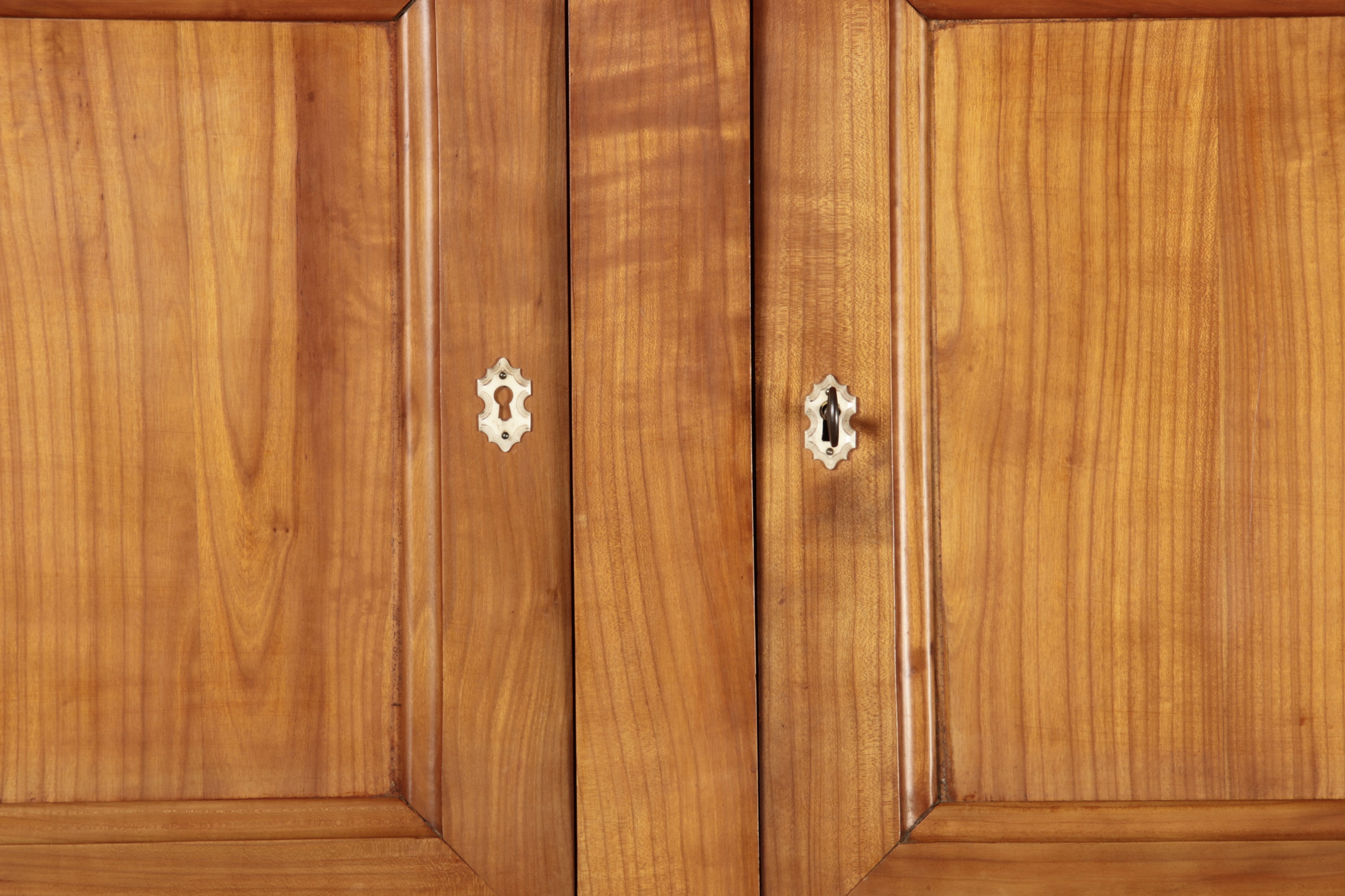 Antiker Biedermeier-Schrank / Büffet aus Kirschholz (um 1820-1840) Dieses klassische Biedermeier-Büffet aus massivem Kirschholz zeichnet sich durch seine schlichte Eleganz und hervorragende Handwerkskunst aus. Das Möbelstück stammt aus der ersten Hälfte des 19. Jahrhunderts und verkörpert die typische Biedermeier-Ästhetik, die auf klare Linien und eine zurückhaltende Gestaltung setzt. Merkmale: