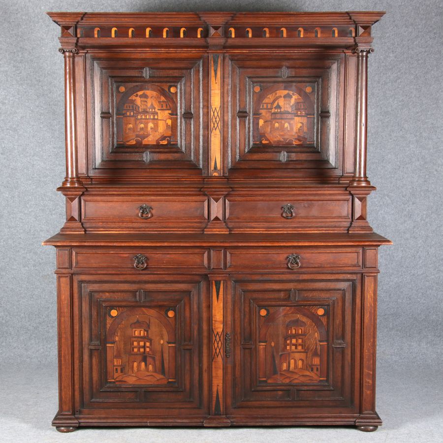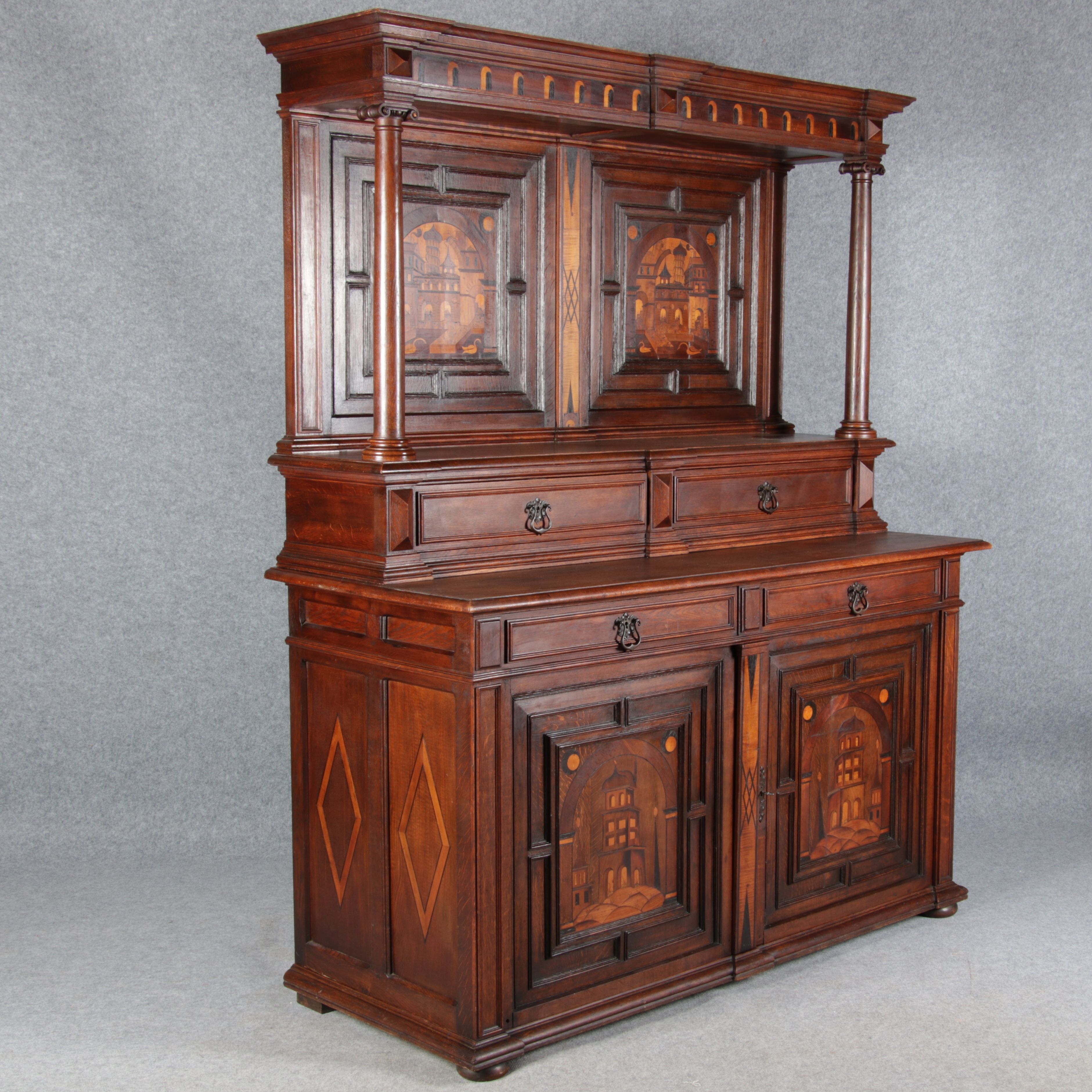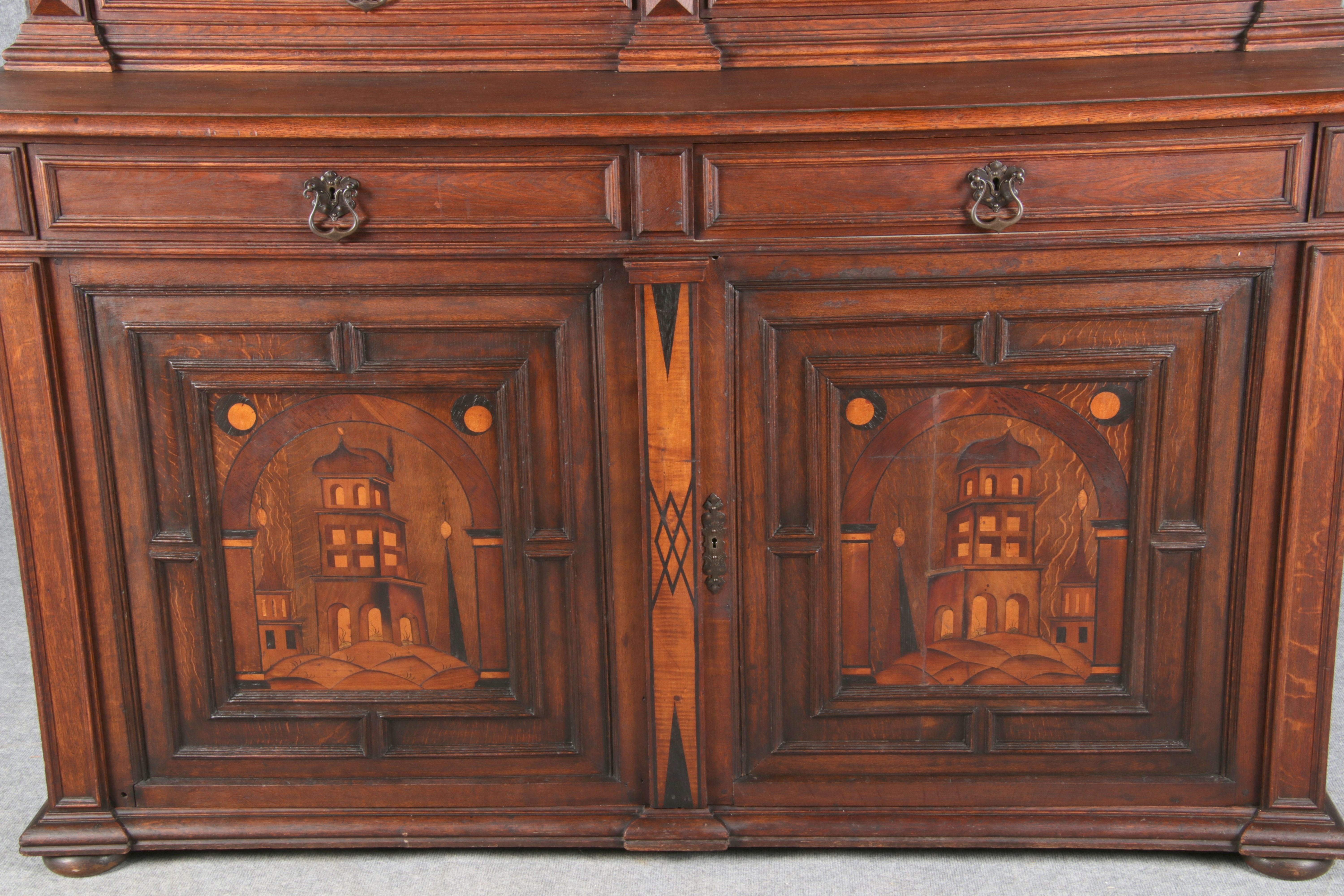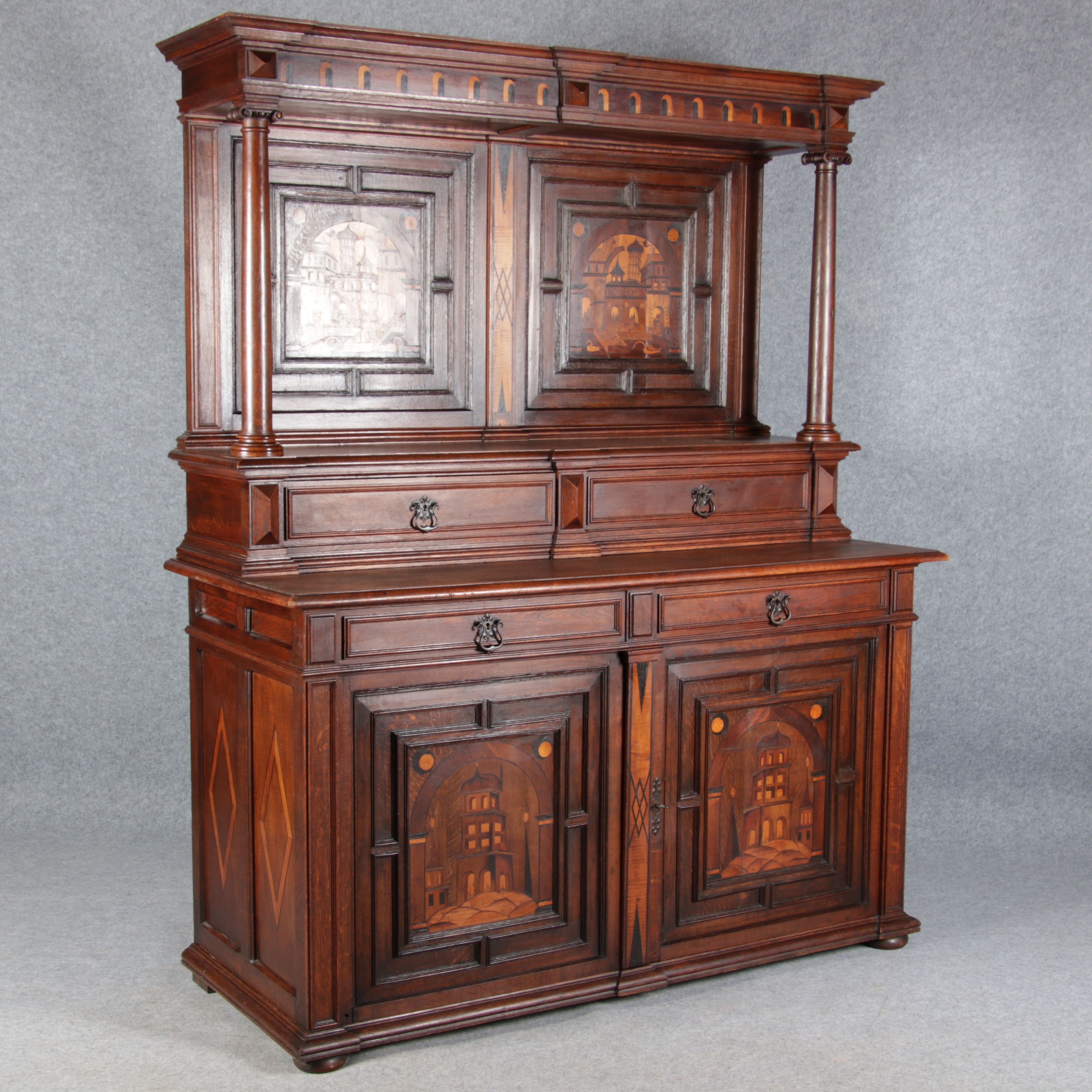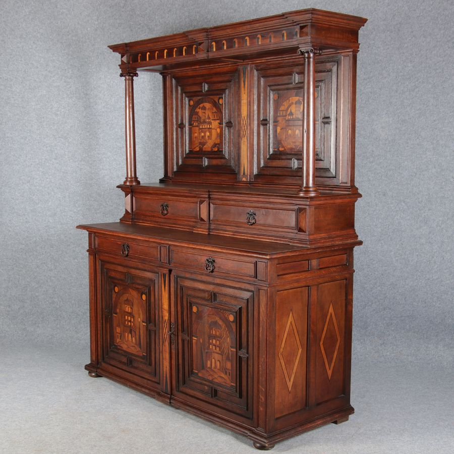 | Antike Historismus Kredenz Büffet mit Schnitzwerk und Architektur Intarsien um 1900 | ||||||||||||||||||||||||||||||||||||||||||||||||||||||||||||||||||