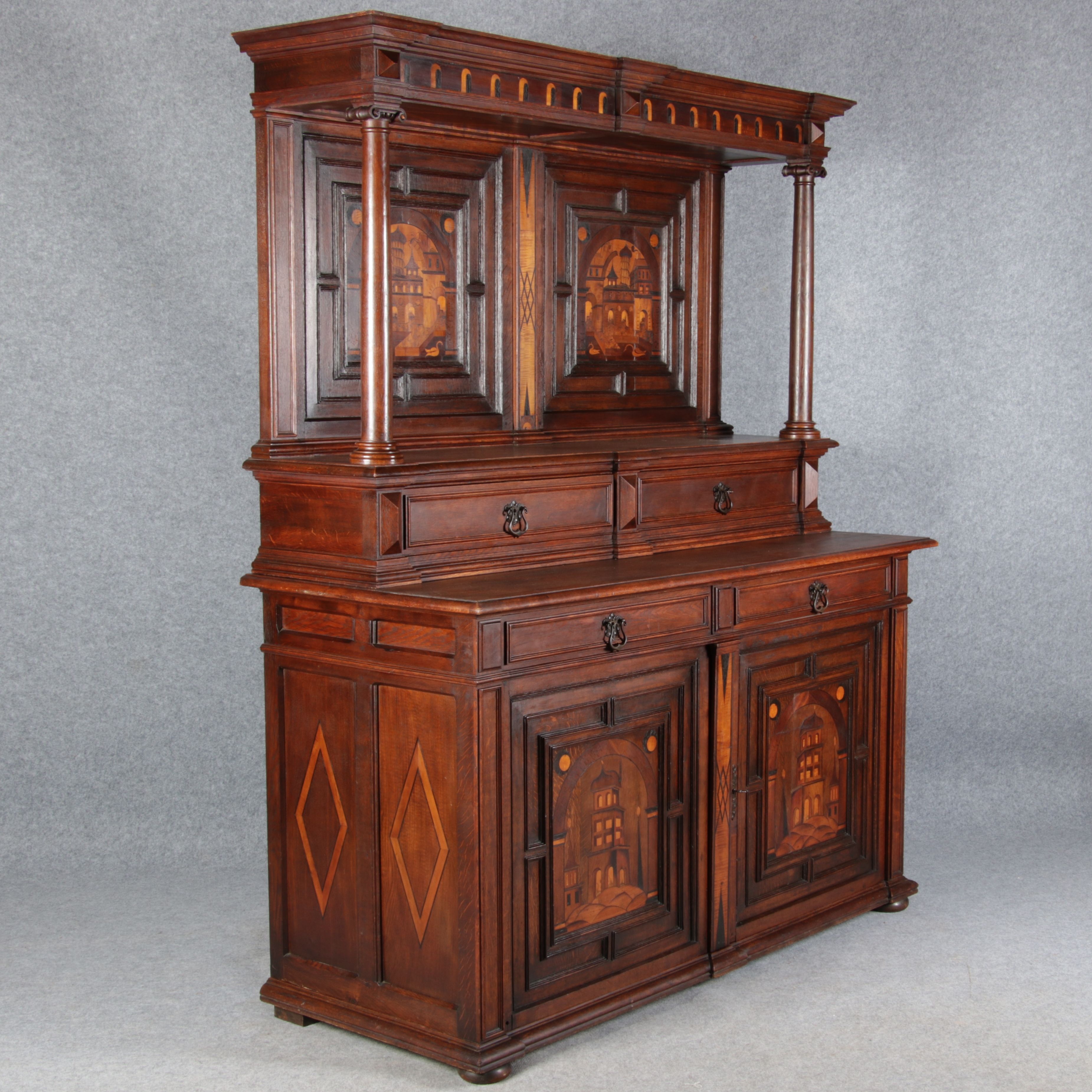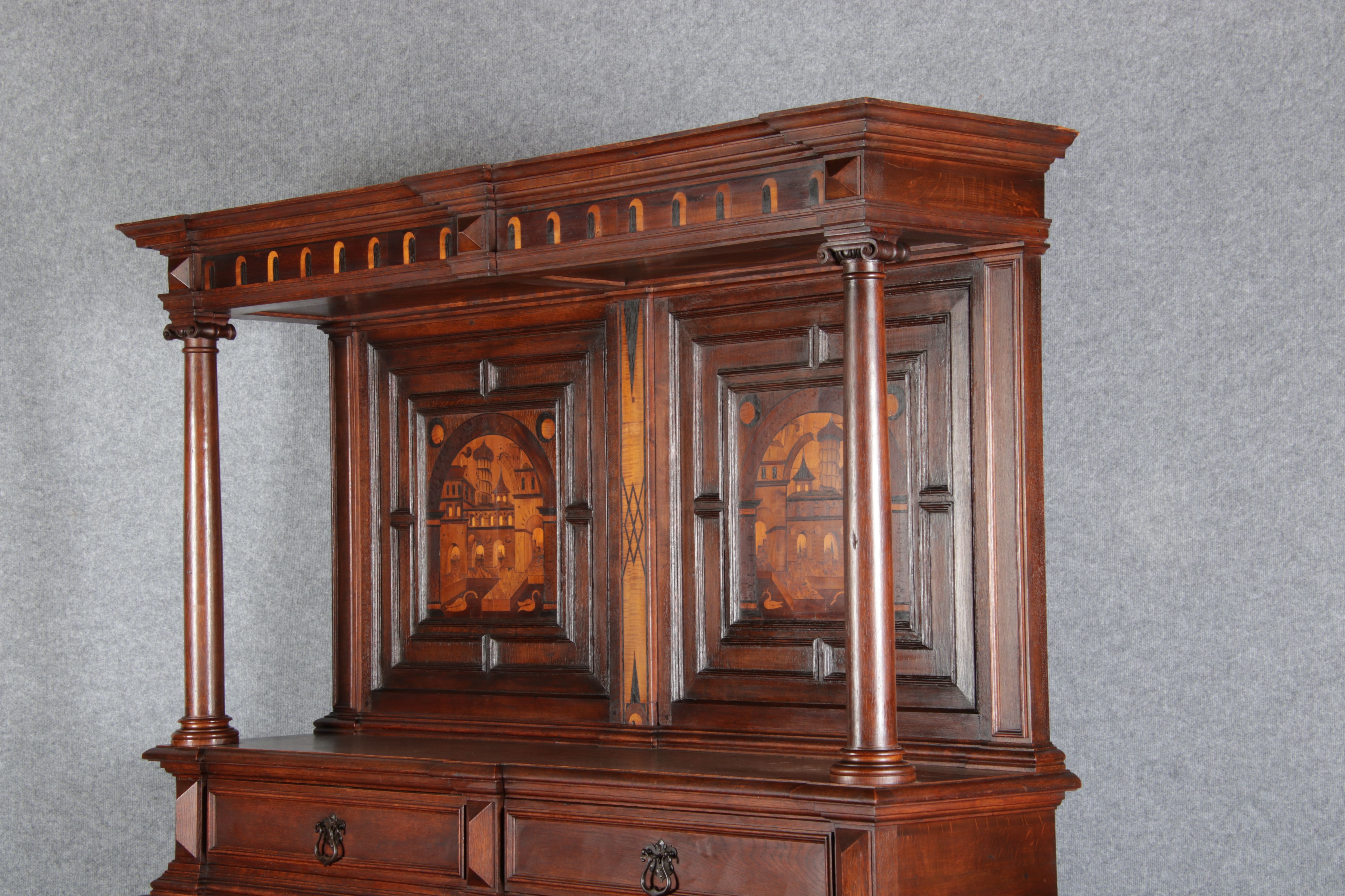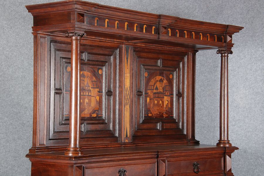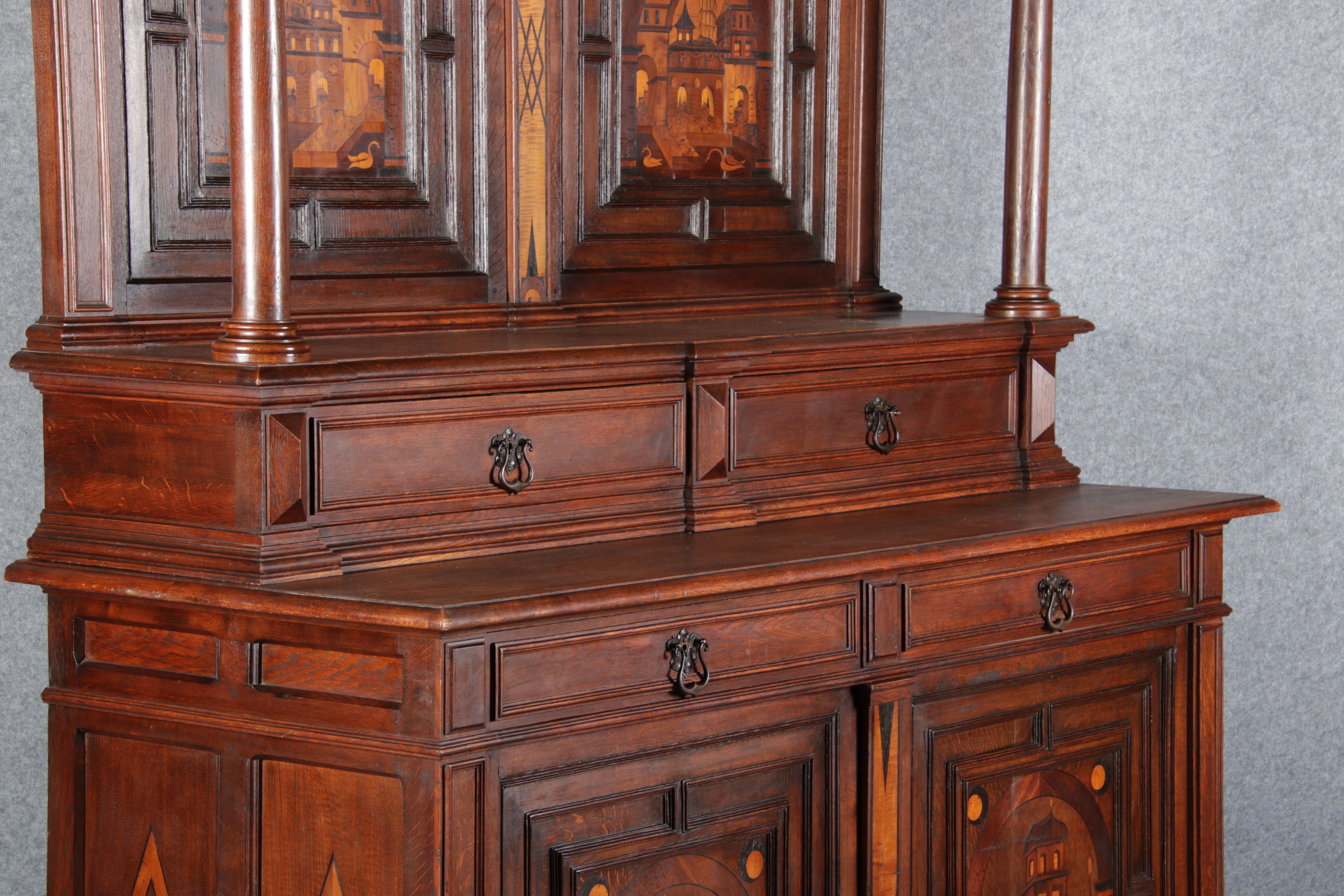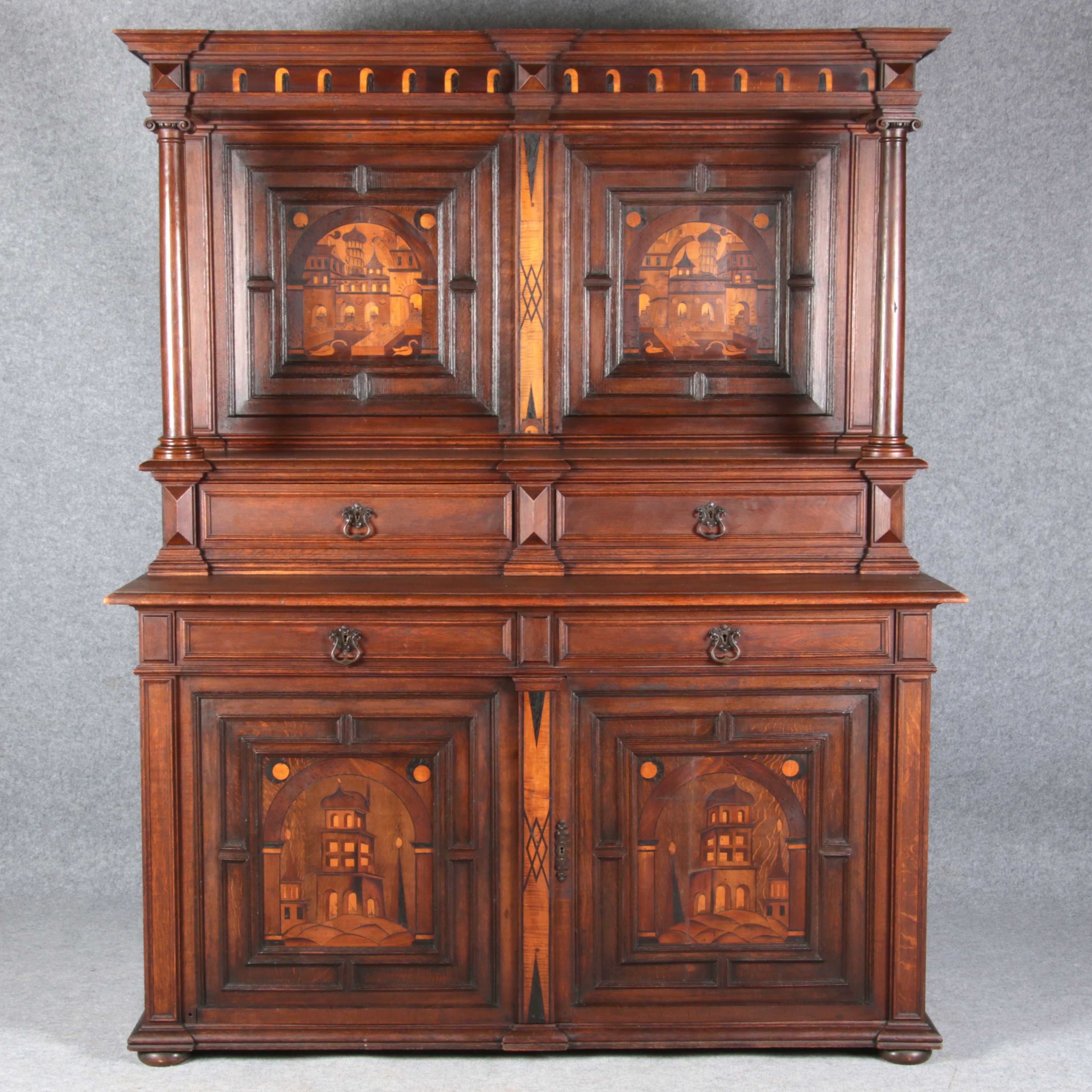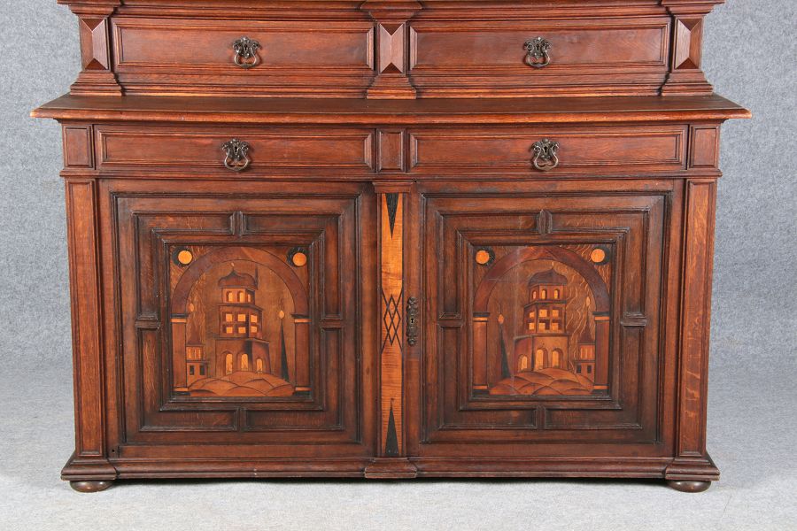 | Antike Historismus Kredenz Büffet mit Schnitzwerk und Architektur Intarsien um 1900 | ||||||||||||||||||||||||||||||||||||||||||||||||||||||||||||||||||