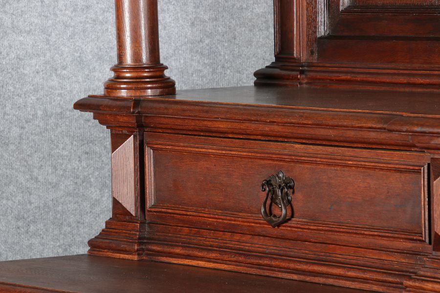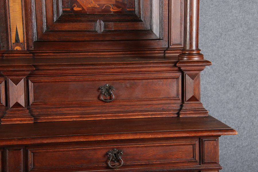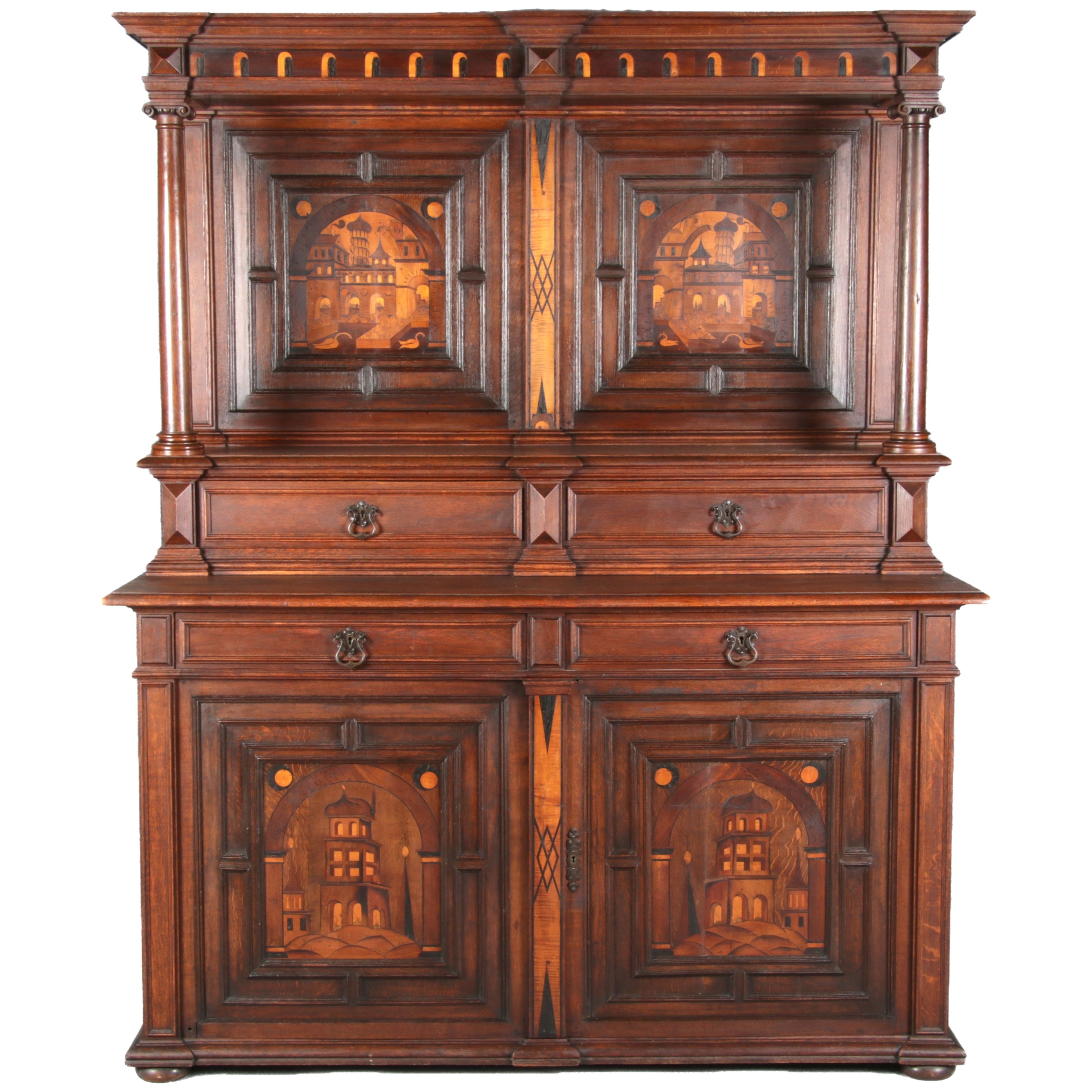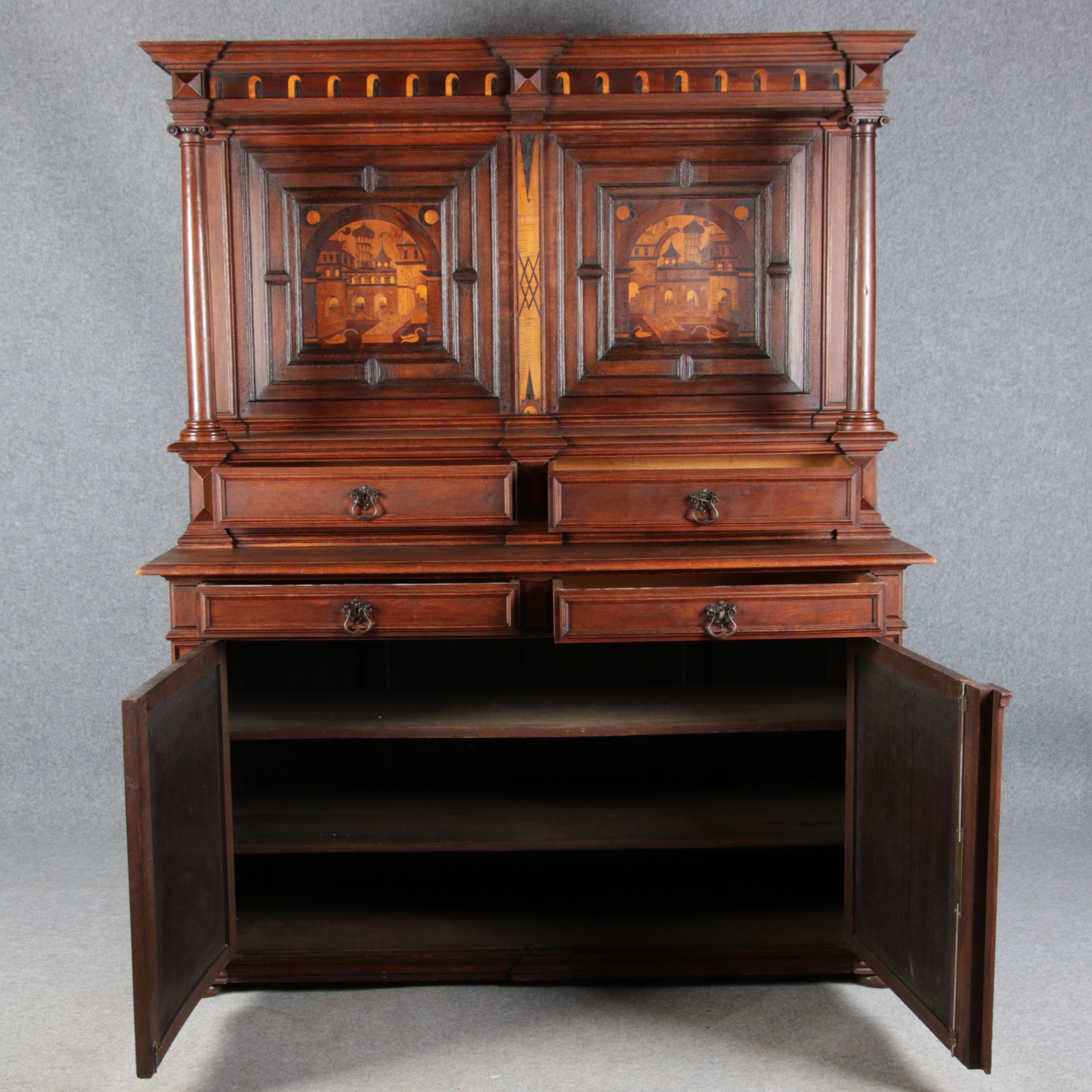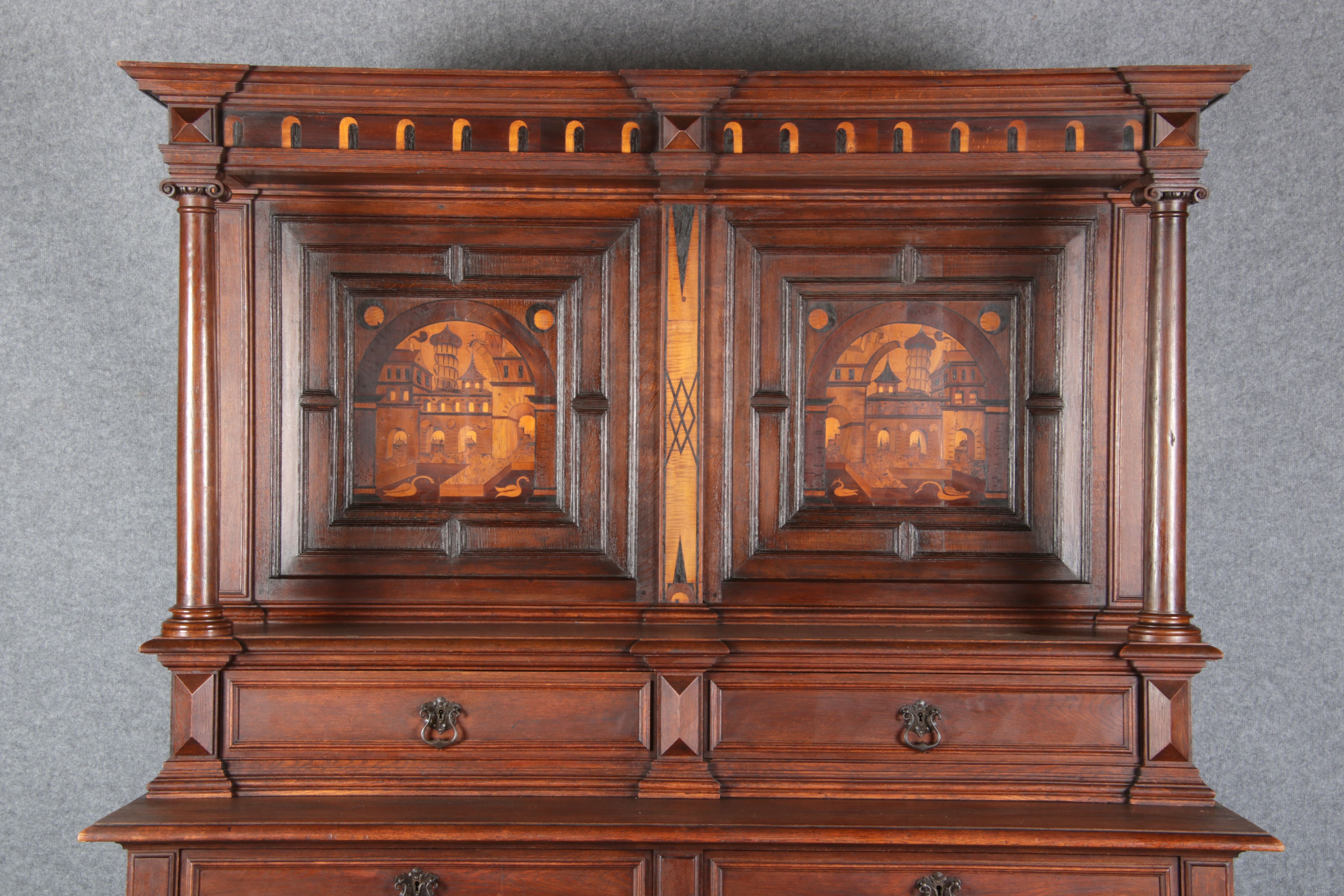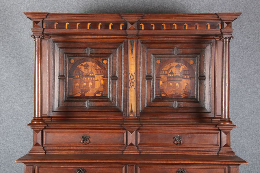 | Antike Historismus Kredenz Büffet mit Schnitzwerk und Architektur Intarsien um 1900 | ||||||||||||||||||||||||||||||||||||||||||||||||||||||||||||||||||