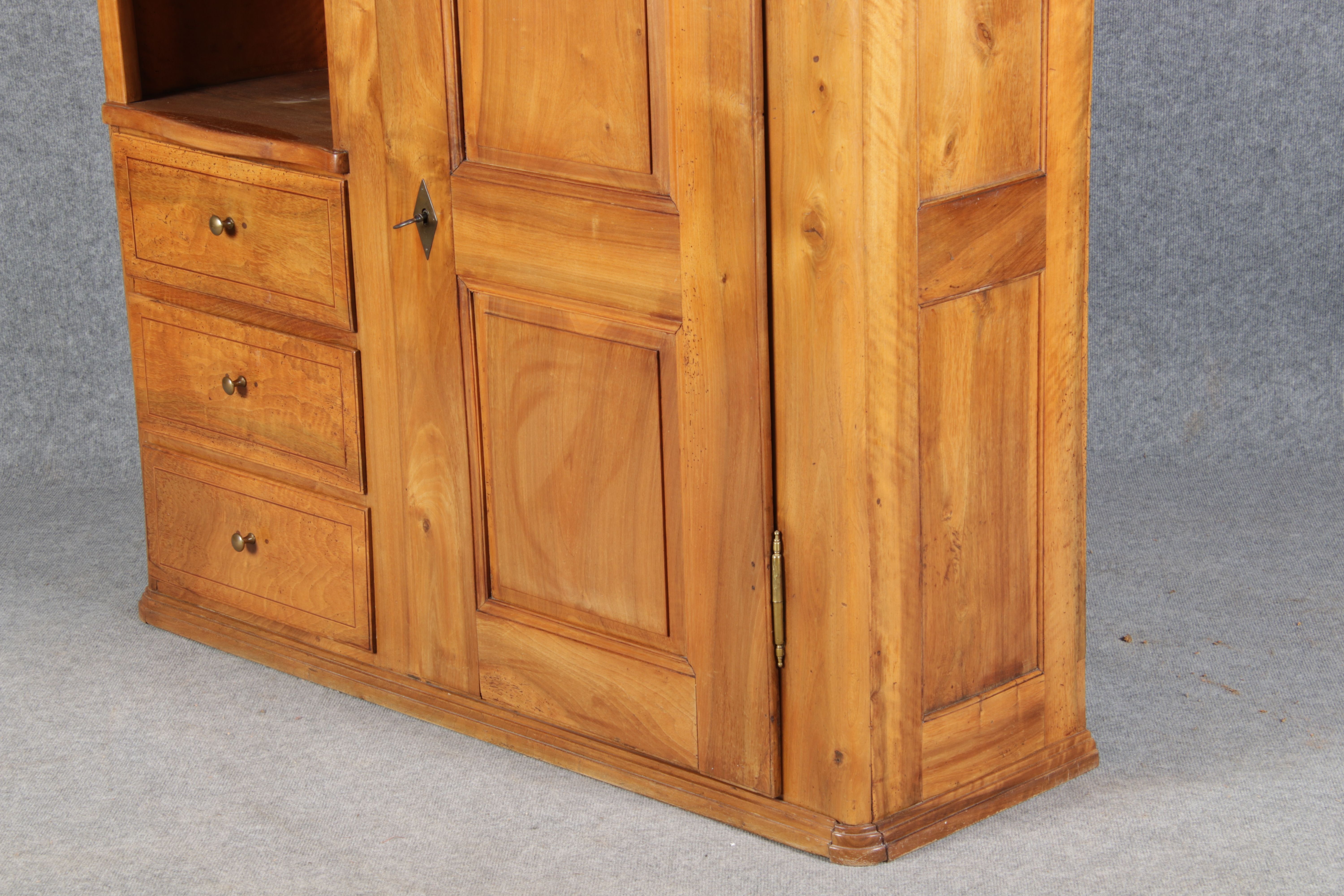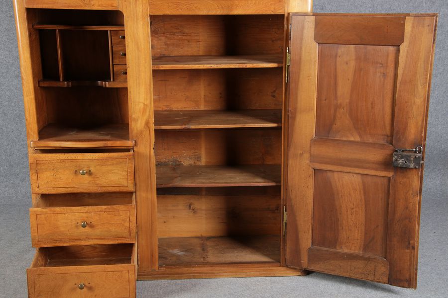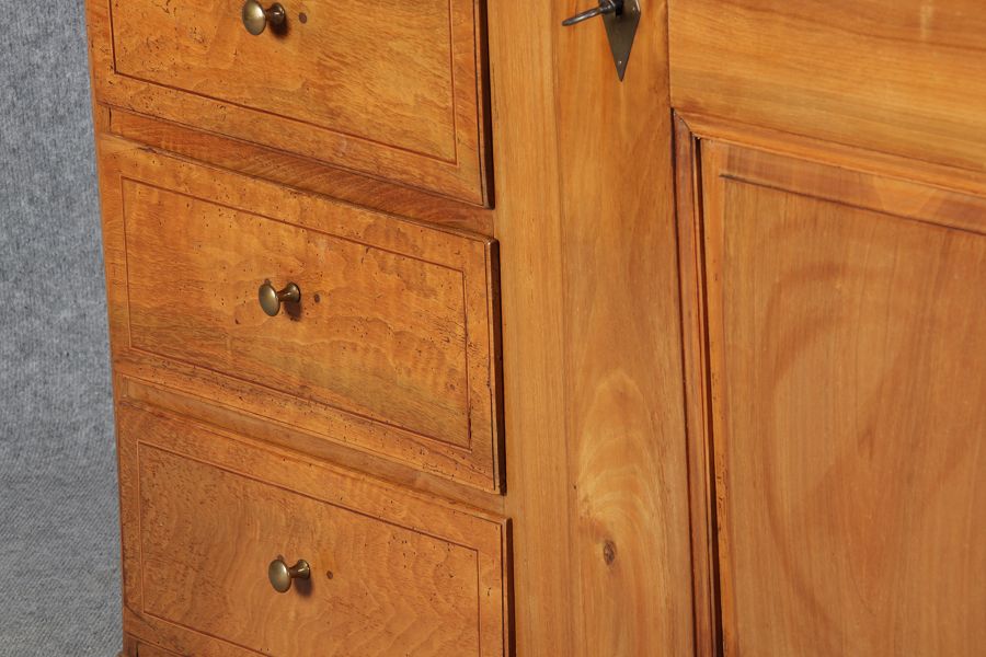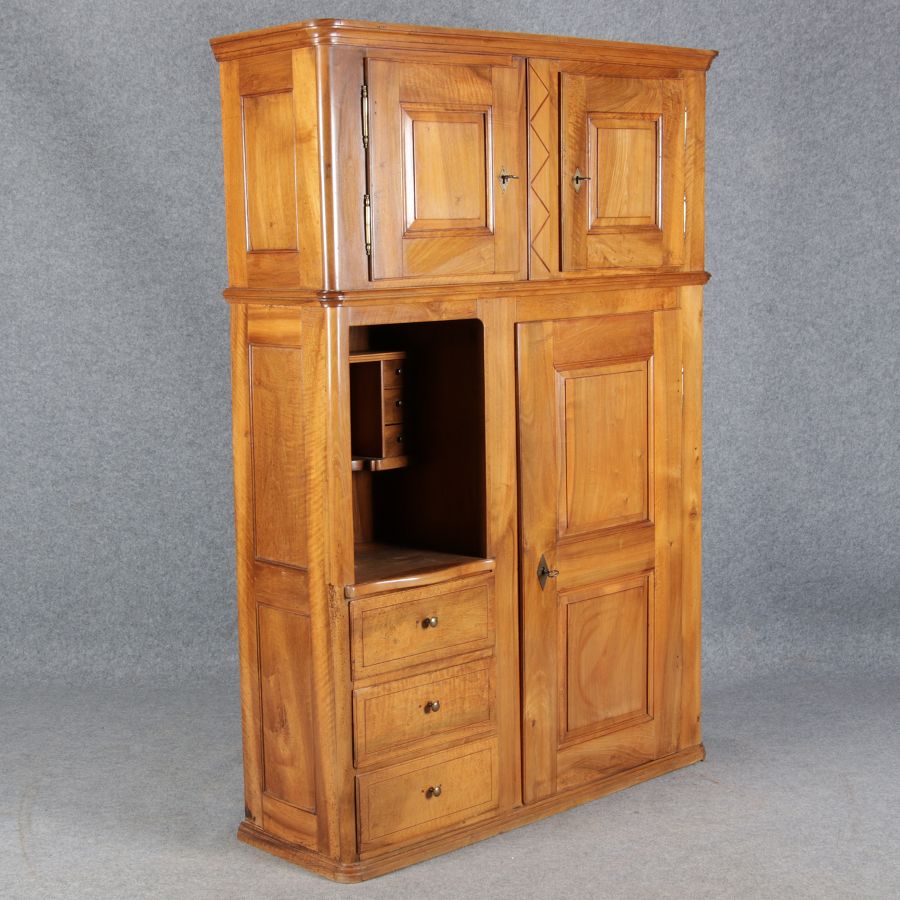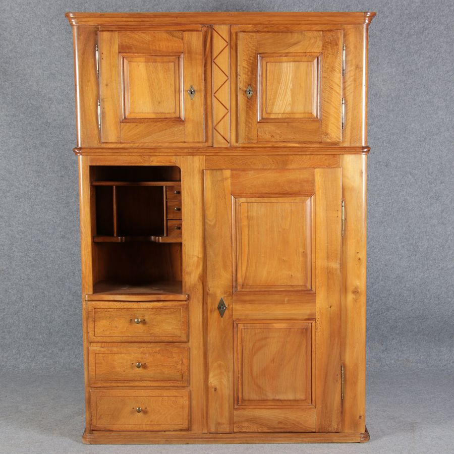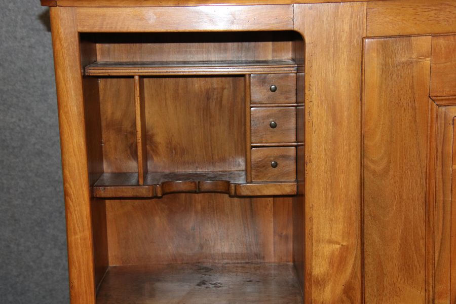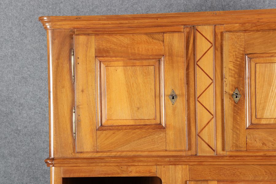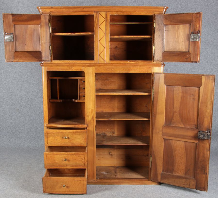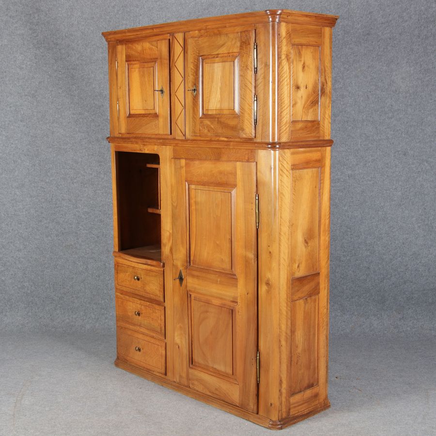 | antikes Biedermeier Büffet Schrank Nussbaum massiv um 1820. Im Oberteil zwei Türen, im Unterteil rechts eine große Tür und auf der linken Seite drei Schübe und eine Ablage mit kleinen Schubladen. | ||||||||||||||||||||||||||||||||||||||||||||||||