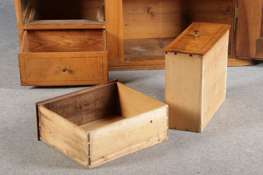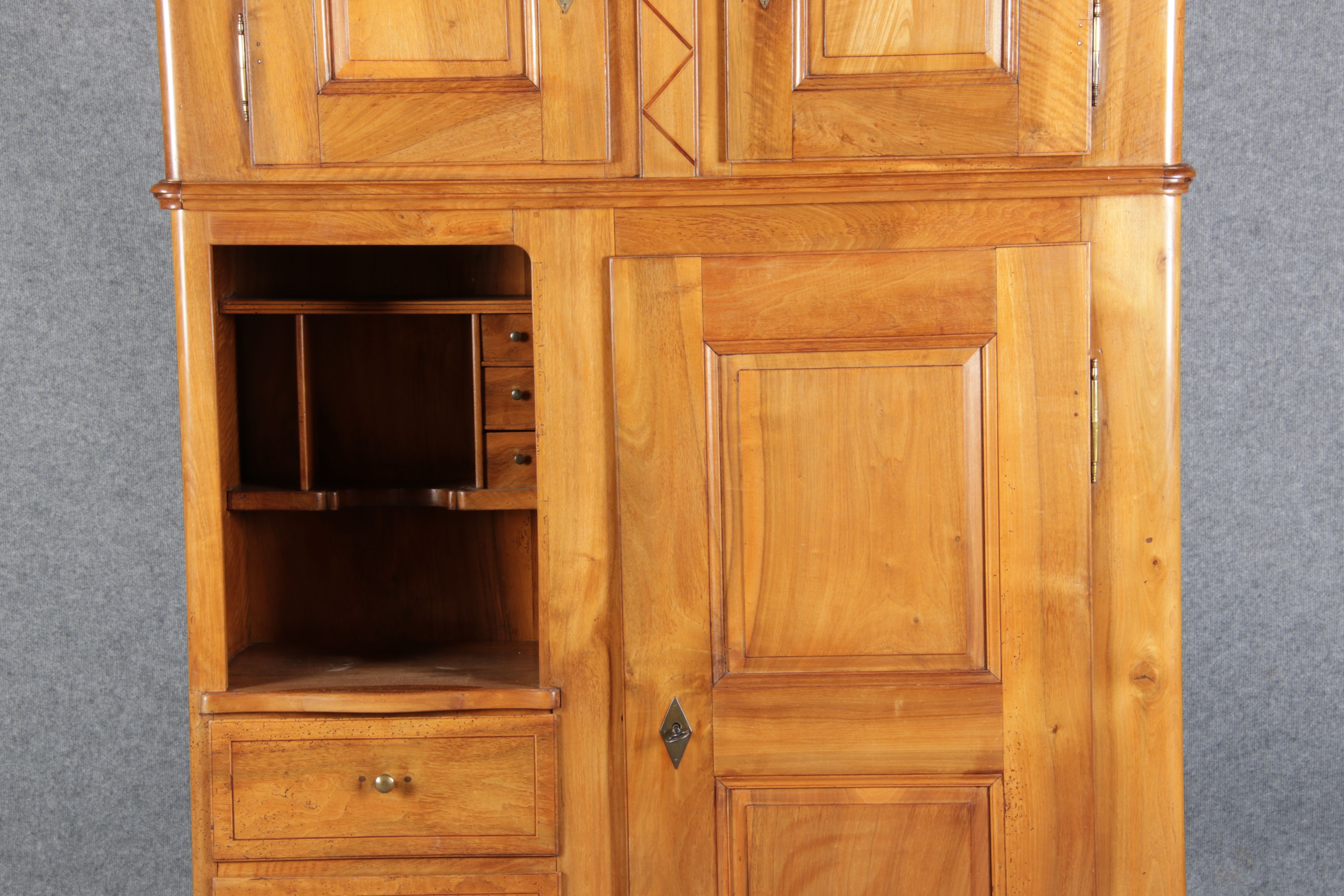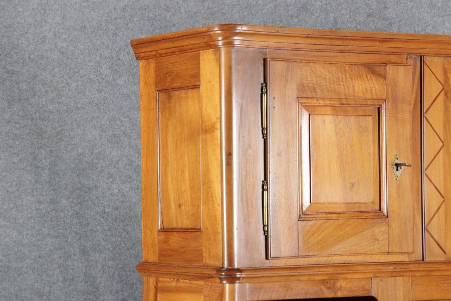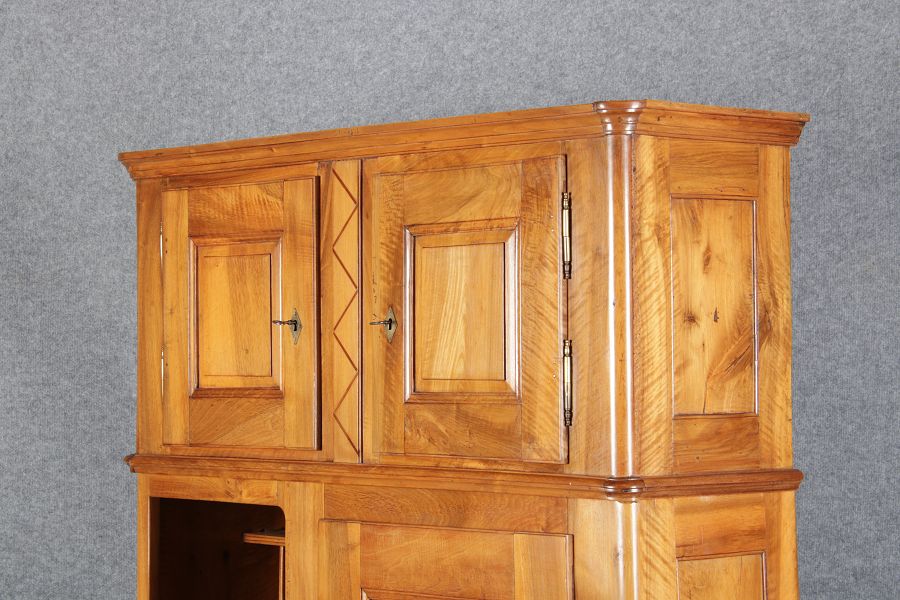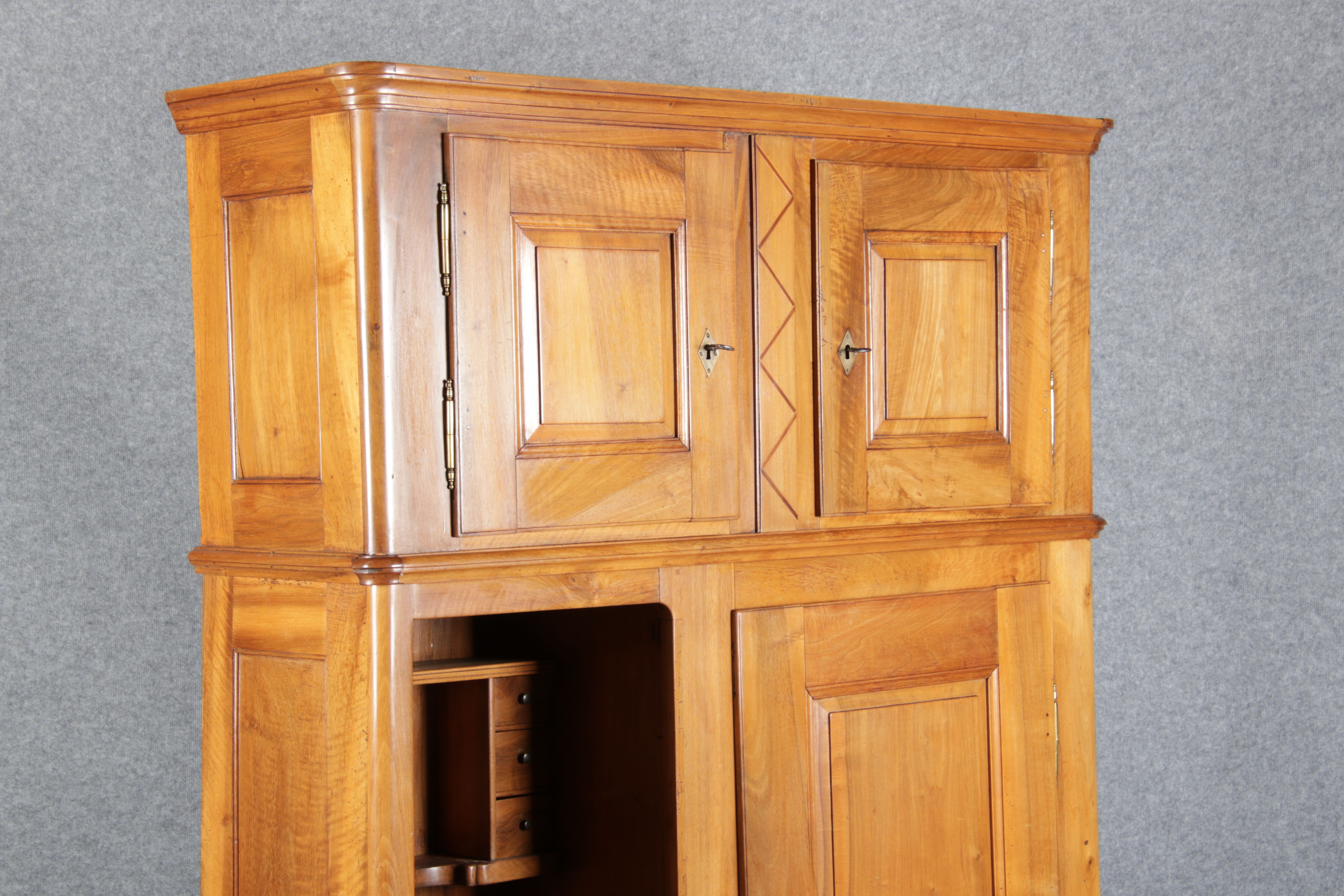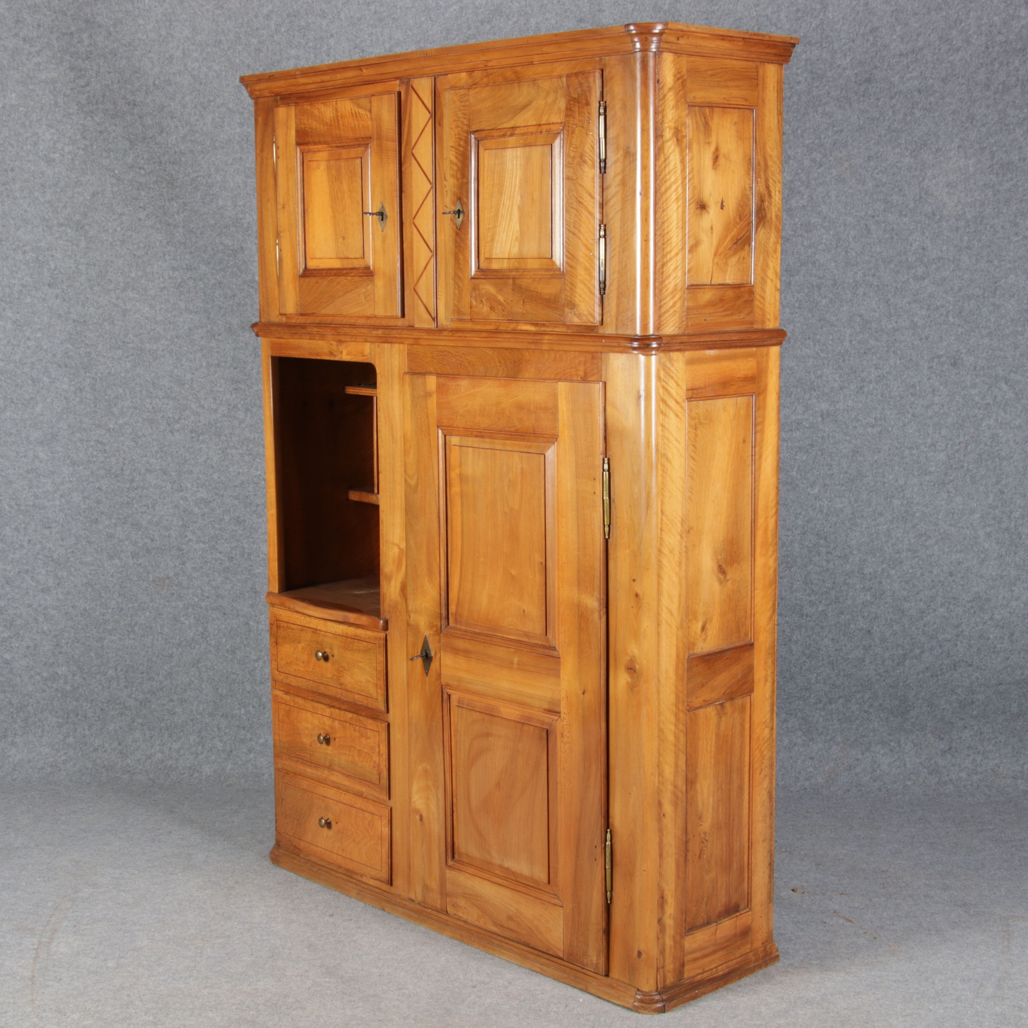 | antikes Biedermeier Büffet Schrank Nussbaum massiv um 1820. Im Oberteil zwei Türen, im Unterteil rechts eine große Tür und auf der linken Seite drei Schübe und eine Ablage mit kleinen Schubladen. | ||||||||||||||||||||||||||||||||||||||||||||||||