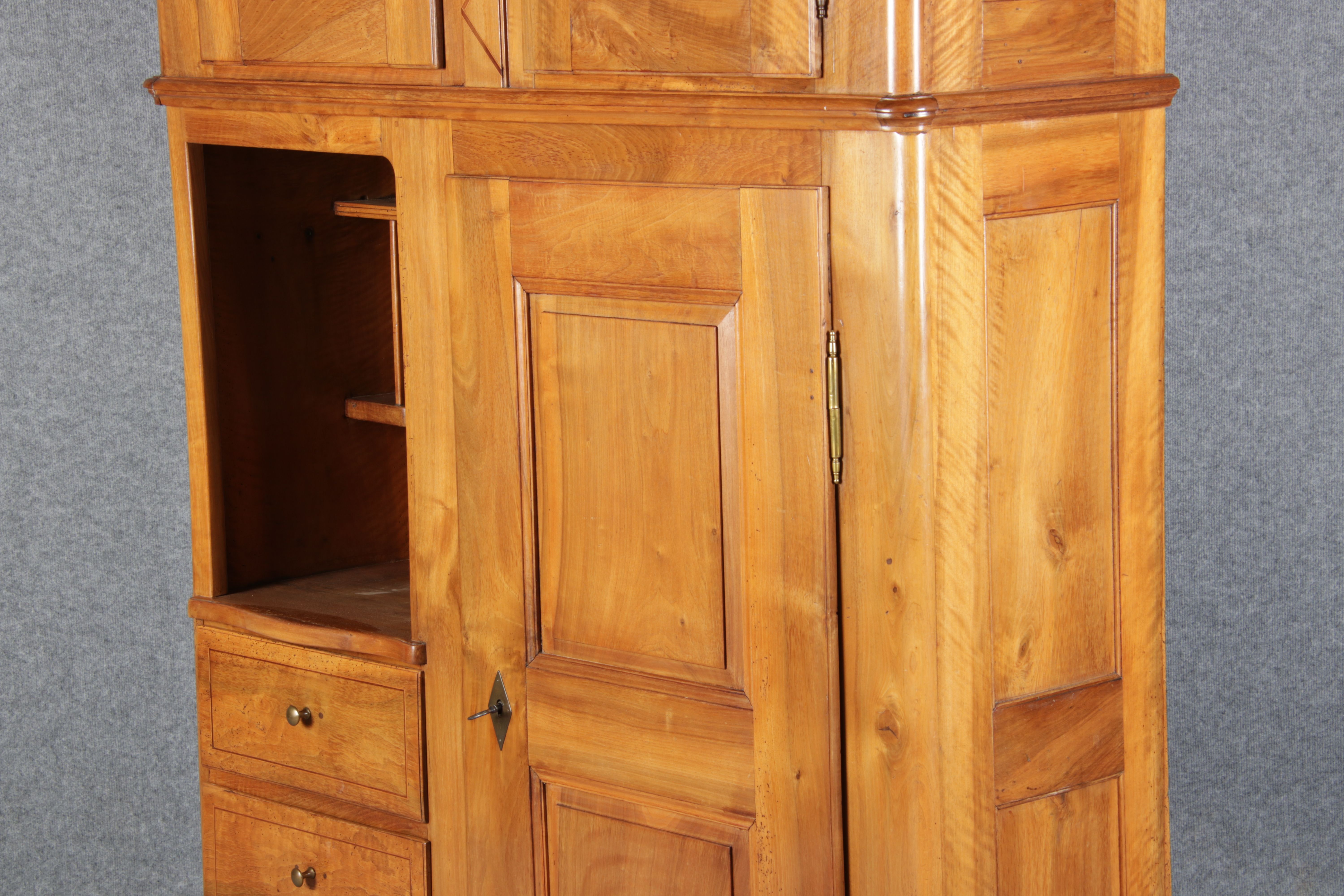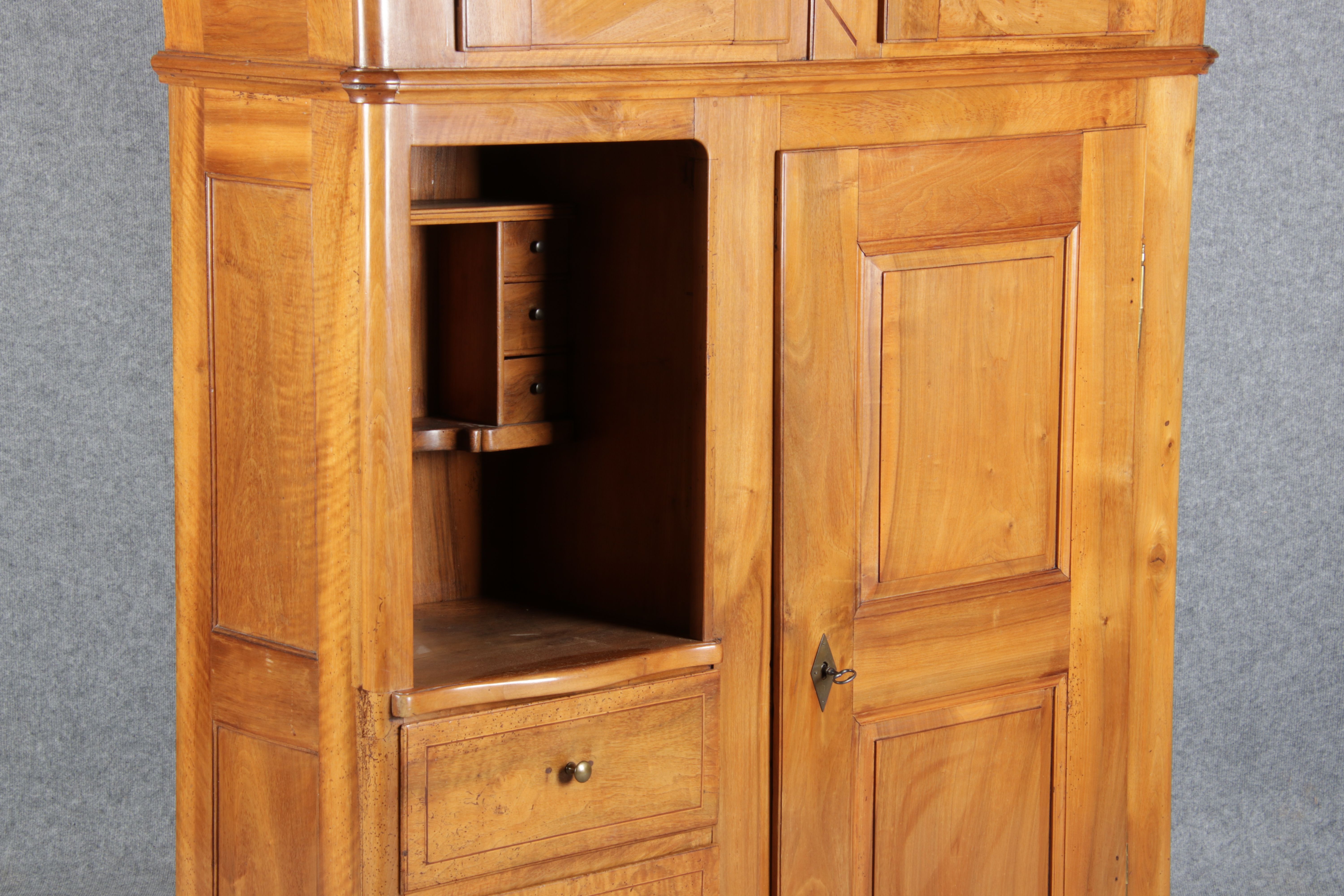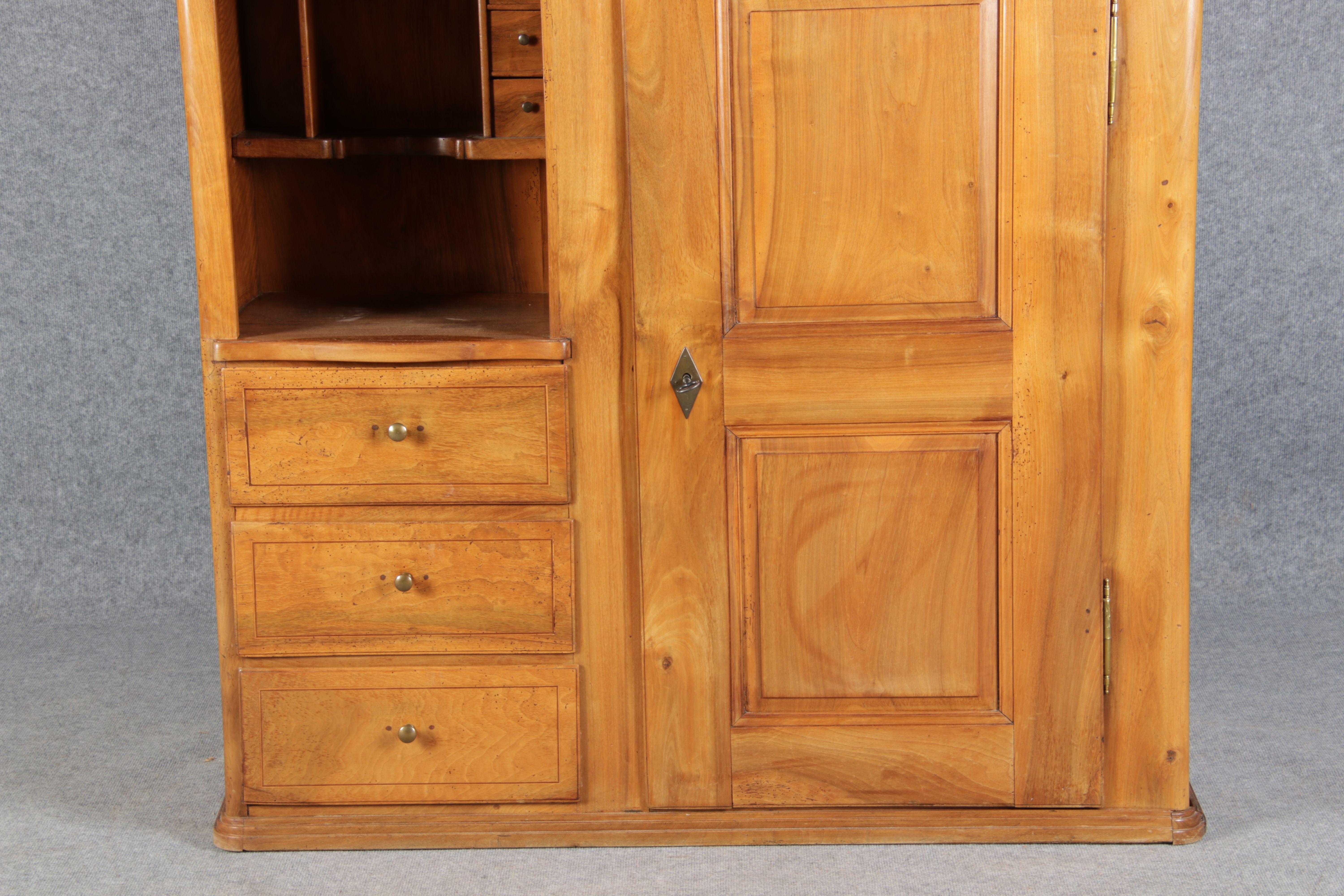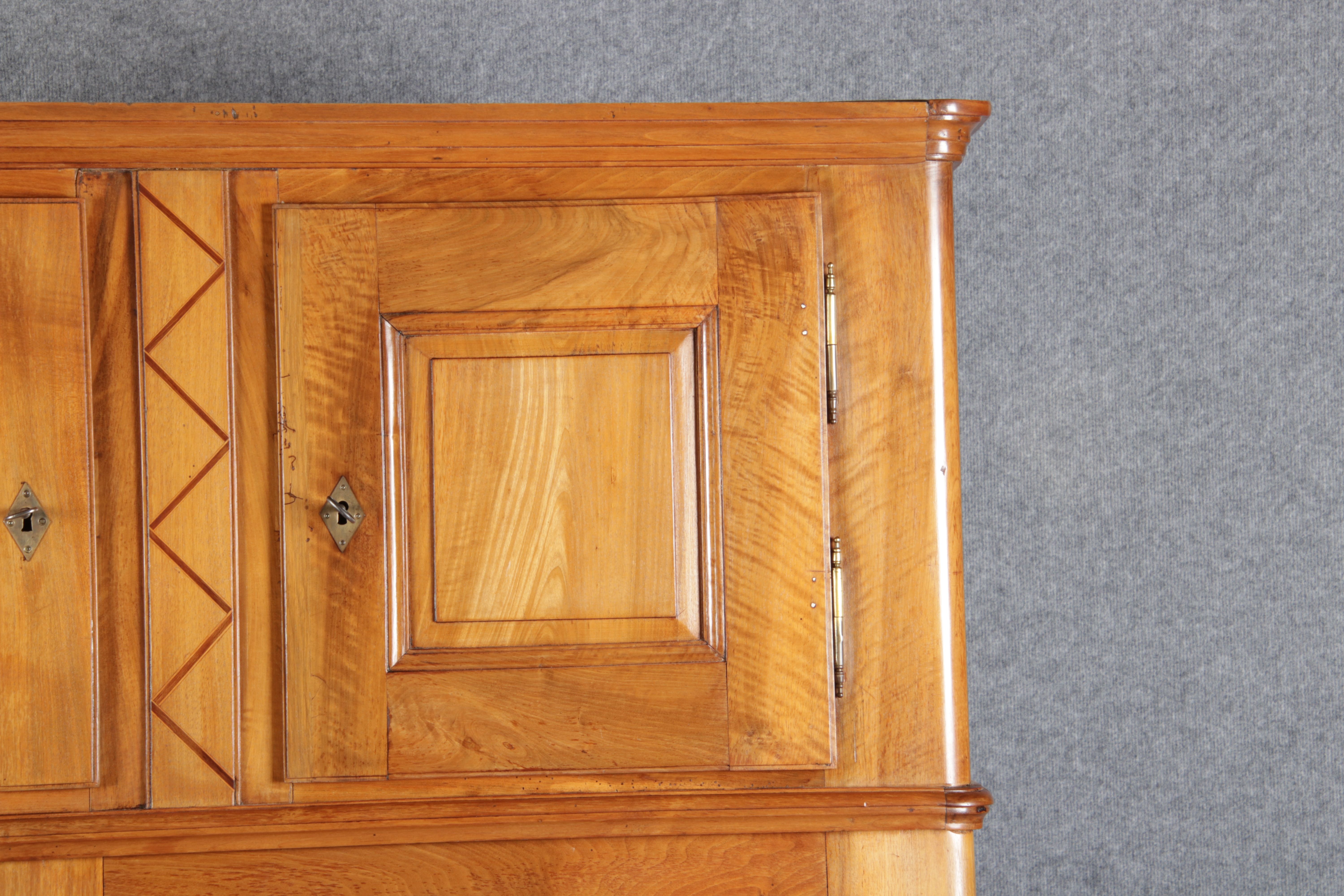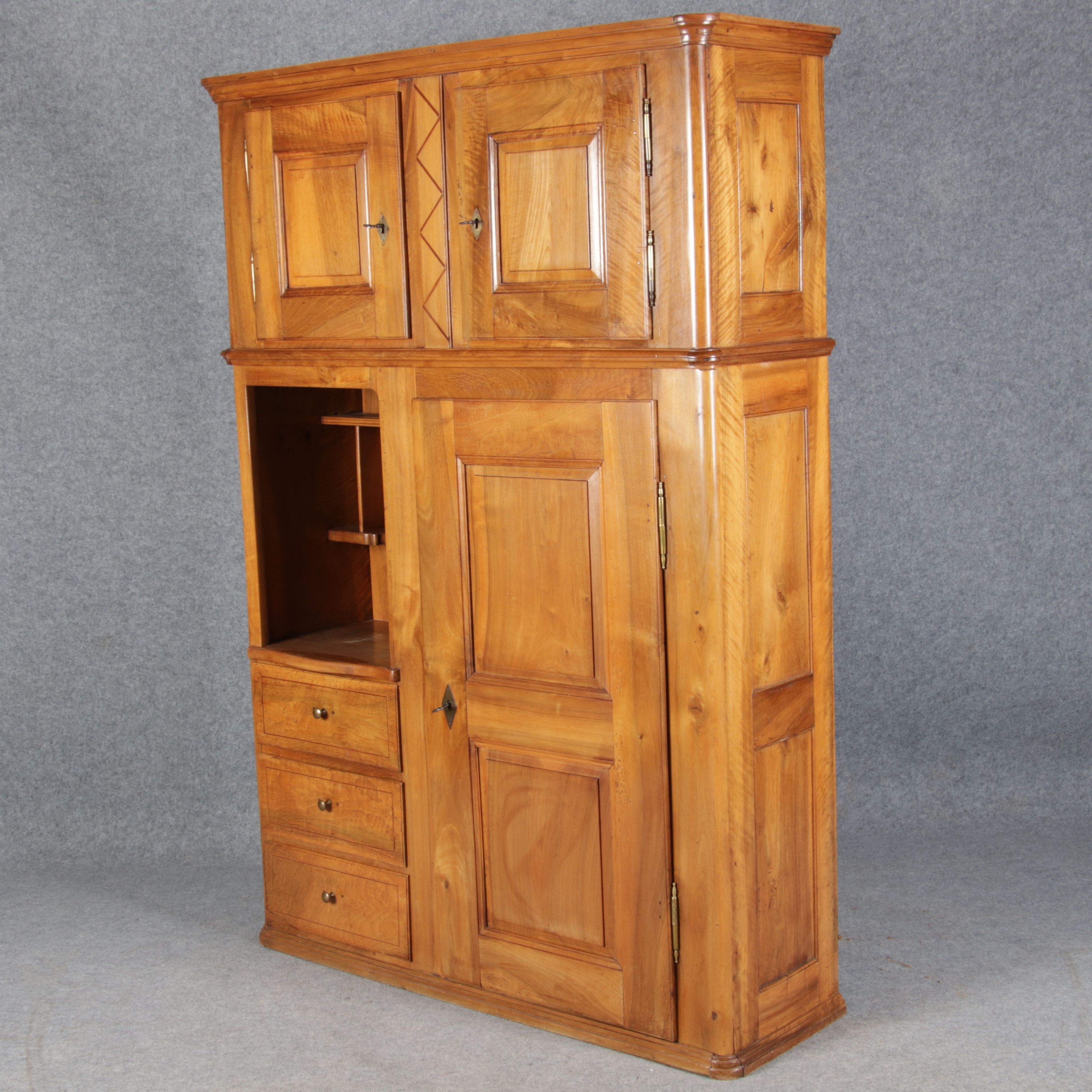| antikes Biedermeier Büffet Schrank Nussbaum massiv um 1820. Im Oberteil zwei Türen, im Unterteil rechts eine große Tür und auf der linken Seite drei Schübe und eine Ablage mit kleinen Schubladen. | ||||||||||||||||||||||||||||||||||||||||||||||||