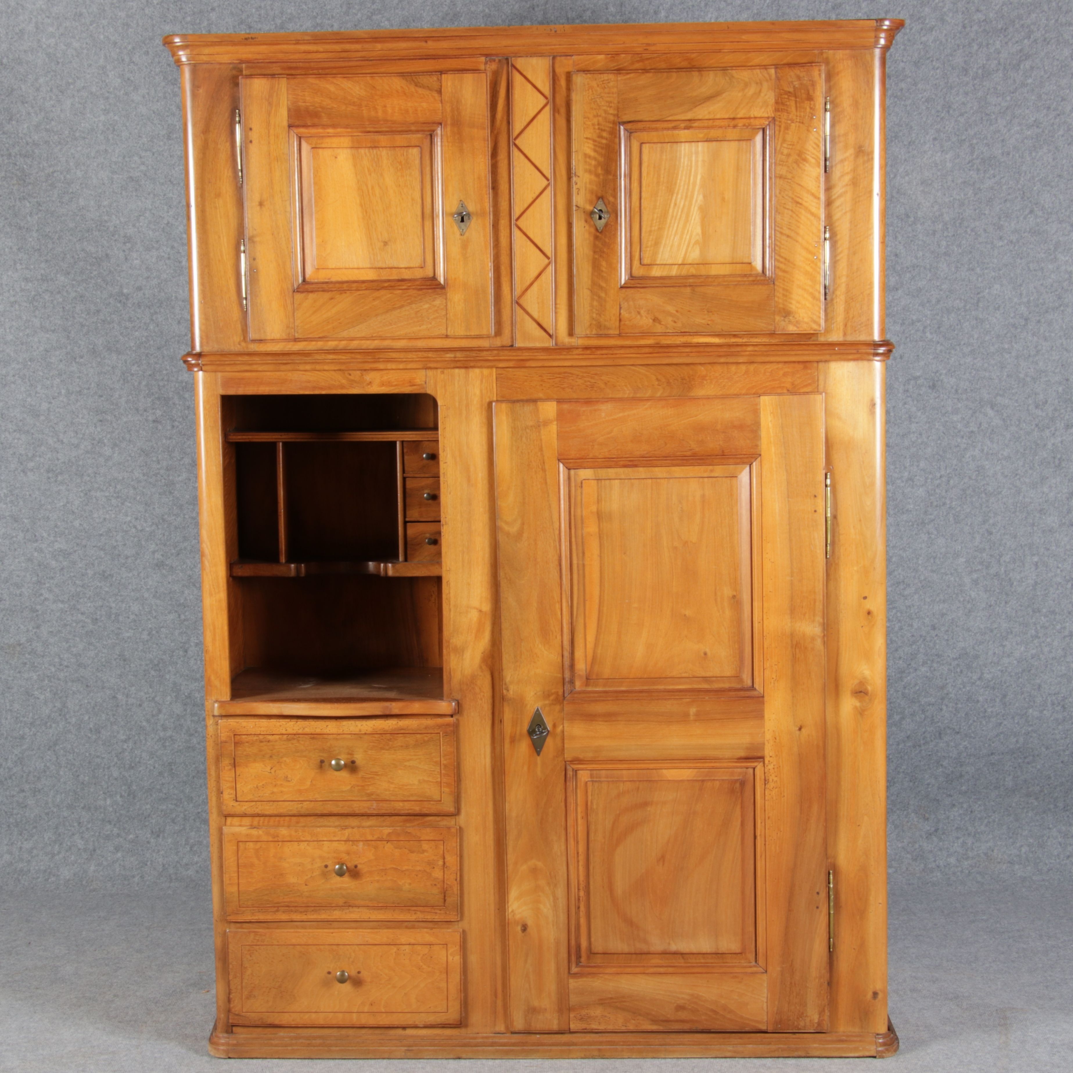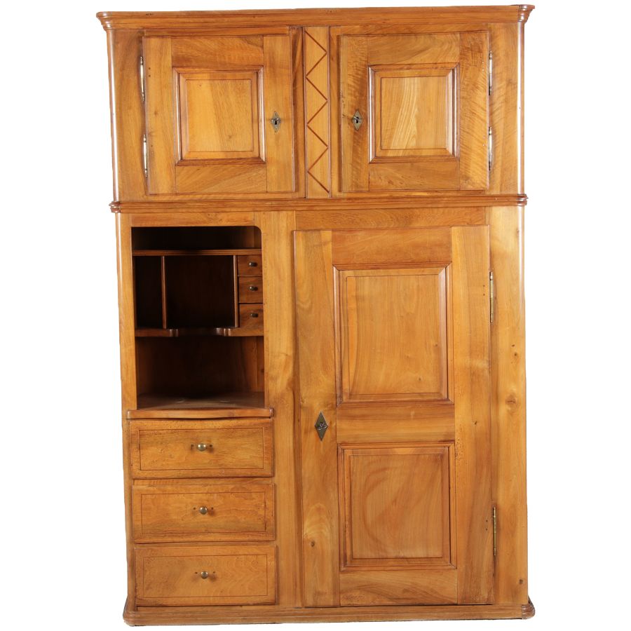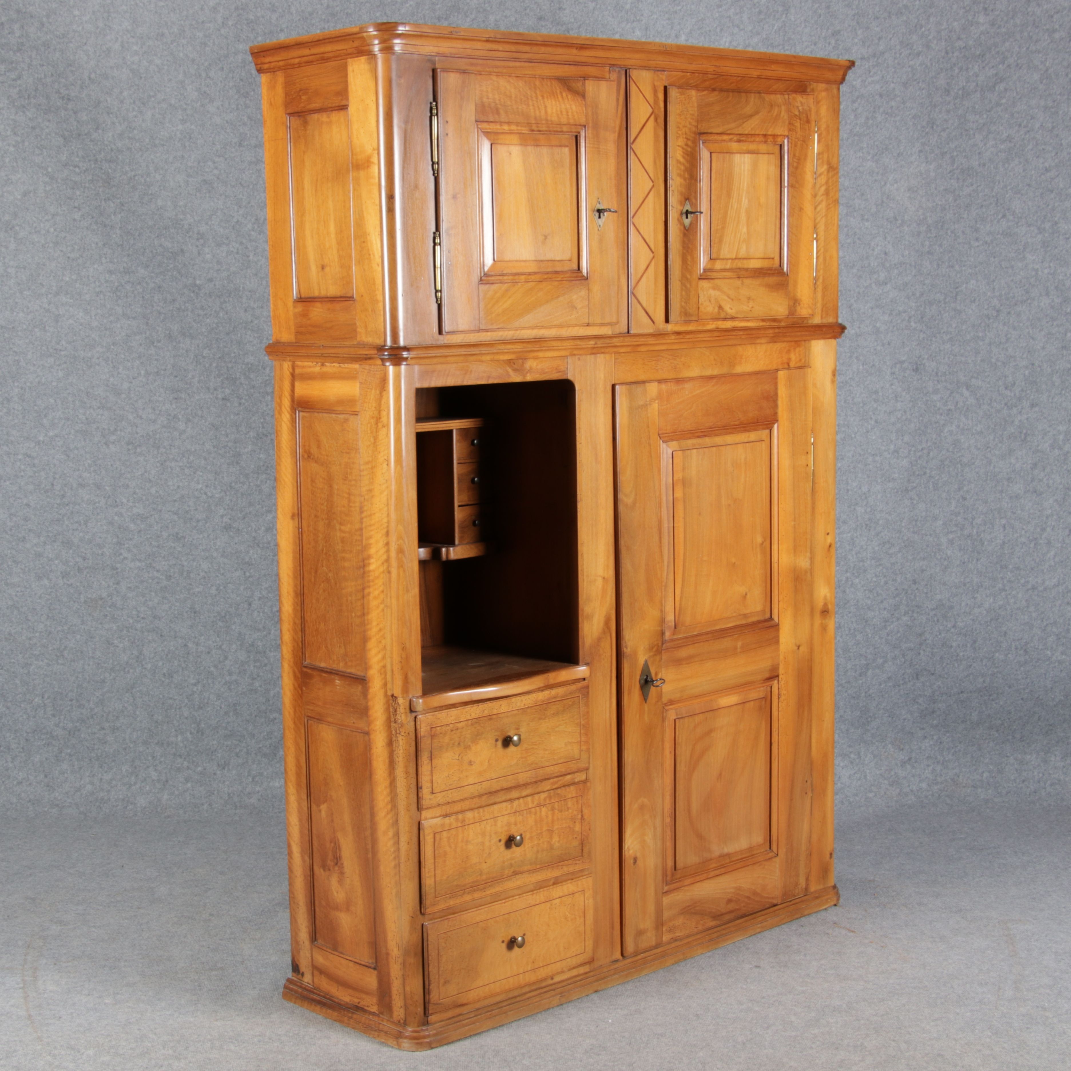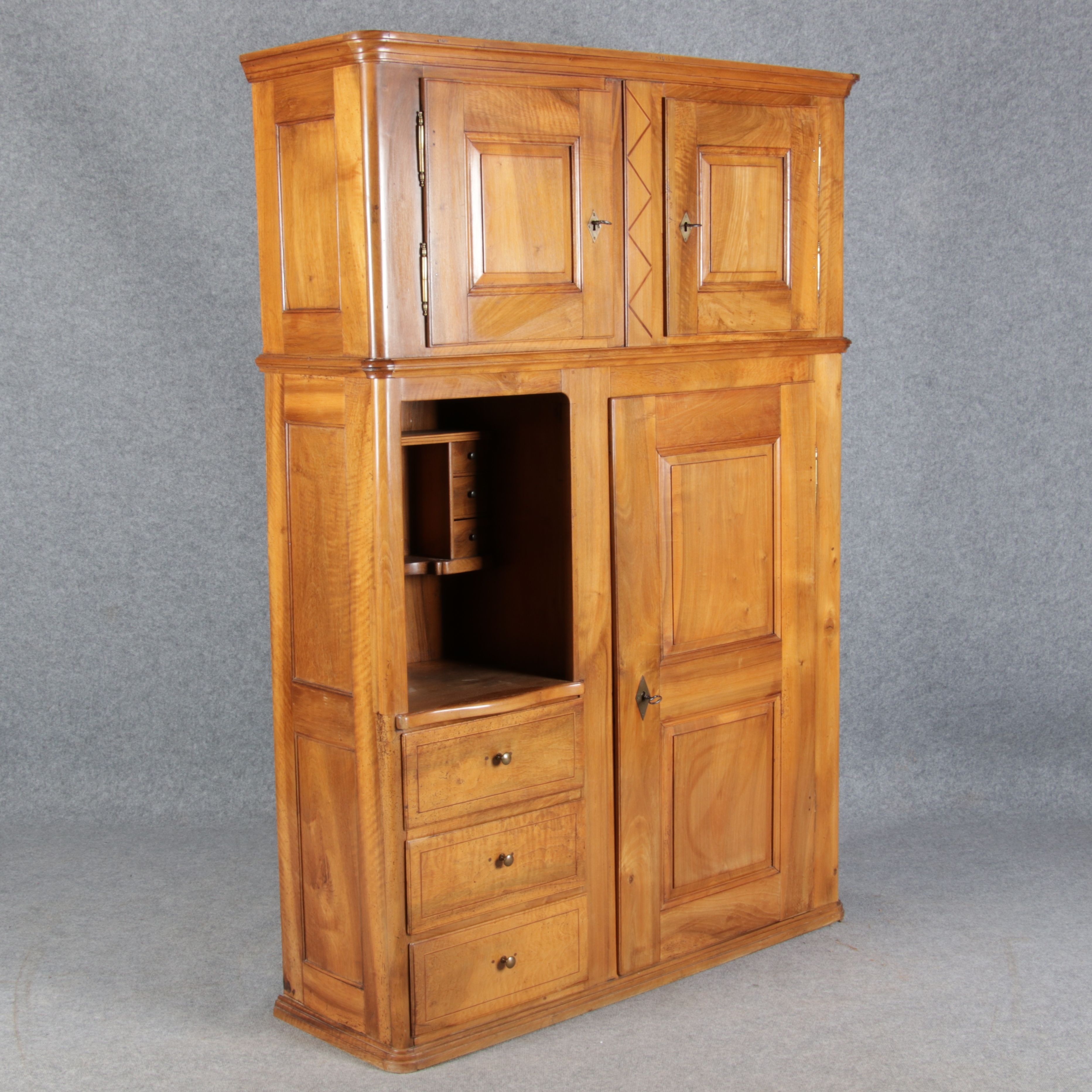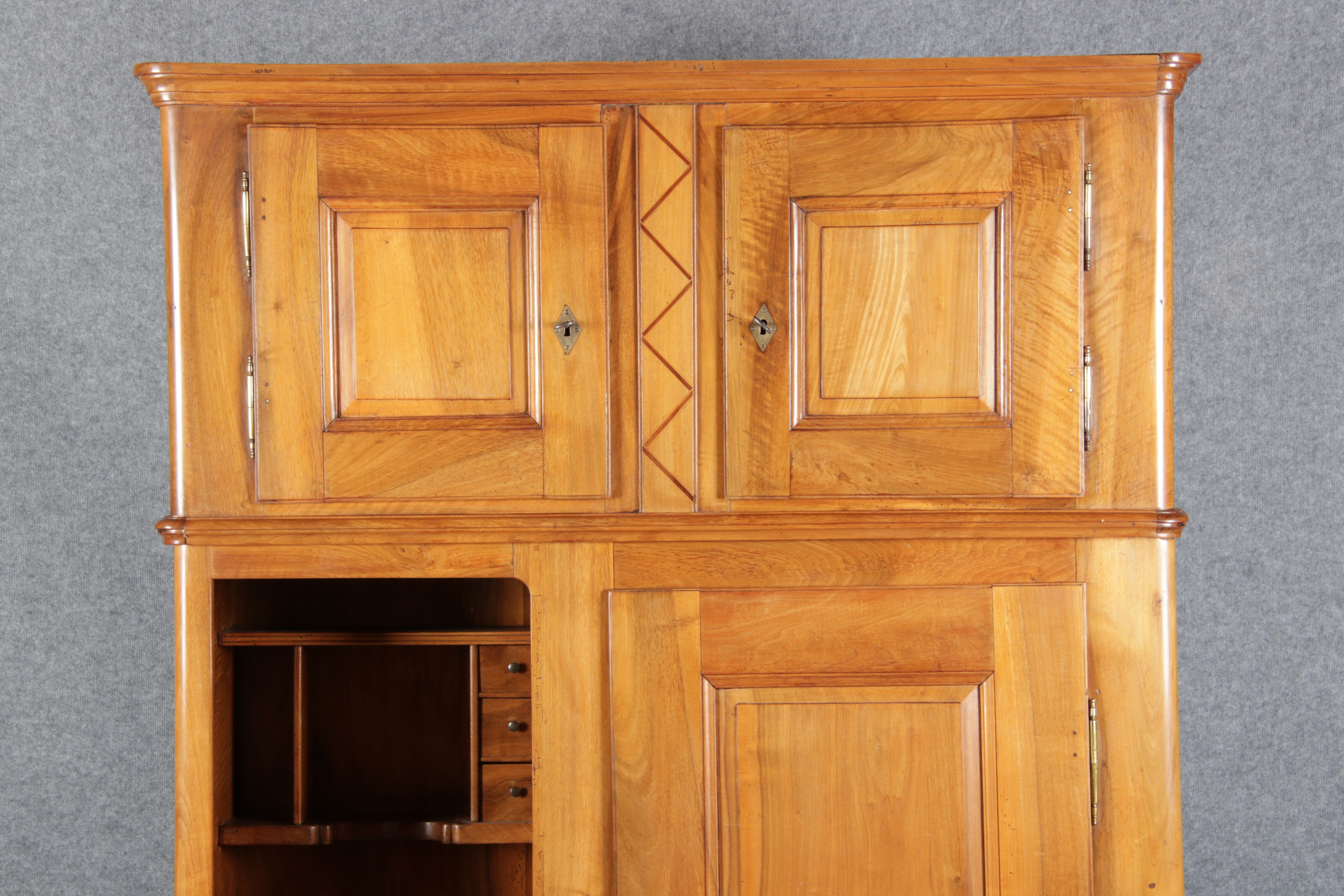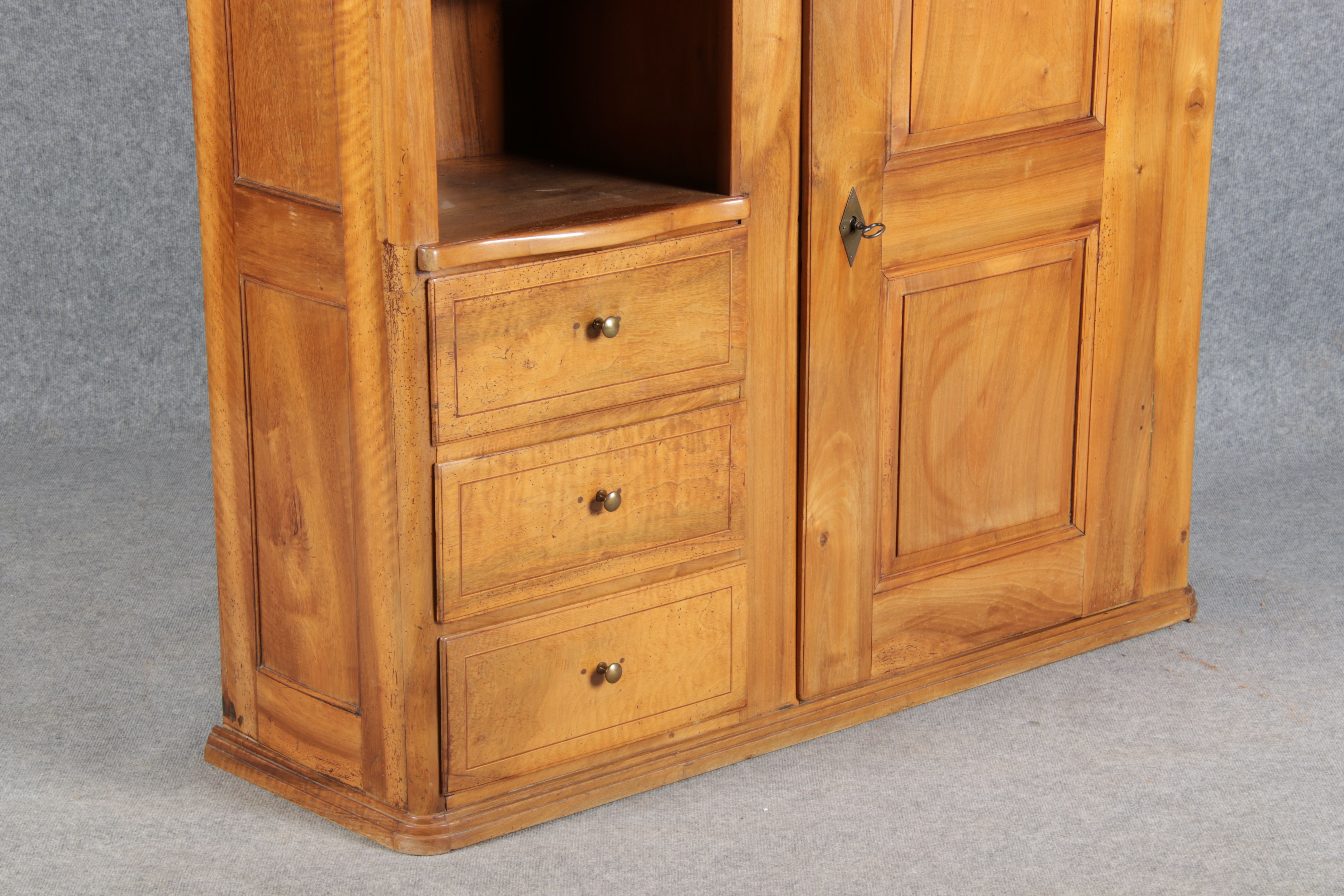 | antikes Biedermeier Büffet Schrank Nussbaum massiv um 1820. Im Oberteil zwei Türen, im Unterteil rechts eine große Tür und auf der linken Seite drei Schübe und eine Ablage mit kleinen Schubladen. | ||||||||||||||||||||||||||||||||||||||||||||||||