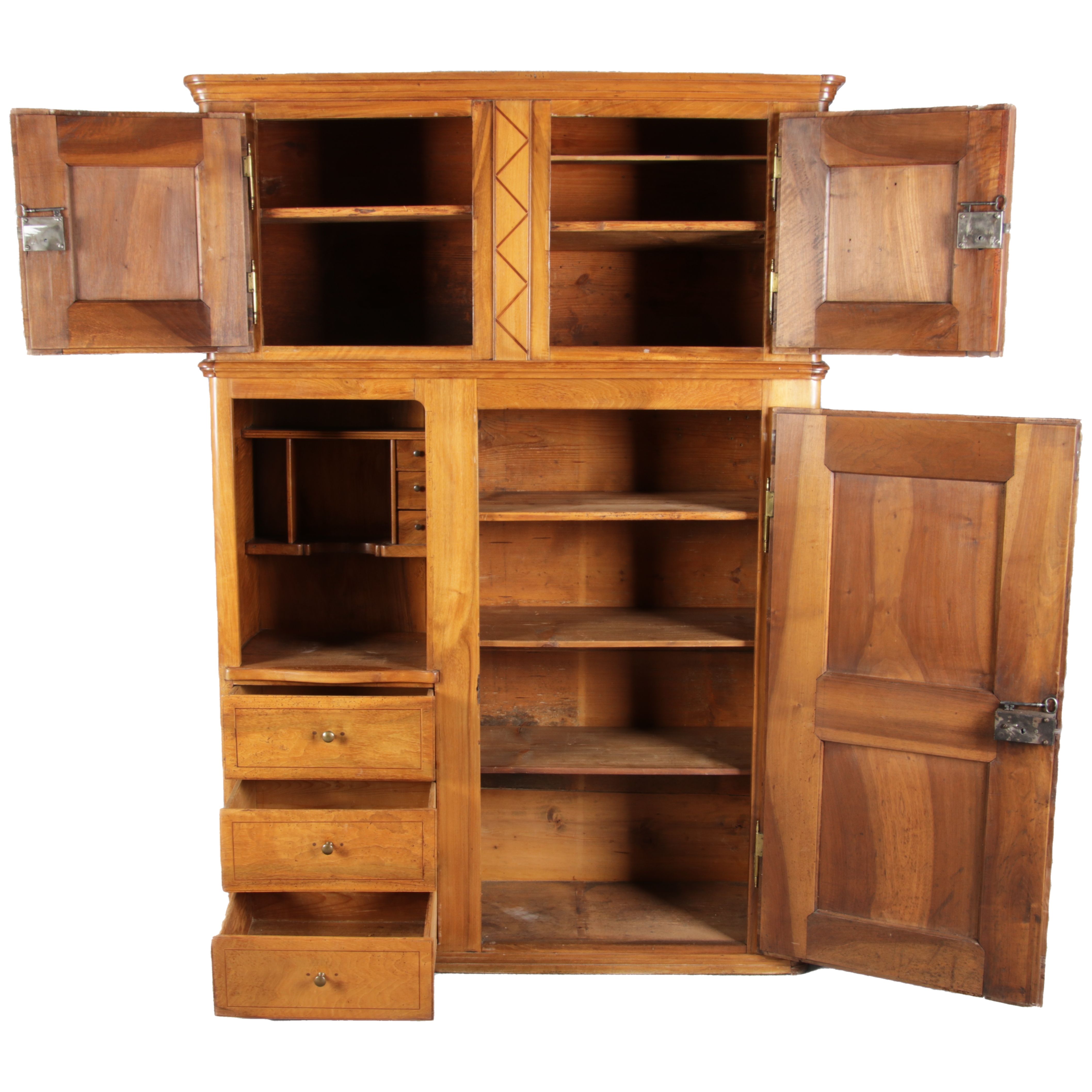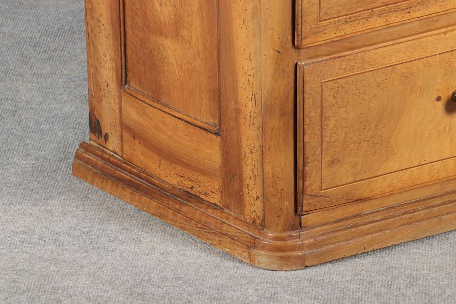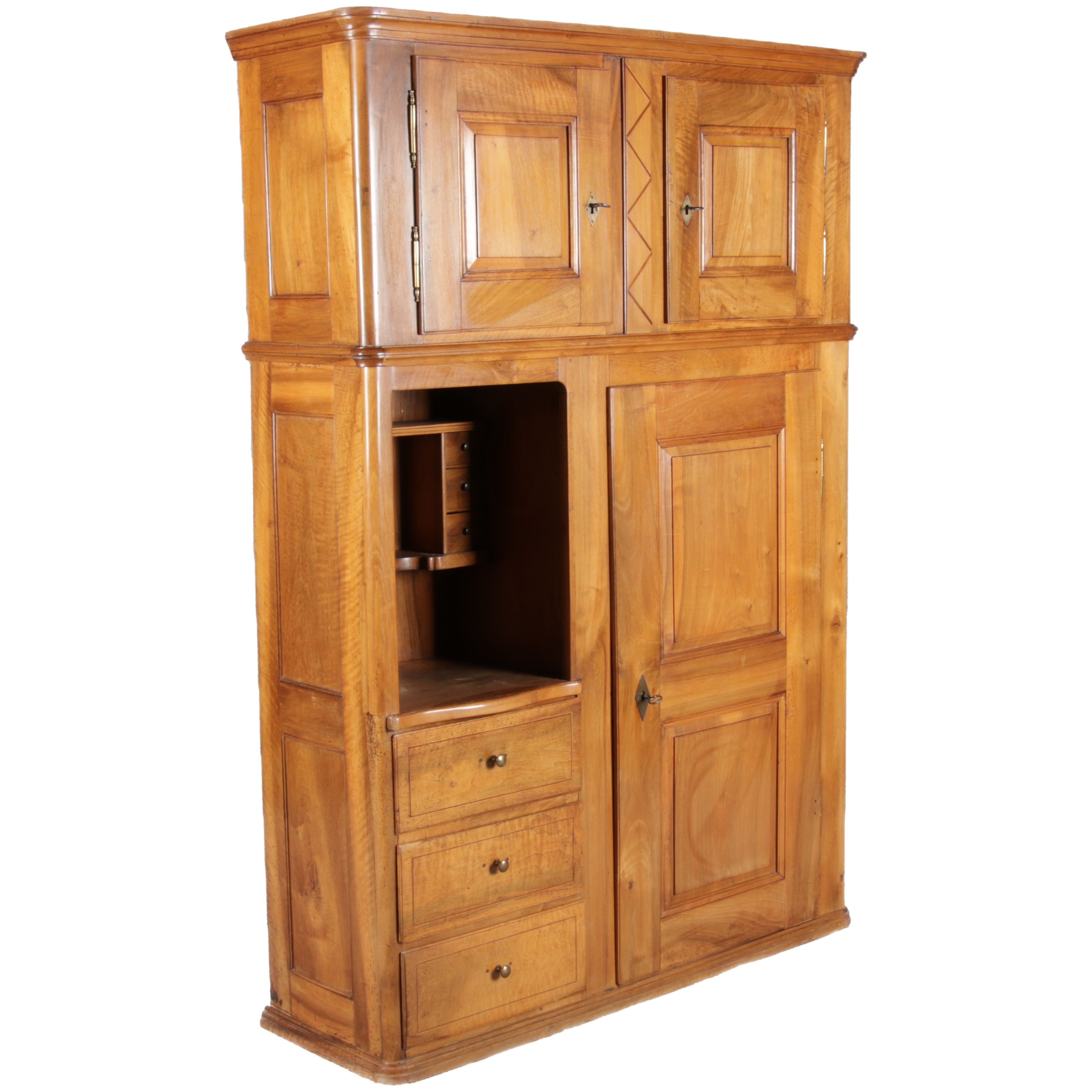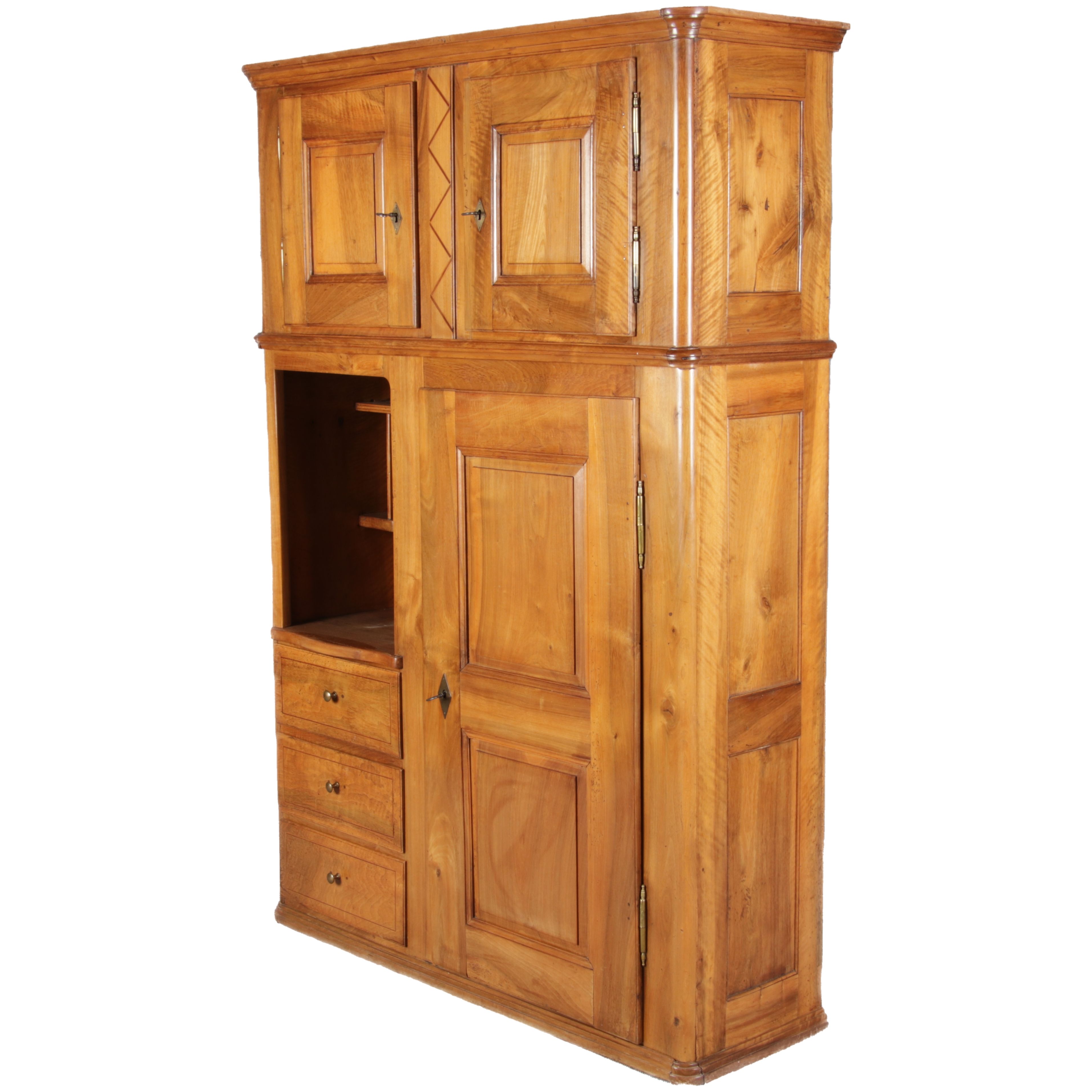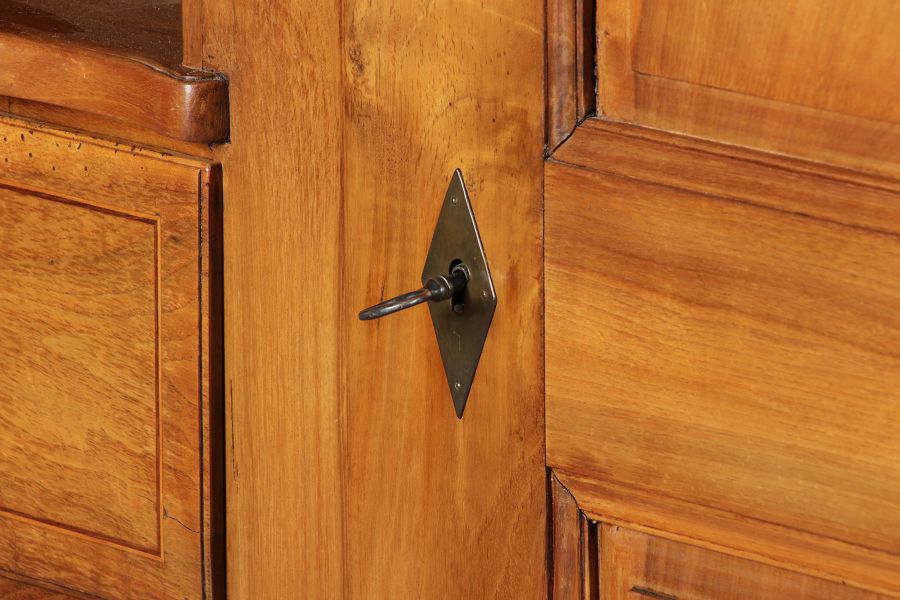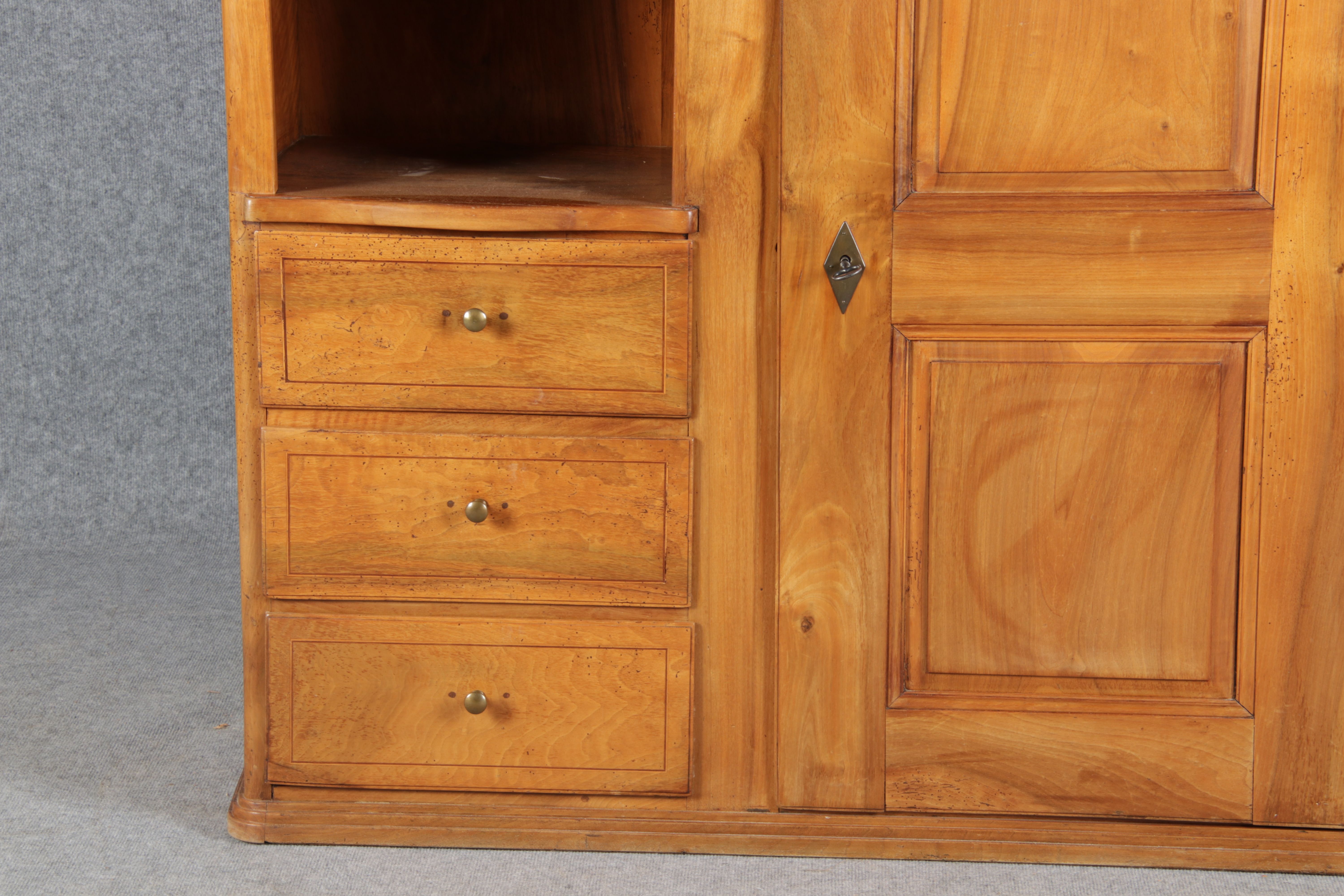 | antikes Biedermeier Büffet Schrank Nussbaum massiv um 1820. Im Oberteil zwei Türen, im Unterteil rechts eine große Tür und auf der linken Seite drei Schübe und eine Ablage mit kleinen Schubladen. | ||||||||||||||||||||||||||||||||||||||||||||||||