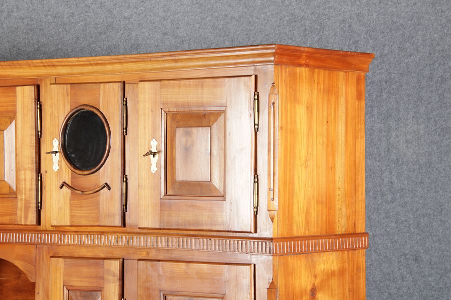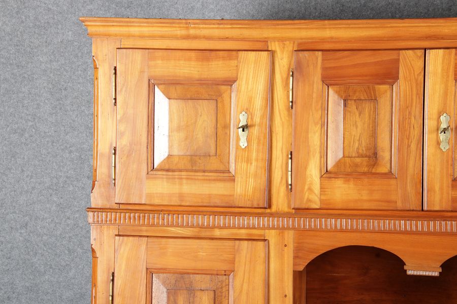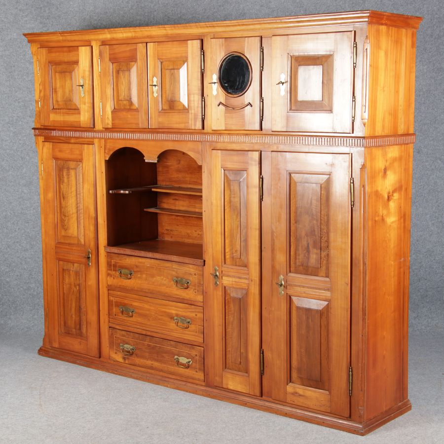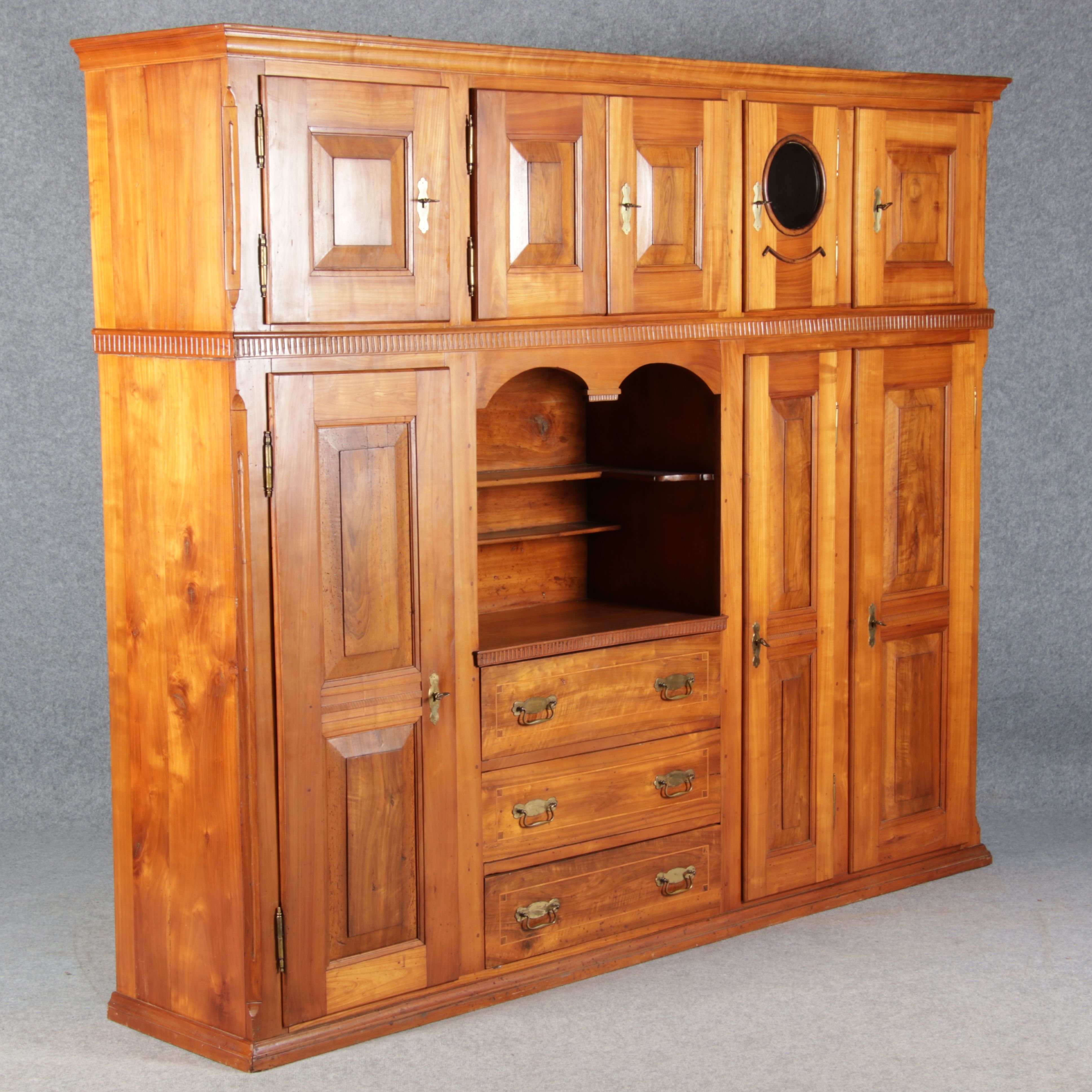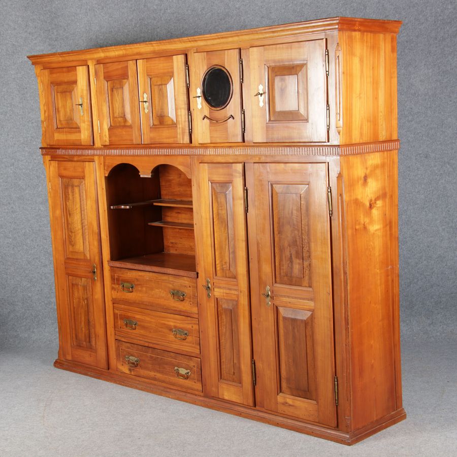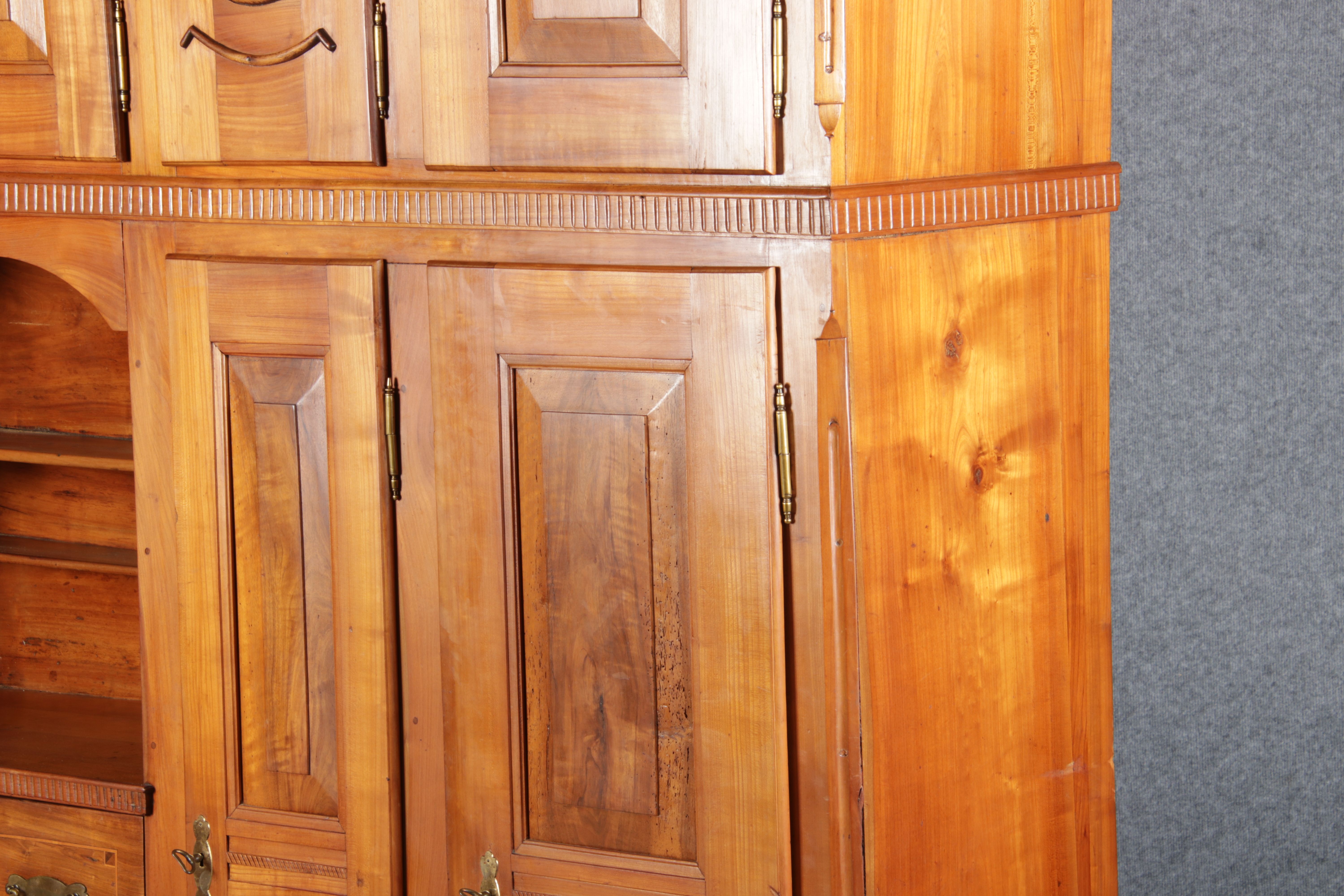 | antikes Große Louis Sieze Büffet Schrank ca. 230 cm breit um 1780, in Kirschbaum gefertigt. Im Oberteil befinden sich 5 Türen, wovon eine für eine Uhr war. Uhr ist leider nicht mehr vorhanden. Es kann aber eine passende Uhr dazu besorgt werden. Im Unterteil befinden sich drei Türen und drei Schubladen und eine offene Ablage. | ||||||||||||||||||||||||||||||||||||||||||||||||||||||||||||||||||
