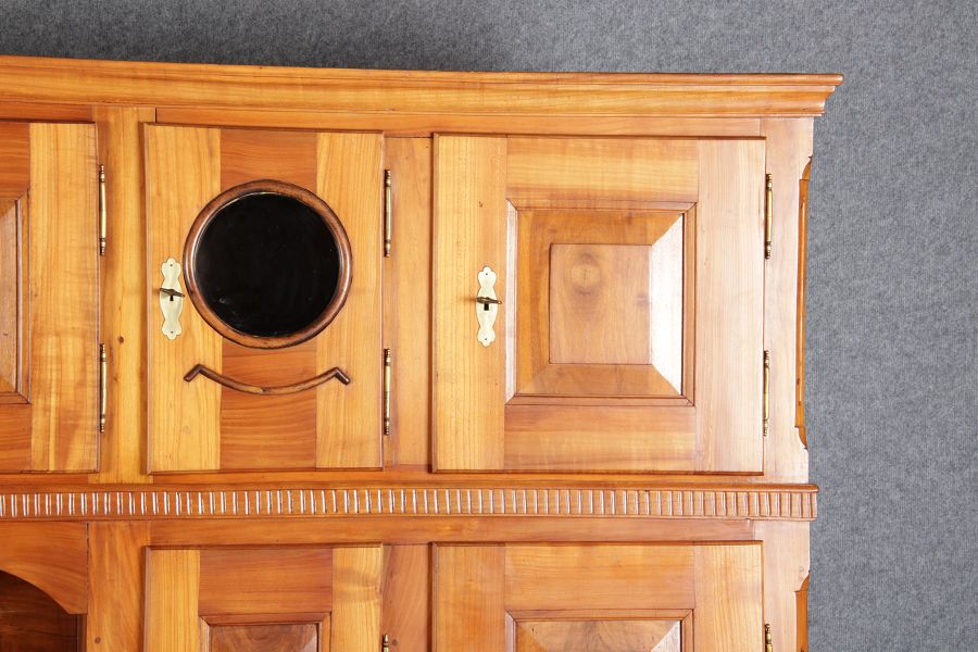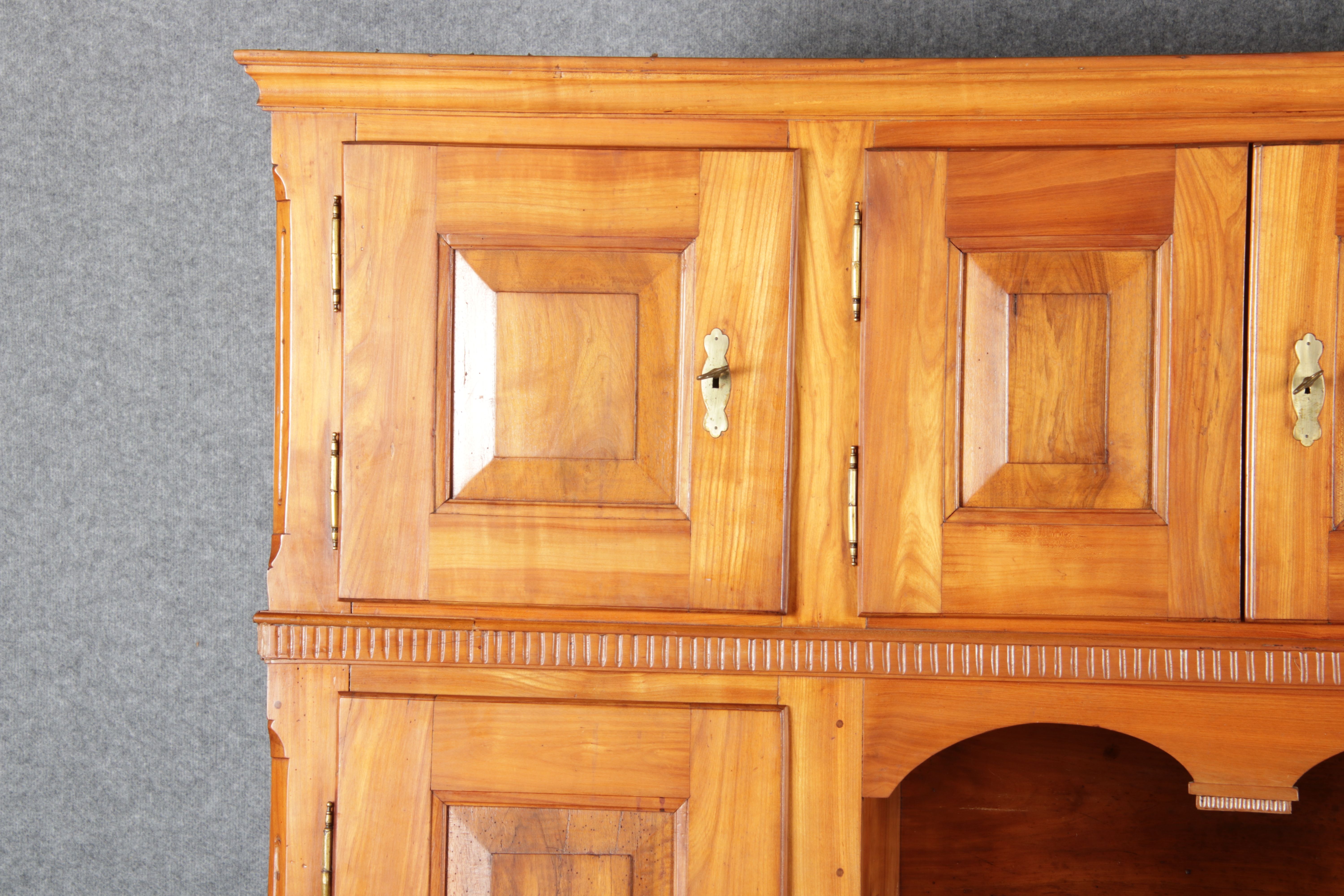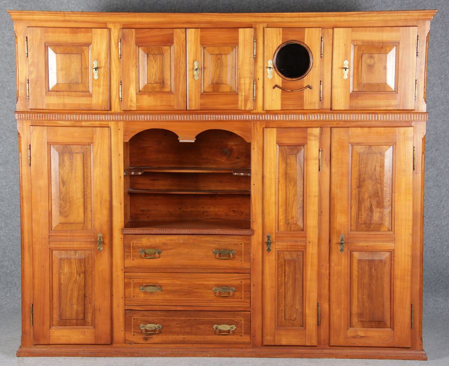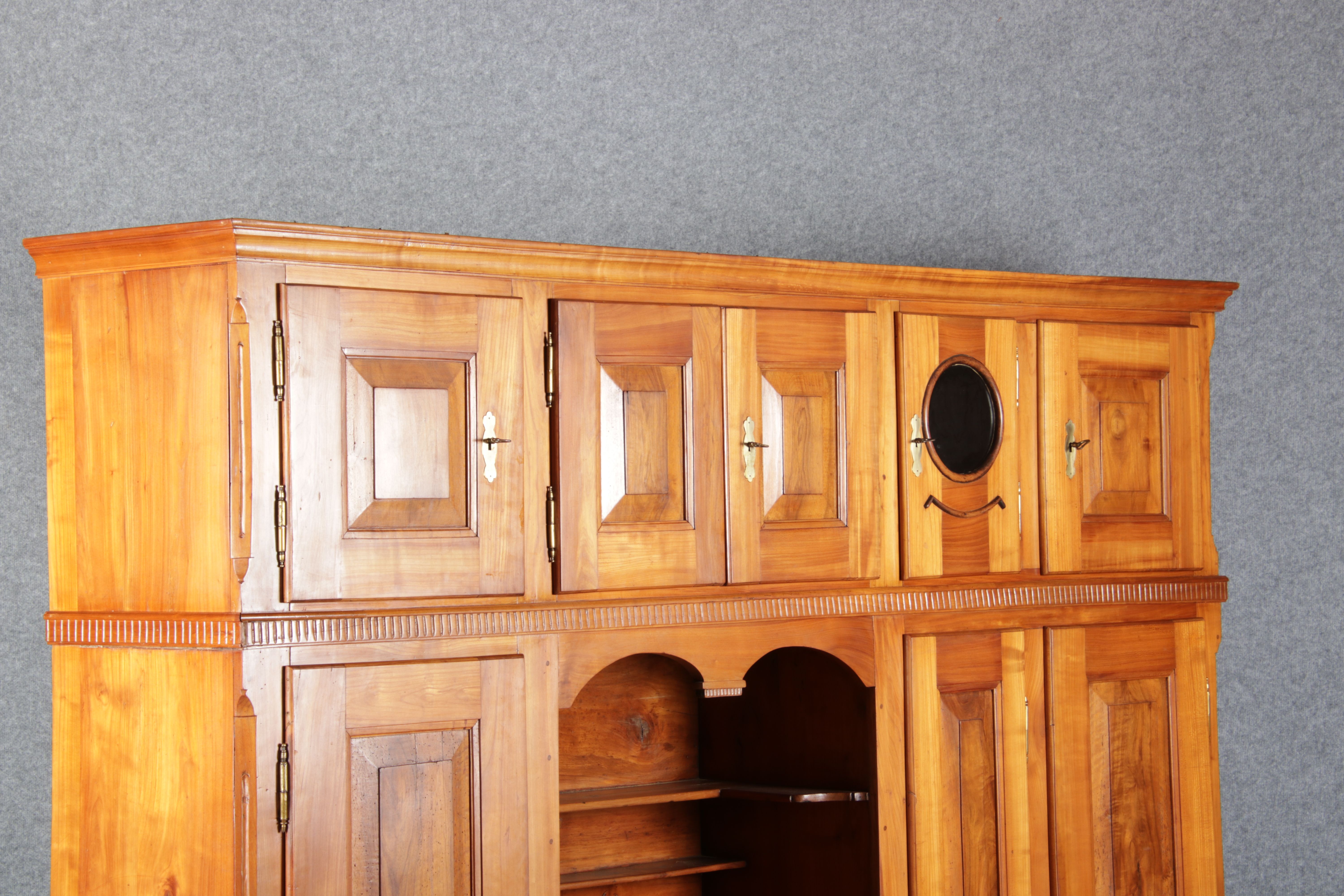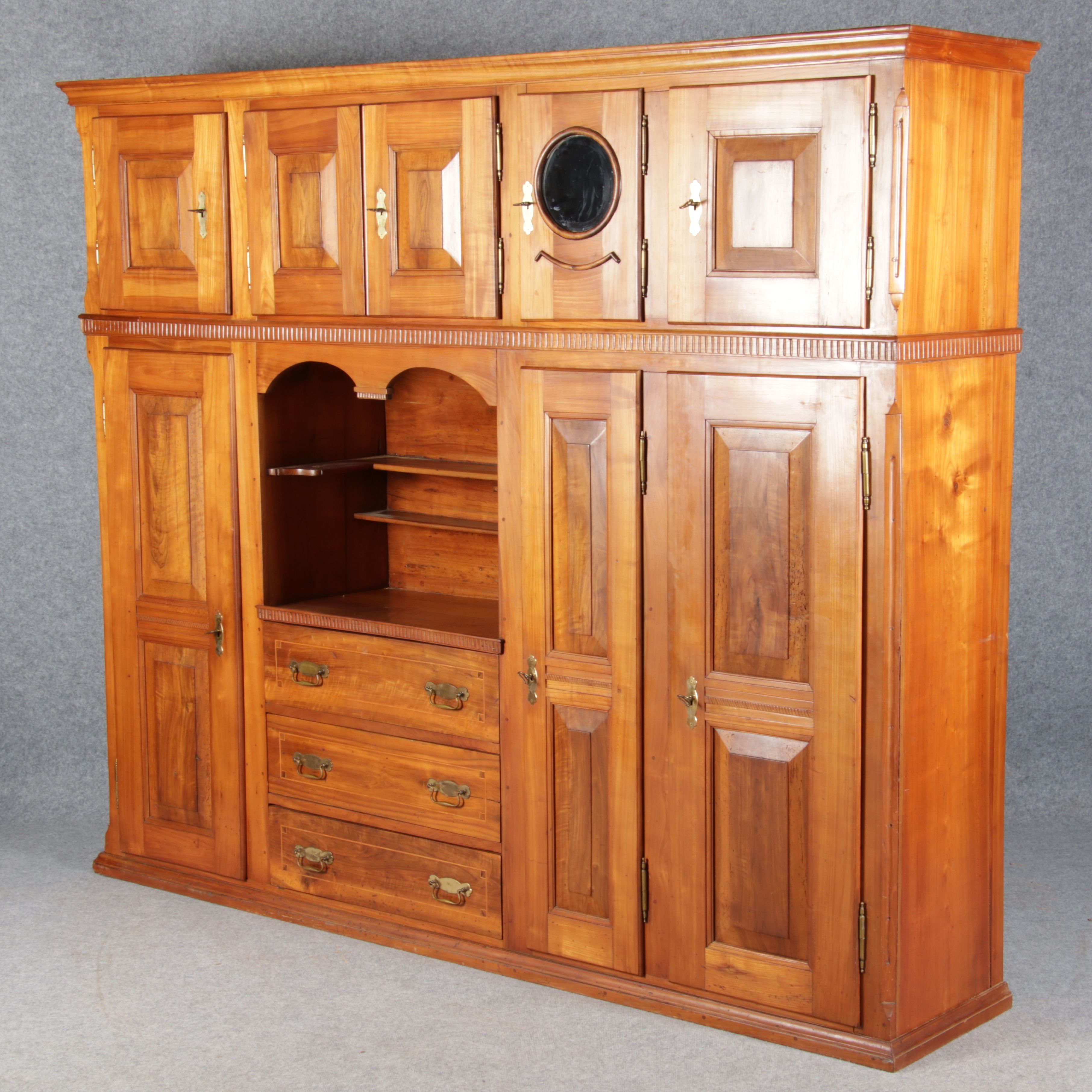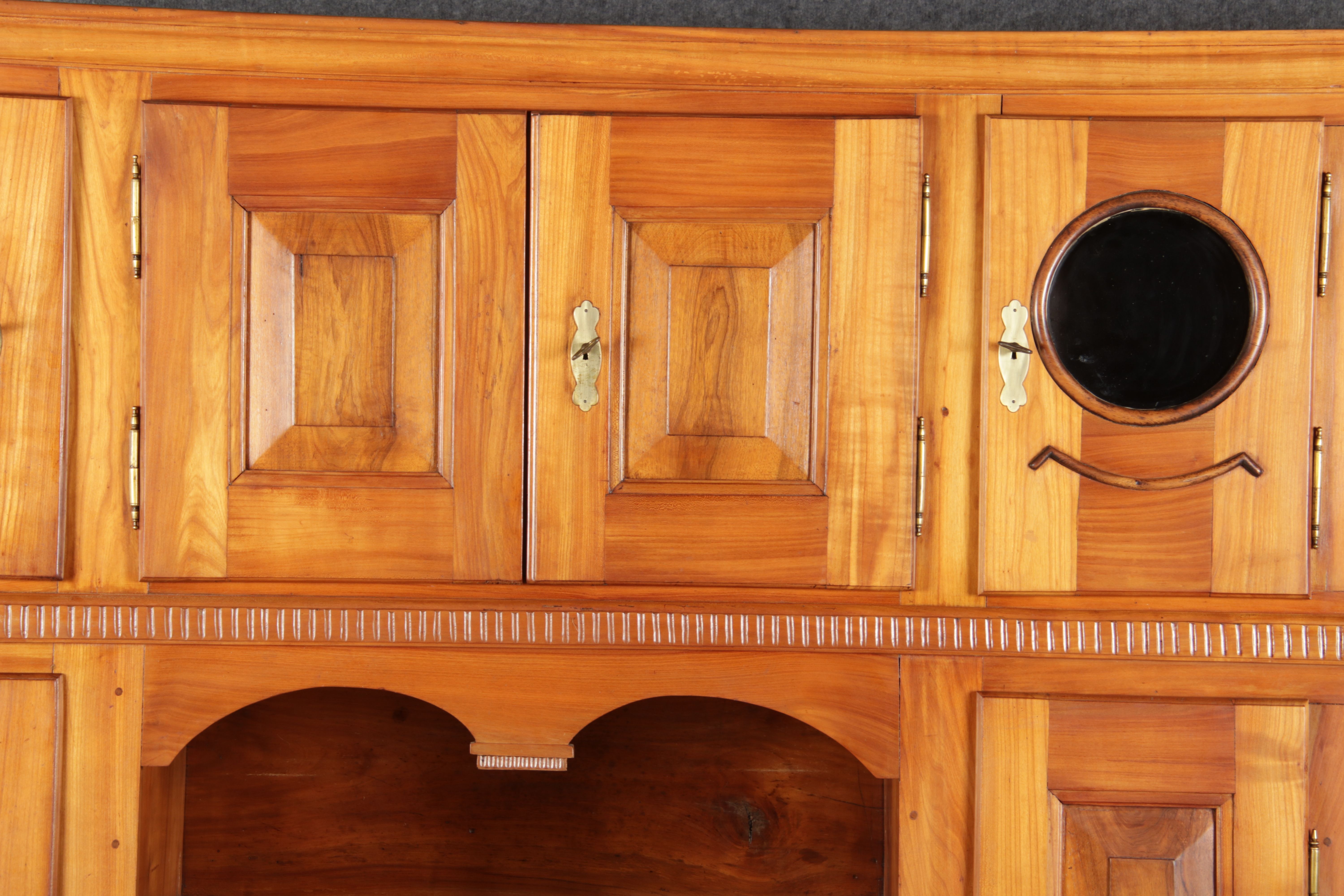 | antikes Große Louis Sieze Büffet Schrank ca. 230 cm breit um 1780, in Kirschbaum gefertigt. Im Oberteil befinden sich 5 Türen, wovon eine für eine Uhr war. Uhr ist leider nicht mehr vorhanden. Es kann aber eine passende Uhr dazu besorgt werden. Im Unterteil befinden sich drei Türen und drei Schubladen und eine offene Ablage. | ||||||||||||||||||||||||||||||||||||||||||||||||||||||||||||||||||
