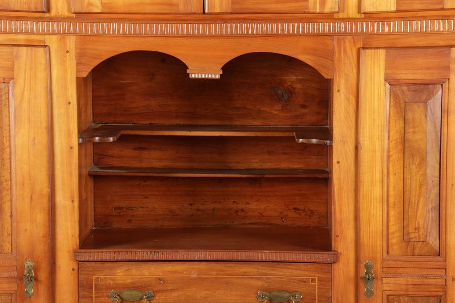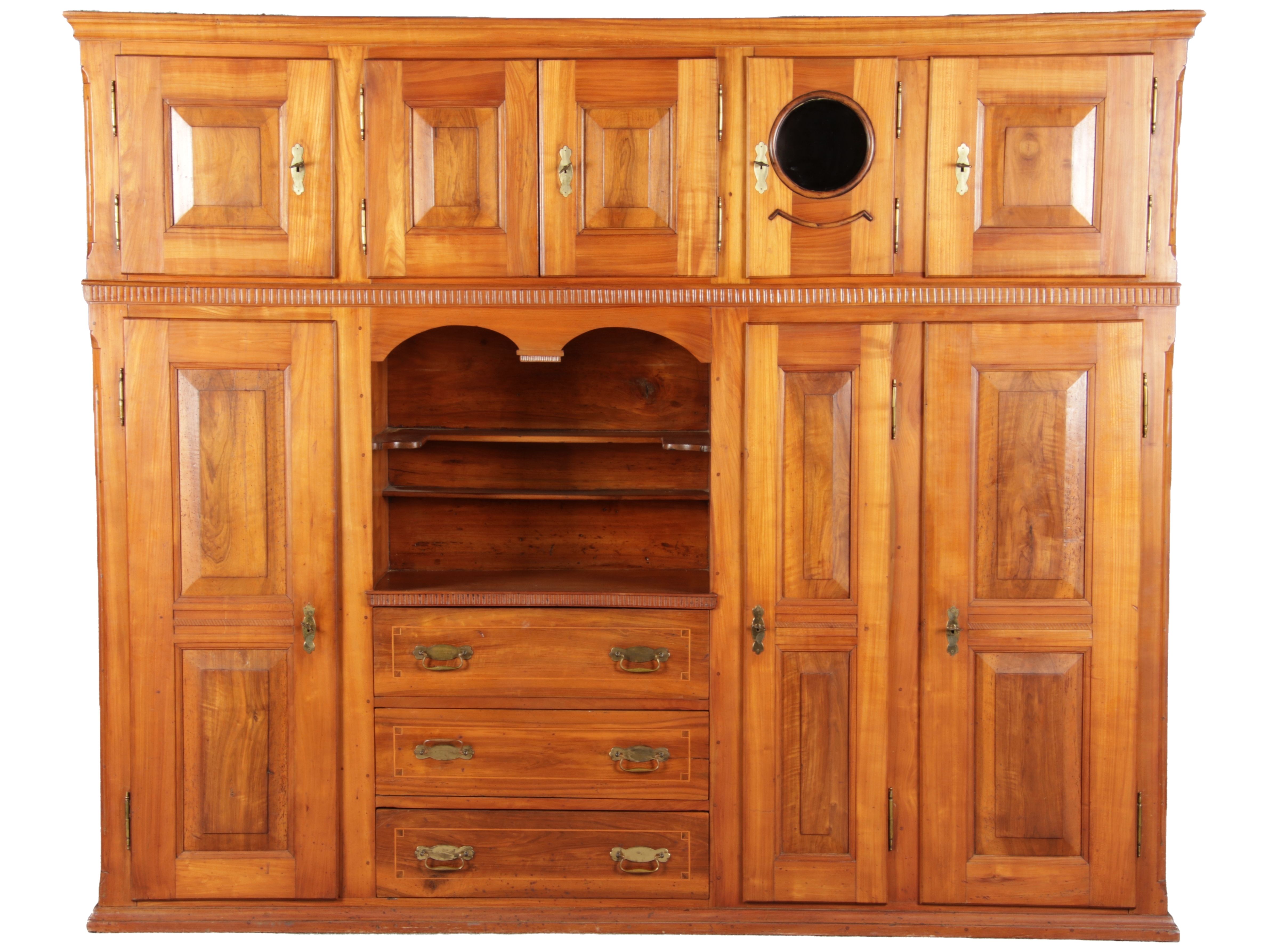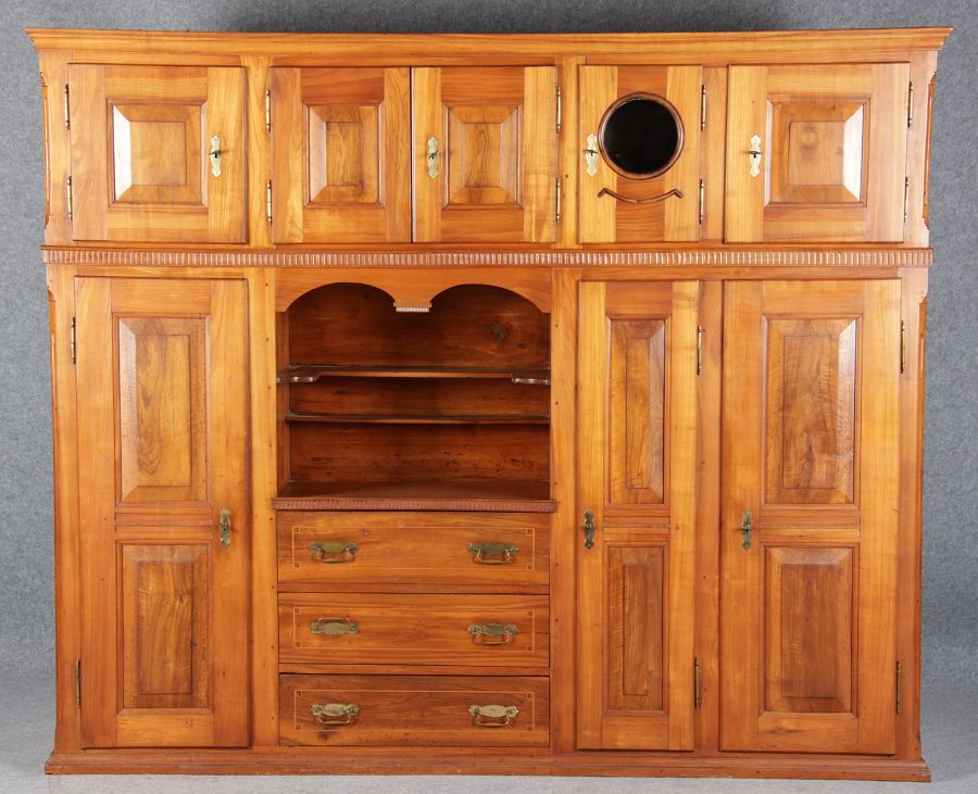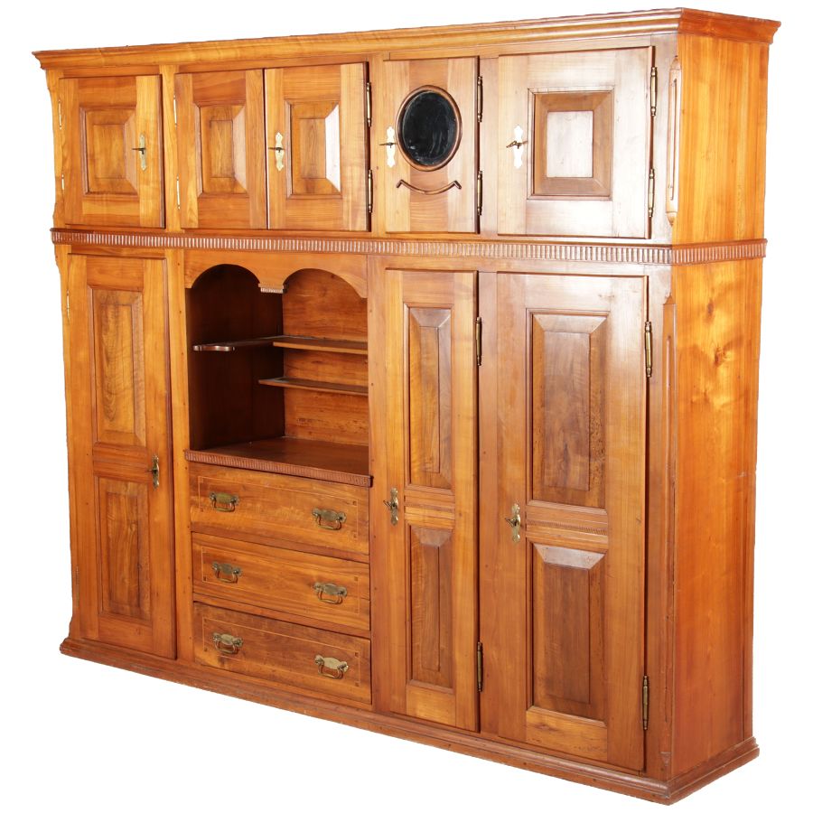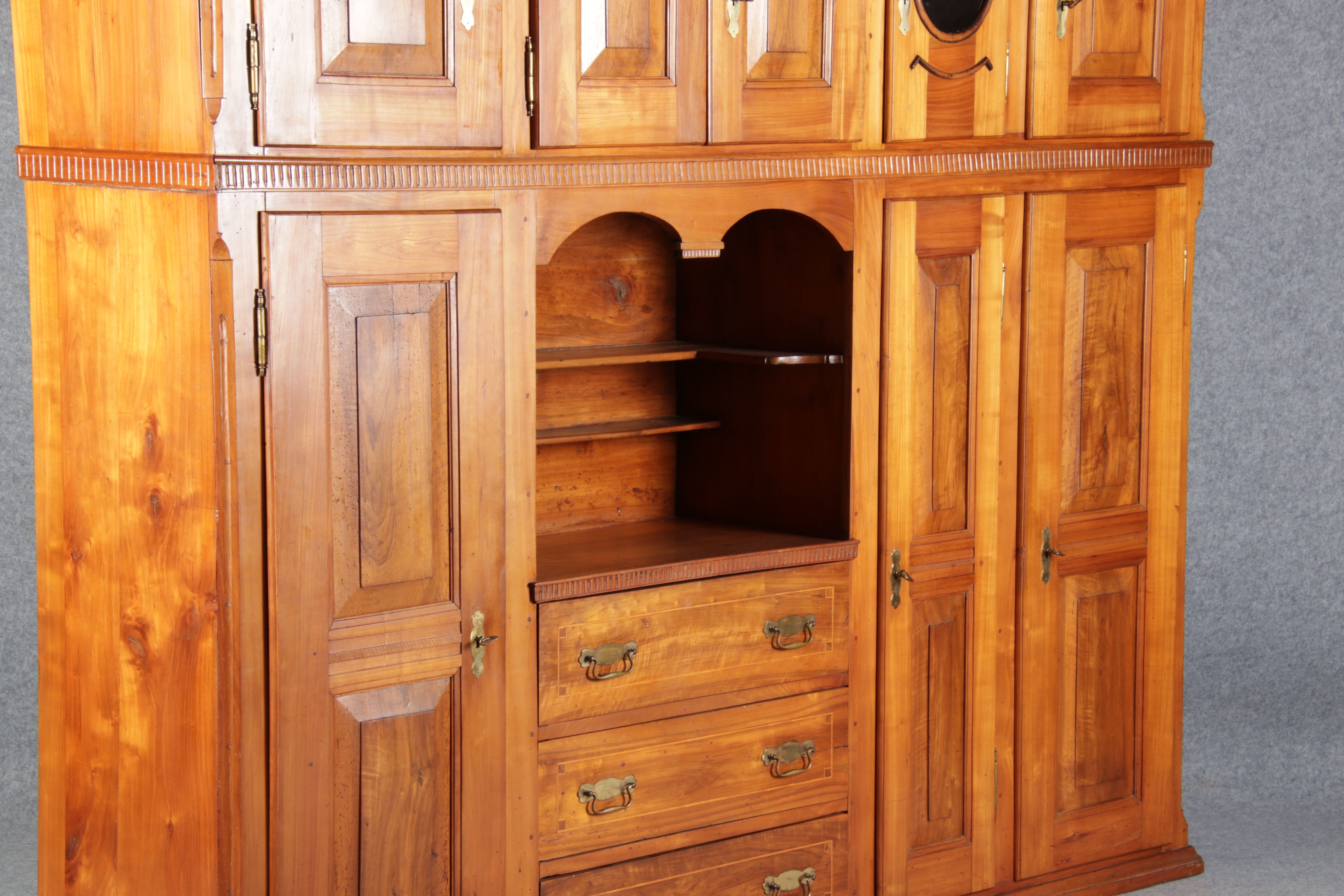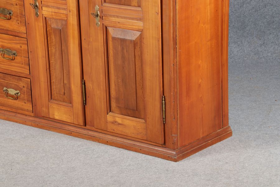 | antikes Große Louis Sieze Büffet Schrank ca. 230 cm breit um 1780, in Kirschbaum gefertigt. Im Oberteil befinden sich 5 Türen, wovon eine für eine Uhr war. Uhr ist leider nicht mehr vorhanden. Es kann aber eine passende Uhr dazu besorgt werden. Im Unterteil befinden sich drei Türen und drei Schubladen und eine offene Ablage. | ||||||||||||||||||||||||||||||||||||||||||||||||||||||||||||||||||