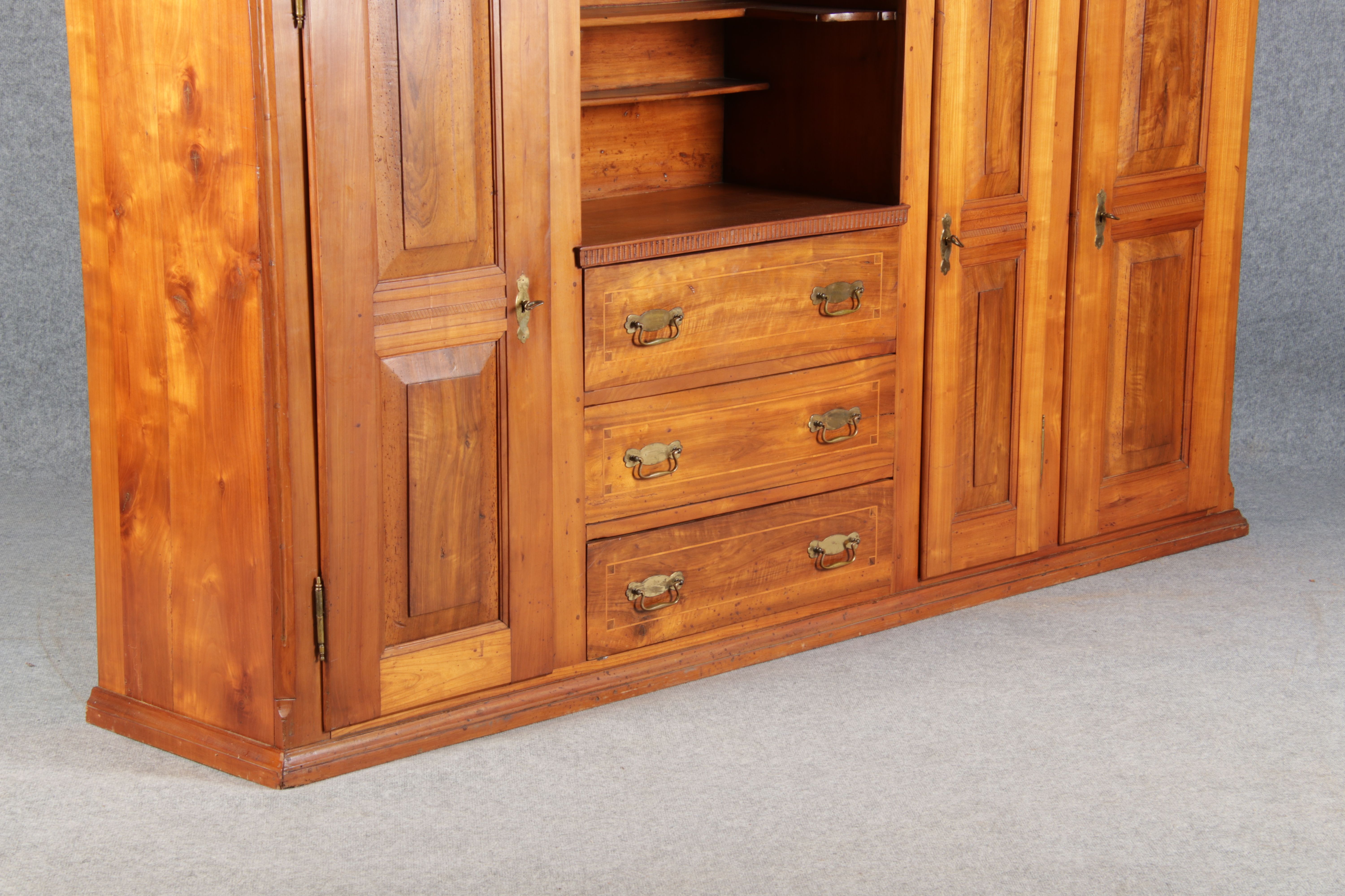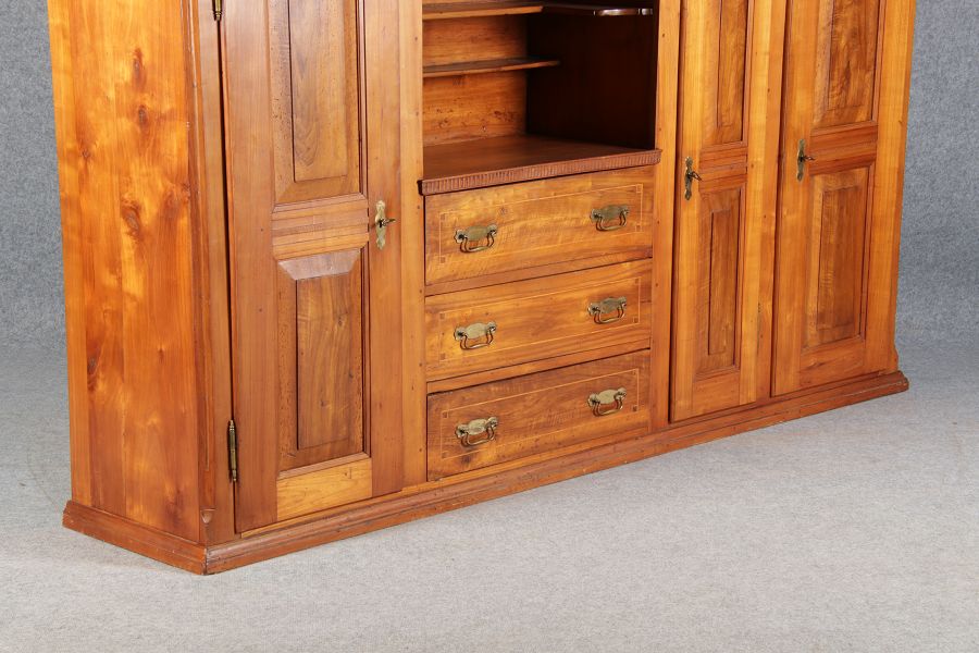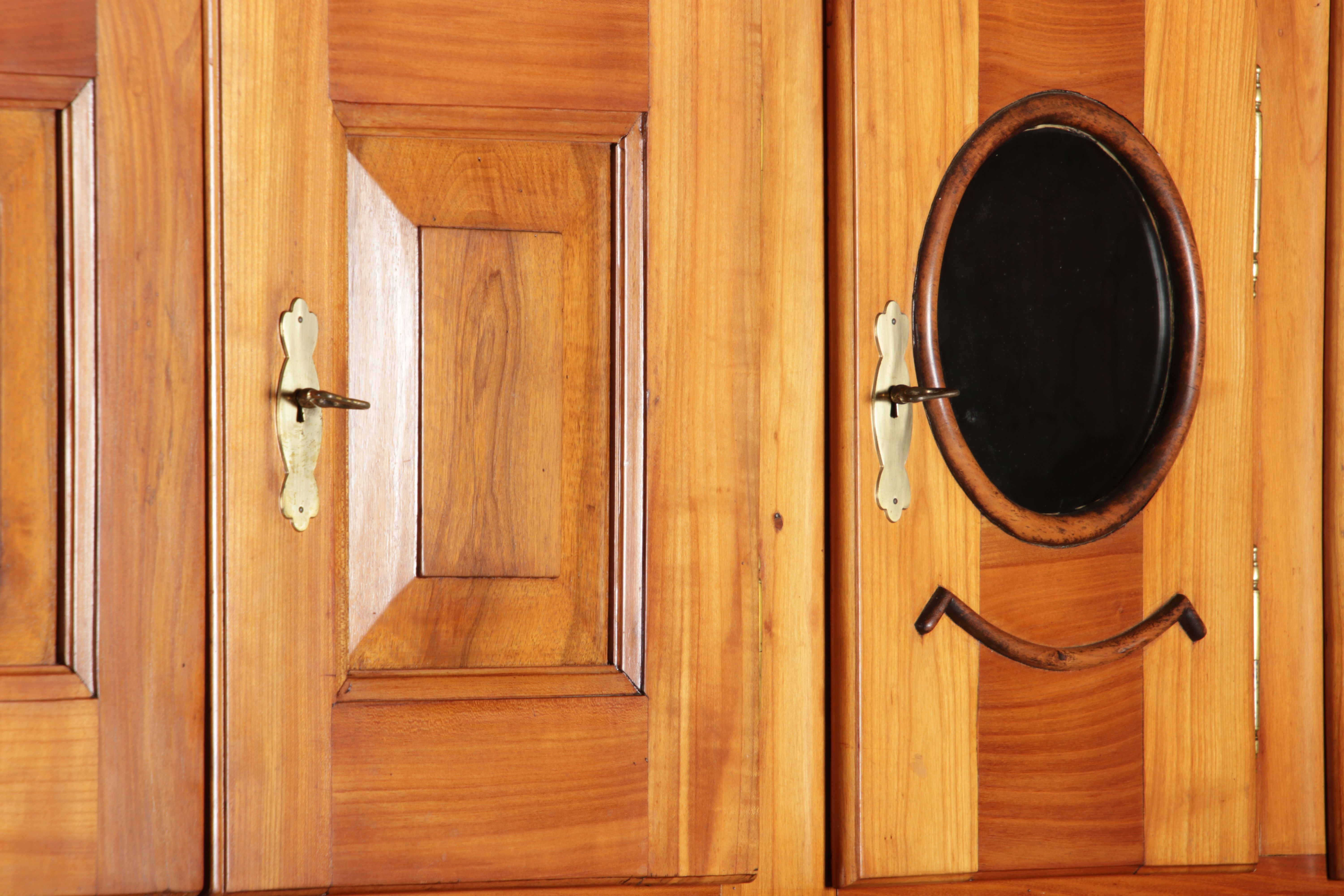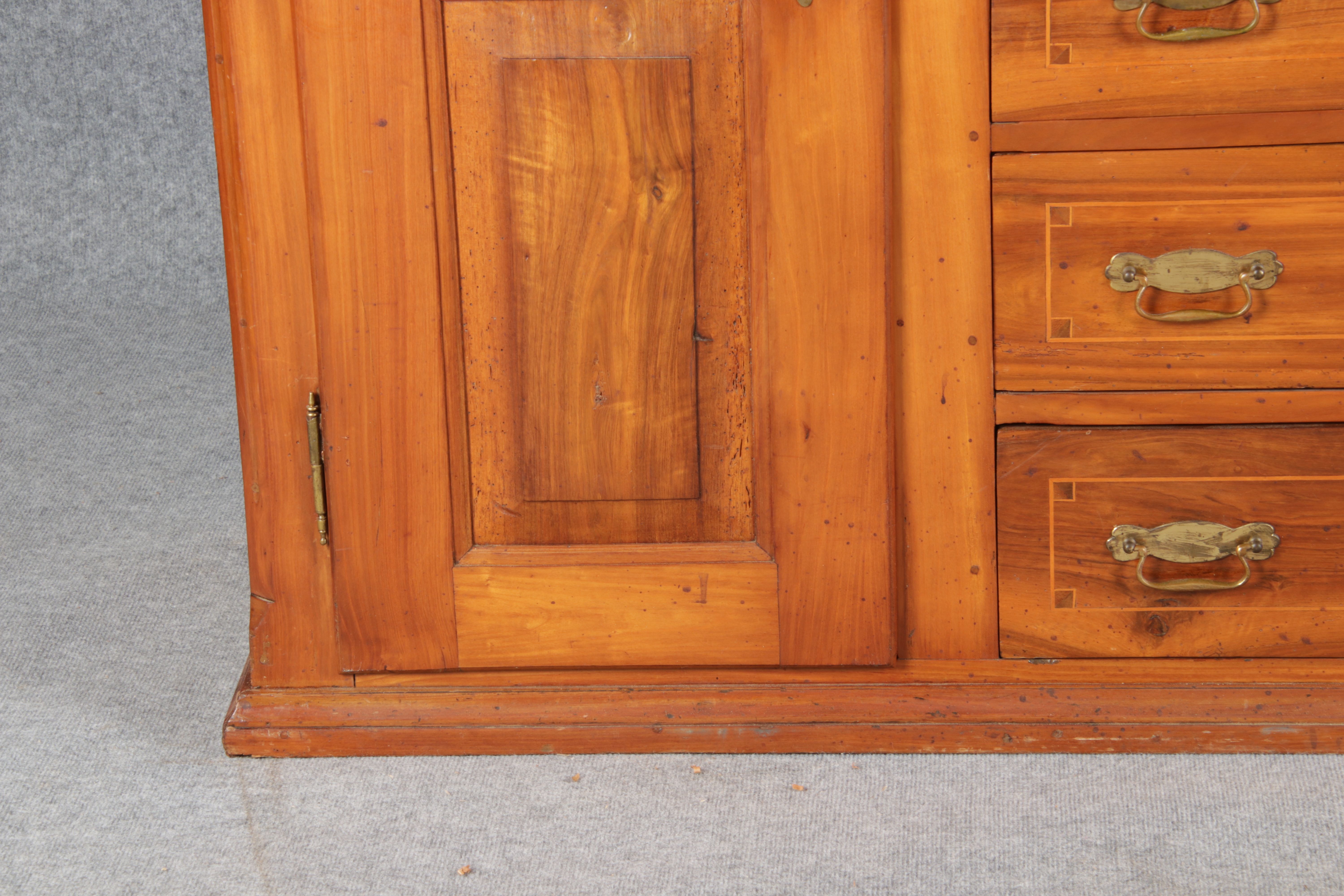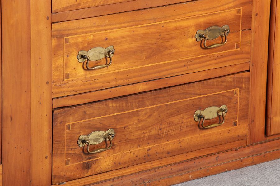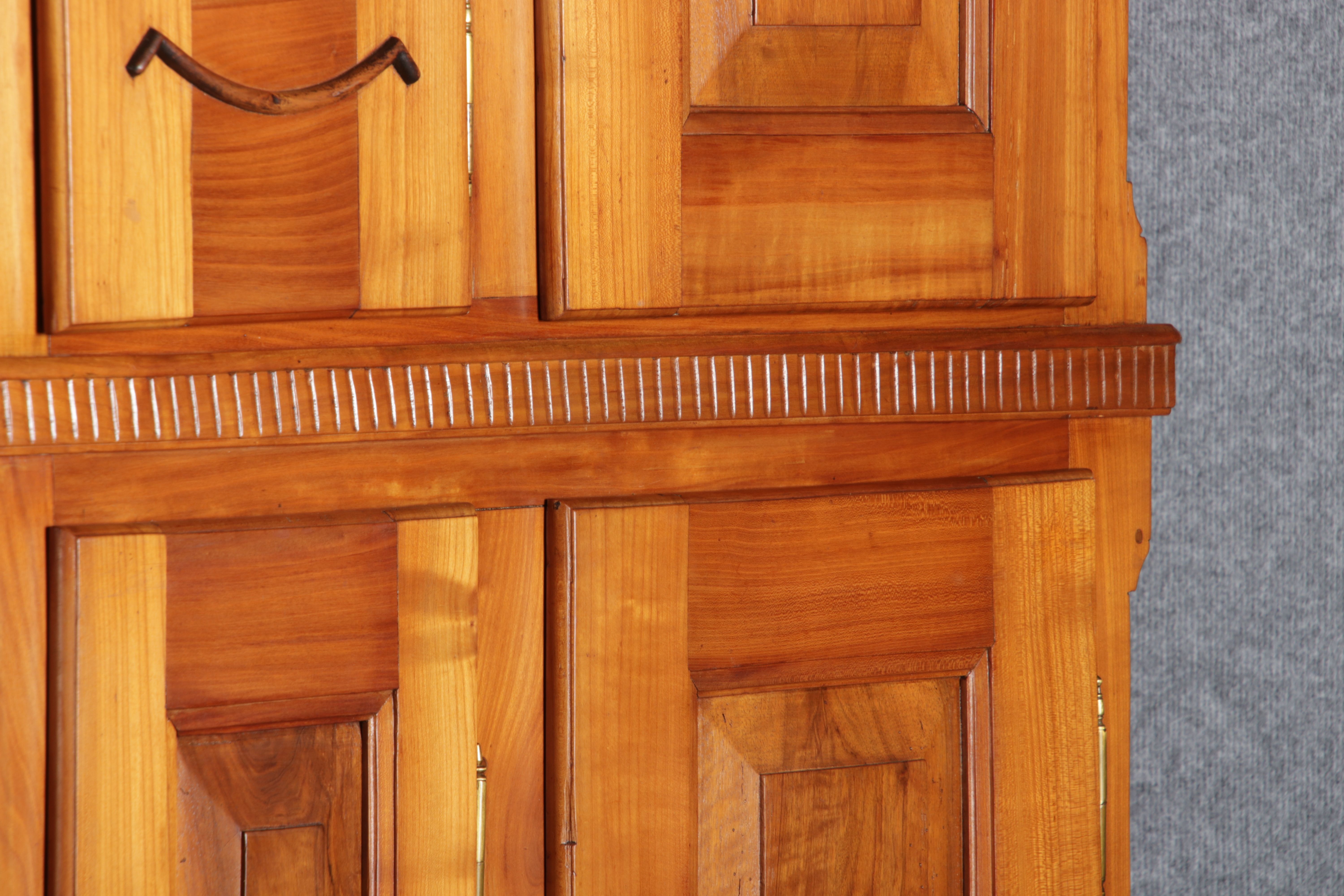 | antikes Große Louis Sieze Büffet Schrank ca. 230 cm breit um 1780, in Kirschbaum gefertigt. Im Oberteil befinden sich 5 Türen, wovon eine für eine Uhr war. Uhr ist leider nicht mehr vorhanden. Es kann aber eine passende Uhr dazu besorgt werden. Im Unterteil befinden sich drei Türen und drei Schubladen und eine offene Ablage. | ||||||||||||||||||||||||||||||||||||||||||||||||||||||||||||||||||