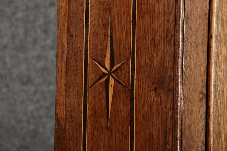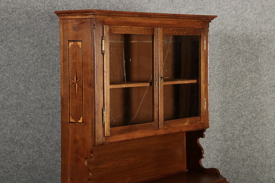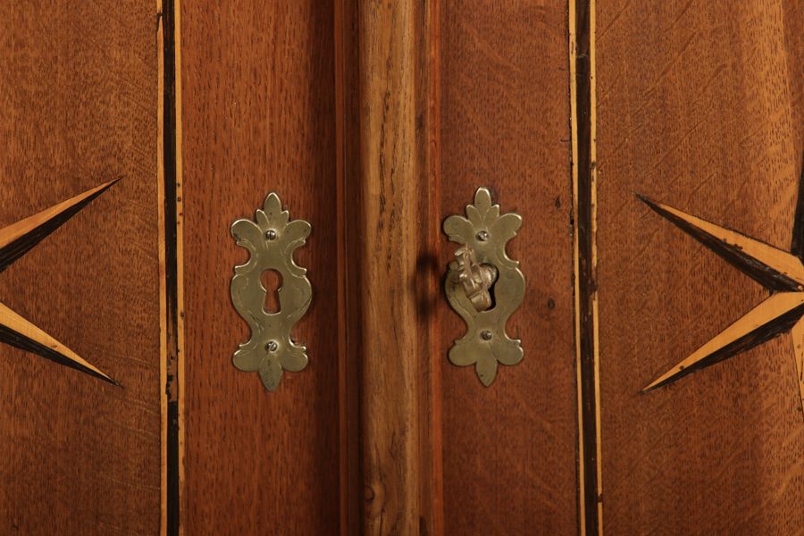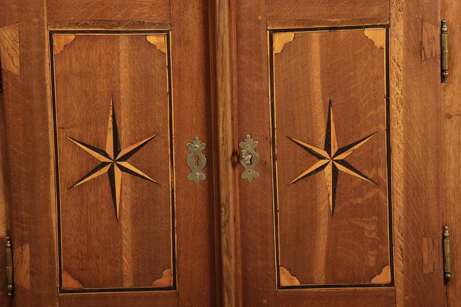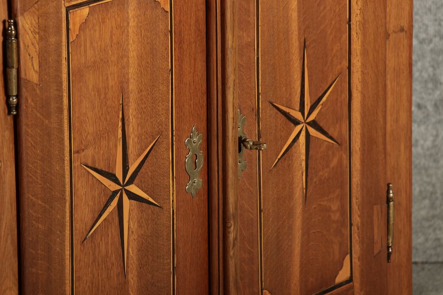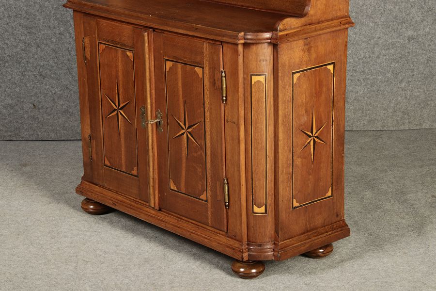 Dieser antike Buffet-Schrank aus massivem Holz kombiniert klassischen Stauraum mit edlen Verzierungen. Die schlichte Eleganz der verglasten oberen Schranktüren wird durch die kunstvollen Intarsien auf den unteren Türen kontrastiert, die einen stilvollen Stern als zentrales Motiv zeigen. Das Möbelstück stammt vermutlich aus der zweiten Hälfte des 18. Jahrhunderts und bietet sowohl praktischen Stauraum als auch dekorative Elemente. Der Schrank ist zweiteilig aufgebaut. Im oberen Teil befinden sich zwei Glastüren, hinter denen sich ein Regal befindet, das ideal zur Präsentation von Geschirr oder Dekorationsobjekten geeignet ist. Der untere Teil bietet zwei Türen mit großzügigem Stauraum. Die kunstvollen Intarsien mit Sternmotiv verleihen dem Möbelstück einen besonderen Akzent. Auf den unteren Türen sind kunstvolle Intarsien in Form eines Sterns zu finden, die das Design besonders hervorheben. Die Scharniere und Griffe aus Metall unterstreichen den antiken Charakter. Dieser Schrank eignet sich hervorragend als dekoratives und praktisches Möbelstück in Esszimmern, Wohnräumen oder Fluren. Die Glastüren ermöglichen eine ansprechende Präsentation von besonderen Sammlerstücken oder Geschirr, während die unteren Fächer zusätzlichen Stauraum bieten. |