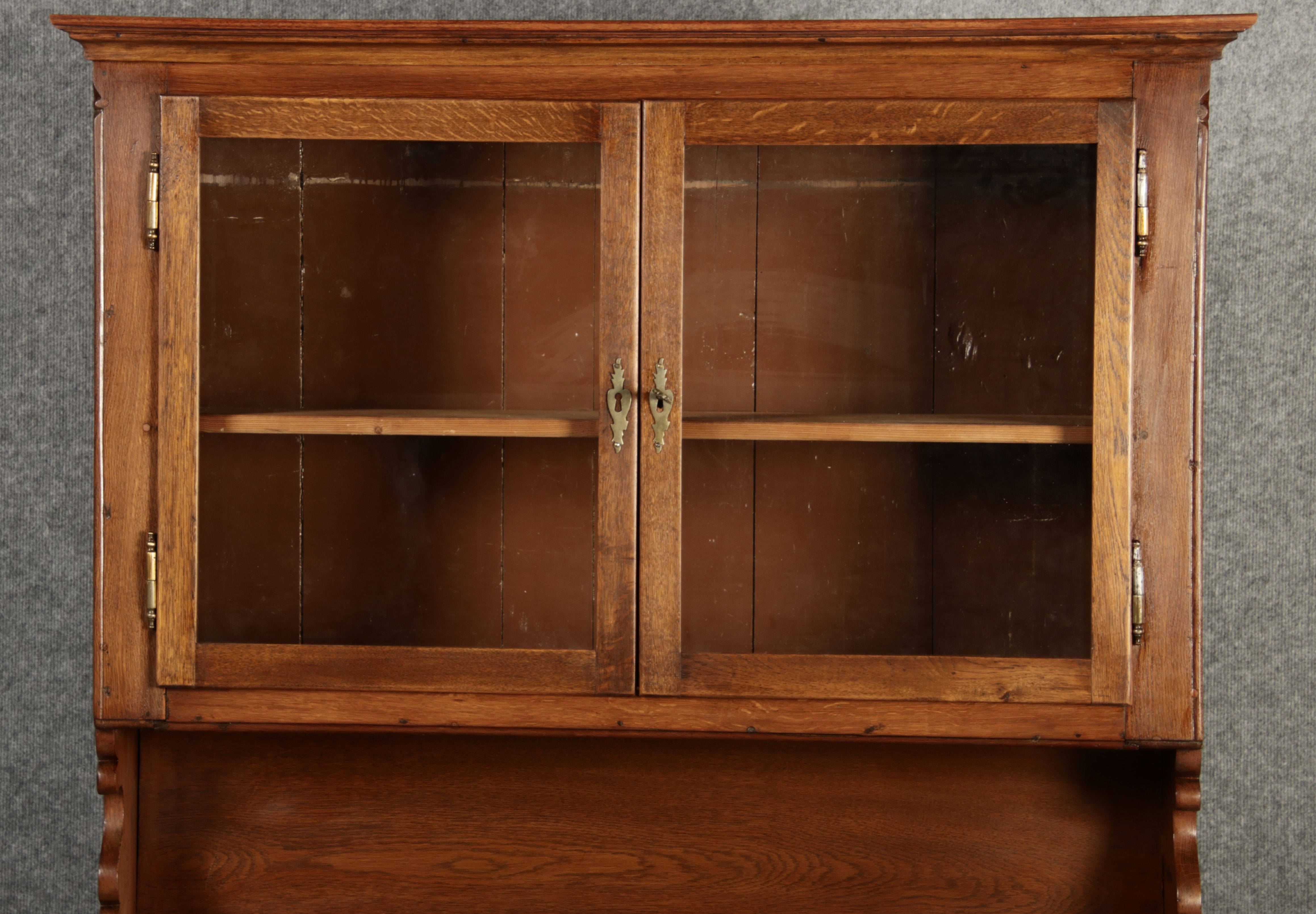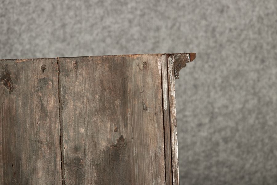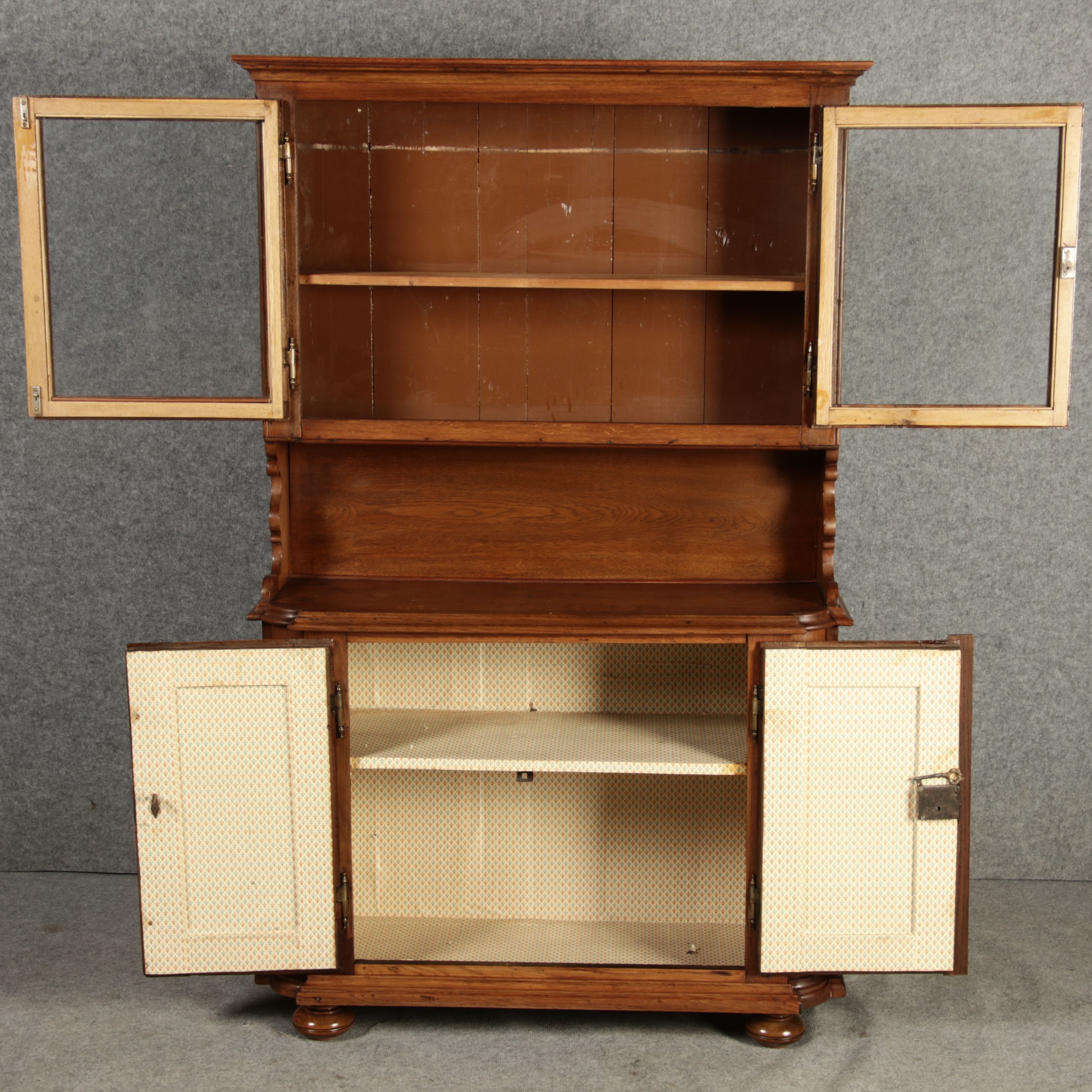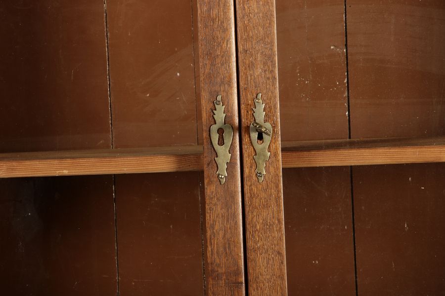Dieser antike Buffet-Schrank aus massivem Holz kombiniert klassischen Stauraum mit edlen Verzierungen. Die schlichte Eleganz der verglasten oberen Schranktüren wird durch die kunstvollen Intarsien auf den unteren Türen kontrastiert, die einen stilvollen Stern als zentrales Motiv zeigen. Das Möbelstück stammt vermutlich aus der zweiten Hälfte des 18. Jahrhunderts und bietet sowohl praktischen Stauraum als auch dekorative Elemente. Der Schrank ist zweiteilig aufgebaut. Im oberen Teil befinden sich zwei Glastüren, hinter denen sich ein Regal befindet, das ideal zur Präsentation von Geschirr oder Dekorationsobjekten geeignet ist. Der untere Teil bietet zwei Türen mit großzügigem Stauraum. Die kunstvollen Intarsien mit Sternmotiv verleihen dem Möbelstück einen besonderen Akzent. Auf den unteren Türen sind kunstvolle Intarsien in Form eines Sterns zu finden, die das Design besonders hervorheben. Die Scharniere und Griffe aus Metall unterstreichen den antiken Charakter. Dieser Schrank eignet sich hervorragend als dekoratives und praktisches Möbelstück in Esszimmern, Wohnräumen oder Fluren. Die Glastüren ermöglichen eine ansprechende Präsentation von besonderen Sammlerstücken oder Geschirr, während die unteren Fächer zusätzlichen Stauraum bieten. |