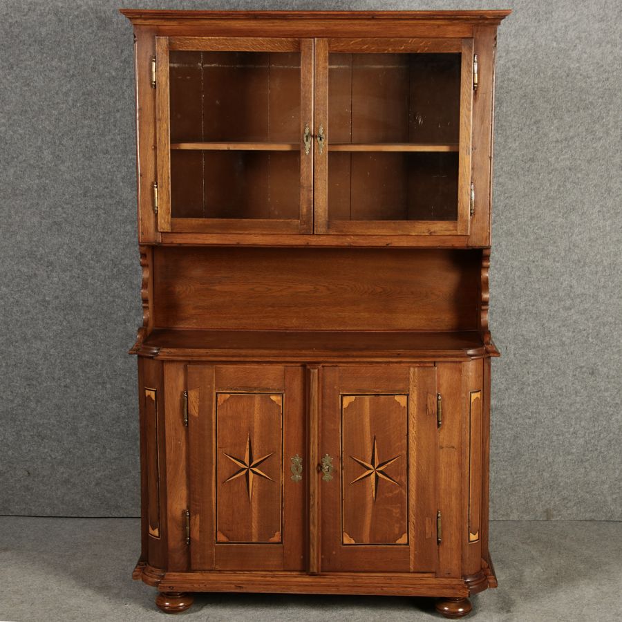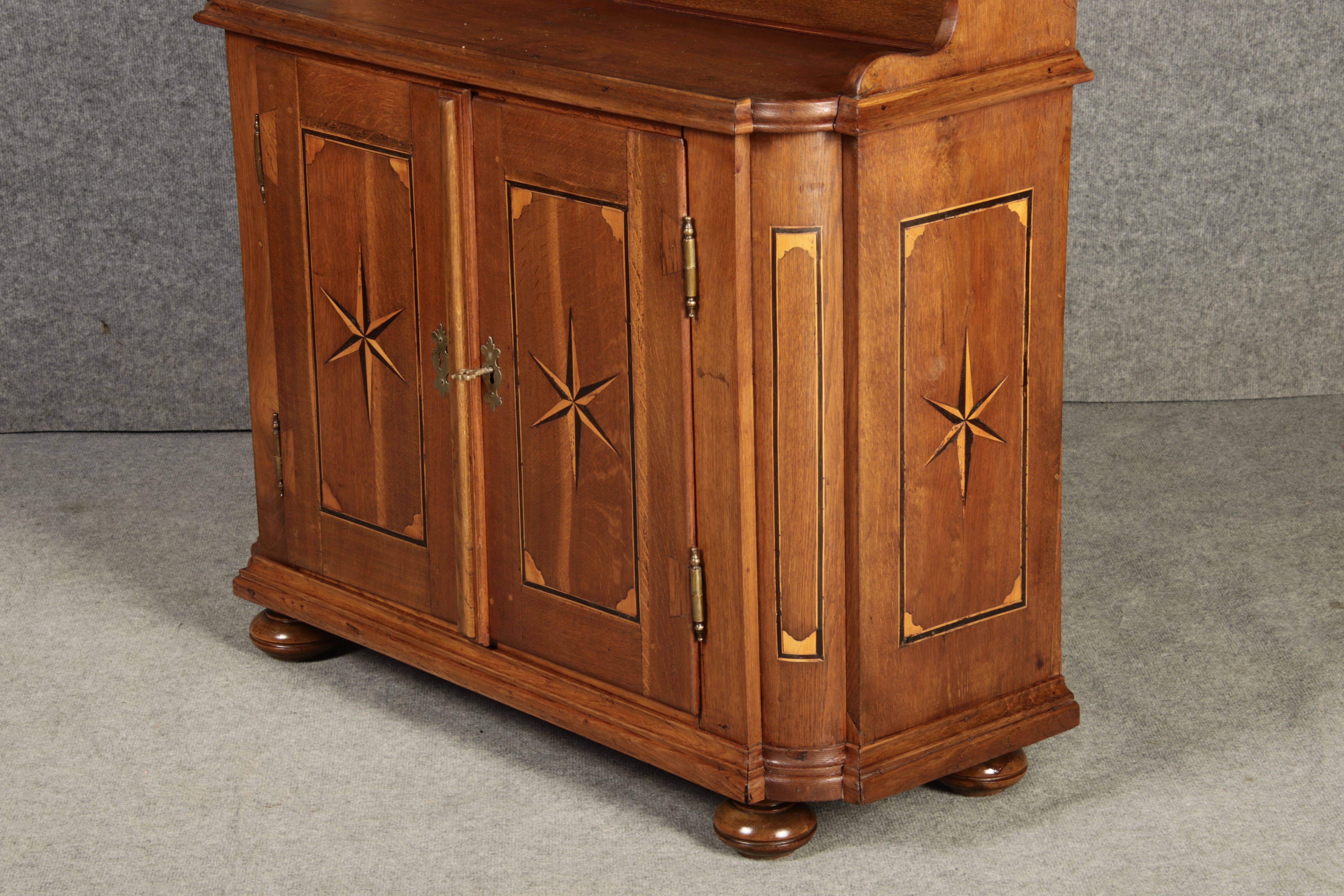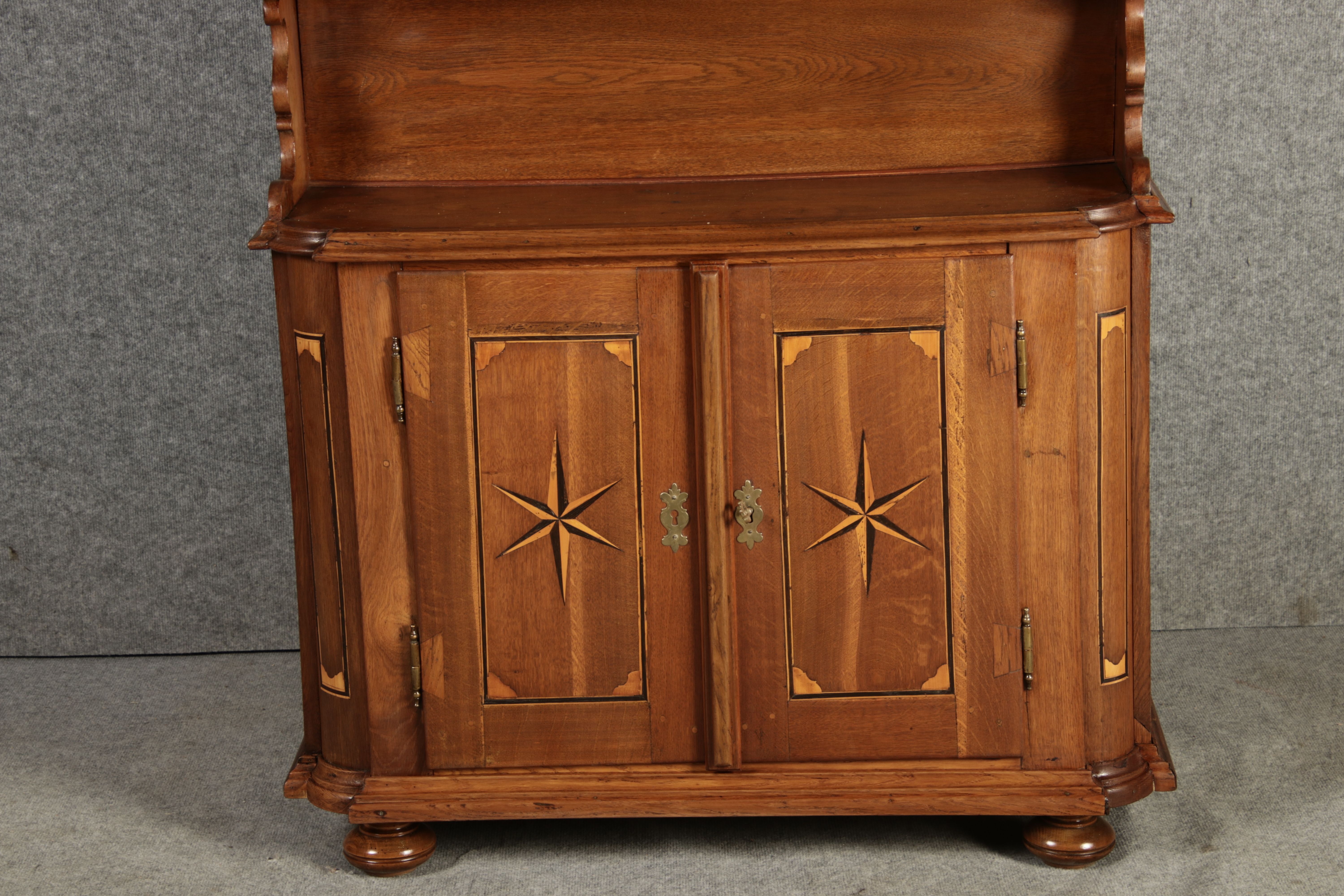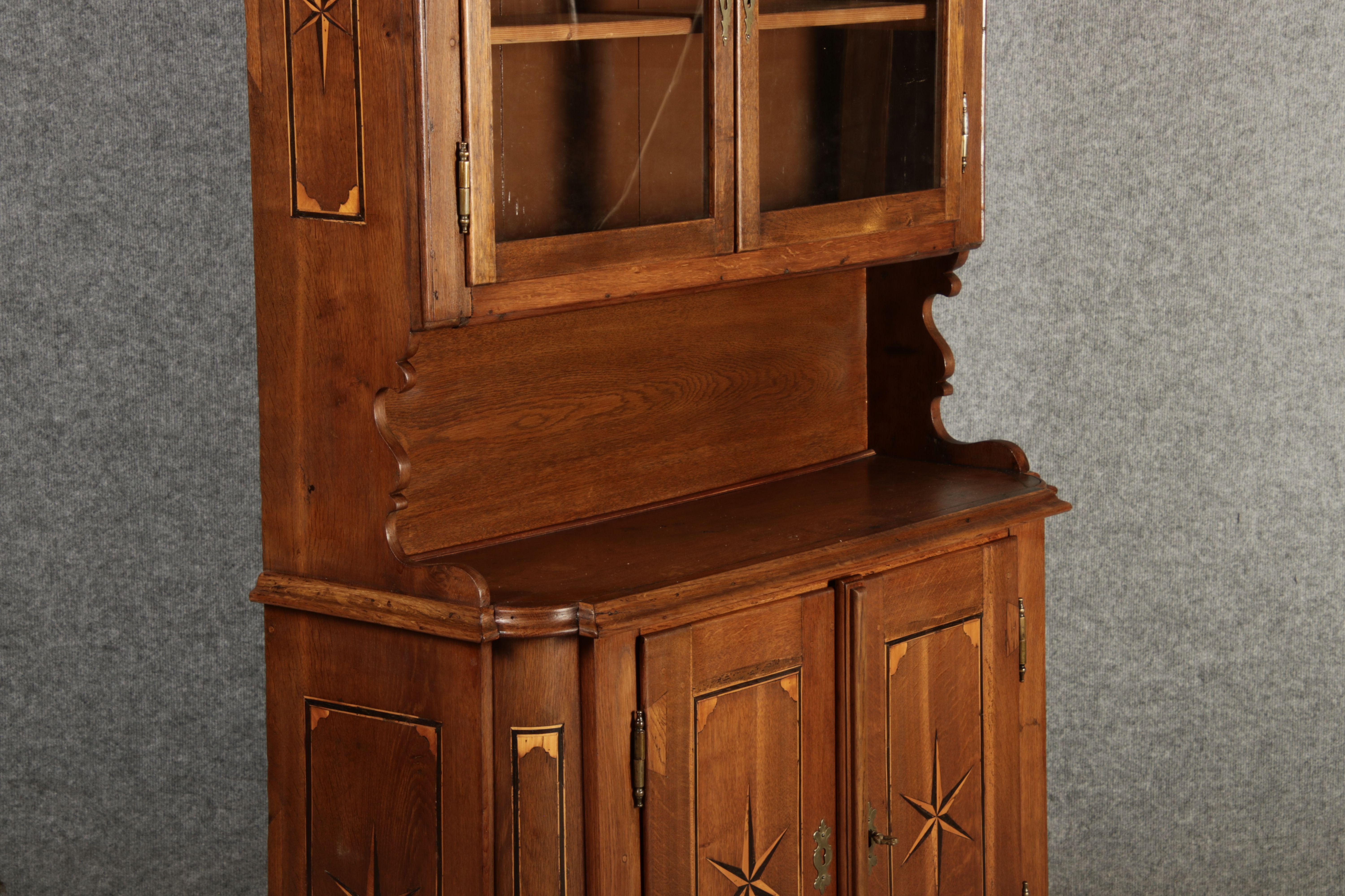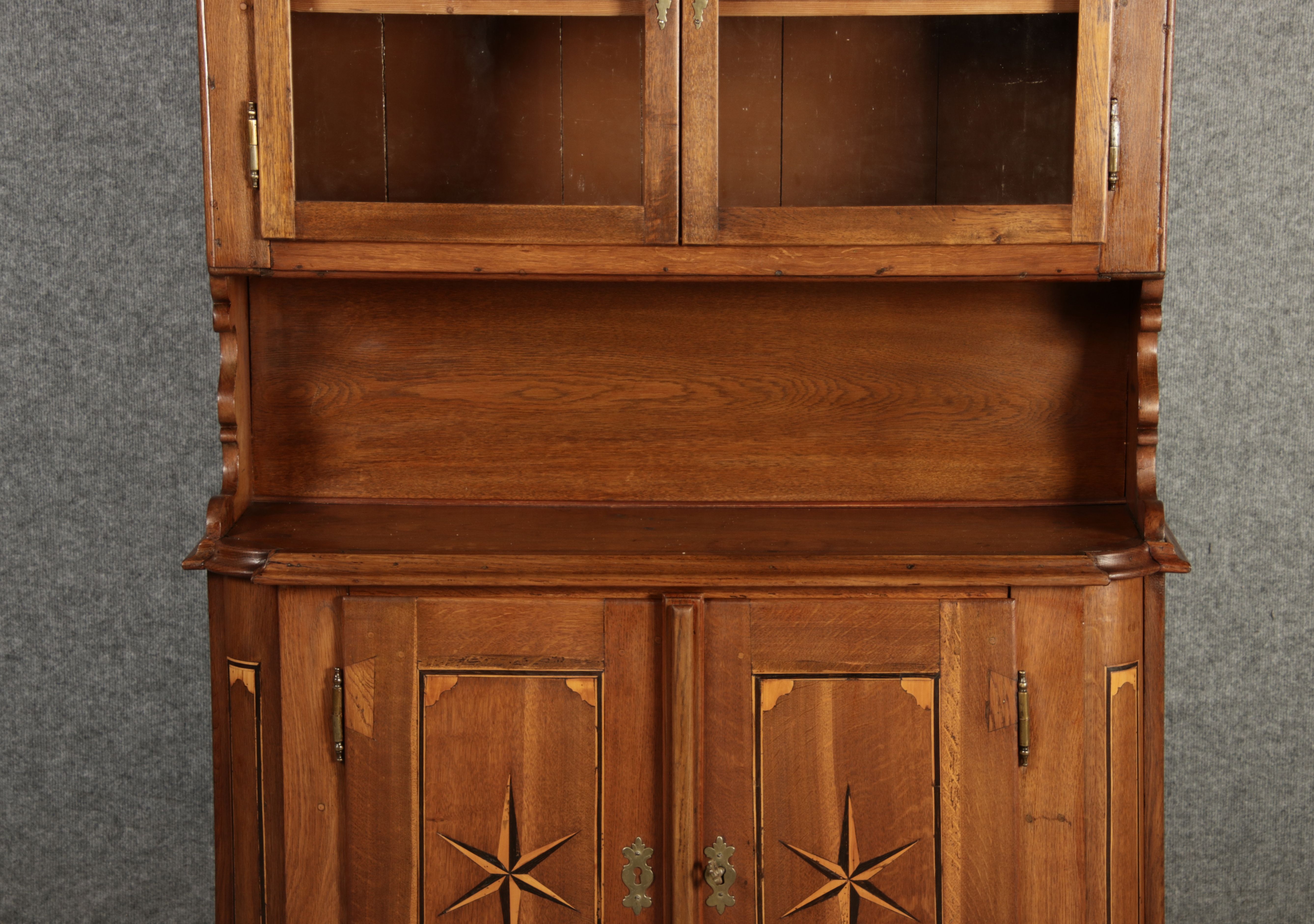 Kleiner Antiker Buffet-Schrank mit Glastüren und Intarsien (18. Jahrhundert) Dieser antike Buffet-Schrank aus massivem Holz kombiniert klassischen Stauraum mit edlen Verzierungen. Die schlichte Eleganz der verglasten oberen Schranktüren wird durch die kunstvollen Intarsien auf den unteren Türen kontrastiert, die einen stilvollen Stern als zentrales Motiv zeigen. Das Möbelstück stammt vermutlich aus der zweiten Hälfte des 18. Jahrhunderts und bietet sowohl praktischen Stauraum als auch dekorative Elemente. Der Schrank ist zweiteilig aufgebaut. Im oberen Teil befinden sich zwei Glastüren, hinter denen sich ein Regal befindet, das ideal zur Präsentation von Geschirr oder Dekorationsobjekten geeignet ist. Der untere Teil bietet zwei Türen mit großzügigem Stauraum. Die kunstvollen Intarsien mit Sternmotiv verleihen dem Möbelstück einen besonderen Akzent. Auf den unteren Türen sind kunstvolle Intarsien in Form eines Sterns zu finden, die das Design besonders hervorheben. Die Scharniere und Griffe aus Metall unterstreichen den antiken Charakter. Dieser Schrank eignet sich hervorragend als dekoratives und praktisches Möbelstück in Esszimmern, Wohnräumen oder Fluren. Die Glastüren ermöglichen eine ansprechende Präsentation von besonderen Sammlerstücken oder Geschirr, während die unteren Fächer zusätzlichen Stauraum bieten.ArtikelNummer /number: buf114