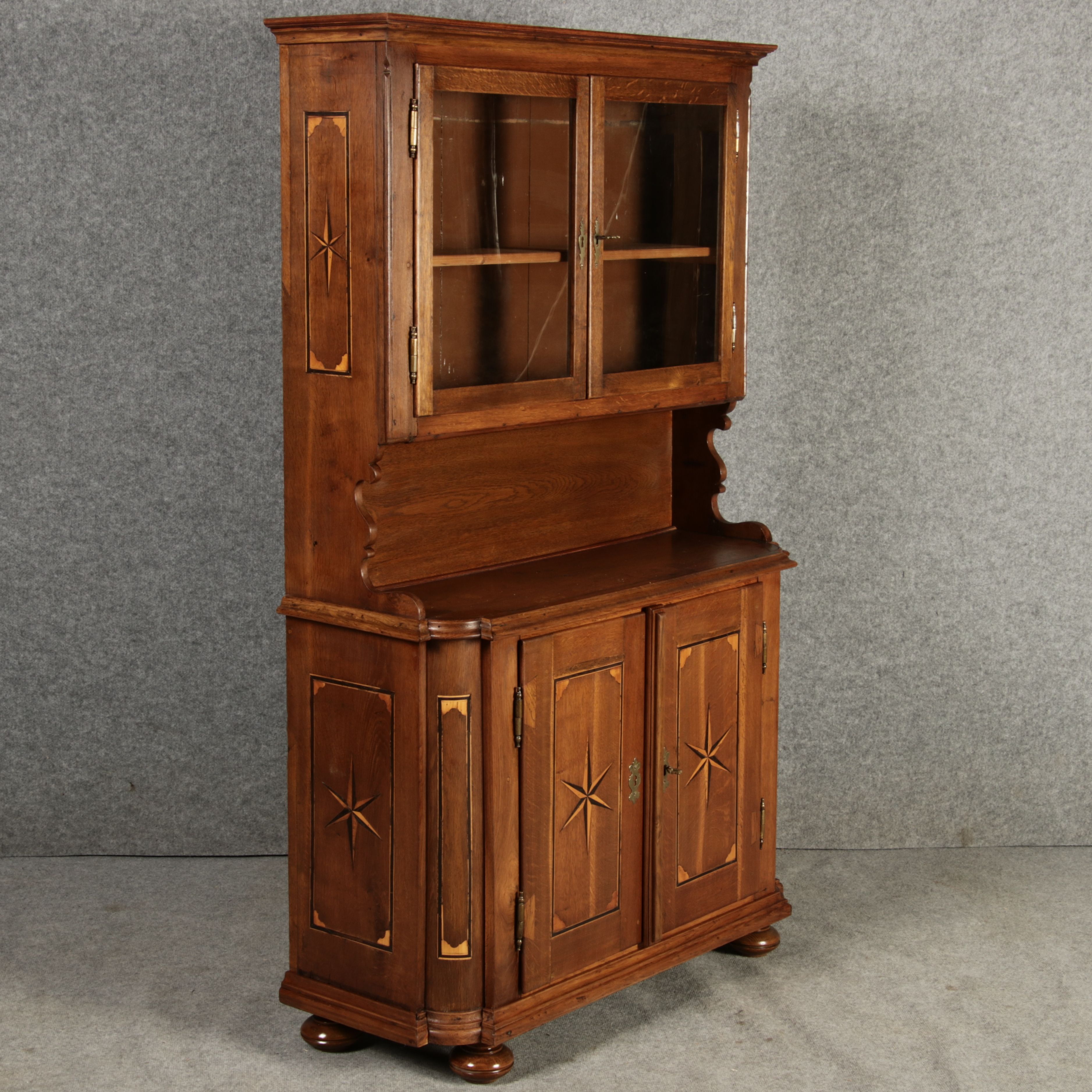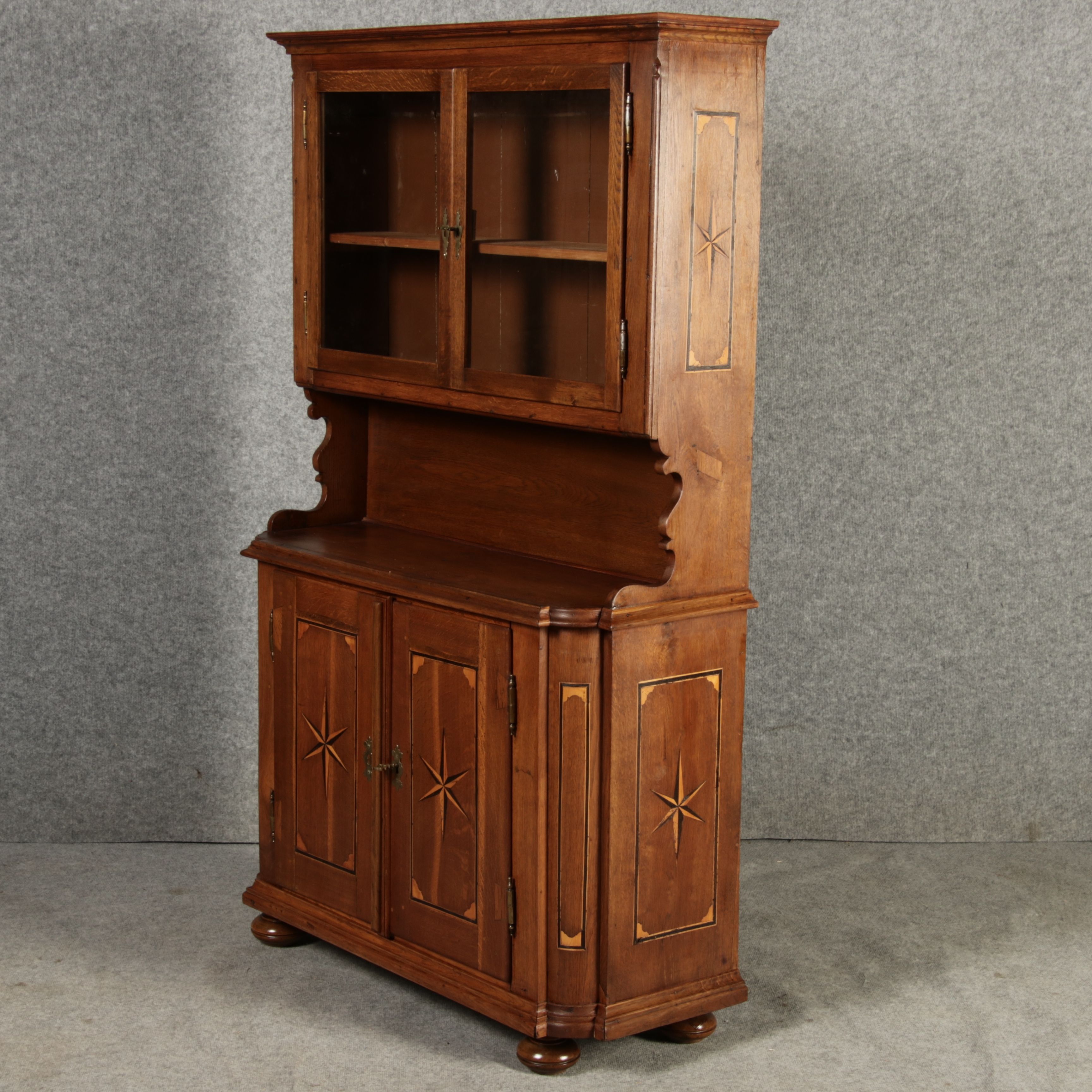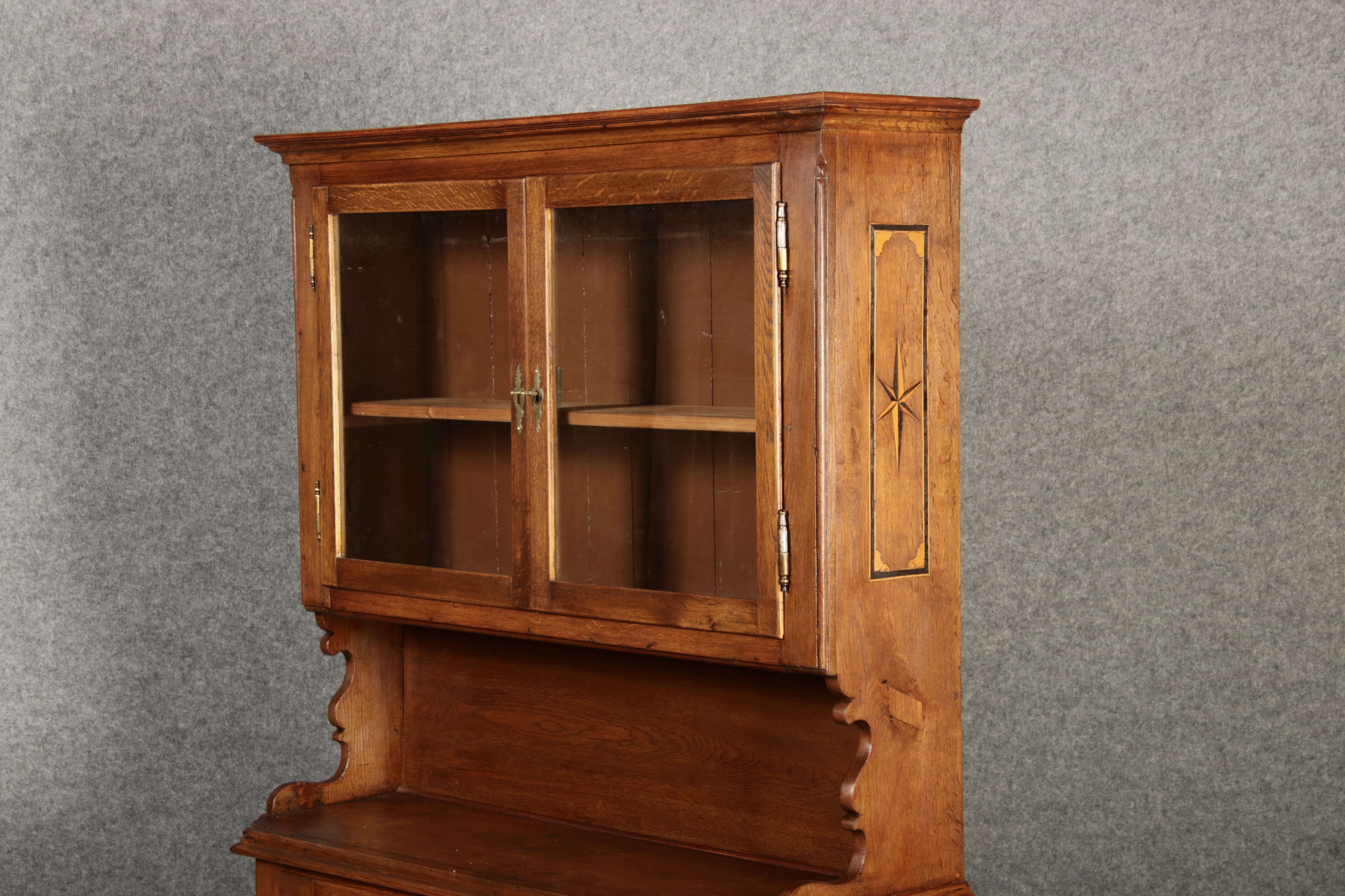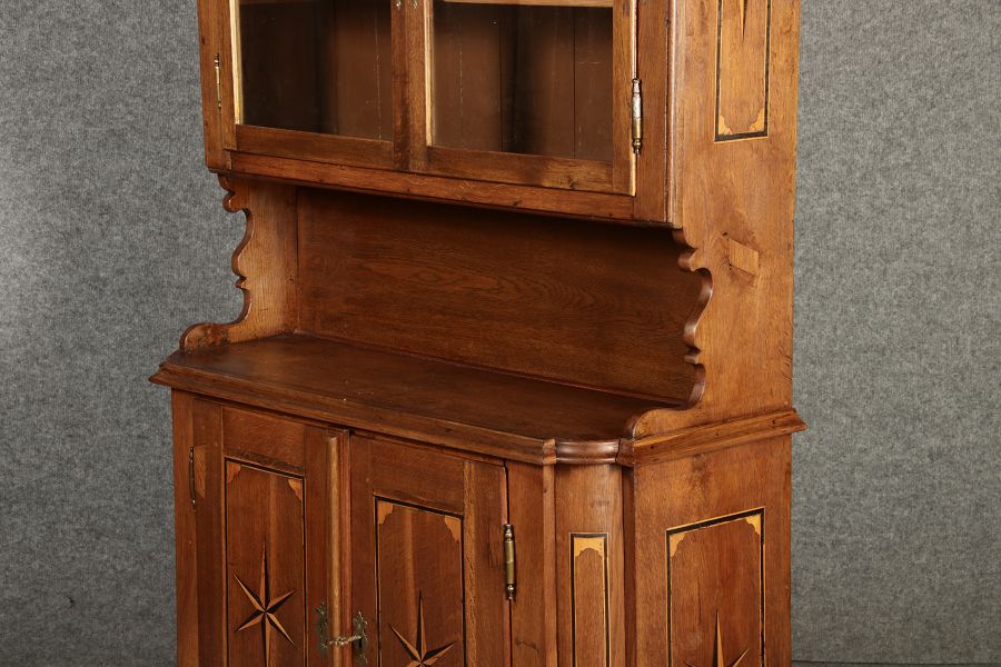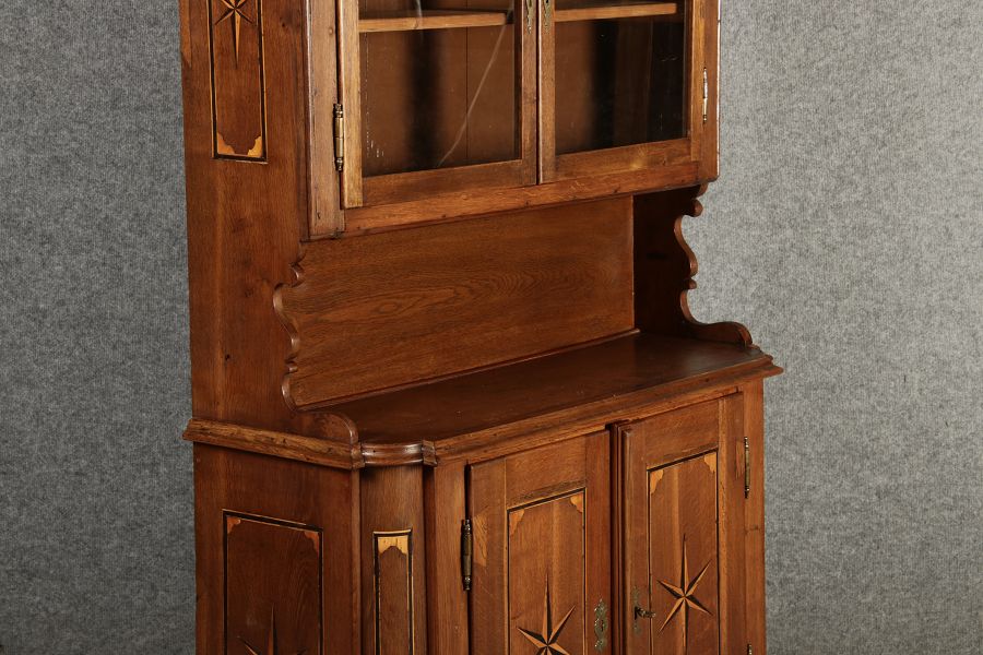 Kleiner Antiker Buffet-Schrank mit Glastüren und Intarsien (18. Jahrhundert) Dieser antike Buffet-Schrank aus massivem Holz kombiniert klassischen Stauraum mit edlen Verzierungen. Die schlichte Eleganz der verglasten oberen Schranktüren wird durch die kunstvollen Intarsien auf den unteren Türen kontrastiert, die einen stilvollen Stern als zentrales Motiv zeigen. Das Möbelstück stammt vermutlich aus der zweiten Hälfte des 18. Jahrhunderts und bietet sowohl praktischen Stauraum als auch dekorative Elemente. Der Schrank ist zweiteilig aufgebaut. Im oberen Teil befinden sich zwei Glastüren, hinter denen sich ein Regal befindet, das ideal zur Präsentation von Geschirr oder Dekorationsobjekten geeignet ist. Der untere Teil bietet zwei Türen mit großzügigem Stauraum. Die kunstvollen Intarsien mit Sternmotiv verleihen dem Möbelstück einen besonderen Akzent. Auf den unteren Türen sind kunstvolle Intarsien in Form eines Sterns zu finden, die das Design besonders hervorheben. Die Scharniere und Griffe aus Metall unterstreichen den antiken Charakter. Dieser Schrank eignet sich hervorragend als dekoratives und praktisches Möbelstück in Esszimmern, Wohnräumen oder Fluren. Die Glastüren ermöglichen eine ansprechende Präsentation von besonderen Sammlerstücken oder Geschirr, während die unteren Fächer zusätzlichen Stauraum bieten.ArtikelNummer /number: buf114