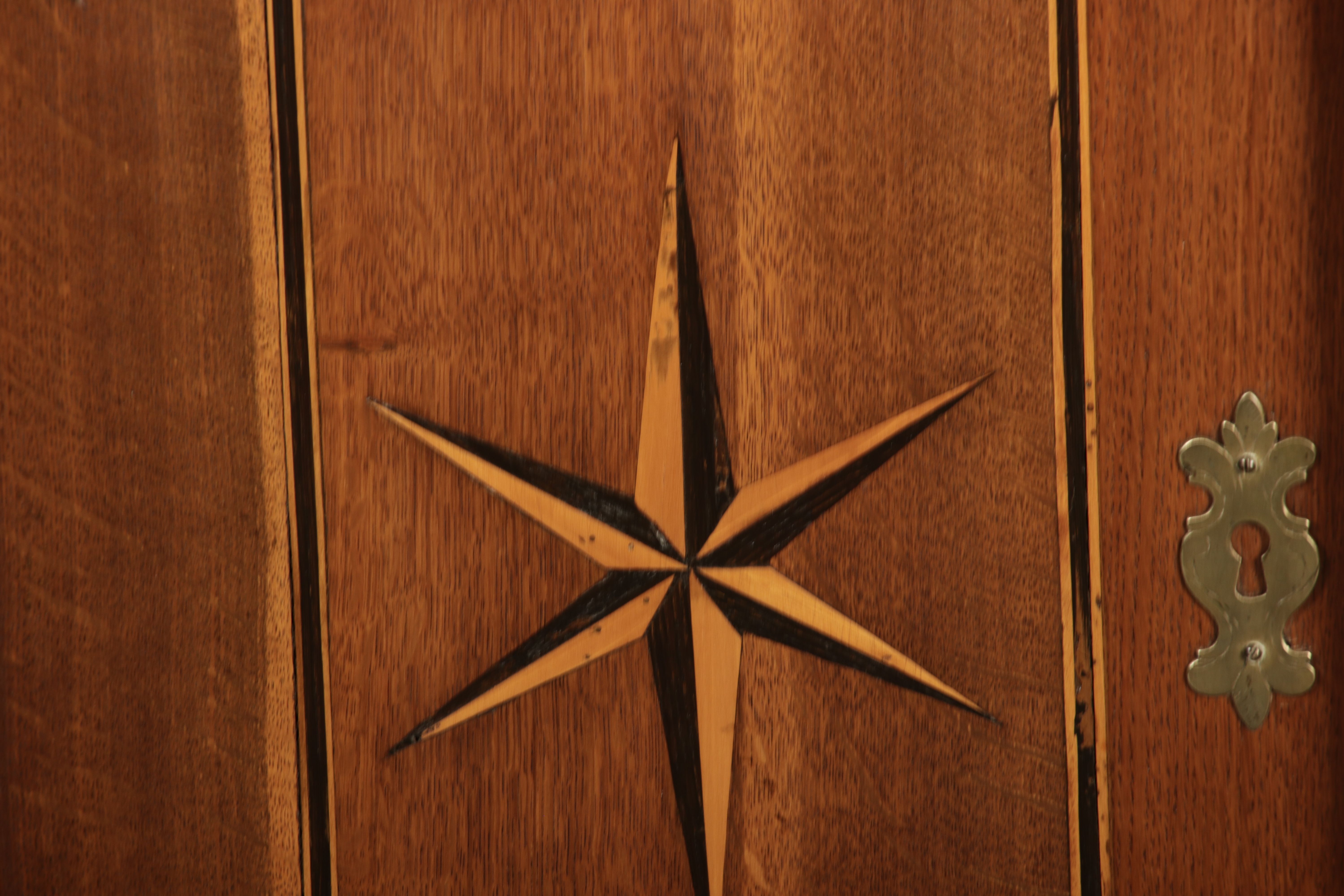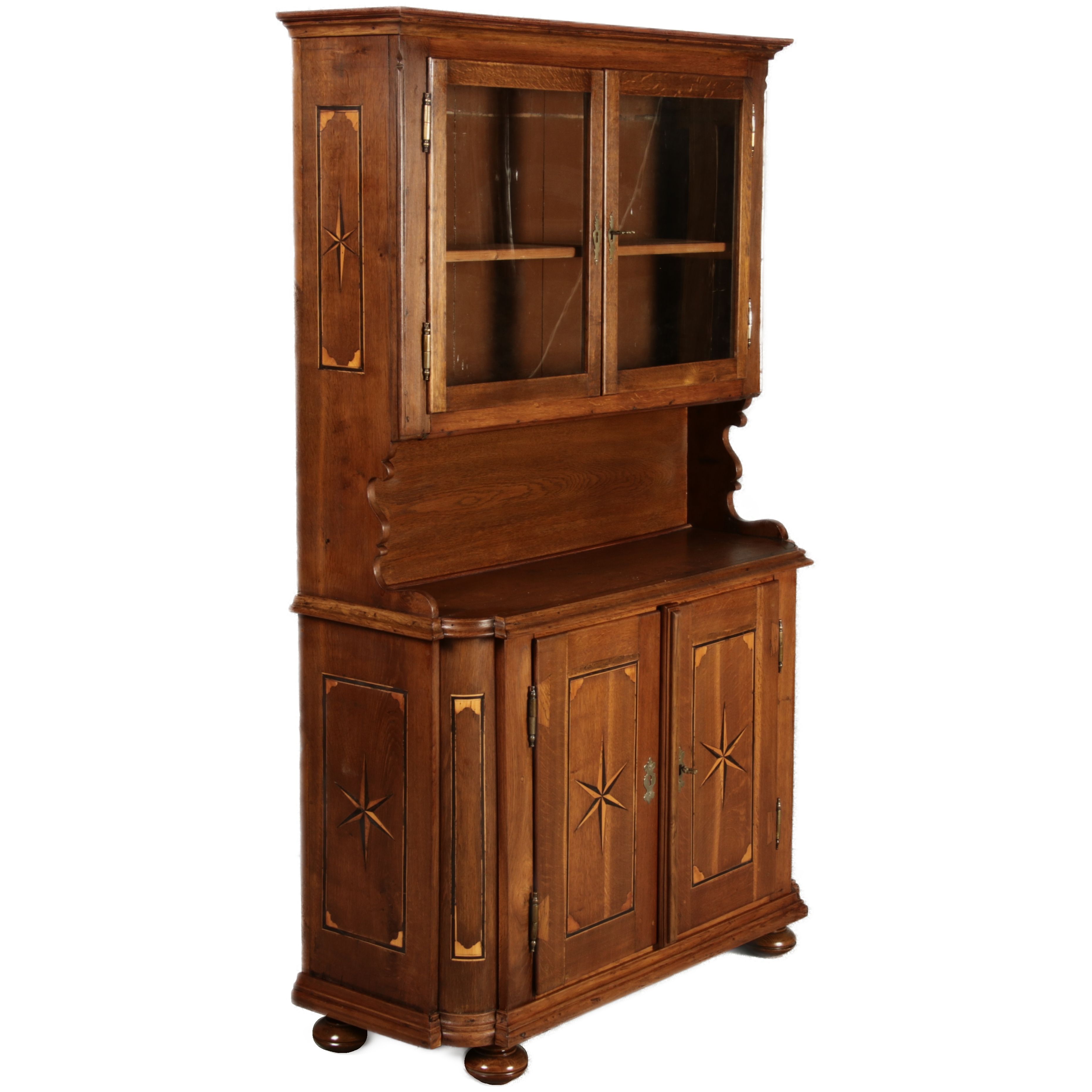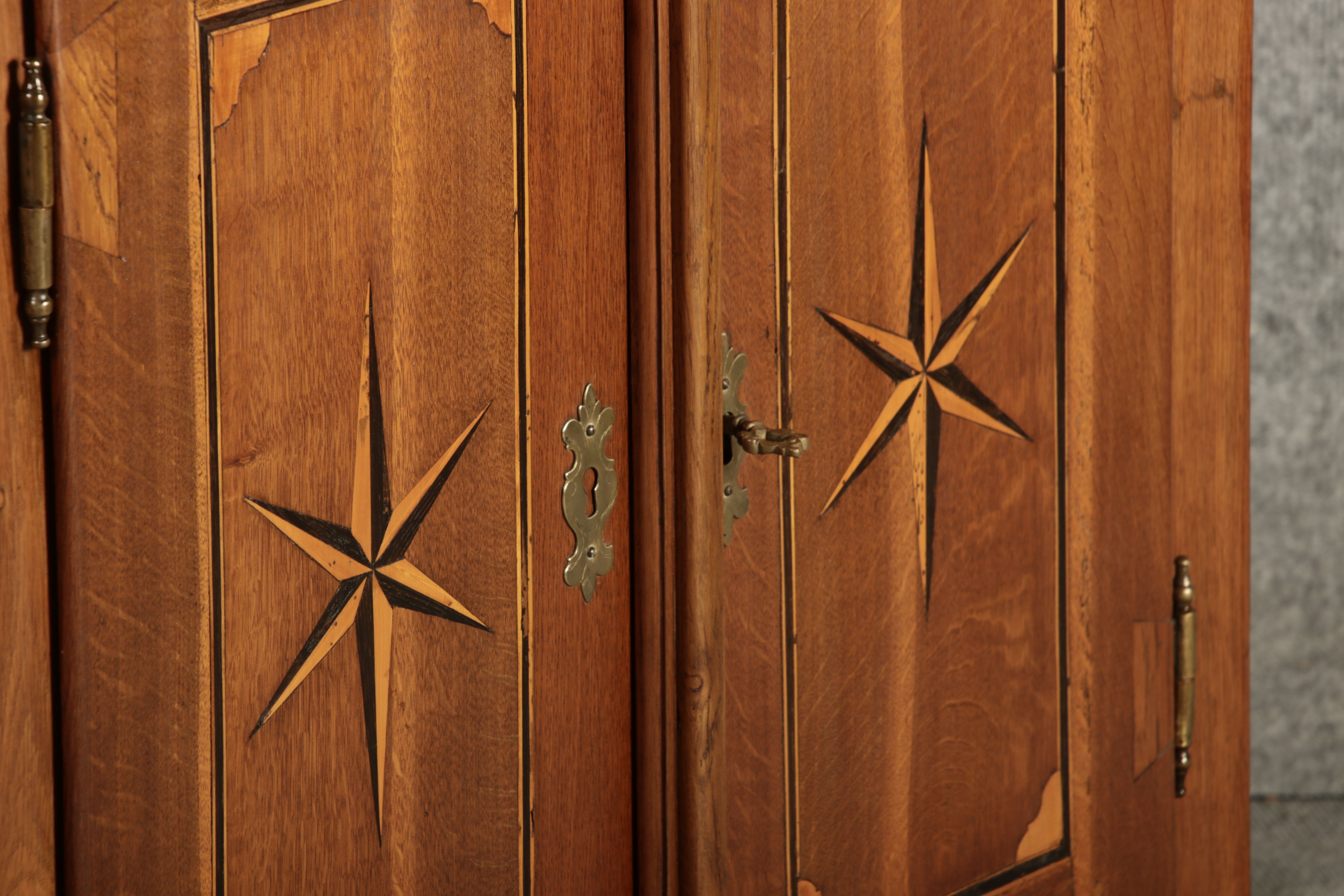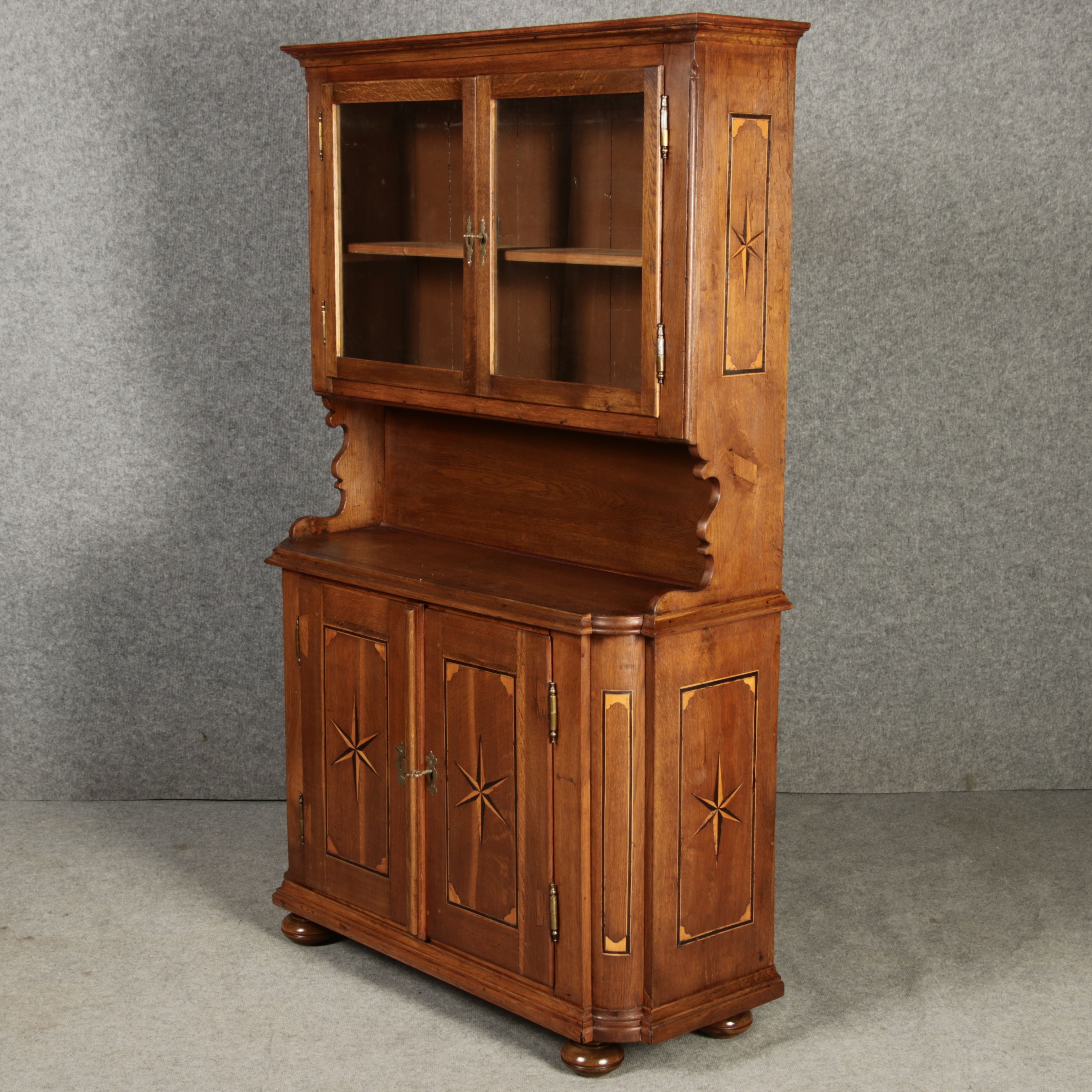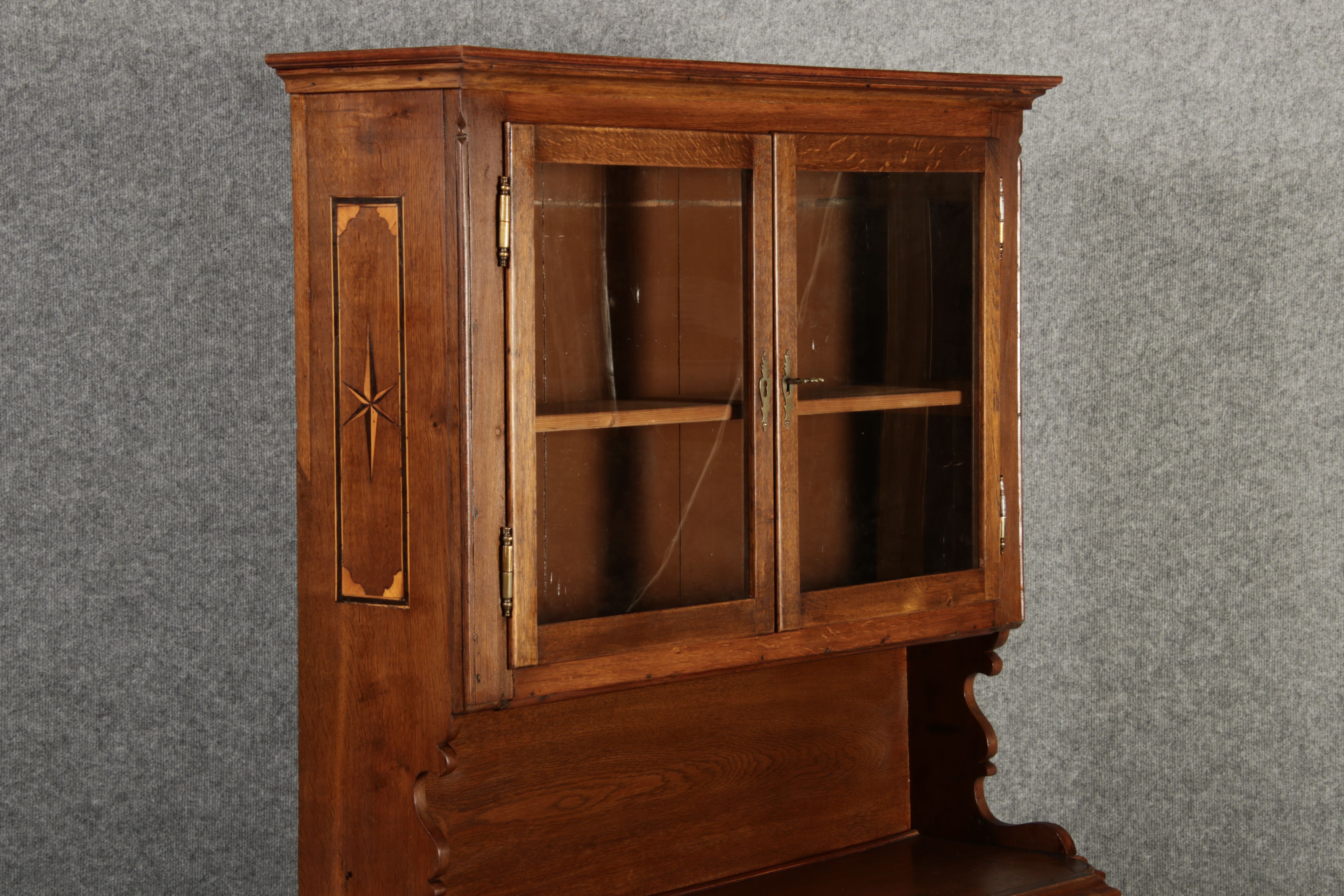 Kleiner Antiker Buffet-Schrank mit Glastüren und Intarsien (18. Jahrhundert) Dieser antike Buffet-Schrank aus massivem Holz kombiniert klassischen Stauraum mit edlen Verzierungen. Die schlichte Eleganz der verglasten oberen Schranktüren wird durch die kunstvollen Intarsien auf den unteren Türen kontrastiert, die einen stilvollen Stern als zentrales Motiv zeigen. Das Möbelstück stammt vermutlich aus der zweiten Hälfte des 18. Jahrhunderts und bietet sowohl praktischen Stauraum als auch dekorative Elemente. Der Schrank ist zweiteilig aufgebaut. Im oberen Teil befinden sich zwei Glastüren, hinter denen sich ein Regal befindet, das ideal zur Präsentation von Geschirr oder Dekorationsobjekten geeignet ist. Der untere Teil bietet zwei Türen mit großzügigem Stauraum. Die kunstvollen Intarsien mit Sternmotiv verleihen dem Möbelstück einen besonderen Akzent. Auf den unteren Türen sind kunstvolle Intarsien in Form eines Sterns zu finden, die das Design besonders hervorheben. Die Scharniere und Griffe aus Metall unterstreichen den antiken Charakter. Dieser Schrank eignet sich hervorragend als dekoratives und praktisches Möbelstück in Esszimmern, Wohnräumen oder Fluren. Die Glastüren ermöglichen eine ansprechende Präsentation von besonderen Sammlerstücken oder Geschirr, während die unteren Fächer zusätzlichen Stauraum bieten.ArtikelNummer /number: buf114