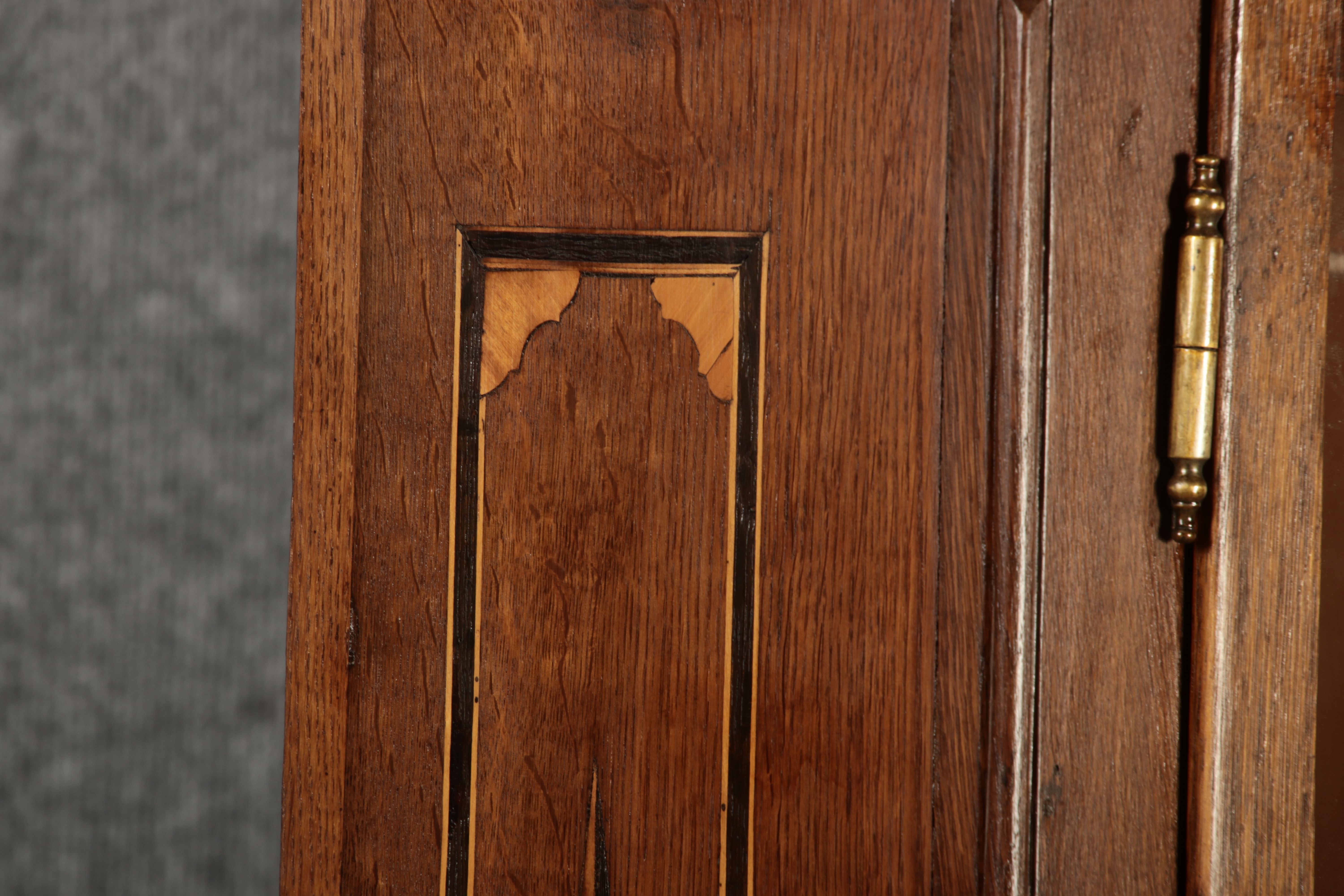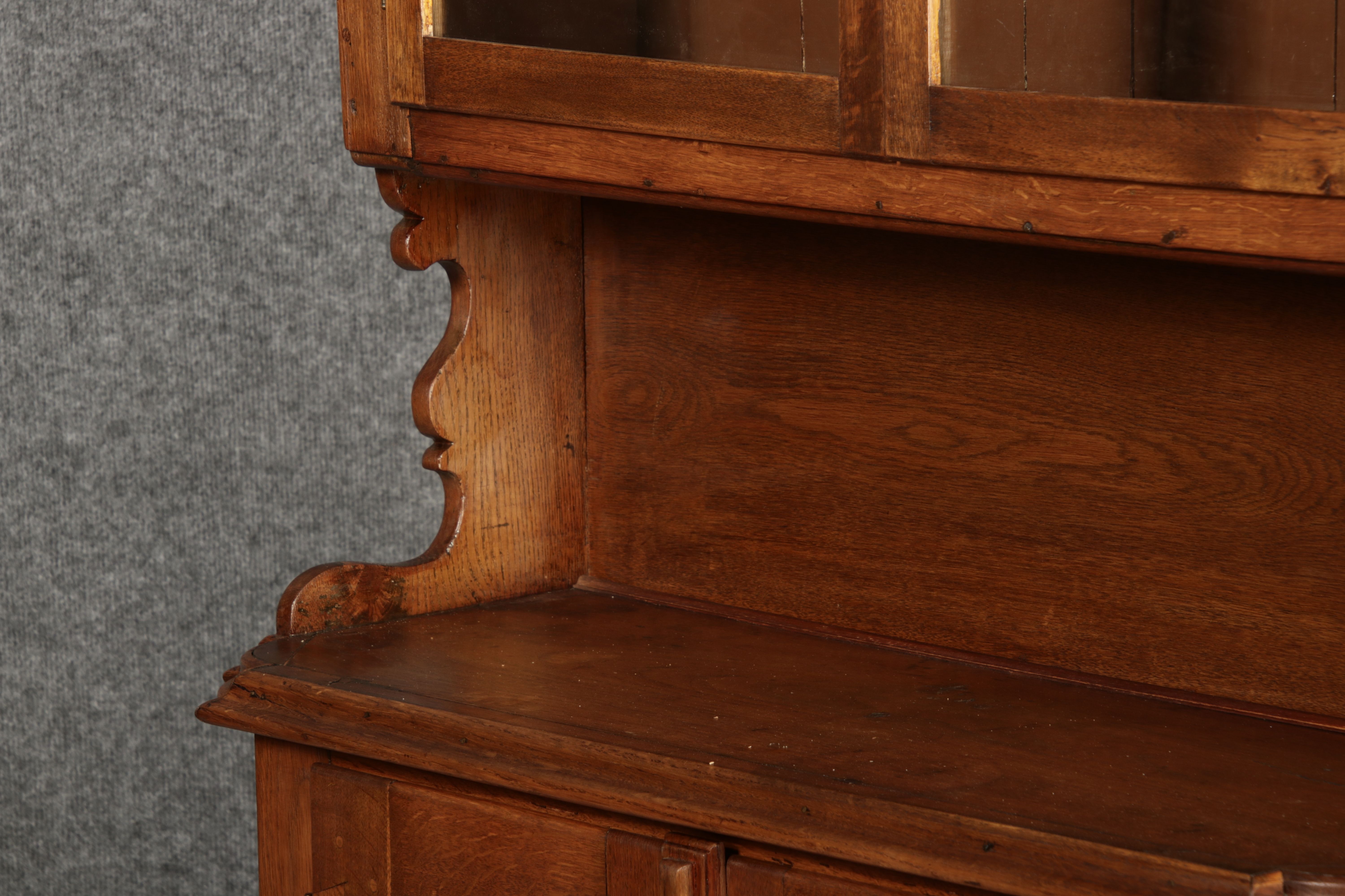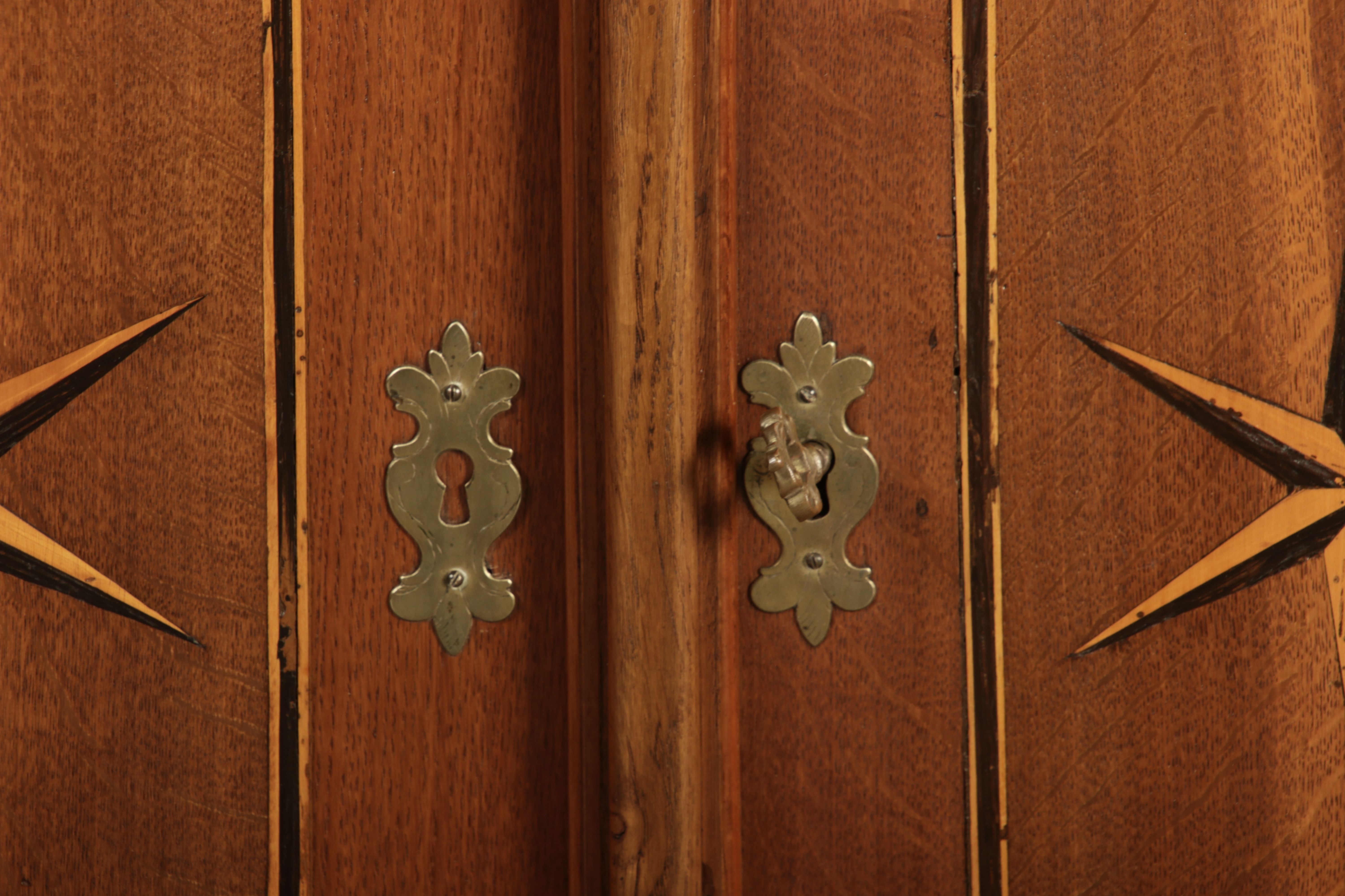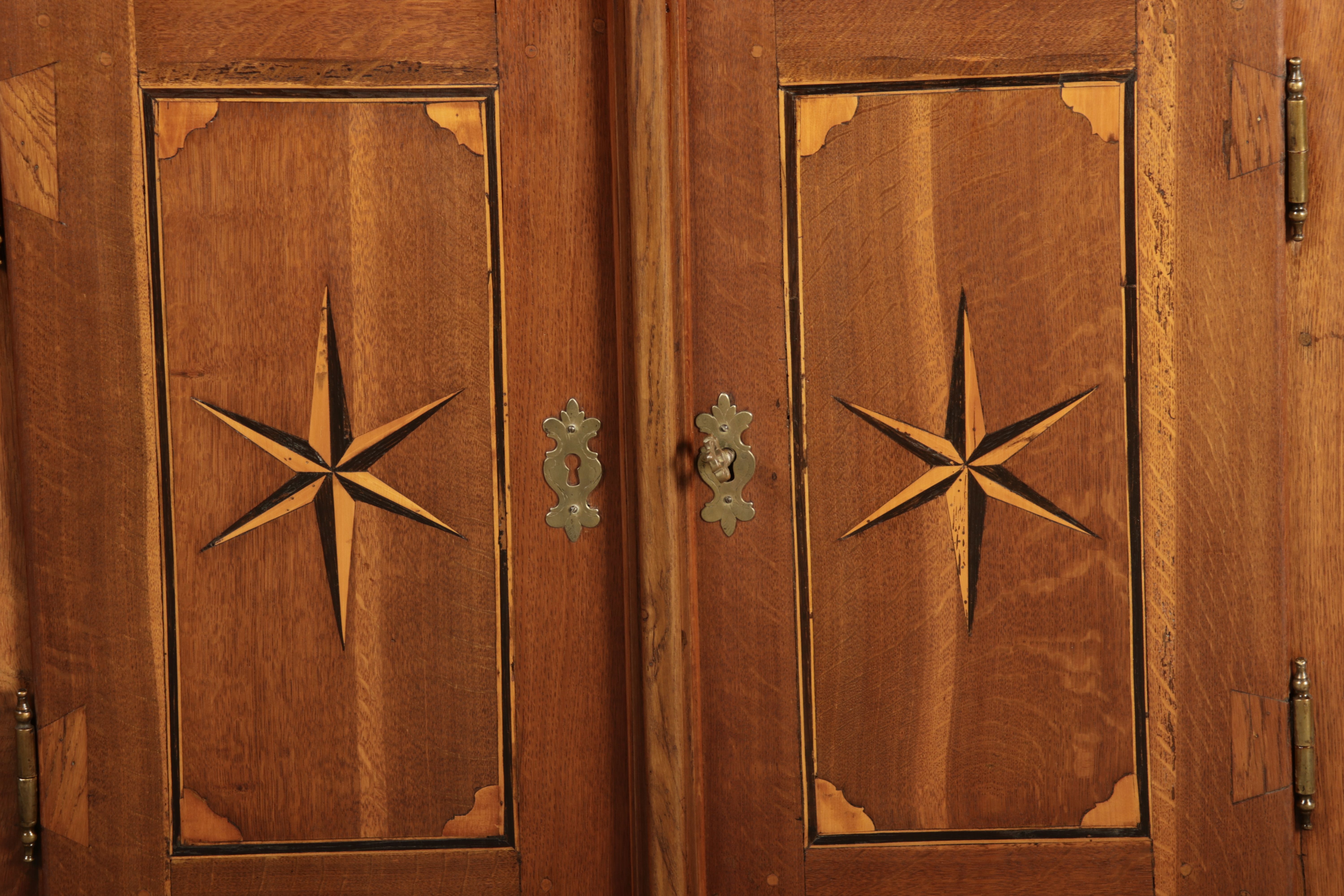 Kleiner Antiker Buffet-Schrank mit Glastüren und Intarsien (18. Jahrhundert) Dieser antike Buffet-Schrank aus massivem Holz kombiniert klassischen Stauraum mit edlen Verzierungen. Die schlichte Eleganz der verglasten oberen Schranktüren wird durch die kunstvollen Intarsien auf den unteren Türen kontrastiert, die einen stilvollen Stern als zentrales Motiv zeigen. Das Möbelstück stammt vermutlich aus der zweiten Hälfte des 18. Jahrhunderts und bietet sowohl praktischen Stauraum als auch dekorative Elemente. Der Schrank ist zweiteilig aufgebaut. Im oberen Teil befinden sich zwei Glastüren, hinter denen sich ein Regal befindet, das ideal zur Präsentation von Geschirr oder Dekorationsobjekten geeignet ist. Der untere Teil bietet zwei Türen mit großzügigem Stauraum. Die kunstvollen Intarsien mit Sternmotiv verleihen dem Möbelstück einen besonderen Akzent. Auf den unteren Türen sind kunstvolle Intarsien in Form eines Sterns zu finden, die das Design besonders hervorheben. Die Scharniere und Griffe aus Metall unterstreichen den antiken Charakter. Dieser Schrank eignet sich hervorragend als dekoratives und praktisches Möbelstück in Esszimmern, Wohnräumen oder Fluren. Die Glastüren ermöglichen eine ansprechende Präsentation von besonderen Sammlerstücken oder Geschirr, während die unteren Fächer zusätzlichen Stauraum bieten.ArtikelNummer /number: buf114