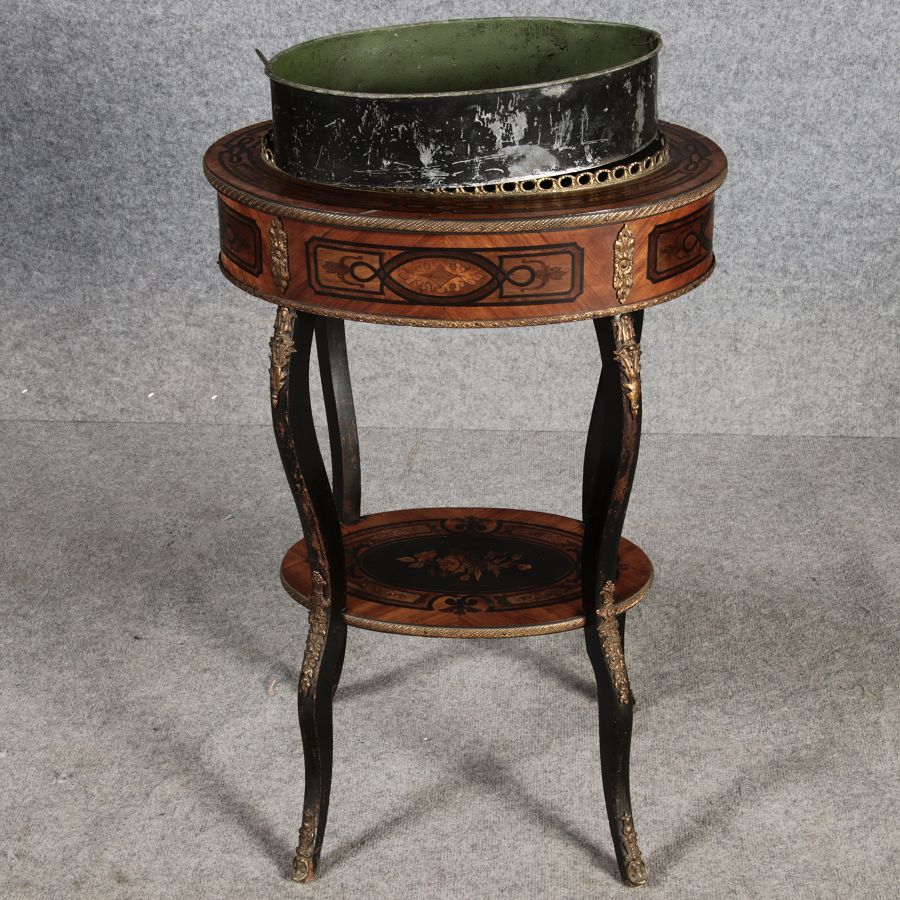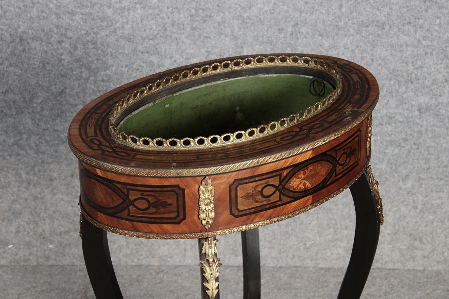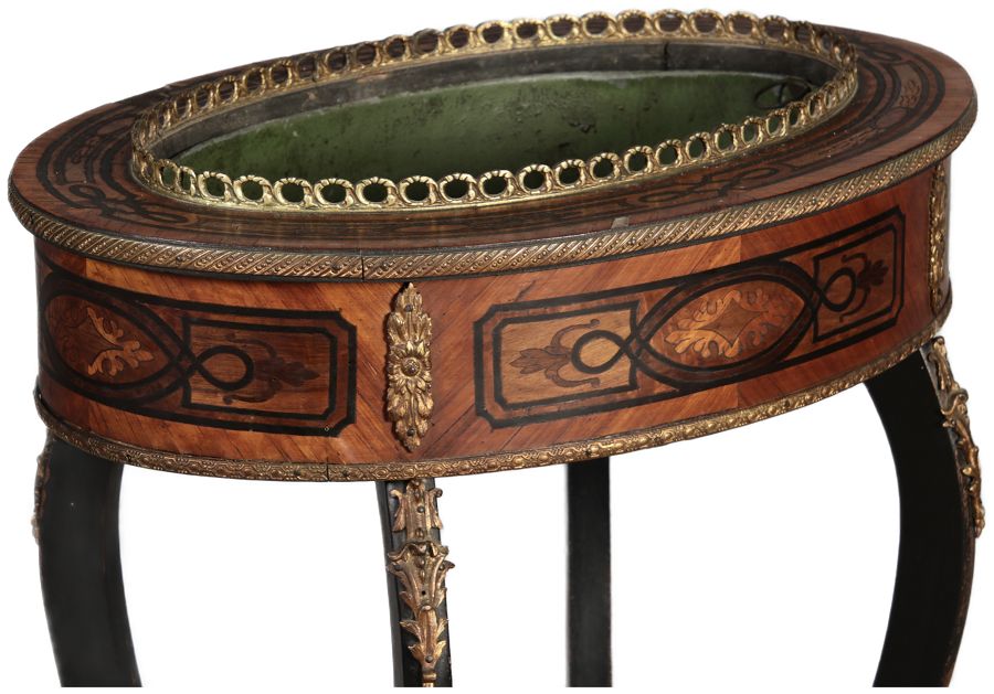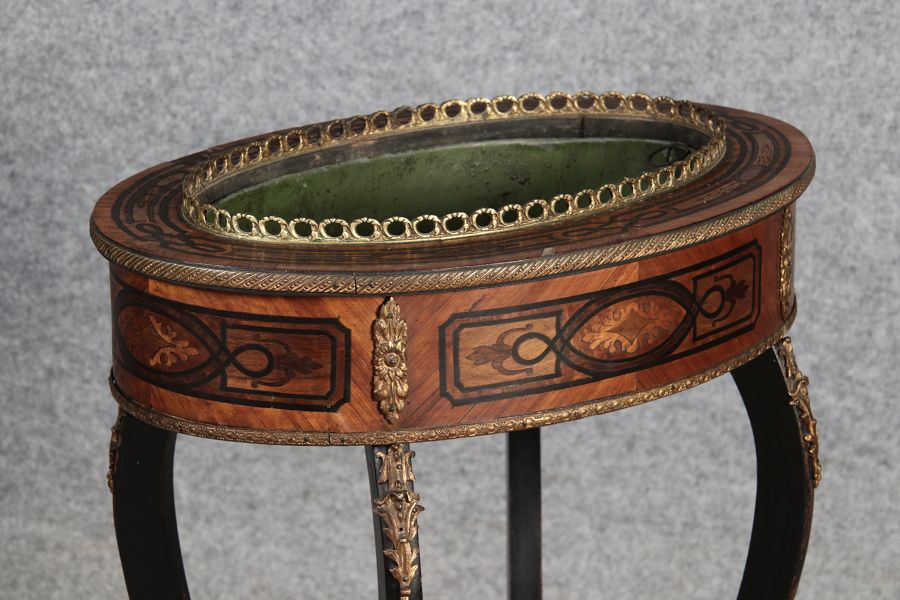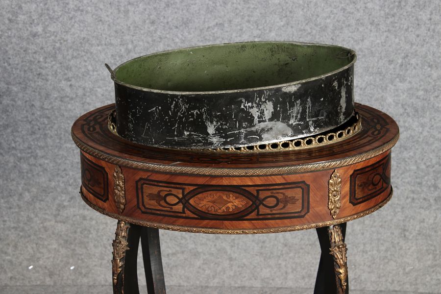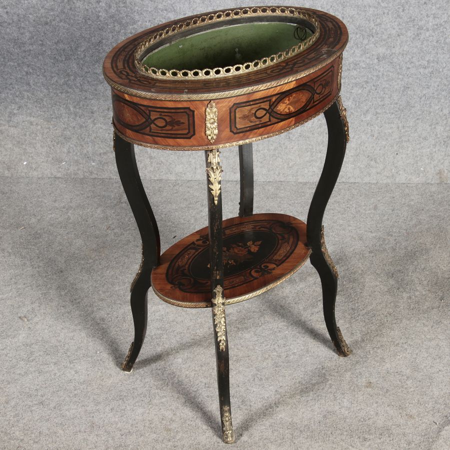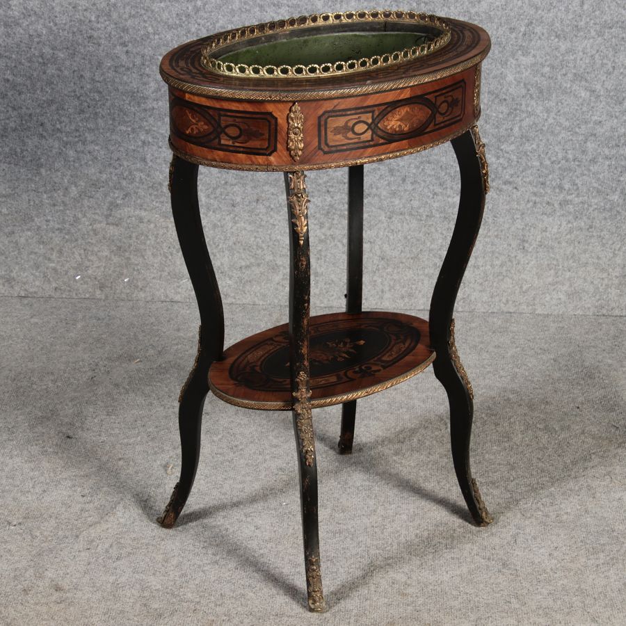 2. Drittel 19. Jh., mittels Mahagoni- und tw. eingefärbten Obsthölzern vermarktetes Hartholzgestell i. ovale Form, ebonisiertes Gestell i. geschweift. Ausführung, mit Blechwanne f. Blumen, Zwischenablage, Bronzezierbeschlag, Furnierfehlstellen, Alters- u. Gebr. spuren. |