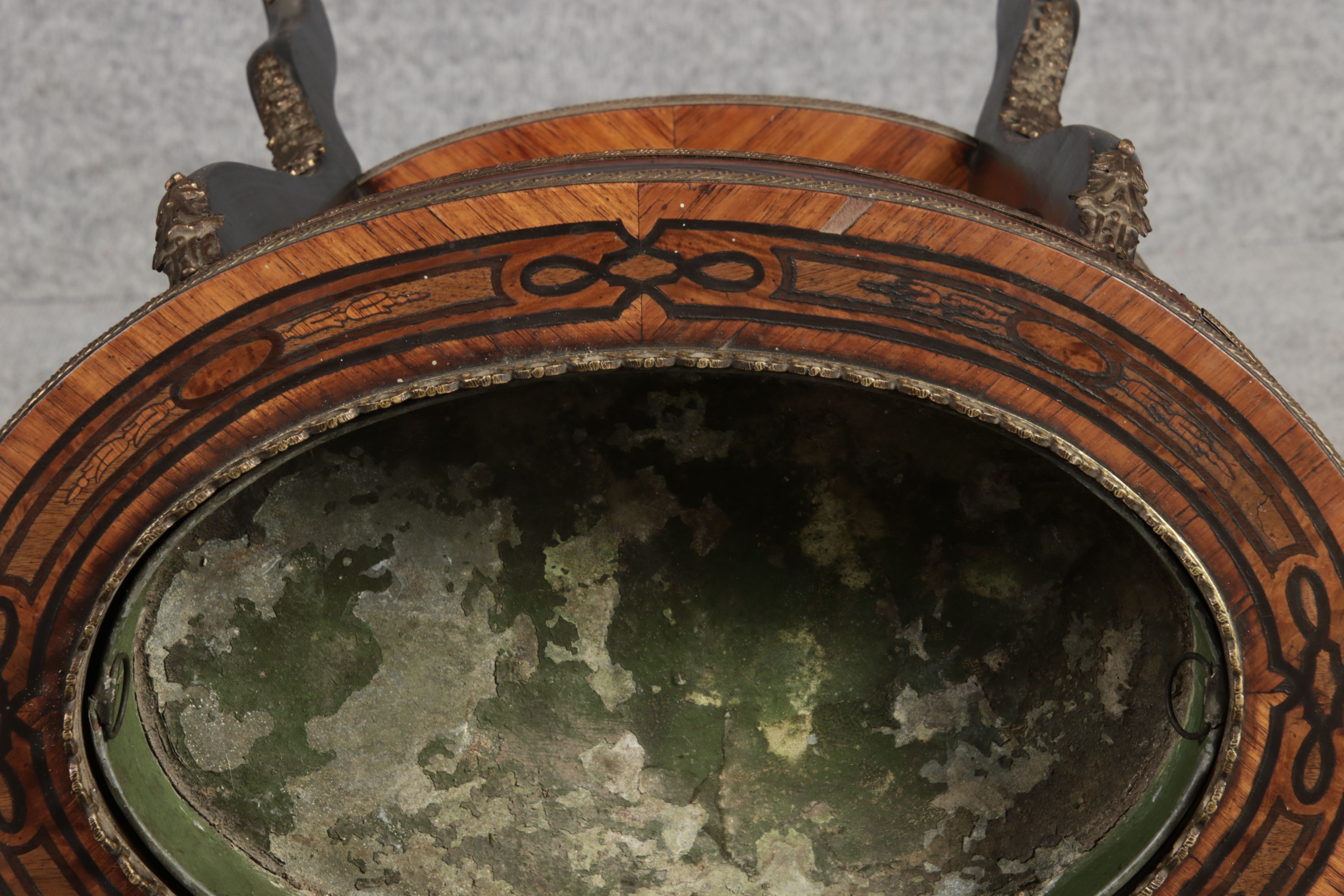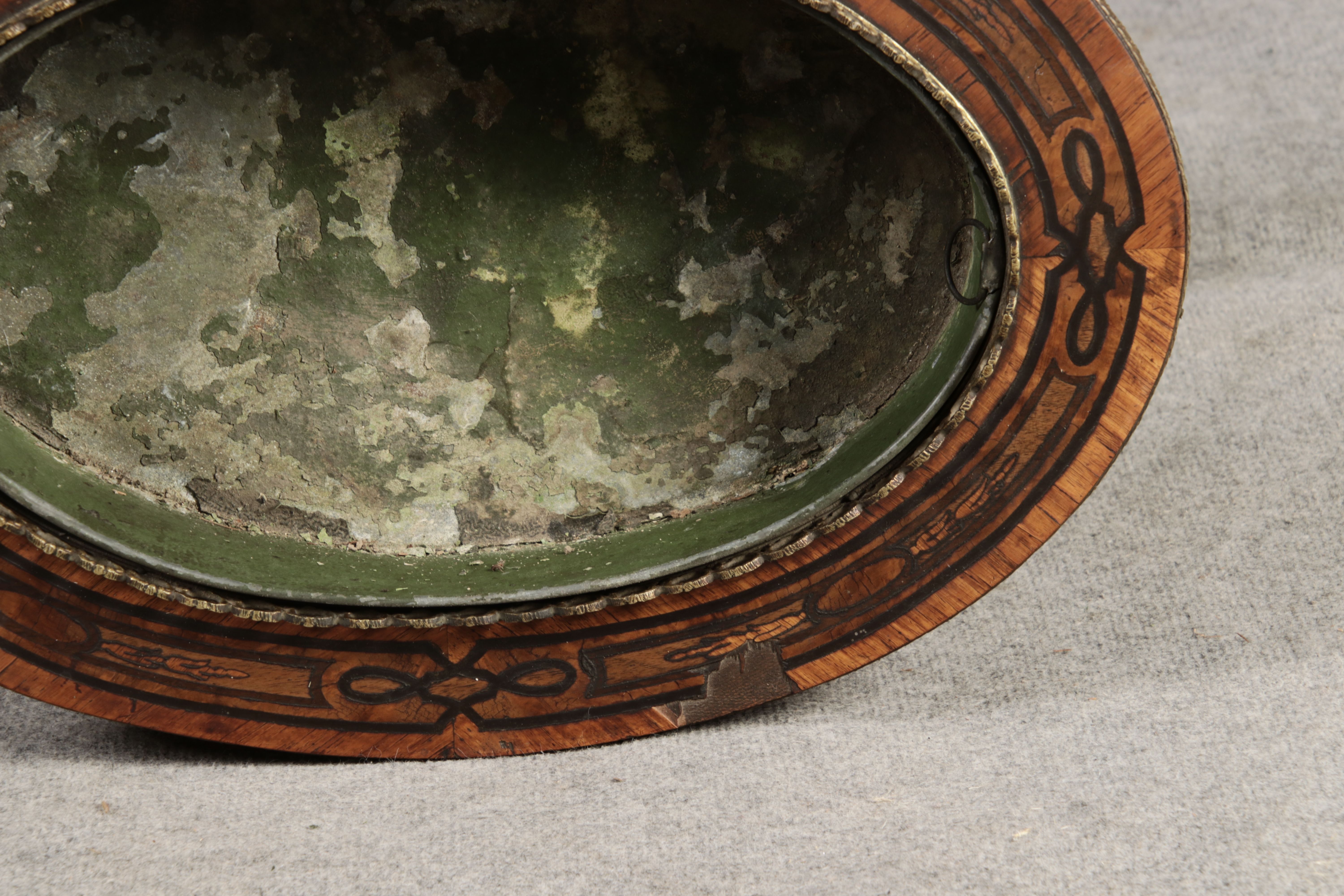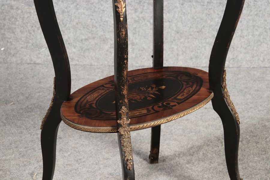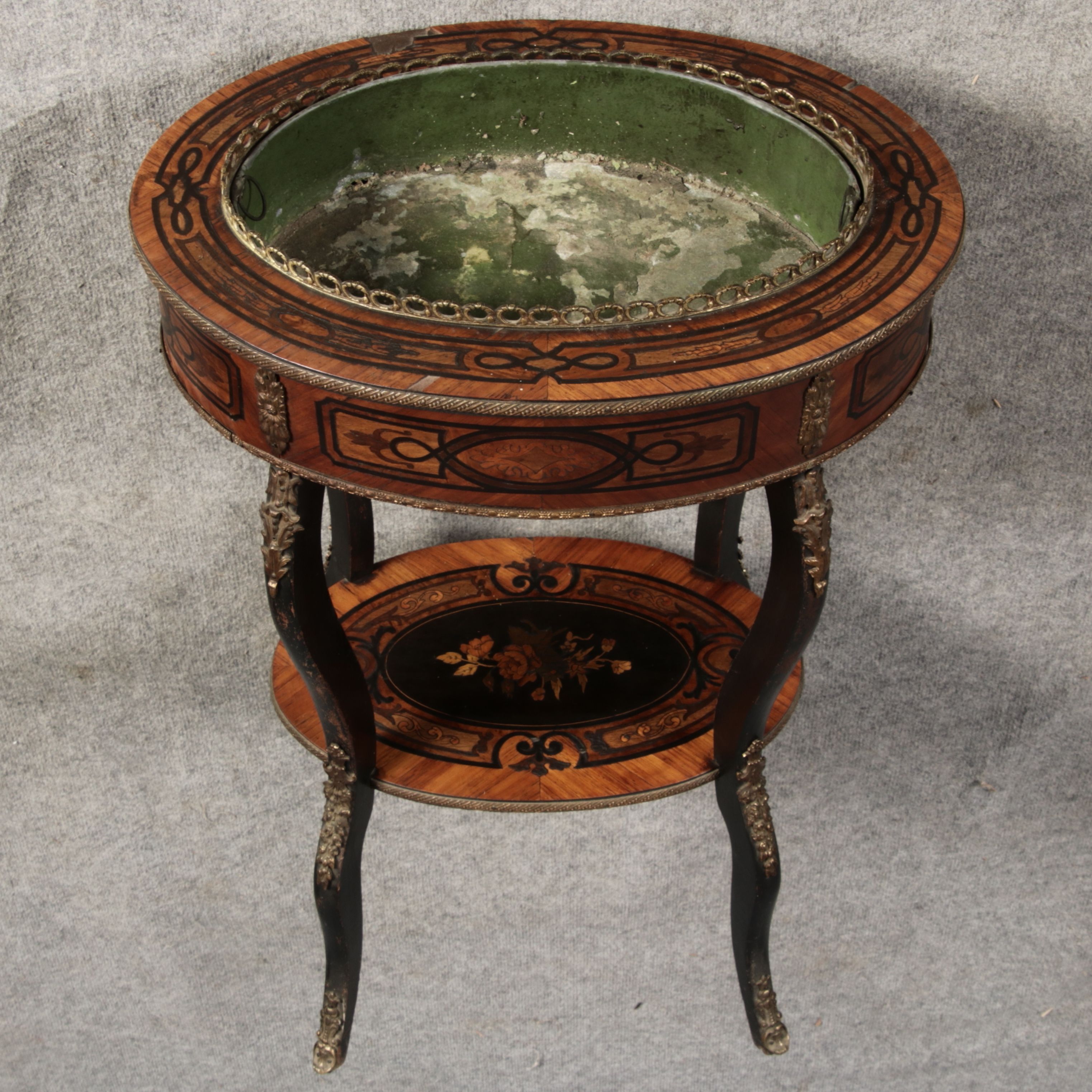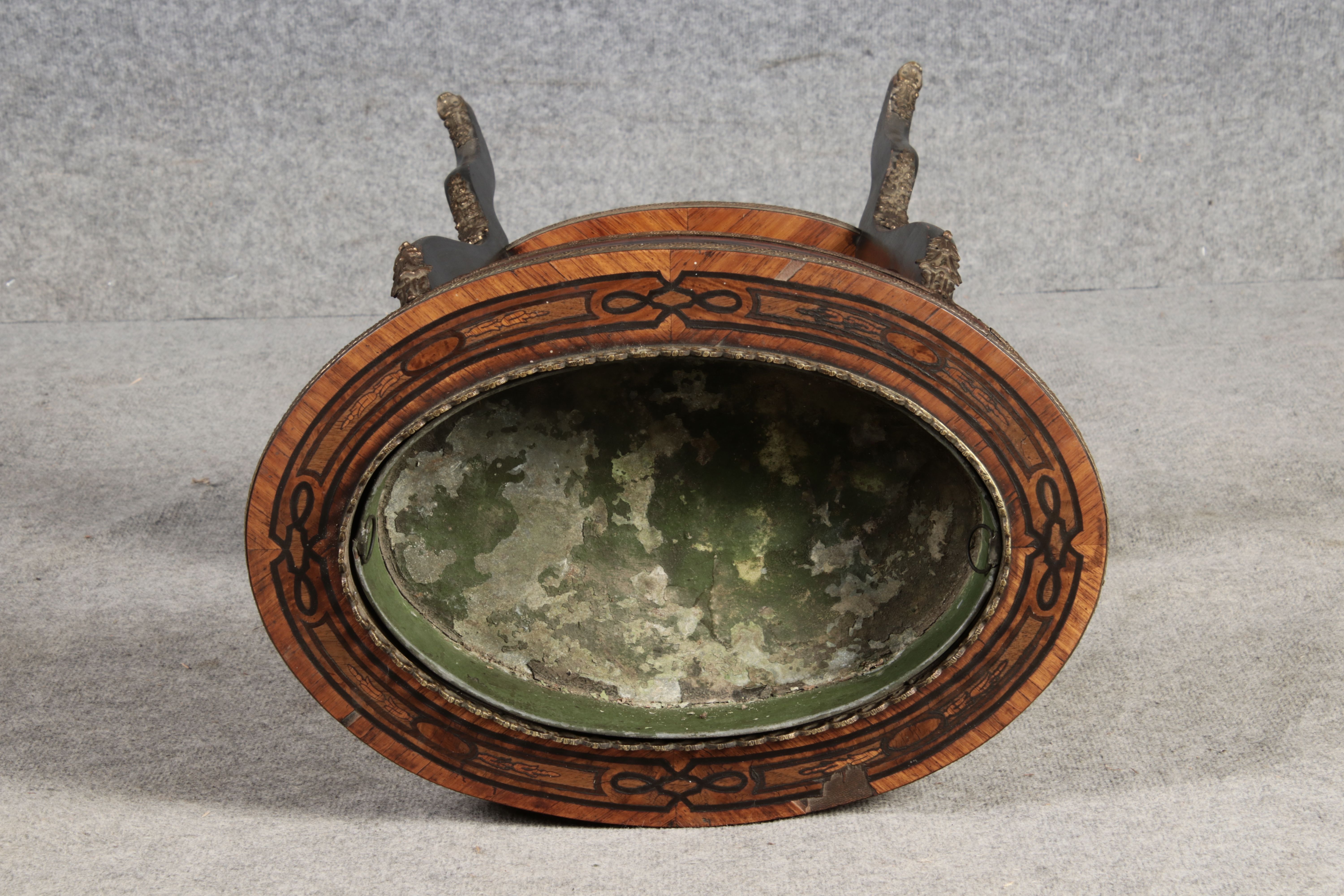 2. Drittel 19. Jh., mittels Mahagoni- und tw. eingefärbten Obsthölzern vermarktetes Hartholzgestell i. ovale Form, ebonisiertes Gestell i. geschweift. Ausführung, mit Blechwanne f. Blumen, Zwischenablage, Bronzezierbeschlag, Furnierfehlstellen, Alters- u. Gebr. spuren. |