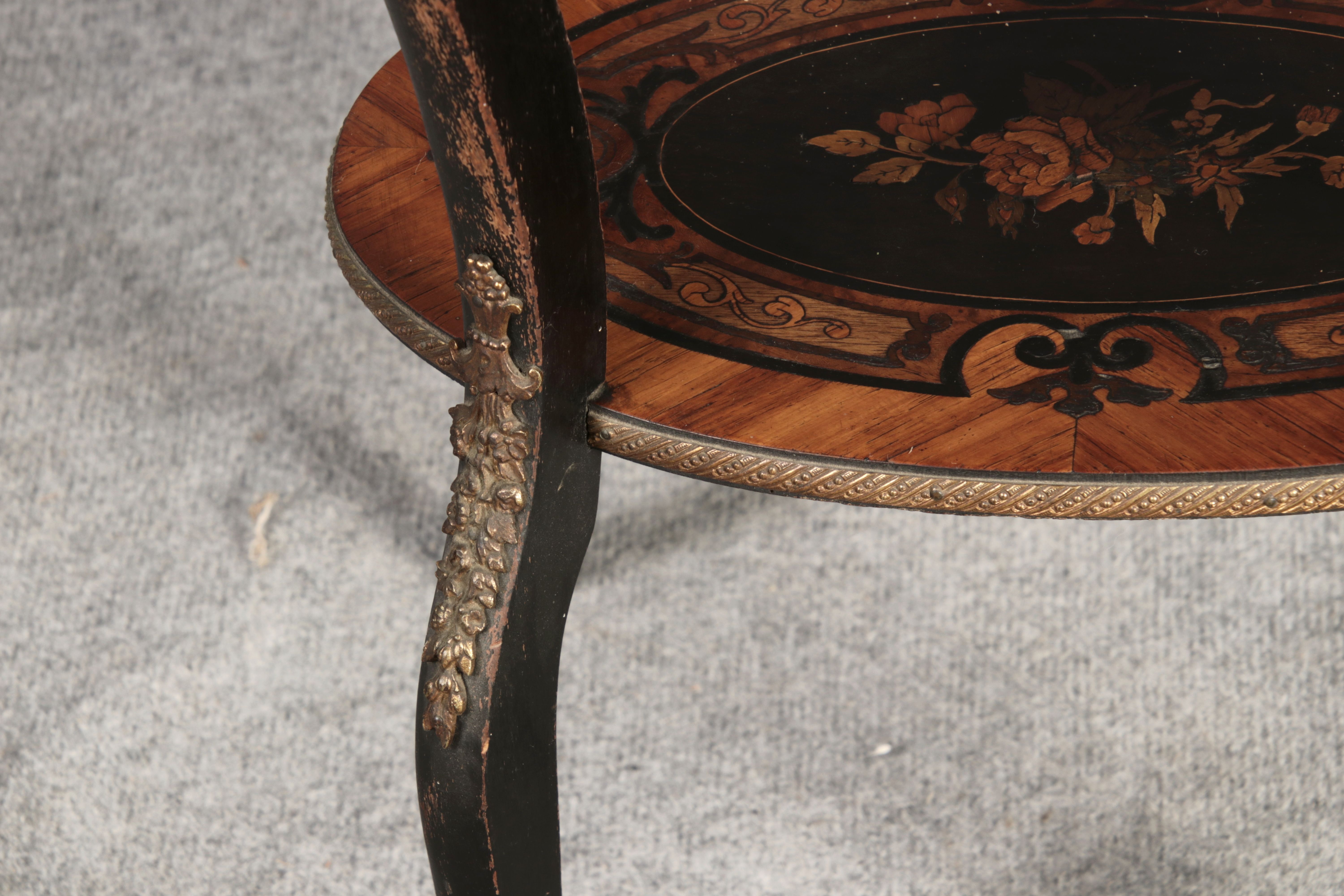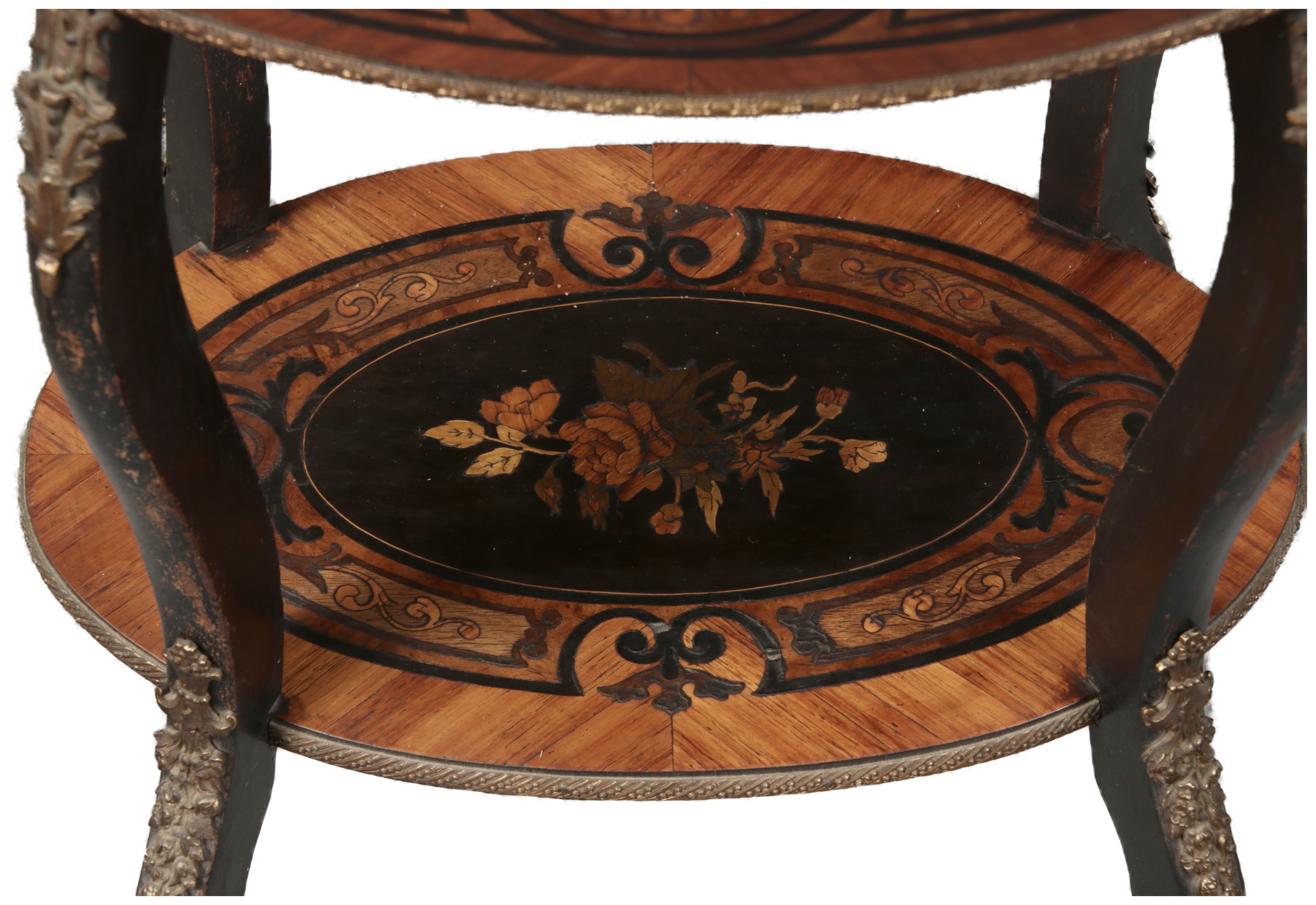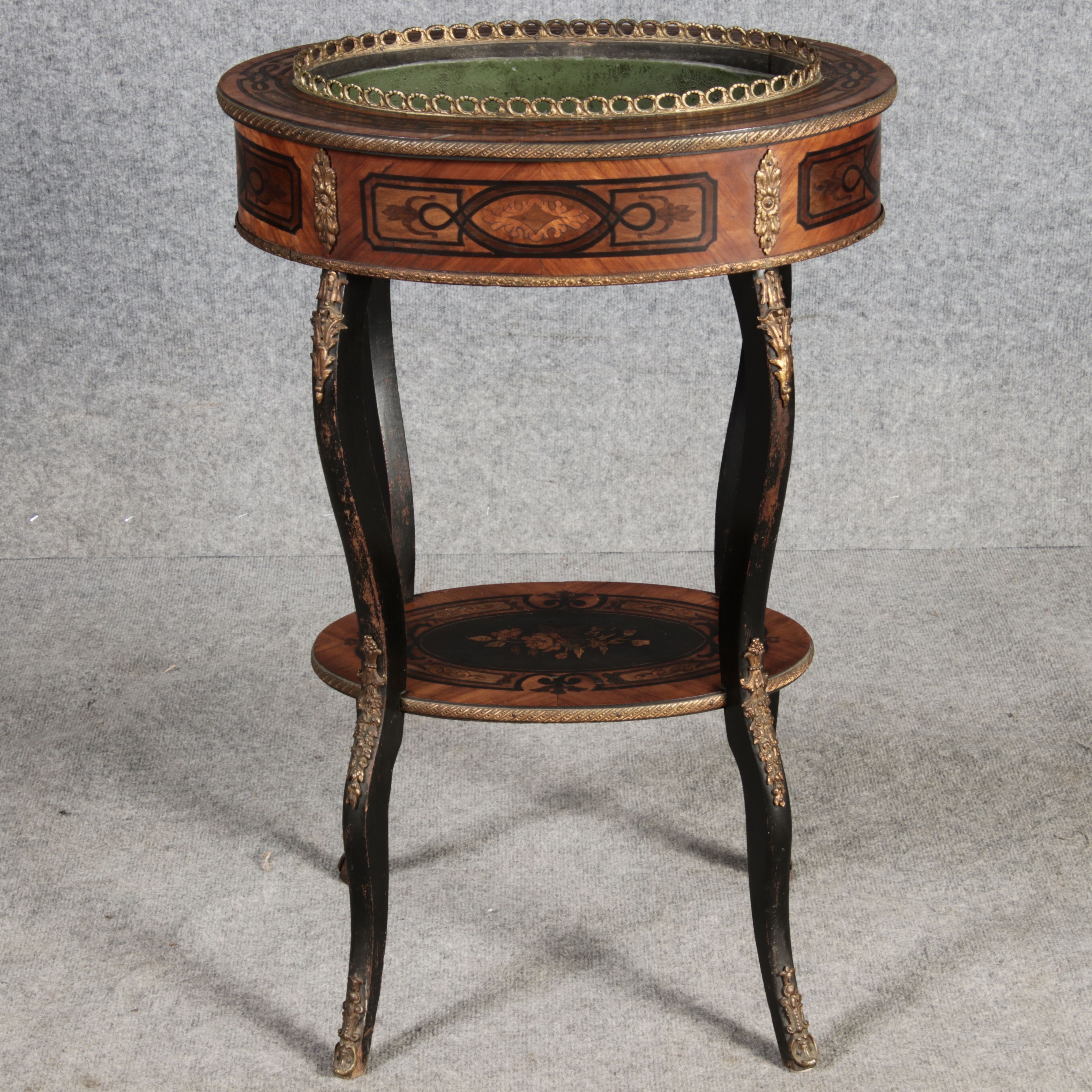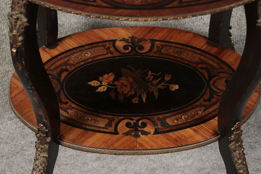 2. Drittel 19. Jh., mittels Mahagoni- und tw. eingefärbten Obsthölzern vermarktetes Hartholzgestell i. ovale Form, ebonisiertes Gestell i. geschweift. Ausführung, mit Blechwanne f. Blumen, Zwischenablage, Bronzezierbeschlag, Furnierfehlstellen, Alters- u. Gebr. spuren. |